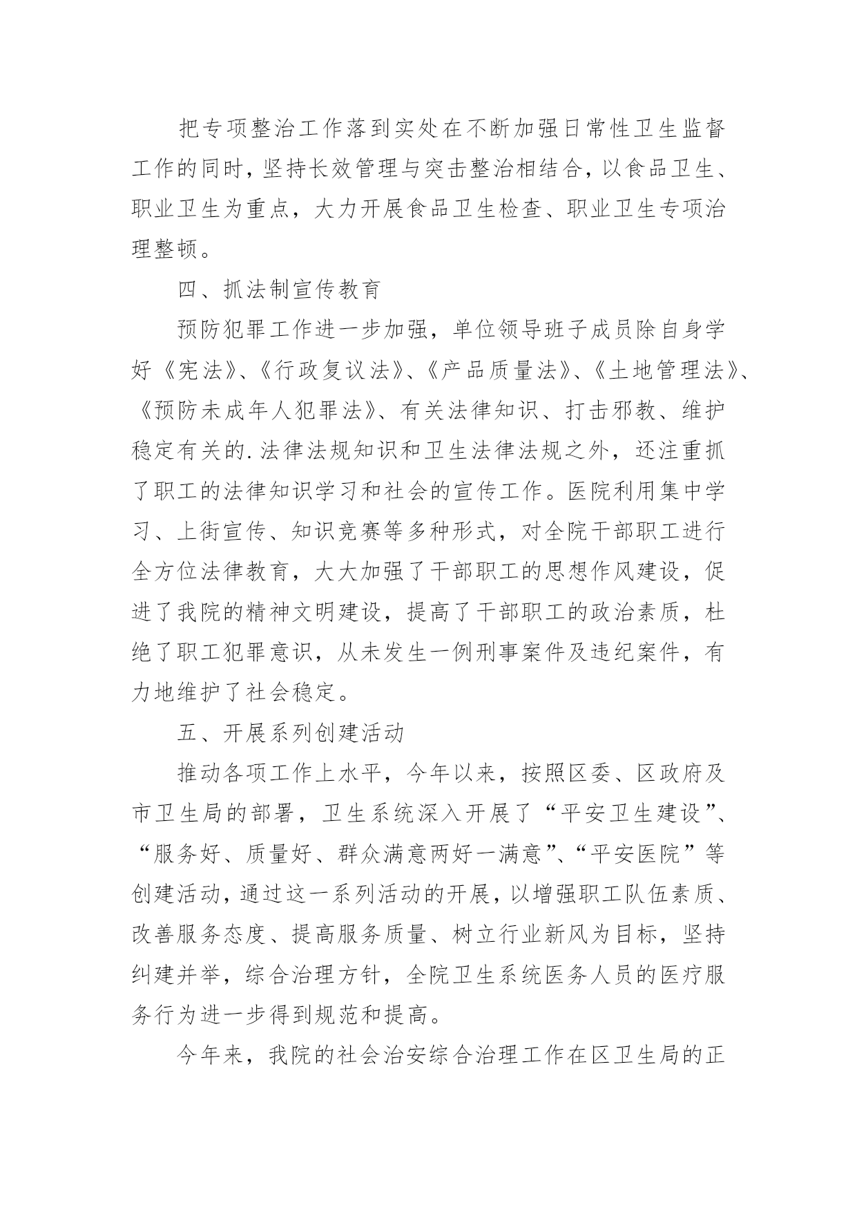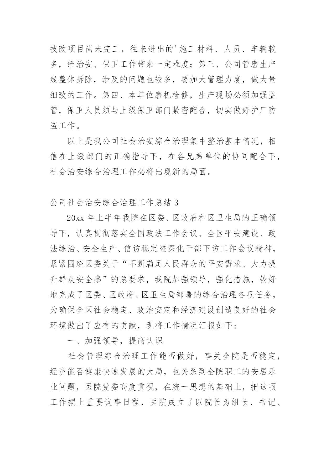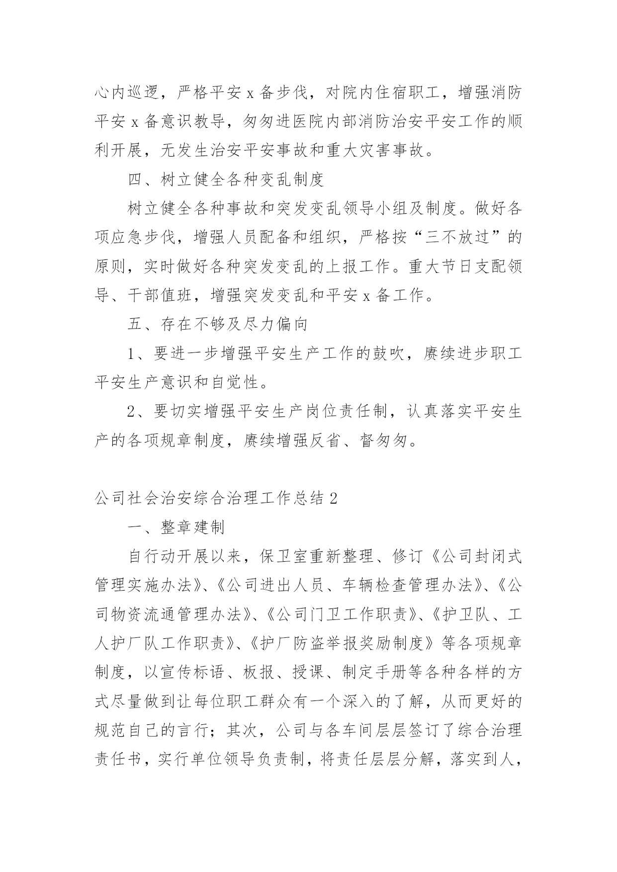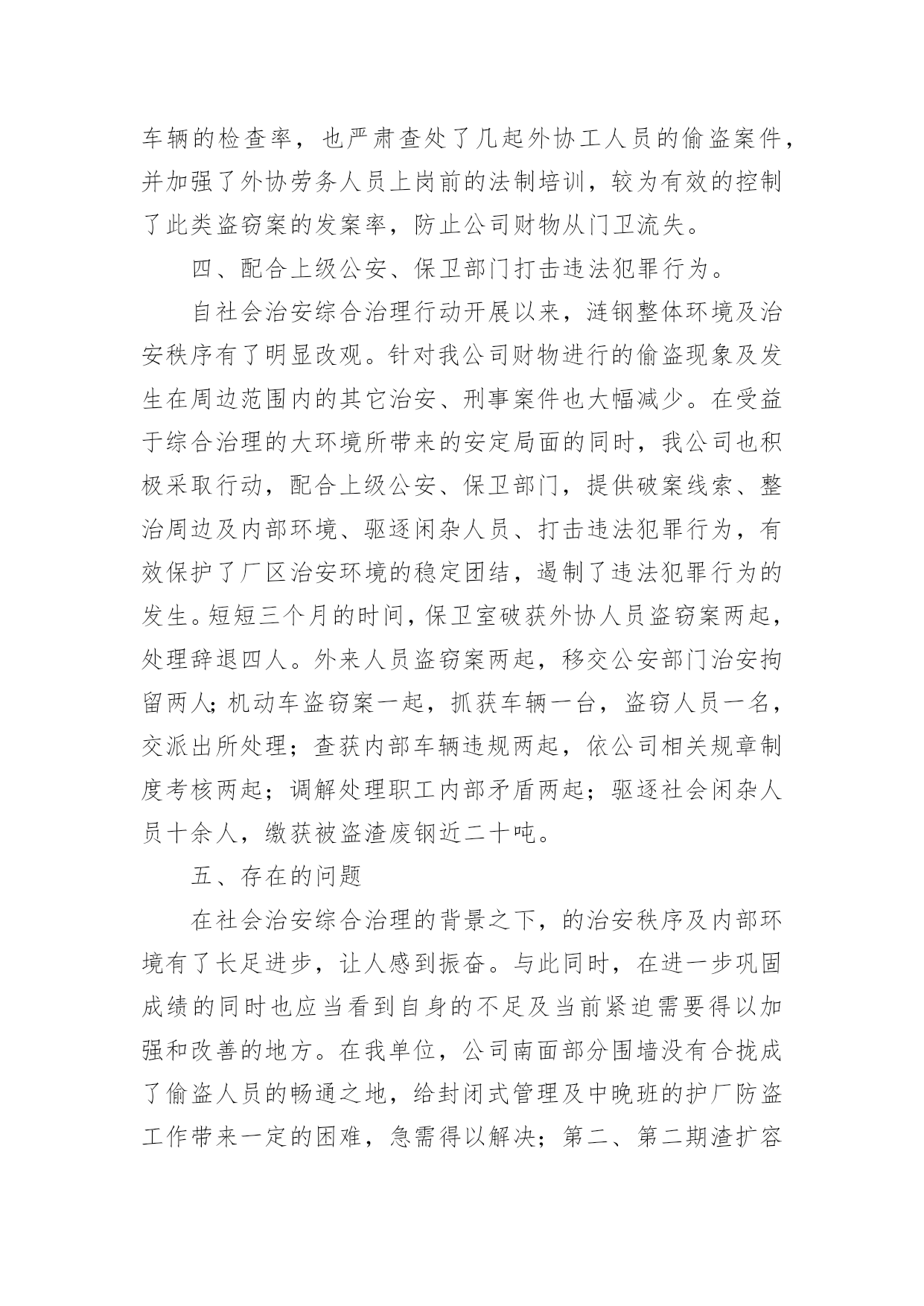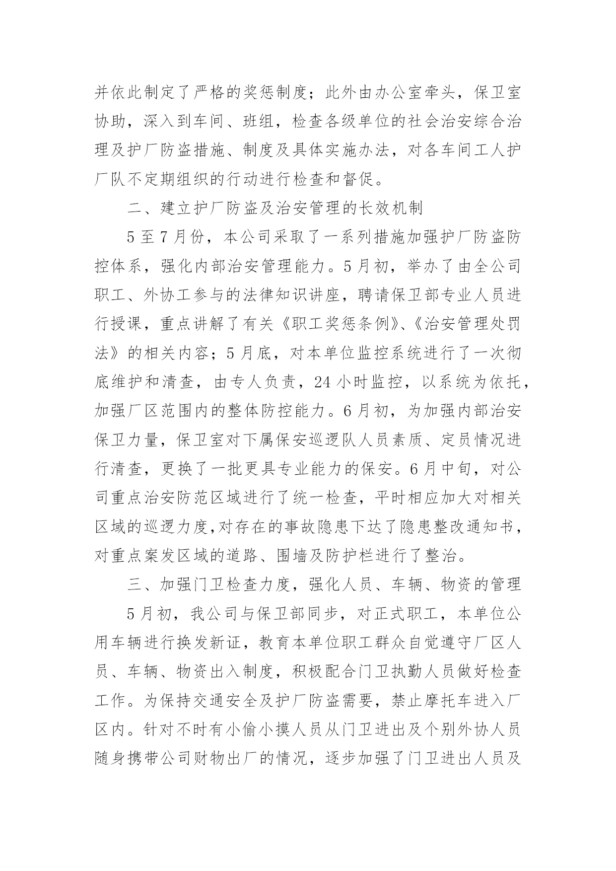 公司社会治安综合治理工作总结总结是对某一特定时间段内的学习和工作生活等表现情况加以回顾和分析的一种书面材料,它可以明确下一步的工作方向,少走弯路,少犯错误,提高工作效益,为此要我们写一份总结。但是总结有什么要求呢?以下是小编精心整理的公司社会治安综合治理工作总结,仅供参考,欢迎大家阅读。公司社会治安综合治理工作总结120xx年医院紧紧环抱创建安全医院扶植协调社会总目标,严格依照区当局综治平安工作要求积极开展综治工作,强化平安步伐,树立长效治理机制,现将今年综治平安如下:一、进步认识,增强领导,层层落实责任制1、我中心领导高度看重平安工作,始终把它摆在紧张议事日程,主要领导亲自抓,分管领导具体抓,实时转达主管局关于平安生产的指示精神,常常应用所发生的平安事故案例来人人,通过学习,使全院职工认识到,平安生产是一项紧张的过细的工作,稍有马虎,即可能变成事故,从而进一步增强了从业人员自我掩护才能。结合我中心实际,订定平安生产,认真落实平安x备步伐。院平安领导小组每月进行一次专项消防平安生产工作反省,做到实时发明问题,实时办理隐患。平安生产事故的发生。2、为了增强中心的平安生产工作,强化平安生产工作责任制,依照“管生产必须管平安”和“谁主管谁负责”的原则,年初于各职能部门、各科室签订平安生产工作责任书,从而使职责明确,责任到人。严格执行平安工作“一票反对”,并与年终奖惩、稽核、评先、评优、晋职等严密挂钩,收到了优越的后果。3、为了进一步进步全院职工的平安思想意识,充分施展医院鼓吹对象和阵地的工作,开展多种形式的鼓吹运动。全年举办了三期的平安知识讲座,全院职工介入率达95%以上。通过演练,使义务消防队员和职工可以或许纯熟控制灭火技术。二、增强医疗平安工作严格医疗平安核心工作制度,增强医务人员医疗平安的制度的落实,强调首诊、会诊、急诊抢救、严格值班、交接班制度,赓续匆匆进职工执行医疗平安制度的自觉性。三、增强平安、治安守卫工作1、我中心把创建“安全单位”运动作为单位内部落实平安工作的一向主要步伐,增强内部治安守卫制度和消防平安工作,并与门卫工作人员签订门卫治安平安工作责任状,实行门卫24小时值班制,并安装防盗x系统,对全院楼层、紧张部门、科室安装探头,进行24小时x。使我院重点部位技防笼罩率达100%,切实增强了院内“安防”工作。2、增强对外来流感人口治理,对未经同意的外来人员严禁在中心内过夜,对可疑收支人员严加查问,夜间增强中心内巡逻,严格平安x备步伐,对院内住宿职工,增强消防平安x备意识教导,匆匆进医院内部消防治安平安工作的顺利开展,无发生治安平安事故和重大灾害事故。四、树立健全各种变乱制度树立健全各种事故和突发变乱领导小组及制度。做好各项应急步伐,增强人员配备和组织,严格按“三不放过”的原则,实时做好各种突发变乱的上报工作。重大节日支配领导、干部值班,增强突发变乱和平安x备工作。五、存在不够及尽力偏向1、要进一步增强平安生产工作的鼓吹,赓续进步职工平安生产意识和自觉性。2、要切实增强平安生产岗位责任制,认真落实平安生产的各项规章制度,赓续增强反省、督匆匆。公司社会治安综合治理工作总结2一、整章建制自行动开展以来,保卫室重新整理、修订《公司封闭式管理实施办法》、《公司进出人员、车辆检查管理办法》、《公司物资流通管理办法》、《公司门卫工作职责》、《护卫队、工人护厂队工作职责》、《护厂防盗举报奖励制度》等各项规章制度,以宣传标语、板报、授课、制定手册等各种各样的方式尽量做到让每位职工群众有一个深入的了解,从而更好的规范自己的言行;其次,公司与各车间层层签订了综合治理责任书,实行单位领导负责制,将责任层层分解,落实到人,并依此制定了严格的奖惩制度;此外由办公室牵头,保卫室协助,深入到车间、班组,检查各级单位的社会治安综合治理及护厂防盗措施、制度及具体实施办法,对各车间工人护厂队不定期组织的行动进行检查和督促。二、建立护厂防盗及治安管理的长效机制5至7月份,本公司采取了一系列措施加强护厂防盗防控体系,强化内部治安管理能力。5月初,举办了由全公司职工、外协工参与的法律知识讲座,聘请保卫部专业人员进行授课,重点讲解了有关《职工奖惩条例》、《治安管理处罚法》的相关内容;5月底,对本单位监控系统进行了一次彻底维护和清查,由专人负责,24小时监控,以系统为依托,加强厂区范围内的整体防控能力。6月初,为加强内部治安保卫力量,保卫室对下属保安巡逻队人员素质、定员情况进行清查,更换了一批更具专业能力的保安。6月中旬,对公司重点治安防范区域进行了统一检查,平时相应加大对相关区域的巡逻力度,对存在的事故隐患下达了隐患整改通知书,对重点案发区域的道路、围墙及防护栏进行了整治。三、加强门卫检查力度,强化人员、车辆、物资的管理5月初,我公司与保卫部同步,对正式职工,