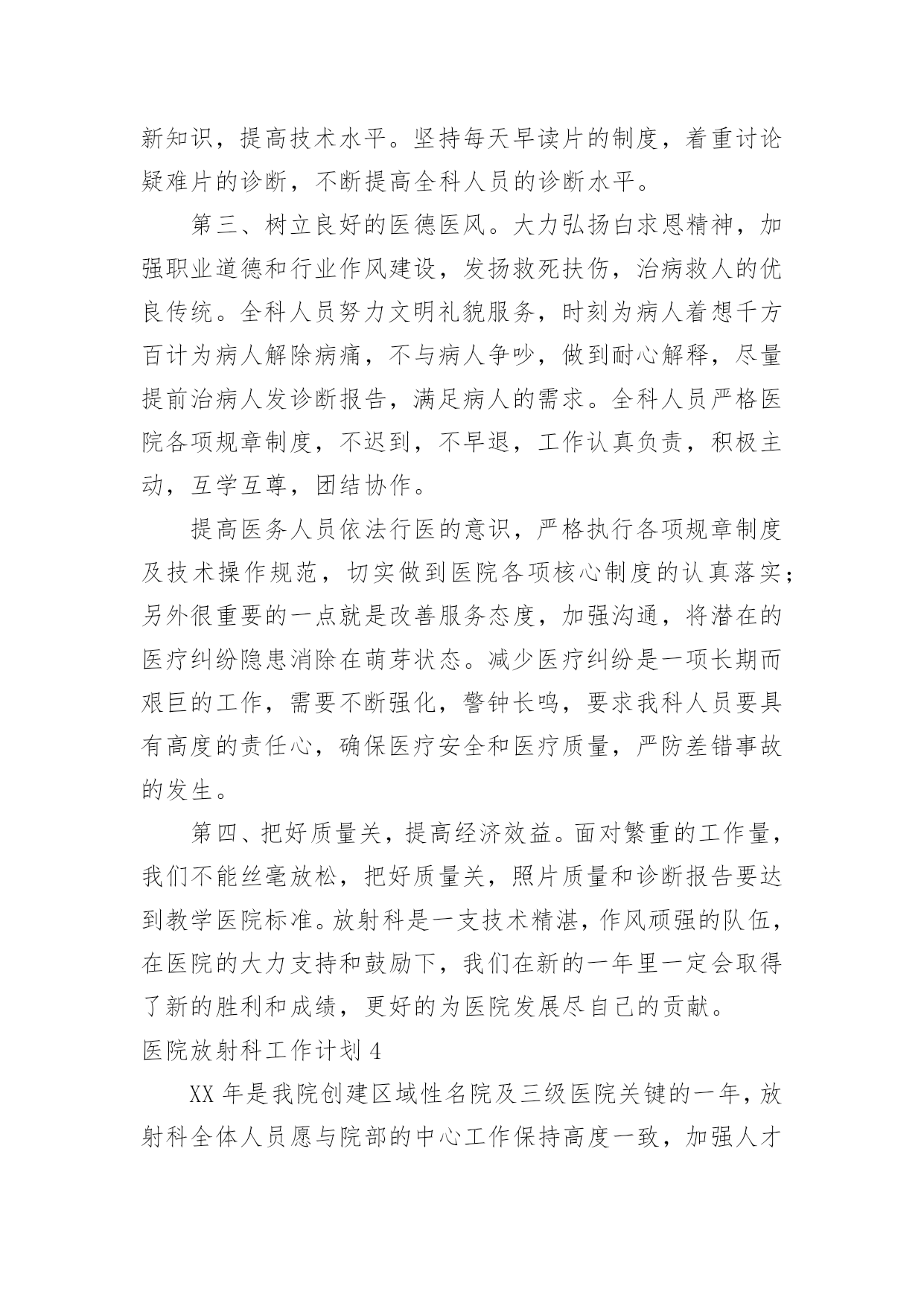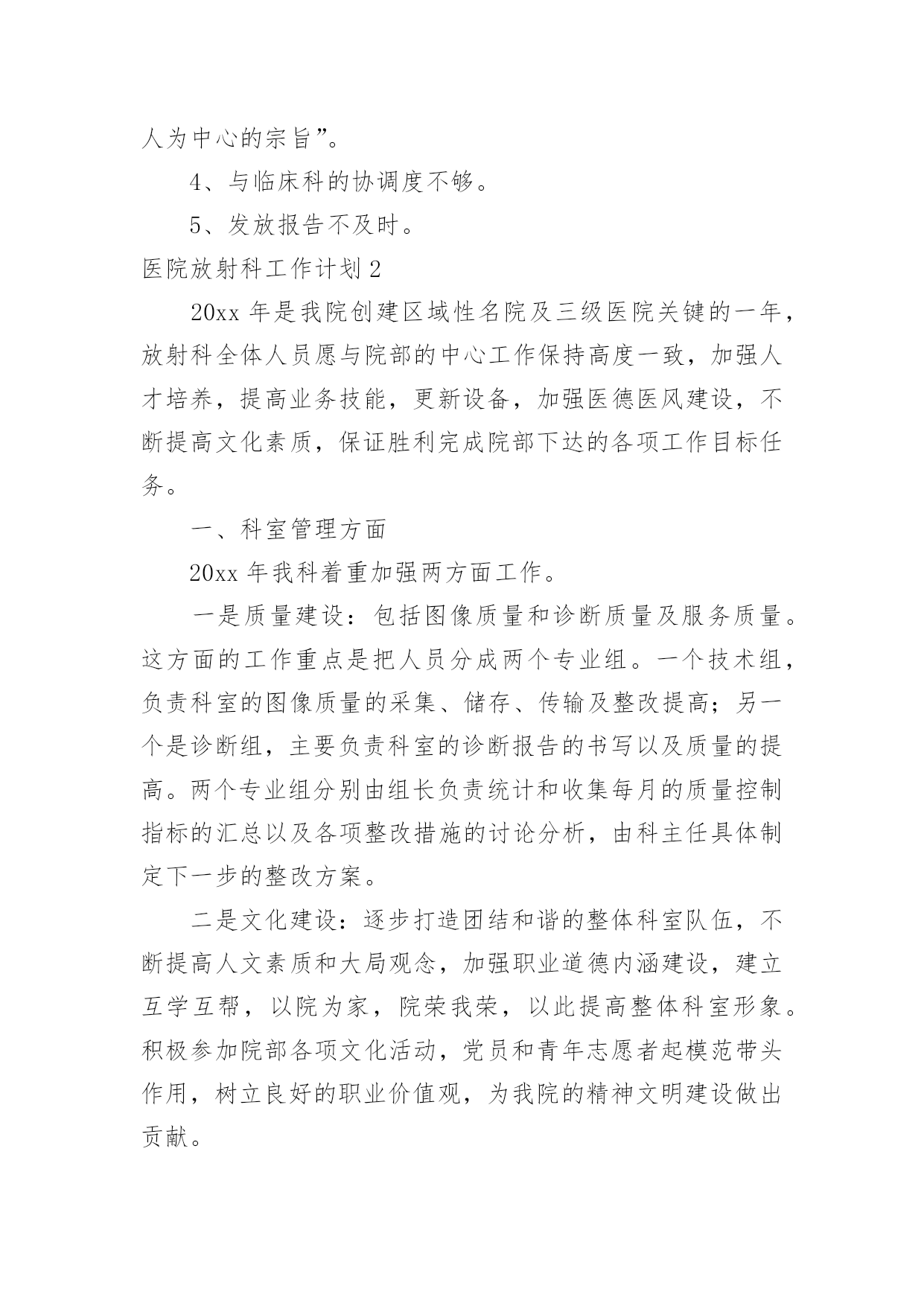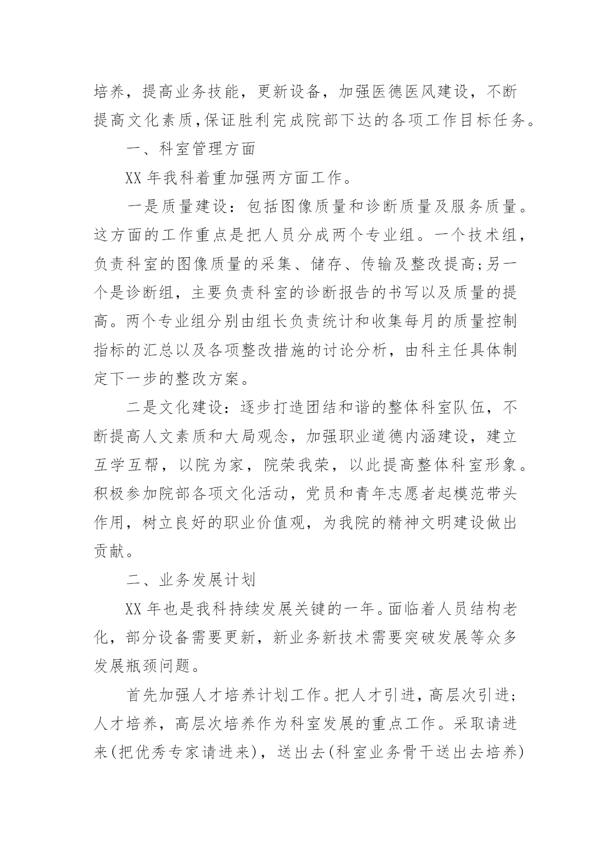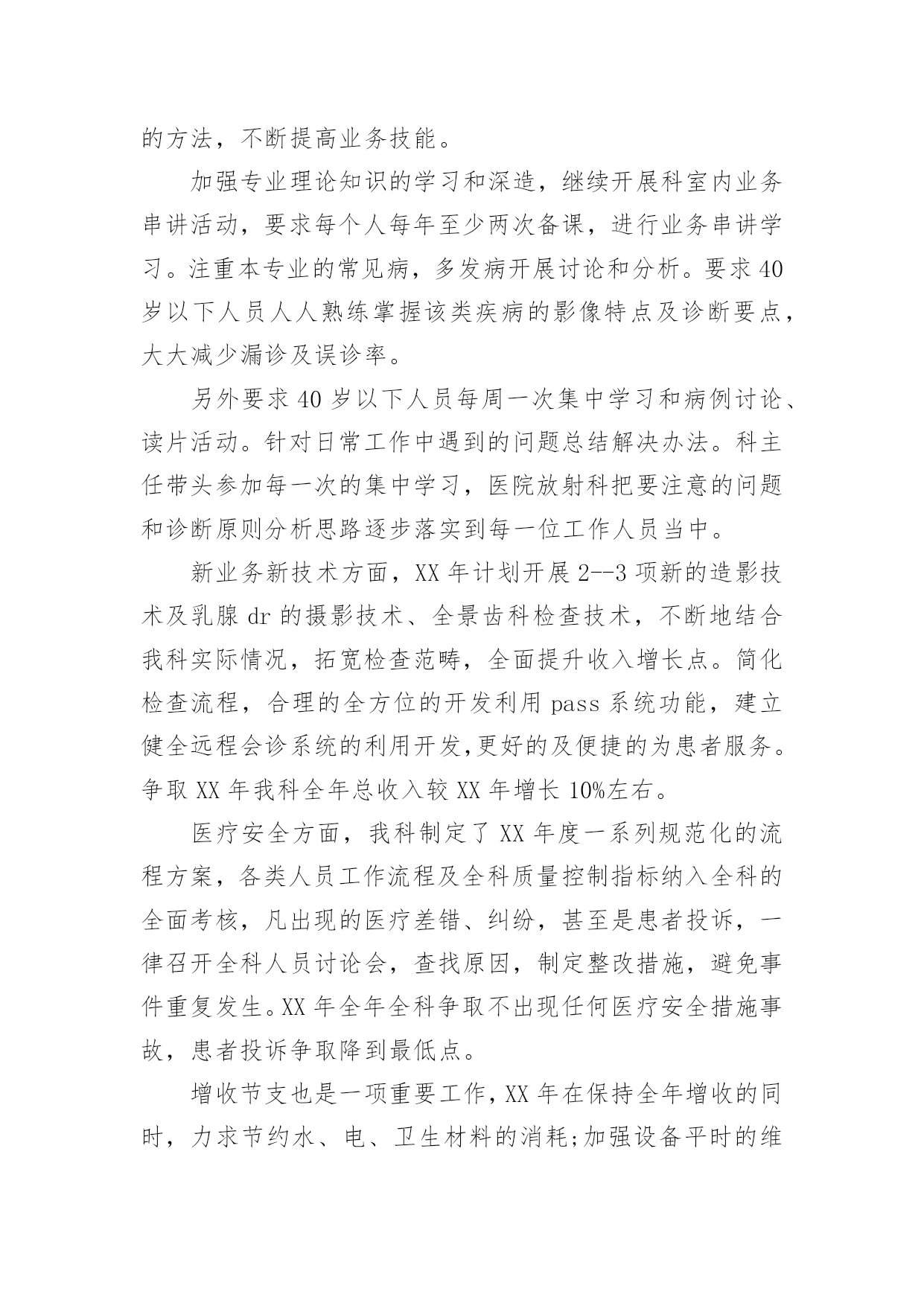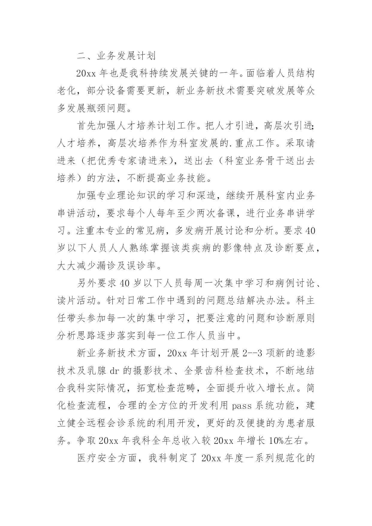 医院放射科工作计划医院放射科工作计划人生天地之间,若白驹过隙,忽然而已,我们的工作又迈入新的阶段,是时候抽出时间写写工作计划了。但是相信很多人都是毫无头绪的状态吧,下面是小编帮大家整理的医院放射科工作计划,欢迎阅读与收藏。医院放射科工作计划1医院放射科工作计划一年来,在院领导的正确领导下,在医院各科室的大力支持下,我科室同志齐心合力,坚持以病人为中心,提高医疗服务质量为主题,树立高度的事业心和责任心,努力学习、钻研业务,围绕本科室的工作性质,求真务实、踏实苦干,较好地完成医院下达的各项工作任务,现将本年度的工作总结和科室开展情况作一系统回顾:一、基本情况放射科分为CT室和普放两个科室,现有医务人员5人,其中1人为聘用人员,CT室2人,普放3人。获资格证书3人,放射上岗证5人具有。医疗设备方面:CT室、西门子CT机一台、柯机激光相机一台、洗片机1台、空调3台,为了报告单的规范整洁,并配置了电脑及打印报告工作部。普放方面:现有上海500mA及北京万东300mAX光机各一台,洗片机2台,空调1台,除湿机1台,为了报告的规范性也配置了电脑以及打印机。二、工作开展情况科室全体人员积极参加院内外的`业务学习,努力提高自己的业务素质和业务水平,不断更新、知识、提高技术水平,加上我院积极开展“树行业新风,创一流服务活动,就医人员不断增加,截止到12月31日”1、普放摄片人数达到4520张,其中合医1080张,医保720张,门诊和住院病人检查2720人次,检查人次比20xx年增加880人次。甲片率张数3616,其符合率达到80%,乙片张数452,其符合率小于15%。诊断符合率达到70%。2、透视方面:干部职工健康体检1102人次,学生1328人次,征兵体检60余人次。特殊造影:48例。其总收入为144390元。CT室:由(10月7日至12月30日)共接待病人338人次,总收入74360元。月收入突破2万元以上。三、存在的问题1、书写报告不规范,详简不一,没有统一认可的标准,漏诊率较高,导致临床不信任放射科报告。2、提高质量不高,许多体位不够标准,有责任心因素,技术因素,暗房及胶片因素。3、部份医生态度差,话语不够温馨,显示不出“以病人为中心的宗旨”。4、与临床科的协调度不够。5、发放报告不及时。医院放射科工作计划220xx年是我院创建区域性名院及三级医院关键的一年,放射科全体人员愿与院部的中心工作保持高度一致,加强人才培养,提高业务技能,更新设备,加强医德医风建设,不断提高文化素质,保证胜利完成院部下达的各项工作目标任务。一、科室管理方面20xx年我科着重加强两方面工作。一是质量建设:包括图像质量和诊断质量及服务质量。这方面的工作重点是把人员分成两个专业组。一个技术组,负责科室的图像质量的采集、储存、传输及整改提高;另一个是诊断组,主要负责科室的诊断报告的书写以及质量的提高。两个专业组分别由组长负责统计和收集每月的质量控制指标的汇总以及各项整改措施的讨论分析,由科主任具体制定下一步的整改方案。二是文化建设:逐步打造团结和谐的整体科室队伍,不断提高人文素质和大局观念,加强职业道德内涵建设,建立互学互帮,以院为家,院荣我荣,以此提高整体科室形象。积极参加院部各项文化活动,党员和青年志愿者起模范带头作用,树立良好的职业价值观,为我院的精神文明建设做出贡献。二、业务发展计划20xx年也是我科持续发展关键的一年。面临着人员结构老化,部分设备需要更新,新业务新技术需要突破发展等众多发展瓶颈问题。首先加强人才培养计划工作。把人才引进,高层次引进;人才培养,高层次培养作为科室发展的.重点工作。采取请进来(把优秀专家请进来),送出去(科室业务骨干送出去培养)的方法,不断提高业务技能。加强专业理论知识的学习和深造,继续开展科室内业务串讲活动,要求每个人每年至少两次备课,进行业务串讲学习。注重本专业的常见病,多发病开展讨论和分析。要求40岁以下人员人人熟练掌握该类疾病的影像特点及诊断要点,大大减少漏诊及误诊率。另外要求40岁以下人员每周一次集中学习和病例讨论、读片活动。针对日常工作中遇到的问题总结解决办法。科主任带头参加每一次的集中学习,把要注意的问题和诊断原则分析思路逐步落实到每一位工作人员当中。新业务新技术方面,20xx年计划开展2--3项新的造影技术及乳腺dr的摄影技术、全景齿科检查技术,不断地结合我科实际情况,拓宽检查范畴,全面提升收入增长点。简化检查流程,合理的全方位的开发利用pass系统功能,建立健全远程会诊系统的利用开发,更好的及便捷的为患者服务。争取20xx年我科全年总收入较20xx年增长10%左右。医疗安全方面,我科制定了20xx年度一系列规范化的流程方案,各类人员工作流程及全科质量控制指标纳入全科的全面考核,凡出现的医疗差错、纠纷,甚至是患者