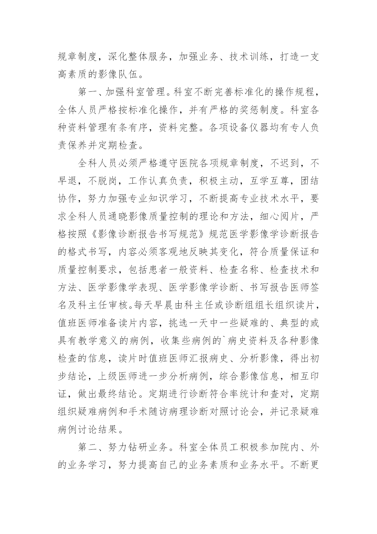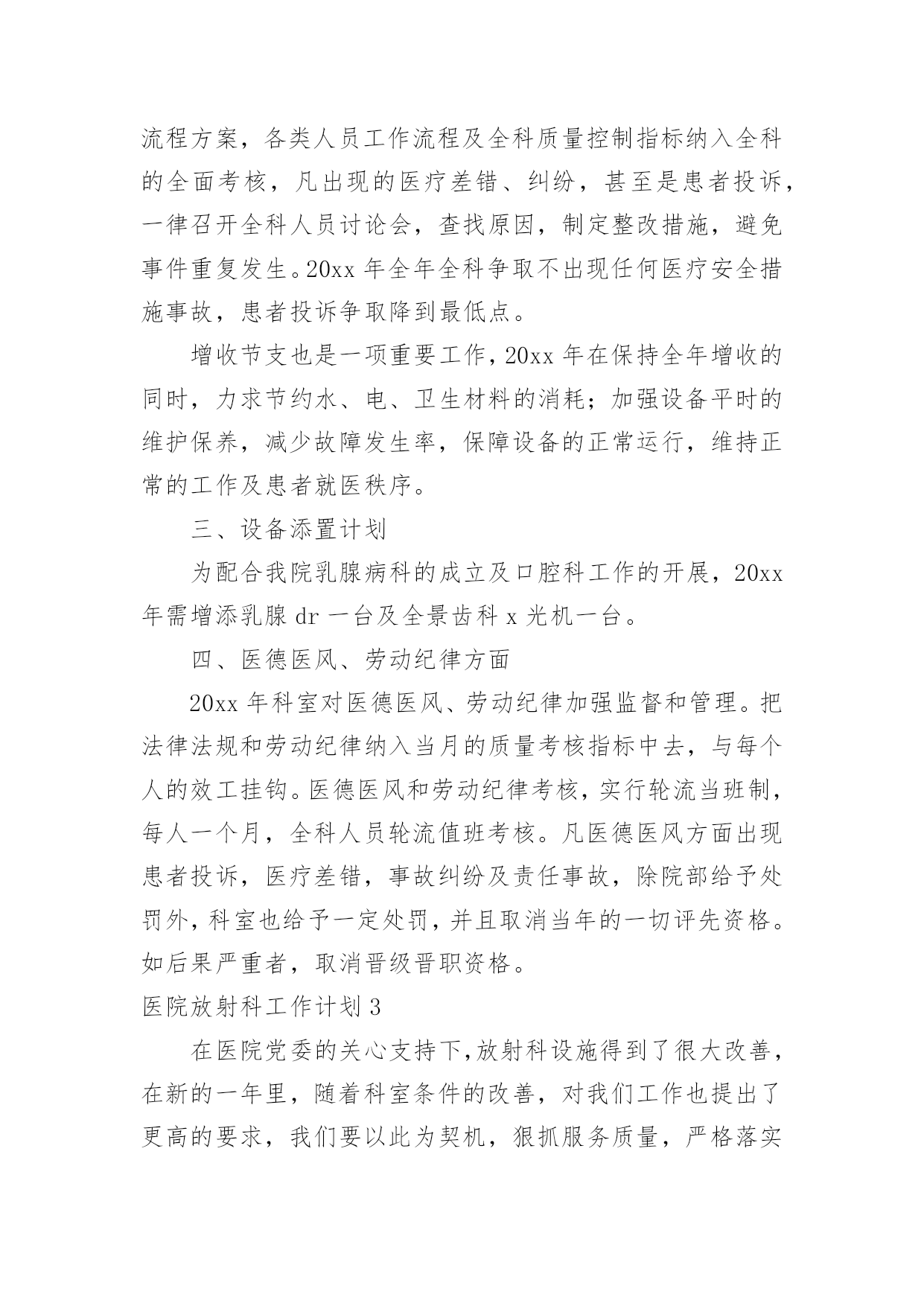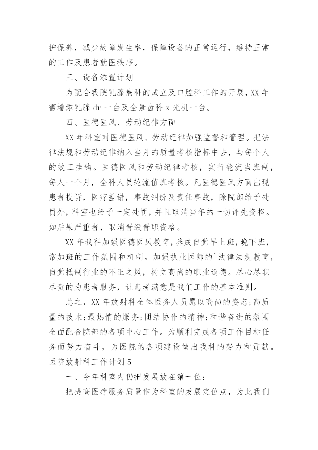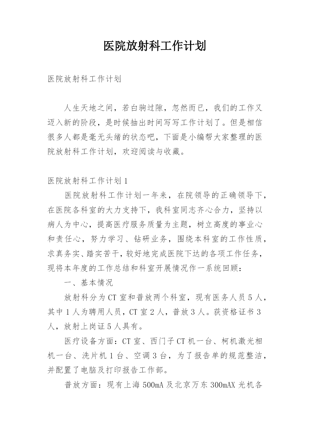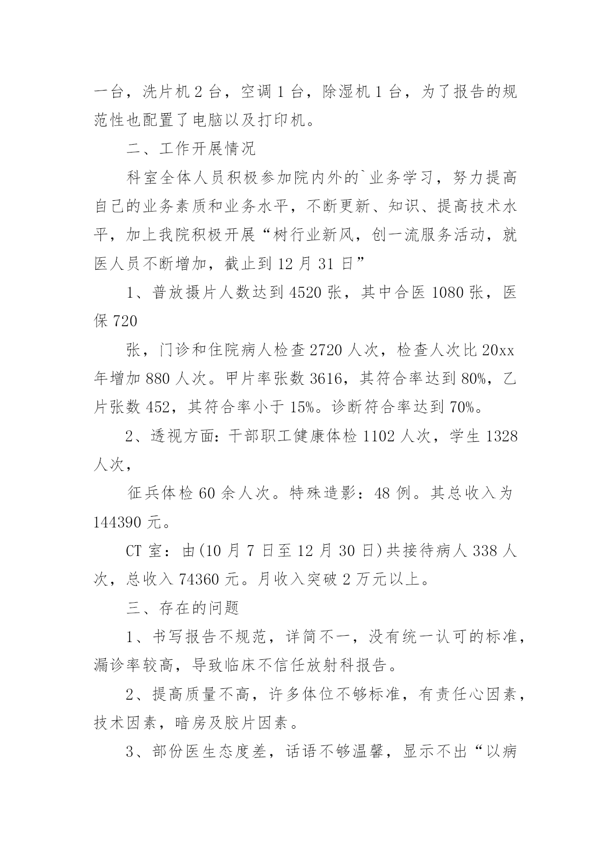 医院放射科工作计划医院放射科工作计划人生天地之间,若白驹过隙,忽然而已,我们的工作又迈入新的阶段,是时候抽出时间写写工作计划了。但是相信很多人都是毫无头绪的状态吧,下面是小编帮大家整理的医院放射科工作计划,欢迎阅读与收藏。医院放射科工作计划1医院放射科工作计划一年来,在院领导的正确领导下,在医院各科室的大力支持下,我科室同志齐心合力,坚持以病人为中心,提高医疗服务质量为主题,树立高度的事业心和责任心,努力学习、钻研业务,围绕本科室的工作性质,求真务实、踏实苦干,较好地完成医院下达的各项工作任务,现将本年度的工作总结和科室开展情况作一系统回顾:一、基本情况放射科分为CT室和普放两个科室,现有医务人员5人,其中1人为聘用人员,CT室2人,普放3人。获资格证书3人,放射上岗证5人具有。医疗设备方面:CT室、西门子CT机一台、柯机激光相机一台、洗片机1台、空调3台,为了报告单的规范整洁,并配置了电脑及打印报告工作部。普放方面:现有上海500mA及北京万东300mAX光机各一台,洗片机2台,空调1台,除湿机1台,为了报告的规范性也配置了电脑以及打印机。二、工作开展情况科室全体人员积极参加院内外的`业务学习,努力提高自己的业务素质和业务水平,不断更新、知识、提高技术水平,加上我院积极开展“树行业新风,创一流服务活动,就医人员不断增加,截止到12月31日”1、普放摄片人数达到4520张,其中合医1080张,医保720张,门诊和住院病人检查2720人次,检查人次比20xx年增加880人次。甲片率张数3616,其符合率达到80%,乙片张数452,其符合率小于15%。诊断符合率达到70%。2、透视方面:干部职工健康体检1102人次,学生1328人次,征兵体检60余人次。特殊造影:48例。其总收入为144390元。CT室:由(10月7日至12月30日)共接待病人338人次,总收入74360元。月收入突破2万元以上。三、存在的问题1、书写报告不规范,详简不一,没有统一认可的标准,漏诊率较高,导致临床不信任放射科报告。2、提高质量不高,许多体位不够标准,有责任心因素,技术因素,暗房及胶片因素。3、部份医生态度差,话语不够温馨,显示不出“以病人为中心的宗旨”。4、与临床科的协调度不够。5、发放报告不及时。医院放射科工作计划220xx年是我院创建区域性名院及三级医院关键的一年,放射科全体人员愿与院部的中心工作保持高度一致,加强人才培养,提高业务技能,更新设备,加强医德医风建设,不断提高文化素质,保证胜利完成院部下达的各项工作目标任务。一、科室管理方面20xx年我科着重加强两方面工作。一是质量建设:包括图像质量和诊断质量及服务质量。这方面的工作重点是把人员分成两个专业组。一个技术组,负责科室的图像质量的采集、储存、传输及整改提高;另一个是诊断组,主要负责科室的诊断报告的书写以及质量的提高。两个专业组分别由组长负责统计和收集每月的质量控制指标的汇总以及各项整改措施的讨论分析,由科主任具体制定下一步的整改方案。二是文化建设:逐步打造团结和谐的整体科室队伍,不断提高人文素质和大局观念,加强职业道德内涵建设,建立互学互帮,以院为家,院荣我荣,以此提高整体科室形象。积极参加院部各项文化活动,党员和青年志愿者起模范带头作用,树立良好的职业价值观,为我院的精神文明建设做出贡献。二、业务发展计划20xx年也是我科持续发展关键的一年。面临着人员结构老化,部分设备需要更新,新业务新技术需要突破发展等众多发展瓶颈问题。首先加强人才培养计划工作。把人才引进,高层次引进;人才培养,高层次培养作为科室发展的.重点工作。采取请进来(把优秀专家请进来),送出去(科室业务骨干送出去培养)的方法,不断提高业务技能。加强专业理论知识的学习和深造,继续开展科室内业务串讲活动,要求每个人每年至少两次备课,进行业务串讲学习。注重本专业的常见病,多发病开展讨论和分析。要求40岁以下人员人人熟练掌握该类疾病的影像特点及诊断要点,大大减少漏诊及误诊率。另外要求40岁以下人员每周一次集中学习和病例讨论、读片活动。针对日常工作中遇到的问题总结解决办法。科主任带头参加每一次的集中学习,把要注意的问题和诊断原则分析思路逐步落实到每一位工作人员当中。新业务新技术方面,20xx年计划开展2--3项新的造影技术及乳腺dr的摄影技术、全景齿科检查技术,不断地结合我科实际情况,拓宽检查范畴,全面提升收入增长点。简化检查流程,合理的全方位的开发利用pass系统功能,建立健全远程会诊系统的利用开发,更好的及便捷的为患者服务。争取20xx年我科全年总收入较20xx年增长10%左右。医疗安全方面,我科制定了20xx年度一系列规范化的流程方案,各类人员工作流程及全科质量控制指标纳入全科的全面考核,凡出现的医疗差错、纠纷,甚至是患者