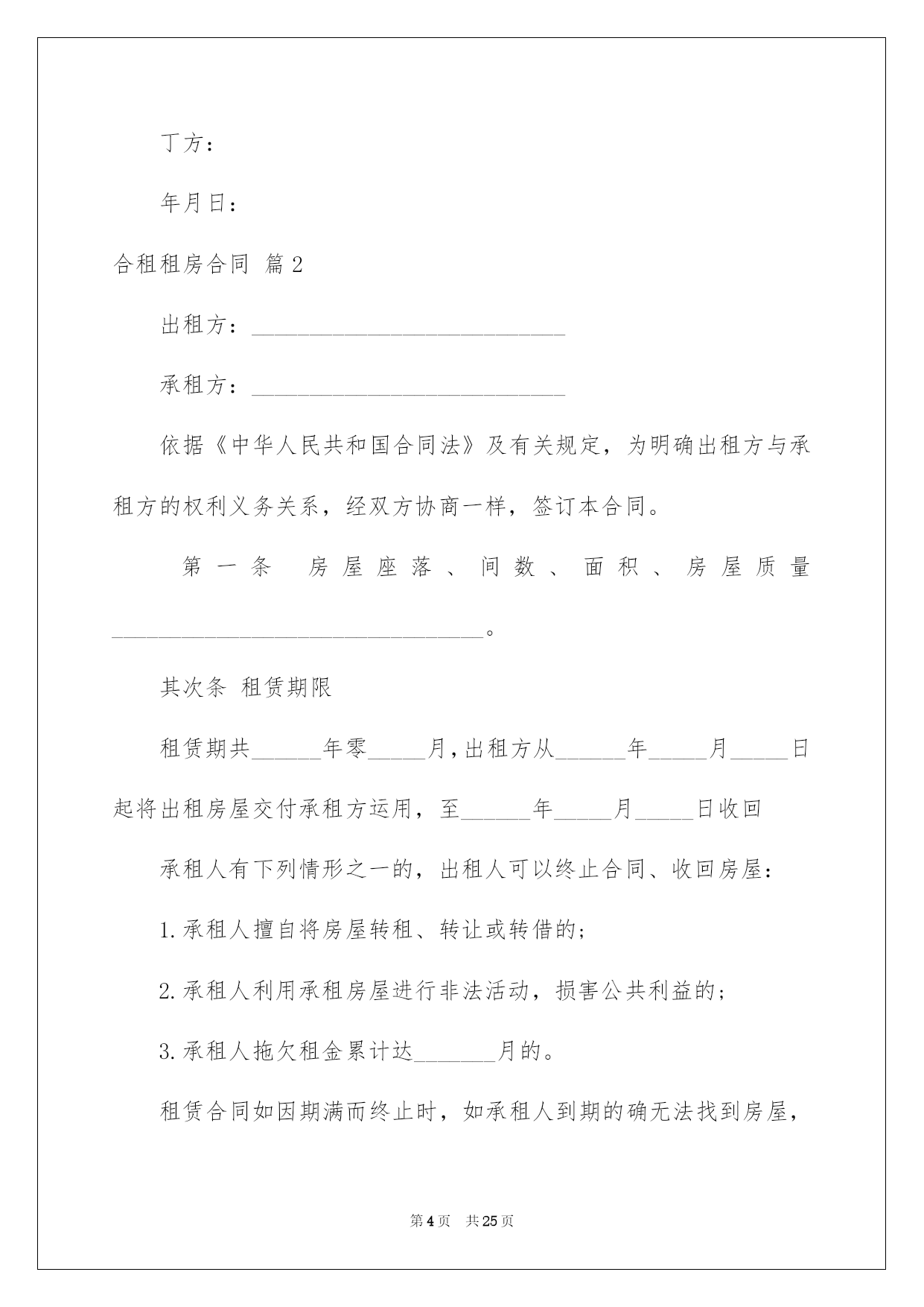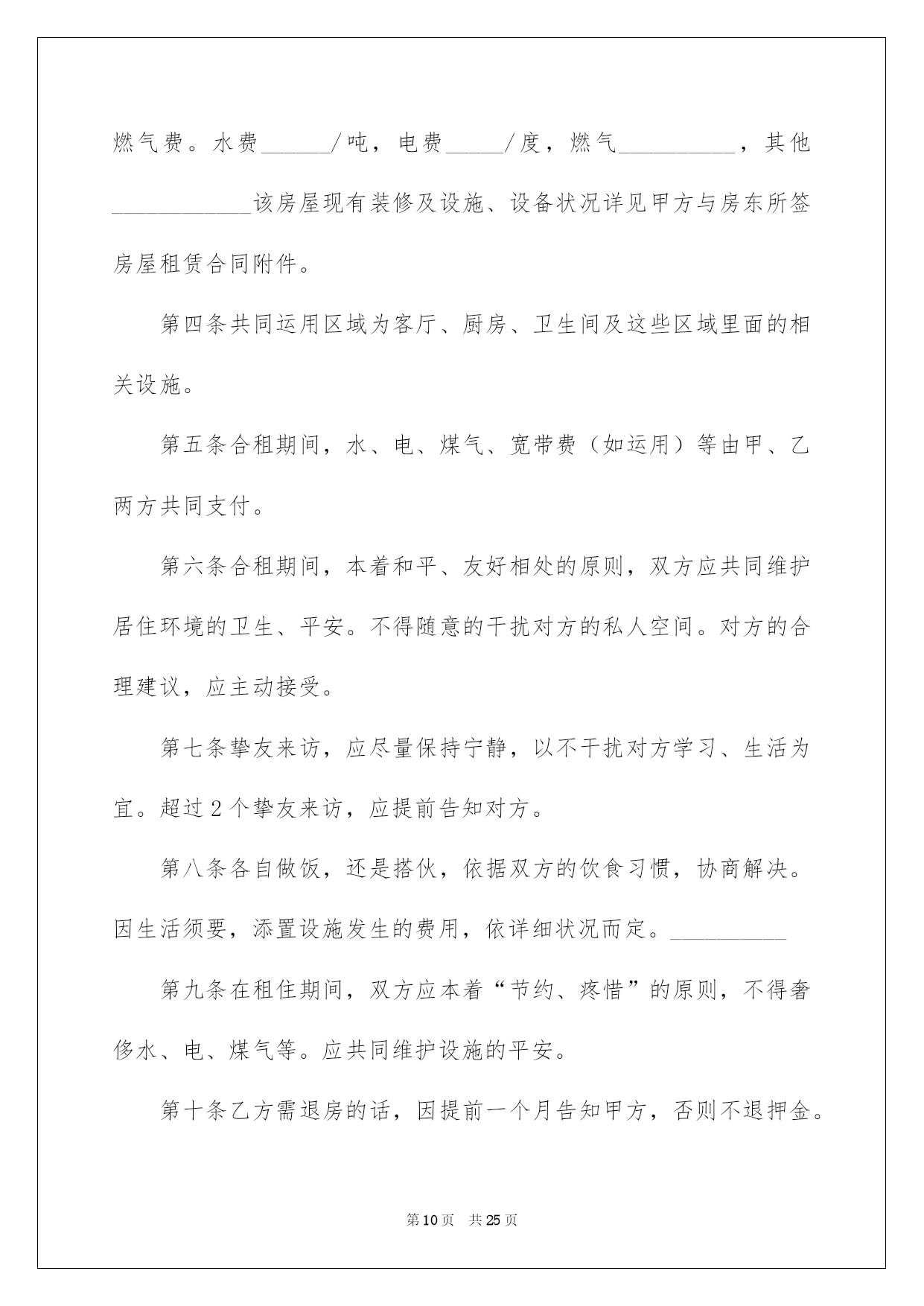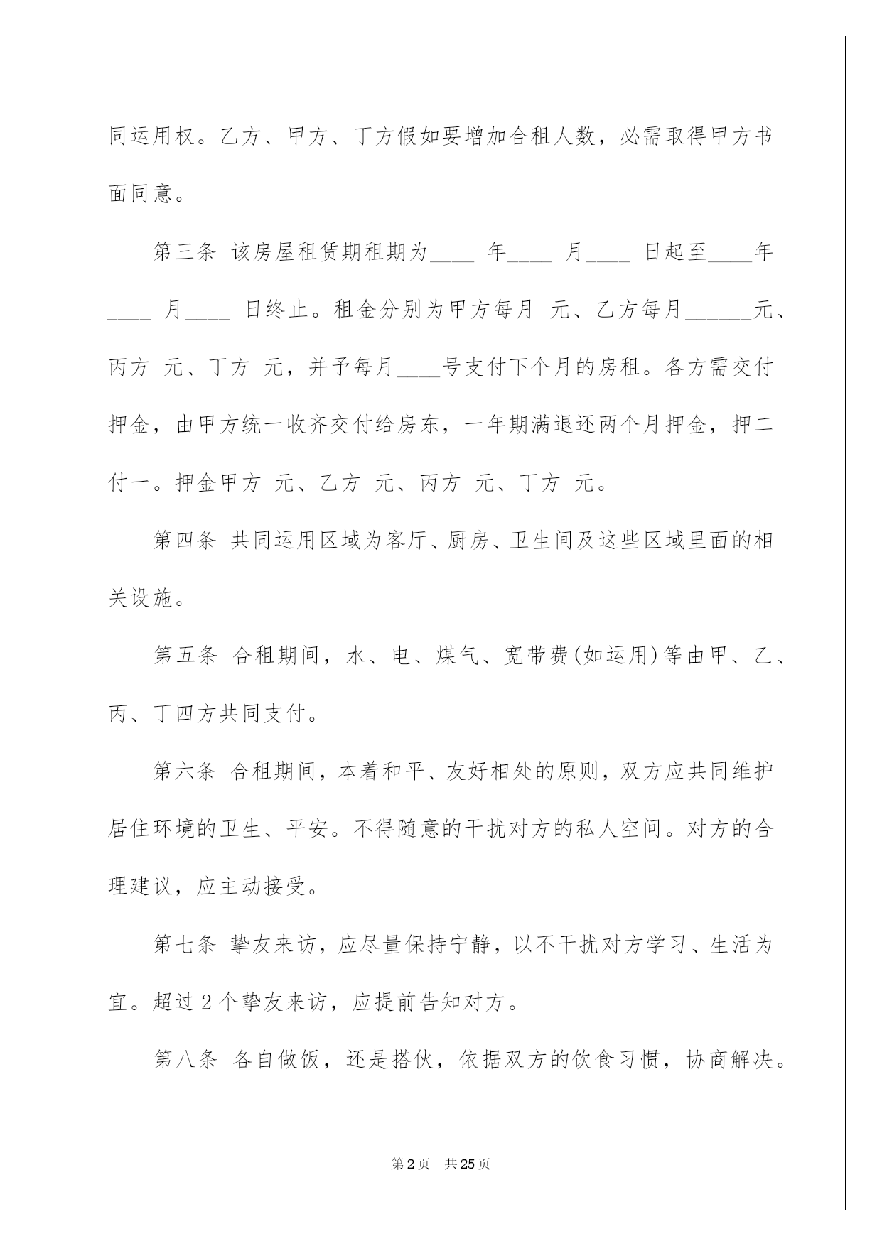 第PAGE\*Arabic\*MERGEFORMAT25页共NUMPAGES\*Arabic\*MERGEFORMAT25页第PAGE\*MERGEFORMAT25页共NUMPAGES\*MERGEFORMAT25页第PAGE\*MERGEFORMAT25页共NUMPAGES\*MERGEFORMAT25页第PAGE\*MERGEFORMAT25页共NUMPAGES\*MERGEFORMAT25页第PAGE\*MERGEFORMAT25页共NUMPAGES\*MERGEFORMAT25页第PAGE\*MERGEFORMAT25页共NUMPAGES\*MERGEFORMAT25页第PAGE\*MERGEFORMAT25页共NUMPAGES\*MERGEFORMAT25页第PAGE\*MERGEFORMAT25页共NUMPAGES\*MERGEFORMAT25页第PAGE\*MERGEFORMAT25页共NUMPAGES\*MERGEFORMAT25页第PAGE\*MERGEFORMAT25页共NUMPAGES\*MERGEFORMAT25页第PAGE\*MERGEFORMAT25页共NUMPAGES\*MERGEFORMAT25页2022合租租房合同合租租房合同范文集合八篇在人们越来越信任法律的社会中,合同的类型越来越多,合同是对双方的保障又是一种约束。信任大家又在为写合同犯愁了吧,下面是我细心整理的合租租房合同8篇,希望能够帮助到大家。合租租房合同篇1本合同当事人:甲方:_________________________身份证号:_________________________乙方:_________________________身份证号:_________________________丙方:身份证号:丁方:身份证号:第一条本合同所指标的为珠海市御花园小区坤宁格1405室。其次条甲方作为联系人,负责和房东联系。乙方、丙方、丁方向甲方支付房租,享有房间客卧的完全独立运用权,以及公共区域的共同运用权。乙方、甲方、丁方假如要增加合租人数,必需取得甲方书面同意。第三条该房屋租赁期租期为____年____月____日起至____年____月____日终止。租金分别为甲方每月元、乙方每月______元、丙方元、丁方元,并予每月____号支付下个月的房租。各方需交付押金,由甲方统一收齐交付给房东,一年期满退还两个月押金,押二付一。押金甲方元、乙方元、丙方元、丁方元。第四条共同运用区域为客厅、厨房、卫生间及这些区域里面的相关设施。第五条合租期间,水、电、煤气、宽带费(如运用)等由甲、乙、丙、丁四方共同支付。第六条合租期间,本着和平、友好相处的原则,双方应共同维护居住环境的卫生、平安。不得随意的干扰对方的私人空间。对方的合理建议,应主动接受。第七条挚友来访,应尽量保持宁静,以不干扰对方学习、生活为宜。超过2个挚友来访,应提前告知对方。第八条各自做饭,还是搭伙,依据双方的饮食习惯,协商解决。因生活须要,添置设施发生的费用,依详细状况而定。第九条在租住期间,双方应本着“节约、疼惜”的原则,不得奢侈水、电、煤气等。应共同维护设施的平安。第十条任何一方需退房的话,因提前一个月告知甲方,否则不退押金。租住不满一月,租金按一个月收取。第十一条任何一方有下列状况之一的,甲方可以终止协议,收回房屋运用权。1、未经甲方许可擅自将房屋转租、转让或转借的。2、利用承租房进行非法活动,损害社会公共利益,产生噪音,影响办公及楼上居民生活的。第十二条因为合租的特别性质,甲方和房东租赁关系中止时,本合租合同自动失效,甲方不负违约责任。甲方也必需在与房东解除合约前半个月,知会各方。第十三条本合同自订立之日起,即告生效。甲方:_______________乙方:____________________丙方:丁方:年月日:合租租房合同篇2出租方:___________________________承租方:___________________________依据《中华人民共和国合同法》及有关规定,为明确出租方与承租方的权利义务关系,经双方协商一样,签订本合同。第一条房屋座落、间数、面积、房屋质量________________________________。其次条租赁期限租赁期共______年零_____月,出租方从______年_____月_____日起将出租房屋交付承租方运用,至______年_____月_____日收回承租人有下列情形之一的,出租人可以终止合同、收回房屋:1.承租人擅自将房屋转租、转让或转借的