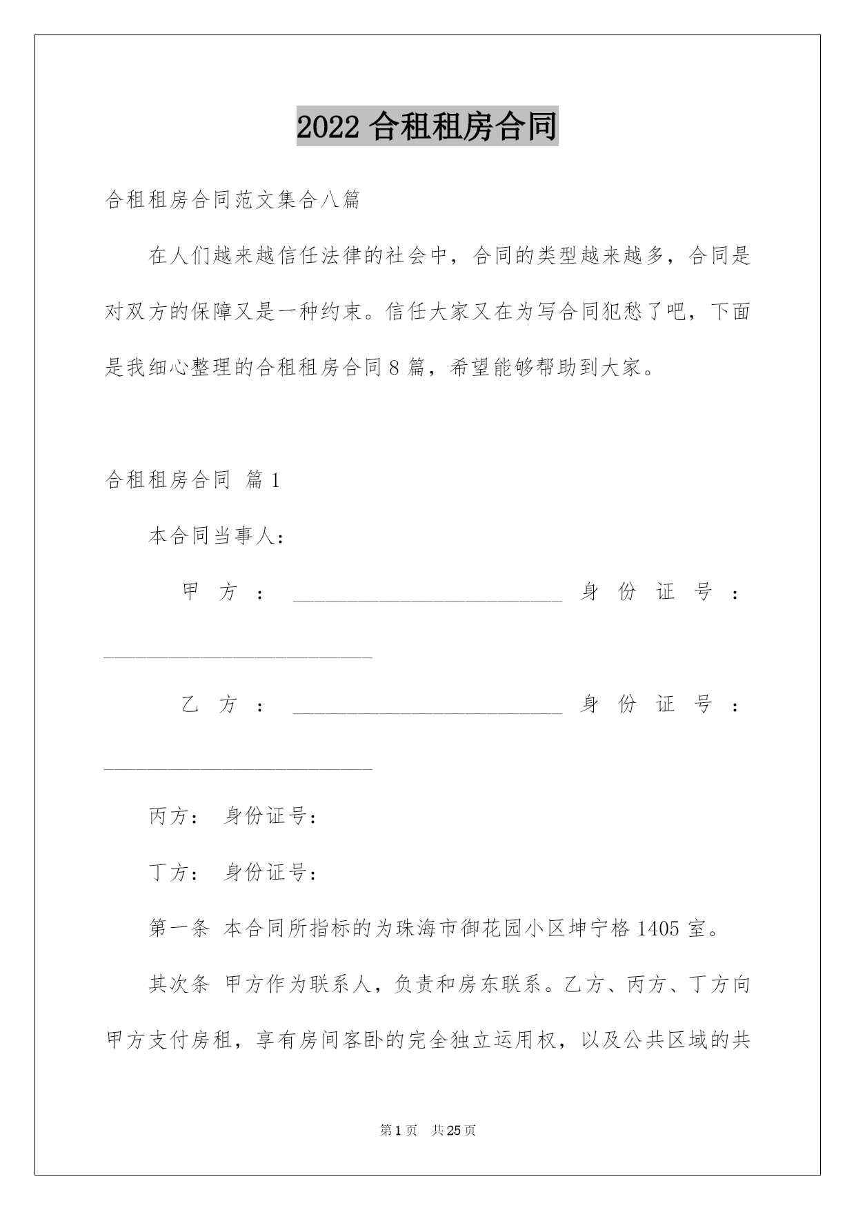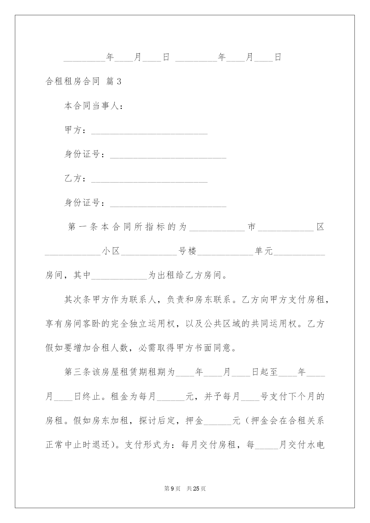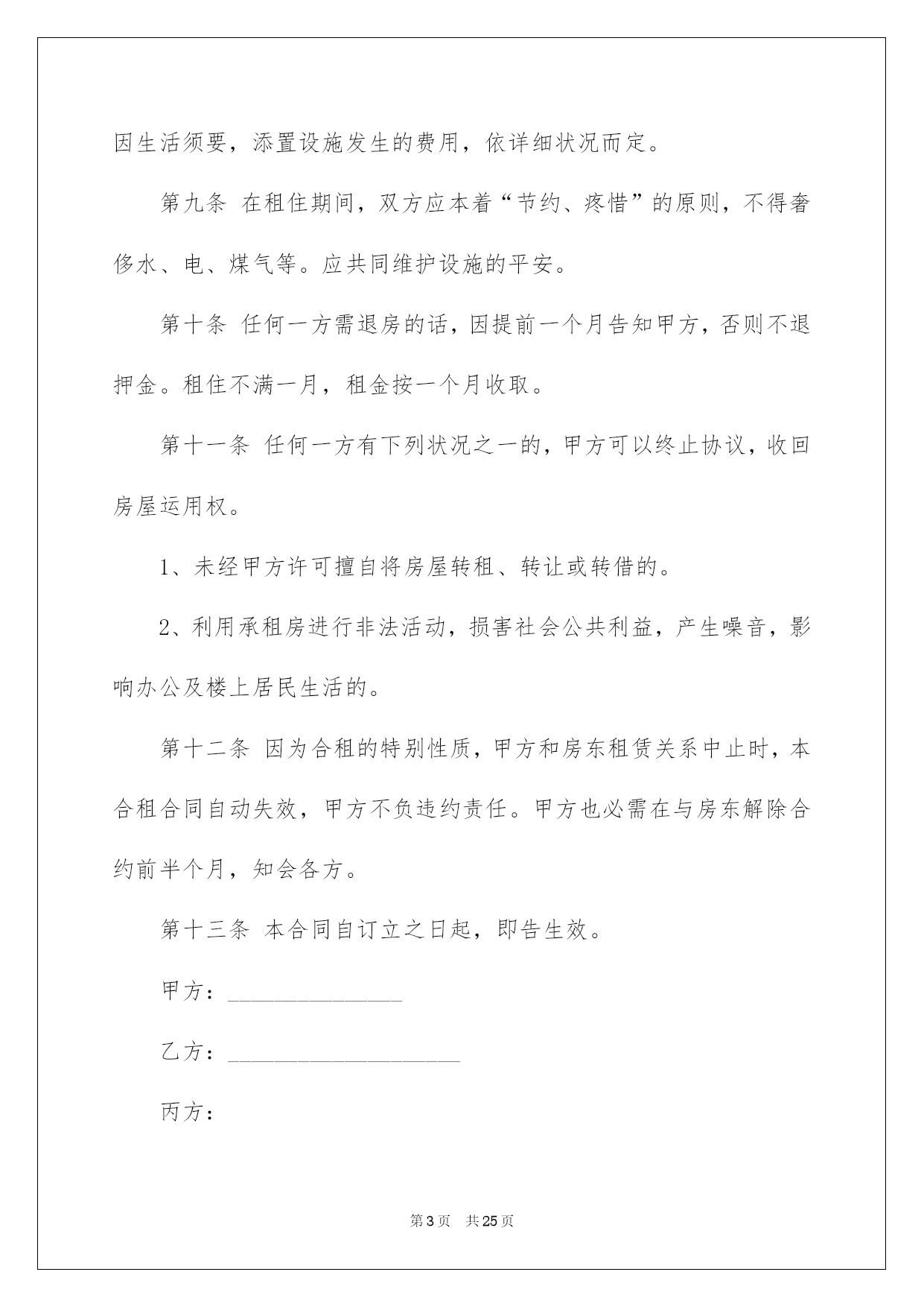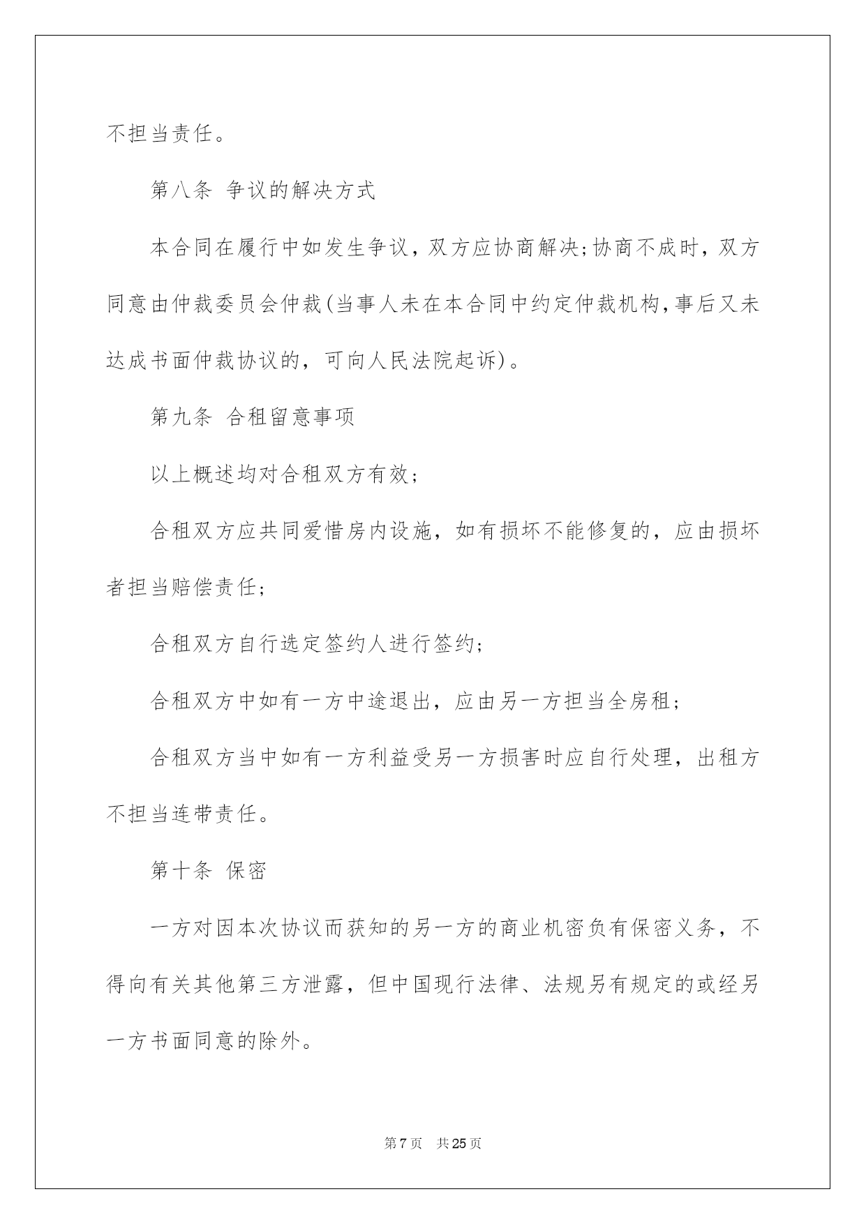 第PAGE\*Arabic\*MERGEFORMAT25页共NUMPAGES\*Arabic\*MERGEFORMAT25页第PAGE\*MERGEFORMAT25页共NUMPAGES\*MERGEFORMAT25页第PAGE\*MERGEFORMAT25页共NUMPAGES\*MERGEFORMAT25页第PAGE\*MERGEFORMAT25页共NUMPAGES\*MERGEFORMAT25页第PAGE\*MERGEFORMAT25页共NUMPAGES\*MERGEFORMAT25页第PAGE\*MERGEFORMAT25页共NUMPAGES\*MERGEFORMAT25页第PAGE\*MERGEFORMAT25页共NUMPAGES\*MERGEFORMAT25页第PAGE\*MERGEFORMAT25页共NUMPAGES\*MERGEFORMAT25页第PAGE\*MERGEFORMAT25页共NUMPAGES\*MERGEFORMAT25页第PAGE\*MERGEFORMAT25页共NUMPAGES\*MERGEFORMAT25页第PAGE\*MERGEFORMAT25页共NUMPAGES\*MERGEFORMAT25页2022合租租房合同合租租房合同范文集合八篇在人们越来越信任法律的社会中,合同的类型越来越多,合同是对双方的保障又是一种约束。信任大家又在为写合同犯愁了吧,下面是我细心整理的合租租房合同8篇,希望能够帮助到大家。合租租房合同篇1本合同当事人:甲方:_________________________身份证号:_________________________乙方:_________________________身份证号:_________________________丙方:身份证号:丁方:身份证号:第一条本合同所指标的为珠海市御花园小区坤宁格1405室。其次条甲方作为联系人,负责和房东联系。乙方、丙方、丁方向甲方支付房租,享有房间客卧的完全独立运用权,以及公共区域的共同运用权。乙方、甲方、丁方假如要增加合租人数,必需取得甲方书面同意。第三条该房屋租赁期租期为____年____月____日起至____年____月____日终止。租金分别为甲方每月元、乙方每月______元、丙方元、丁方元,并予每月____号支付下个月的房租。各方需交付押金,由甲方统一收齐交付给房东,一年期满退还两个月押金,押二付一。押金甲方元、乙方元、丙方元、丁方元。第四条共同运用区域为客厅、厨房、卫生间及这些区域里面的相关设施。第五条合租期间,水、电、煤气、宽带费(如运用)等由甲、乙、丙、丁四方共同支付。第六条合租期间,本着和平、友好相处的原则,双方应共同维护居住环境的卫生、平安。不得随意的干扰对方的私人空间。对方的合理建议,应主动接受。第七条挚友来访,应尽量保持宁静,以不干扰对方学习、生活为宜。超过2个挚友来访,应提前告知对方。第八条各自做饭,还是搭伙,依据双方的饮食习惯,协商解决。因生活须要,添置设施发生的费用,依详细状况而定。第九条在租住期间,双方应本着“节约、疼惜”的原则,不得奢侈水、电、煤气等。应共同维护设施的平安。第十条任何一方需退房的话,因提前一个月告知甲方,否则不退押金。租住不满一月,租金按一个月收取。第十一条任何一方有下列状况之一的,甲方可以终止协议,收回房屋运用权。1、未经甲方许可擅自将房屋转租、转让或转借的。2、利用承租房进行非法活动,损害社会公共利益,产生噪音,影响办公及楼上居民生活的。第十二条因为合租的特别性质,甲方和房东租赁关系中止时,本合租合同自动失效,甲方不负违约责任。甲方也必需在与房东解除合约前半个月,知会各方。第十三条本合同自订立之日起,即告生效。甲方:_______________乙方:____________________丙方:丁方:年月日:合租租房合同篇2出租方:___________________________承租方:___________________________依据《中华人民共和国合同法》及有关规定,为明确出租方与承租方的权利义务关系,经双方协商一样,签订本合同。第一条房屋座落、间数、面积、房屋质量________________________________。其次条租赁期限租赁期共______年零_____月,出租方从______年_____月_____日起将出租房屋交付承租方运用,至______年_____月_____日收回承租人有下列情形之一的,出租人可以终止合同、收回房屋:1.承租人擅自将房屋转租、转让或转借的