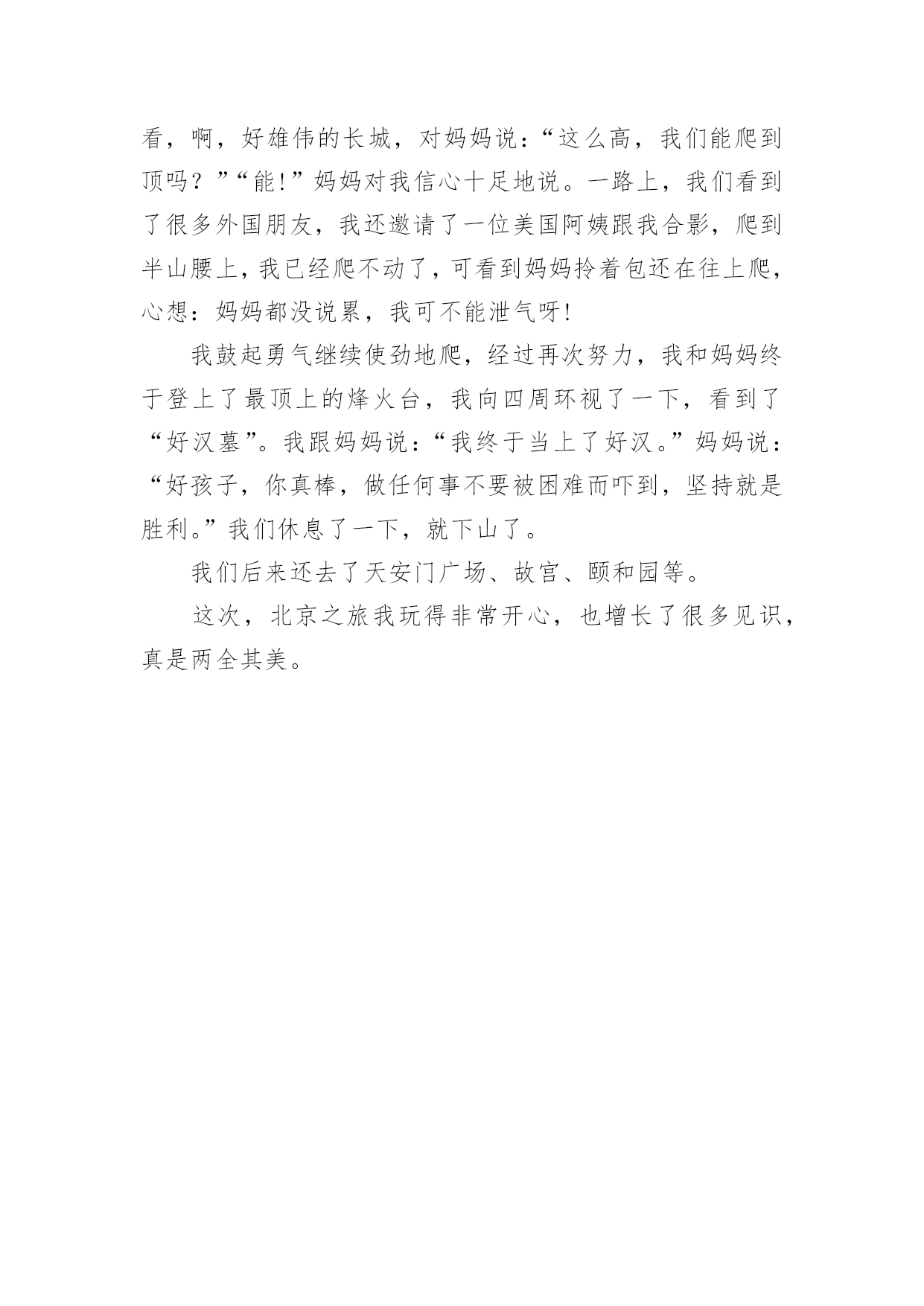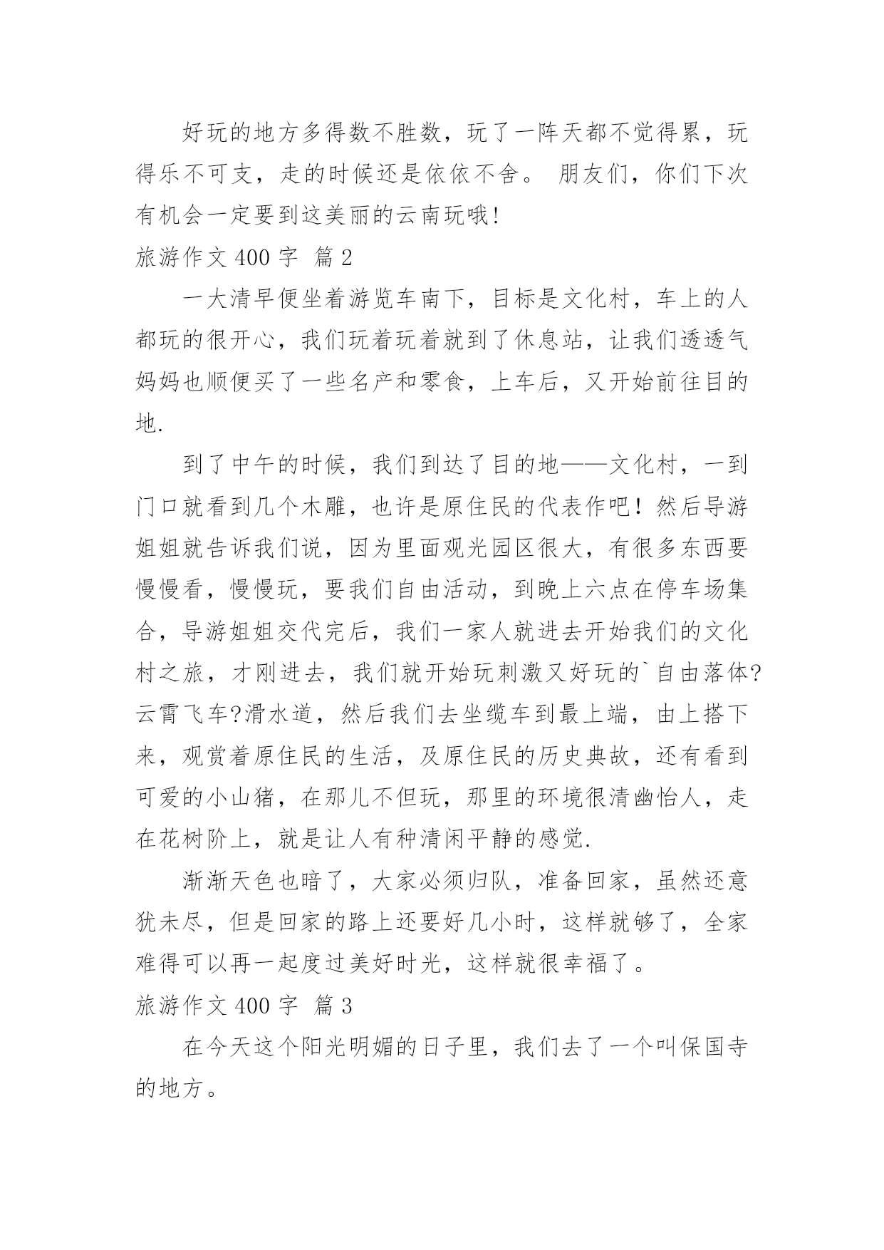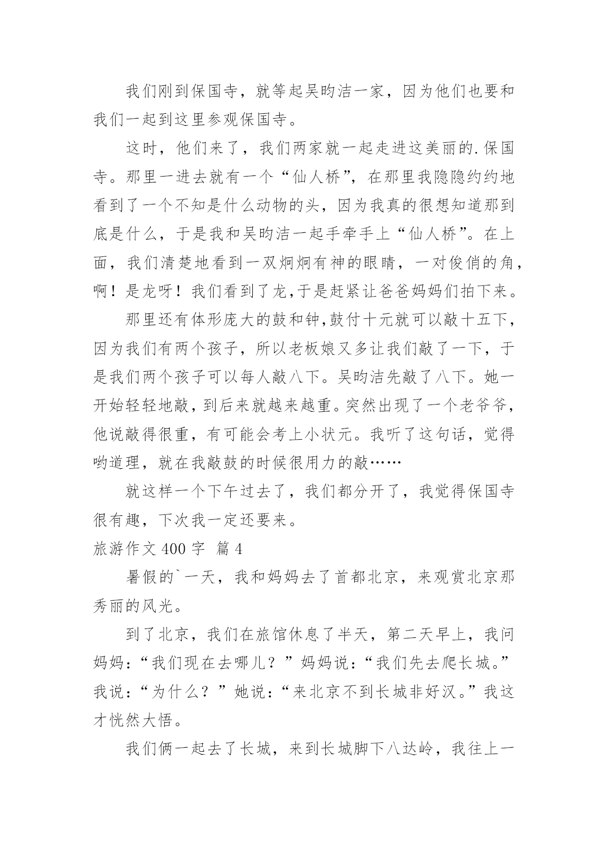 旅游作文400字旅游作文400字在平凡的学习、工作、生活中,大家都经常接触到作文吧,根据写作命题的特点,作文可以分为命题作文和非命题作文。怎么写作文才能避免踩雷呢?以下是小编精心整理的旅游作文400字4篇,仅供参考,希望能够帮助到大家。旅游作文400字篇1去年寒假,我们一家人去了云南-----妈妈的老家过年。妈妈的老家位于云南省大理州永平县。离过年还有二十多天的时候,爸爸妈妈带我们去了云南保山玩。4我们做了将近一个小时的车,就到了保山。到了保山,我们就去了保山外婆家里(保山外婆就是我外公的妹妹),到了外婆家之后,我们吃了中餐,休息了一个下午,到第二天就去玩;第二天我们吃完早饭之后:收拾收拾了东西,我们出发了,我们去了太保公园玩。到了太保公园,首先映入眼帘的是大门,它上面有一块匾,上面写着“太保公园”四个大字。然后,我们进去了,很开心的走进去,可是''乐极生悲'',我们还要走一大截路,不过,这是一段盘山公路,这里空气清新,闻起来就让人心情愉快,这里的树都是原始森林的'树呢!欧耶!终于到了一阵欢呼雀跃的声音不绝于耳。这里有很多好玩的地方,我们玩了很久。还看到了孔雀.......这里还有保山历史名人堂,武侯祠.......好玩的地方多得数不胜数,玩了一阵天都不觉得累,玩得乐不可支,走的时候还是依依不舍。朋友们,你们下次有机会一定要到这美丽的云南玩哦!旅游作文400字篇2一大清早便坐着游览车南下,目标是文化村,车上的人都玩的很开心,我们玩着玩着就到了休息站,让我们透透气妈妈也顺便买了一些名产和零食,上车后,又开始前往目的地.到了中午的时候,我们到达了目的地——文化村,一到门口就看到几个木雕,也许是原住民的代表作吧!然后导游姐姐就告诉我们说,因为里面观光园区很大,有很多东西要慢慢看,慢慢玩,要我们自由活动,到晚上六点在停车场集合,导游姐姐交代完后,我们一家人就进去开始我们的文化村之旅,才刚进去,我们就开始玩刺激又好玩的`自由落体?云霄飞车?滑水道,然后我们去坐缆车到最上端,由上搭下来,观赏着原住民的生活,及原住民的历史典故,还有看到可爱的小山猪,在那儿不但玩,那里的环境很清幽怡人,走在花树阶上,就是让人有种清闲平静的感觉.渐渐天色也暗了,大家必须归队,准备回家,虽然还意犹未尽,但是回家的路上还要好几小时,这样就够了,全家难得可以再一起度过美好时光,这样就很幸福了。旅游作文400字篇3在今天这个阳光明媚的日子里,我们去了一个叫保国寺的地方。我们刚到保国寺,就等起吴昀洁一家,因为他们也要和我们一起到这里参观保国寺。这时,他们来了,我们两家就一起走进这美丽的.保国寺。那里一进去就有一个“仙人桥”,在那里我隐隐约约地看到了一个不知是什么动物的头,因为我真的很想知道那到底是什么,于是我和吴昀洁一起手牵手上“仙人桥”。在上面,我们清楚地看到一双炯炯有神的眼睛,一对俊俏的角,啊!是龙呀!我们看到了龙,于是赶紧让爸爸妈妈们拍下来。那里还有体形庞大的鼓和钟,鼓付十元就可以敲十五下,因为我们有两个孩子,所以老板娘又多让我们敲了一下,于是我们两个孩子可以每人敲八下。吴昀洁先敲了八下。她一开始轻轻地敲,到后来就越来越重。突然出现了一个老爷爷,他说敲得很重,有可能会考上小状元。我听了这句话,觉得哟道理,就在我敲鼓的时候很用力的敲……就这样一个下午过去了,我们都分开了,我觉得保国寺很有趣,下次我一定还要来。旅游作文400字篇4暑假的`一天,我和妈妈去了首都北京,来观赏北京那秀丽的风光。到了北京,我们在旅馆休息了半天,第二天早上,我问妈妈:“我们现在去哪儿?”妈妈说:“我们先去爬长城。”我说:“为什么?”她说:“来北京不到长城非好汉。”我这才恍然大悟。我们俩一起去了长城,来到长城脚下八达岭,我往上一看,啊,好雄伟的长城,对妈妈说:“这么高,我们能爬到顶吗?”“能!”妈妈对我信心十足地说。一路上,我们看到了很多外国朋友,我还邀请了一位美国阿姨跟我合影,爬到半山腰上,我已经爬不动了,可看到妈妈拎着包还在往上爬,心想:妈妈都没说累,我可不能泄气呀!我鼓起勇气继续使劲地爬,经过再次努力,我和妈妈终于登上了最顶上的烽火台,我向四周环视了一下,看到了“好汉墓”。我跟妈妈说:“我终于当上了好汉。”妈妈说:“好孩子,你真棒,做任何事不要被困难而吓到,坚持就是胜利。”我们休息了一下,就下山了。我们后来还去了天安门广场、故宫、颐和园等。这次,北京之旅我玩得非常开心,也增长了很多见识,真是两全其美。