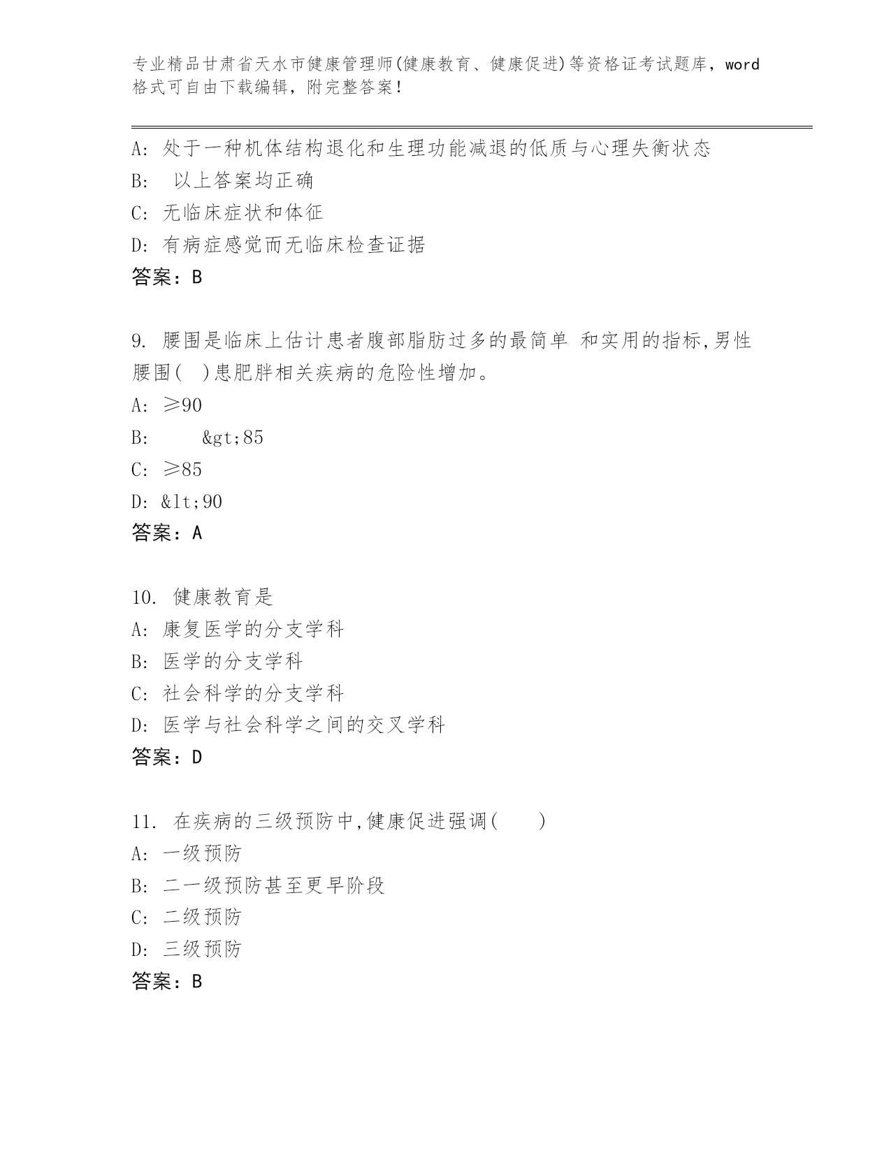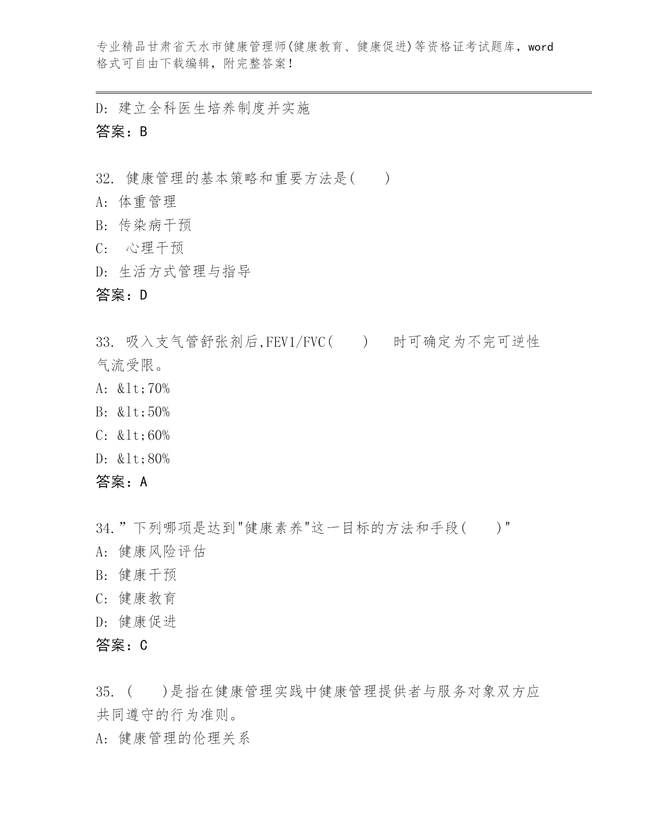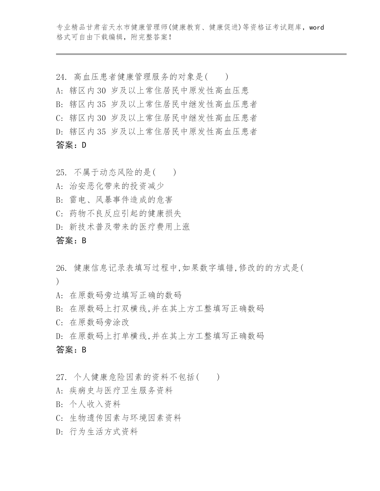 精编甘肃省天水市健康管理师(健康教育、健康促进)等资格证考试大全(精品).docx