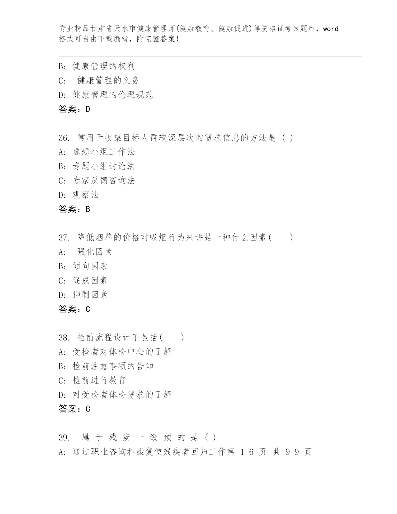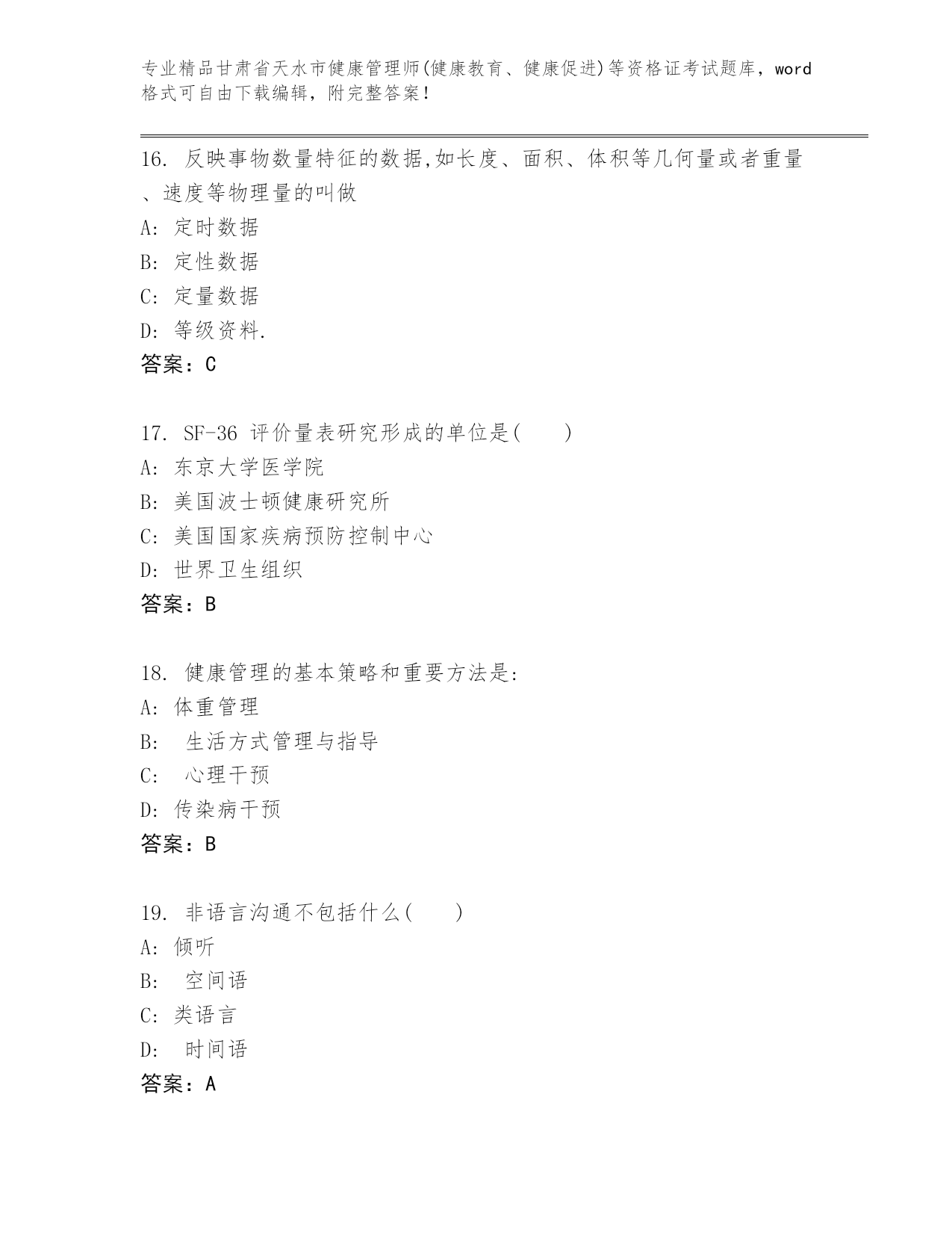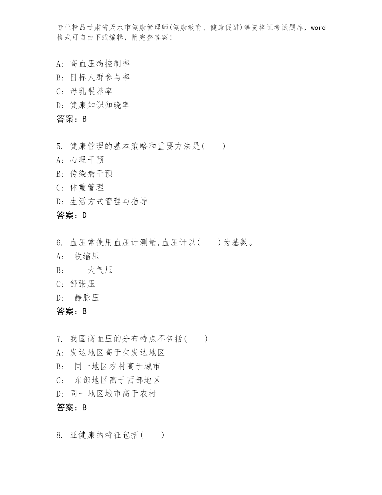 精编甘肃省天水市健康管理师(健康教育、健康促进)等资格证考试大全(精品).docx