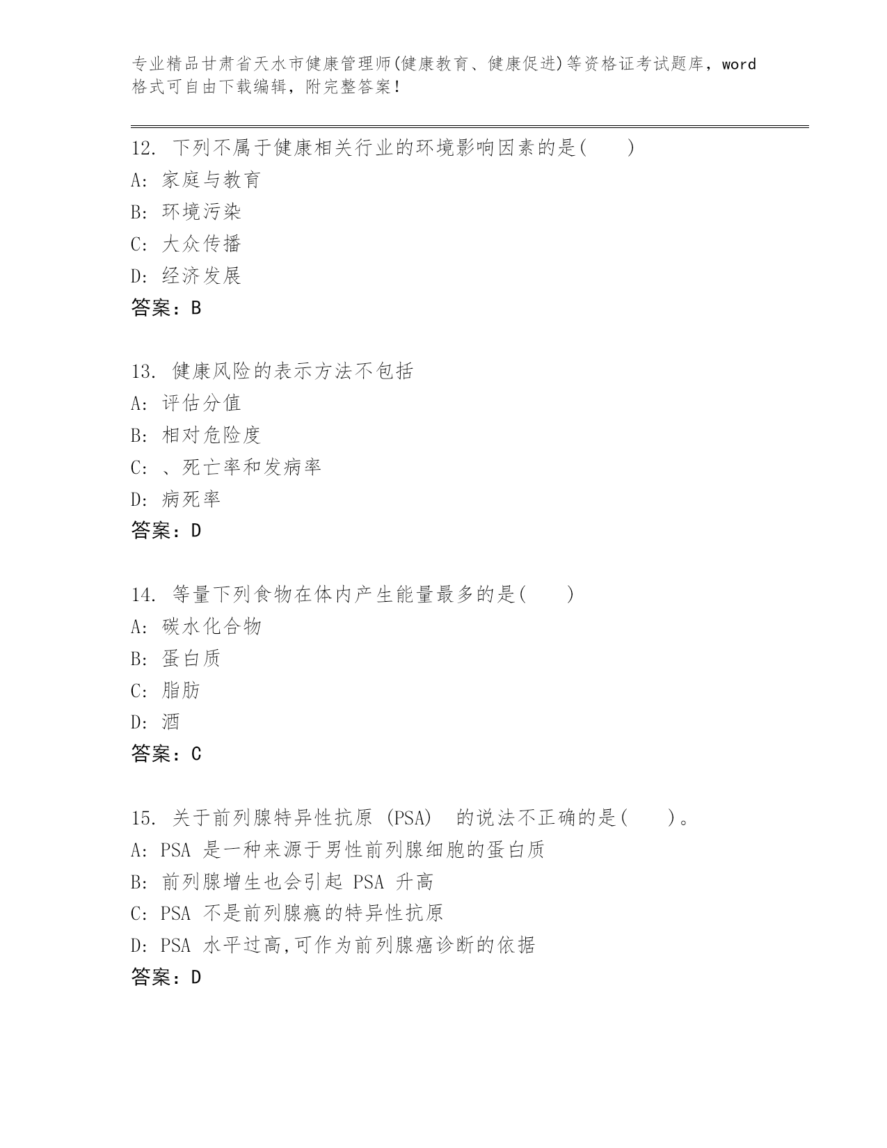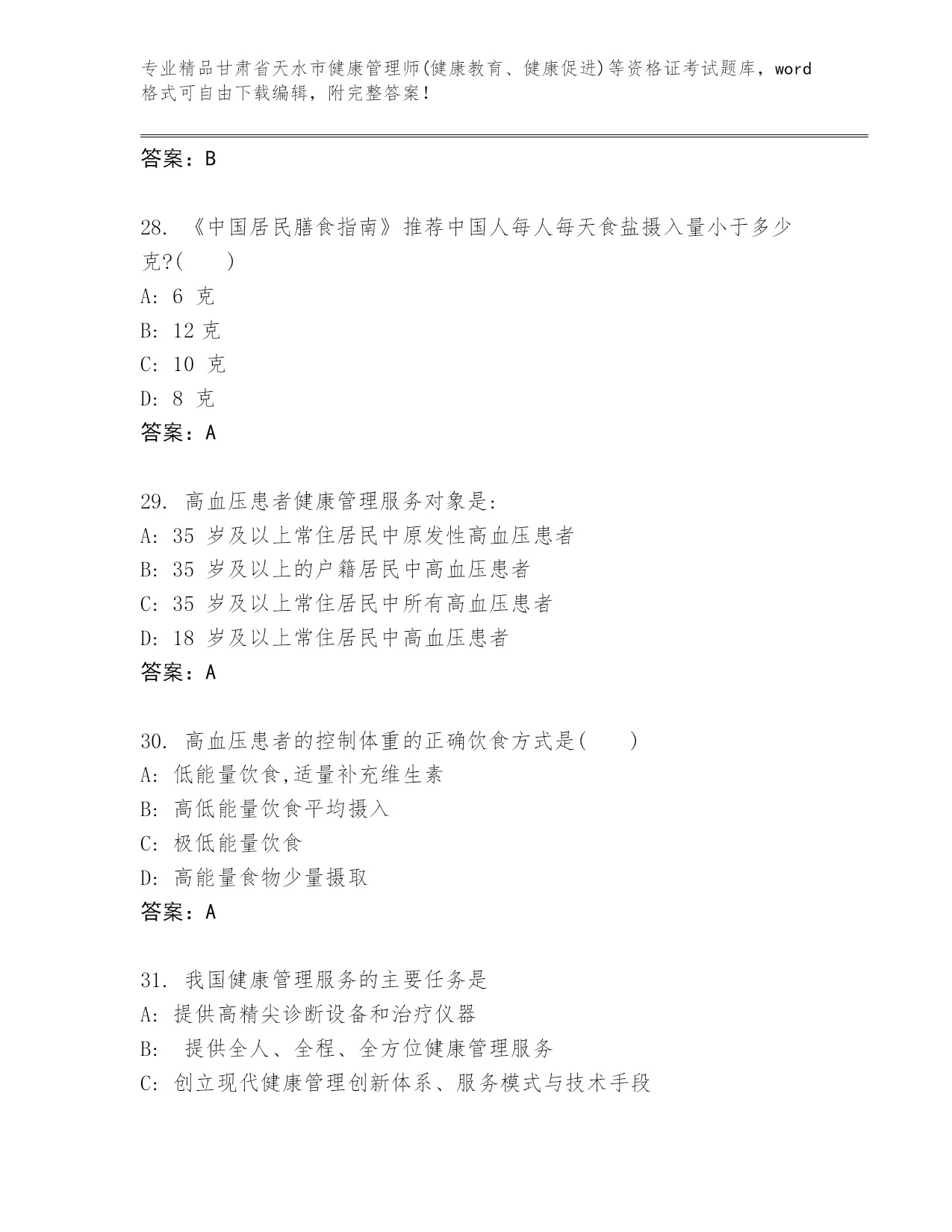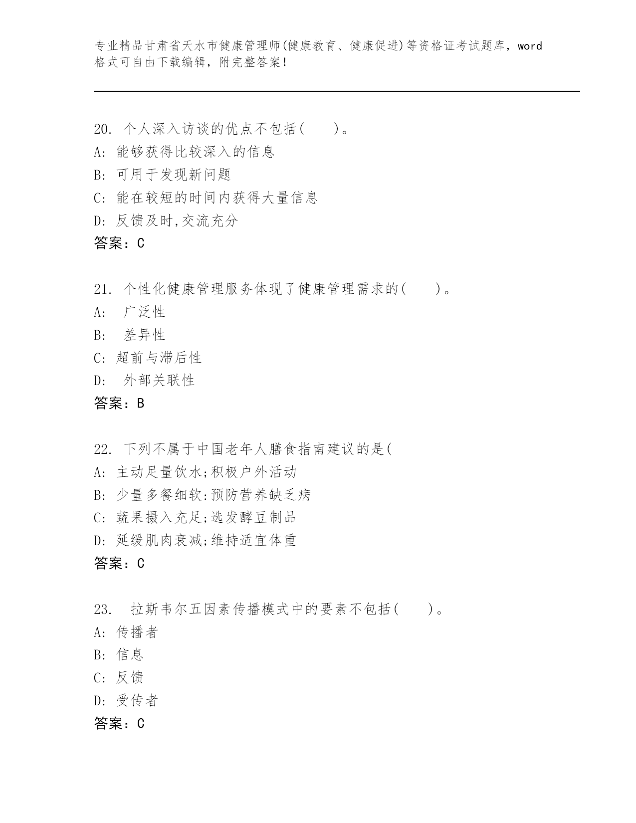 精编甘肃省天水市健康管理师(健康教育、健康促进)等资格证考试大全(精品)