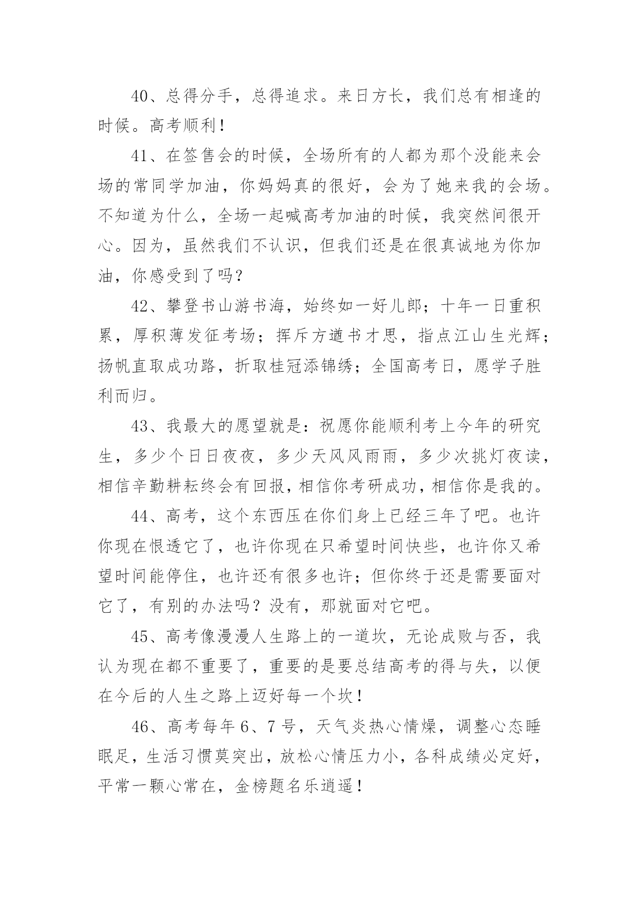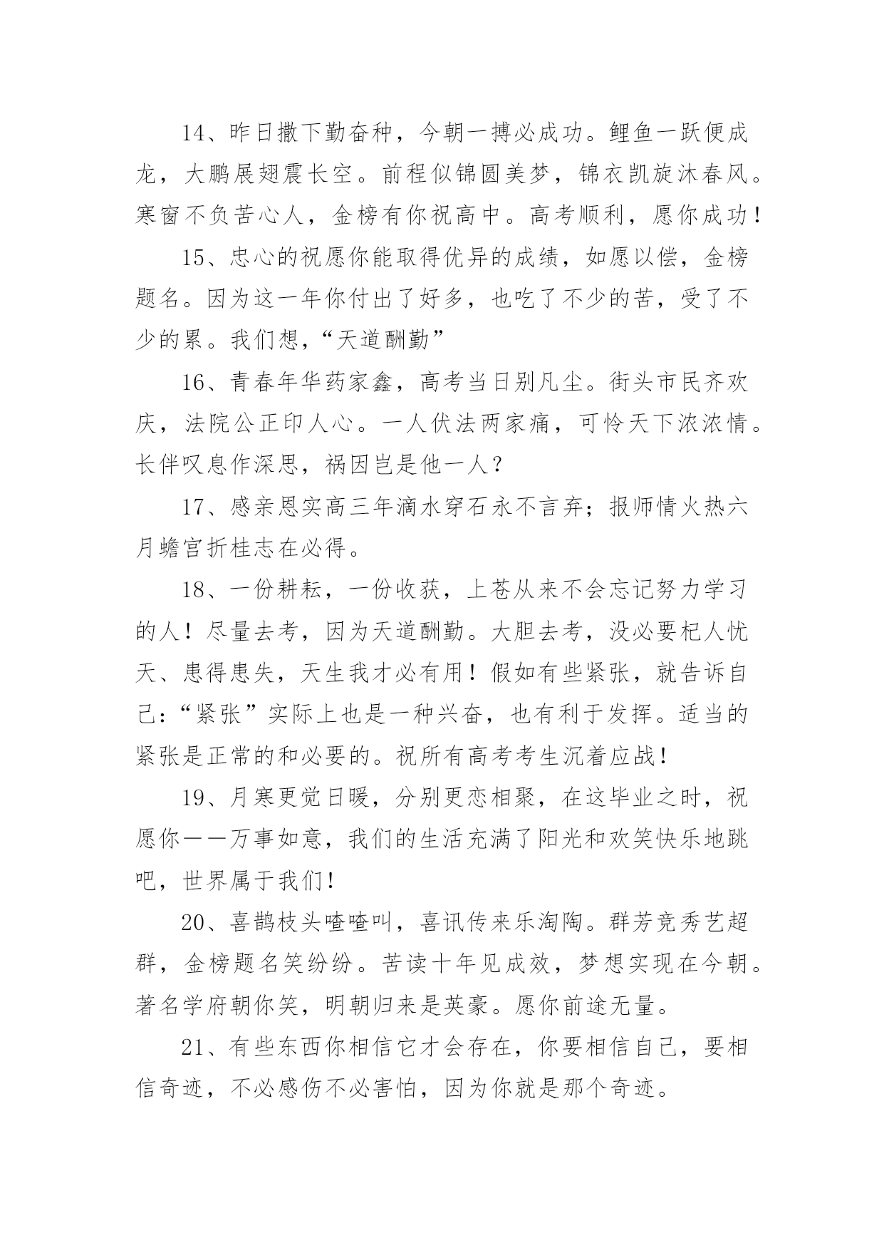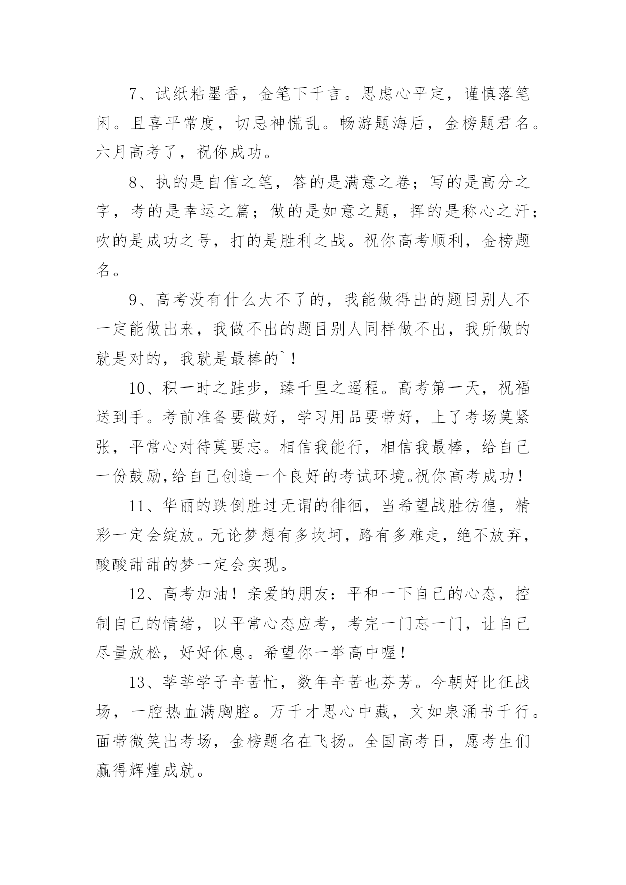 为高考生加油的话为高考生加油的话高考是人生大事,它将决定我们每个人的命运!下面小编带来的是为高考生加油的话,希望对你有所帮助!1、六十同窗同甘共苦拼搏从此时,十二春秋风雨兼程成败在今年。2、六月,有一份期待,年轻绘就畅想的星海,思想的热血随考卷涌动,灵魂的脉搏应分数澎湃,扶犁黑土地上耕耘,总希冀有一眼金黄黄的未来。3、送走了五月花丛的芬芳,迎来六月桃李的时光;高考在即,给你发条短信。你可以不用理我,但不能失去自我,你可以不看短信,但不能没有自信,预祝高考顺利!4、一天天积累,一点点努力,一步步前进,一滴滴汇聚,终于到了高考这一天。放松心情,面带微笑,保持信心,你必将拥有灿烂的人生。祝高考顺利!5、聪明的人总能把事情想得比别人早一步,杰出的人总是步子迈出得比别人快一步;你这样的人总能考试发挥得比别人好一步,我这样的人总是祝福送出的比别人先一步。高考,祝你一如继往考试顺利、发挥出色!越考越好!6、我有自己的<憧憬>,对高考的憧憬,对未来的憧憬。憧憬着金榜提名时那一瞬的喜悦;憧憬着漫步于梧桐树下的自在闲适;憧憬着未来有片明媚的阳光洒在大学的校园里。7、试纸粘墨香,金笔下千言。思虑心平定,谨慎落笔闲。且喜平常度,切忌神慌乱。畅游题海后,金榜题君名。六月高考了,祝你成功。8、执的是自信之笔,答的是满意之卷;写的是高分之字,考的是幸运之篇;做的是如意之题,挥的是称心之汗;吹的是成功之号,打的是胜利之战。祝你高考顺利,金榜题名。9、高考没有什么大不了的,我能做得出的题目别人不一定能做出来,我做不出的题目别人同样做不出,我所做的就是对的,我就是最棒的`!10、积一时之跬步,臻千里之遥程。高考第一天,祝福送到手。考前准备要做好,学习用品要带好,上了考场莫紧张,平常心对待莫要忘。相信我能行,相信我最棒,给自己一份鼓励,给自己创造一个良好的考试环境。祝你高考成功!11、华丽的跌倒胜过无谓的徘徊,当希望战胜彷徨,精彩一定会绽放。无论梦想有多坎坷,路有多难走,绝不放弃,酸酸甜甜的梦一定会实现。12、高考加油!亲爱的朋友:平和一下自己的心态,控制自己的情绪,以平常心态应考,考完一门忘一门,让自己尽量放松,好好休息。希望你一举高中喔!13、莘莘学子辛苦忙,数年辛苦也芬芳。今朝好比征战场,一腔热血满胸腔。万千才思心中藏,文如泉涌书千行。面带微笑出考场,金榜题名在飞扬。全国高考日,愿考生们赢得辉煌成就。14、昨日撒下勤奋种,今朝一搏必成功。鲤鱼一跃便成龙,大鹏展翅震长空。前程似锦圆美梦,锦衣凯旋沐春风。寒窗不负苦心人,金榜有你祝高中。高考顺利,愿你成功!15、忠心的祝愿你能取得优异的成绩,如愿以偿,金榜题名。因为这一年你付出了好多,也吃了不少的苦,受了不少的累。我们想,“天道酬勤”16、青春年华药家鑫,高考当日别凡尘。街头市民齐欢庆,法院公正印人心。一人伏法两家痛,可怜天下浓浓情。长伴叹息作深思,祸因岂是他一人?17、感亲恩实高三年滴水穿石永不言弃;报师情火热六月蟾宫折桂志在必得。18、一份耕耘,一份收获,上苍从来不会忘记努力学习的人!尽量去考,因为天道酬勤。大胆去考,没必要杞人忧天、患得患失,天生我才必有用!假如有些紧张,就告诉自己:“紧张”实际上也是一种兴奋,也有利于发挥。适当的紧张是正常的和必要的。祝所有高考考生沉着应战!19、月寒更觉日暖,分别更恋相聚,在这毕业之时,祝愿你--万事如意,我们的生活充满了阳光和欢笑快乐地跳吧,世界属于我们!20、喜鹊枝头喳喳叫,喜讯传来乐淘陶。群芳竞秀艺超群,金榜题名笑纷纷。苦读十年见成效,梦想实现在今朝。著名学府朝你笑,明朝归来是英豪。愿你前途无量。21、有些东西你相信它才会存在,你要相信自己,要相信奇迹,不必感伤不必害怕,因为你就是那个奇迹。22、那天,住进县城最好的宾馆;那晚,聚在一起聊聊心事;那时,互相讨论最后一天的考试;那会儿,吃不好更睡不好。回忆那年高考,有太多期待,有忐忑不安,更有无限美好!23、日子象念珠一样,一天接着一天滑过,串成周,串成月。24、立志高远,脚踏实地;刻苦钻研,勤学苦思;稳定心态,不馁不弃;全力以赴,夺取胜利。25、家中父母吃苦受累盼的是捷报频传,灯下学子沤心沥血想的是金板题名26、高考前要做到;觉要睡好,饭要吃好,复习做好,文具备好,心态要好,做到以上五好,你的成绩一定最好,愿你考出好成绩!祝你马到功成,开心快乐!27、六月鲜花尽芬芳,捷报频传喜气漾。金榜题名心愿遂,笑语声中眉飞扬。亲朋好友来祝贺,举杯共饮祝福长。愿你学府再努力,博学多识做栋梁!28、不要以为自己成功一次就可以了,也不要以为过去的光荣可以被永远肯定。29、你笔下拥有一个色彩绚丽的世界:愿你,也相信你,拥有另一个笔下灿烂的图景。30、当离别拉开窗帘,当回忆睡在胸前,要说再见真的很伤感,只有爱依旧灿烂!友谊