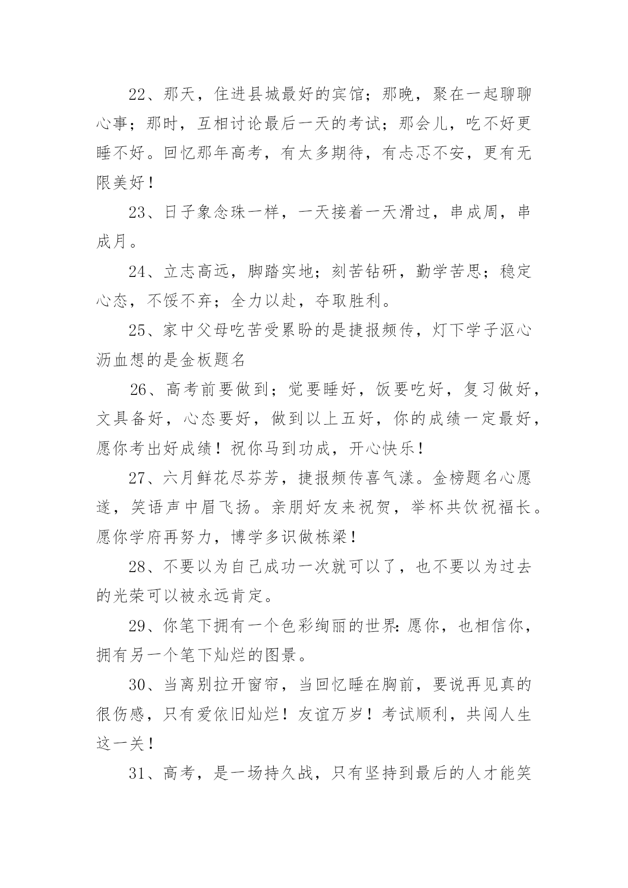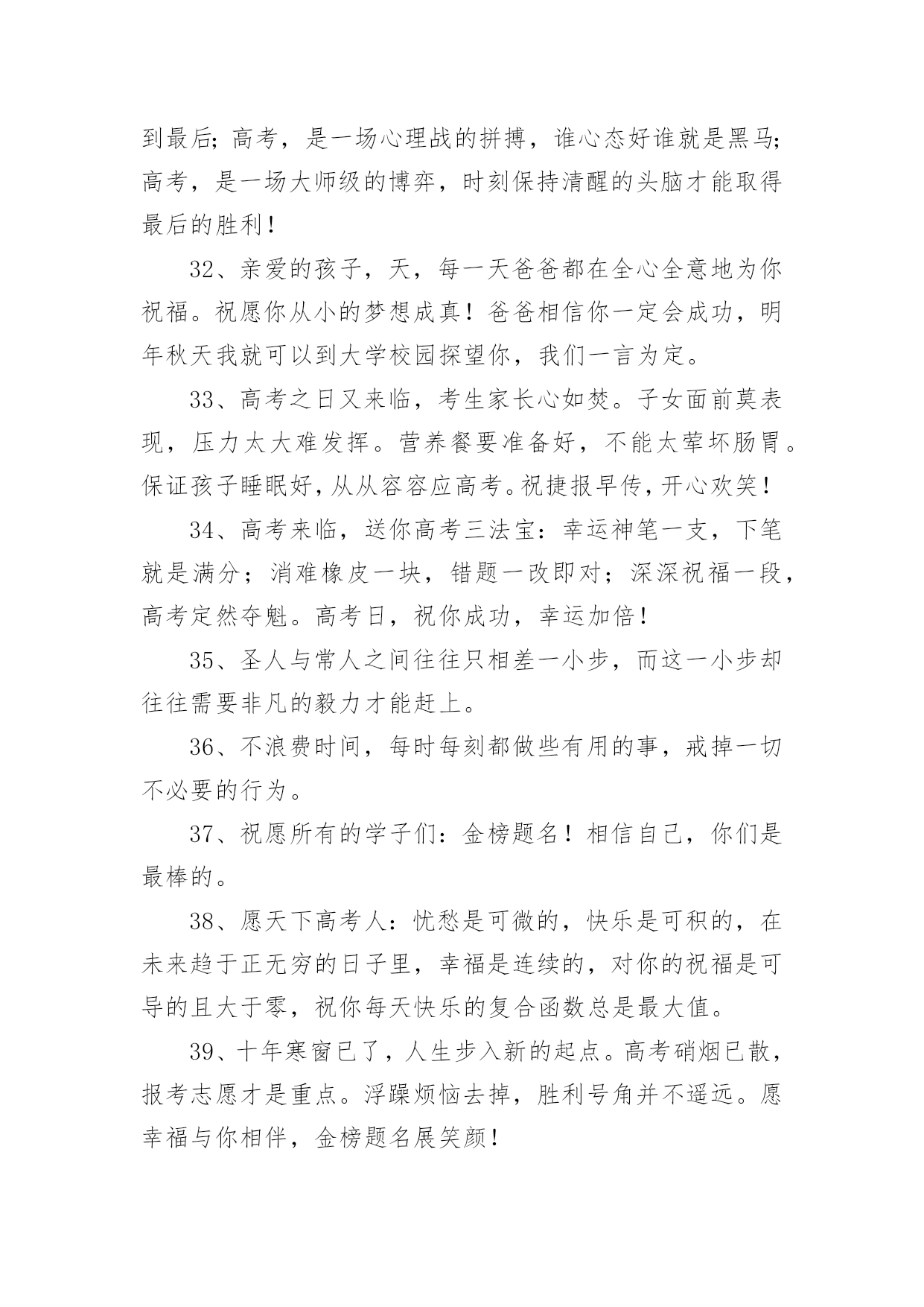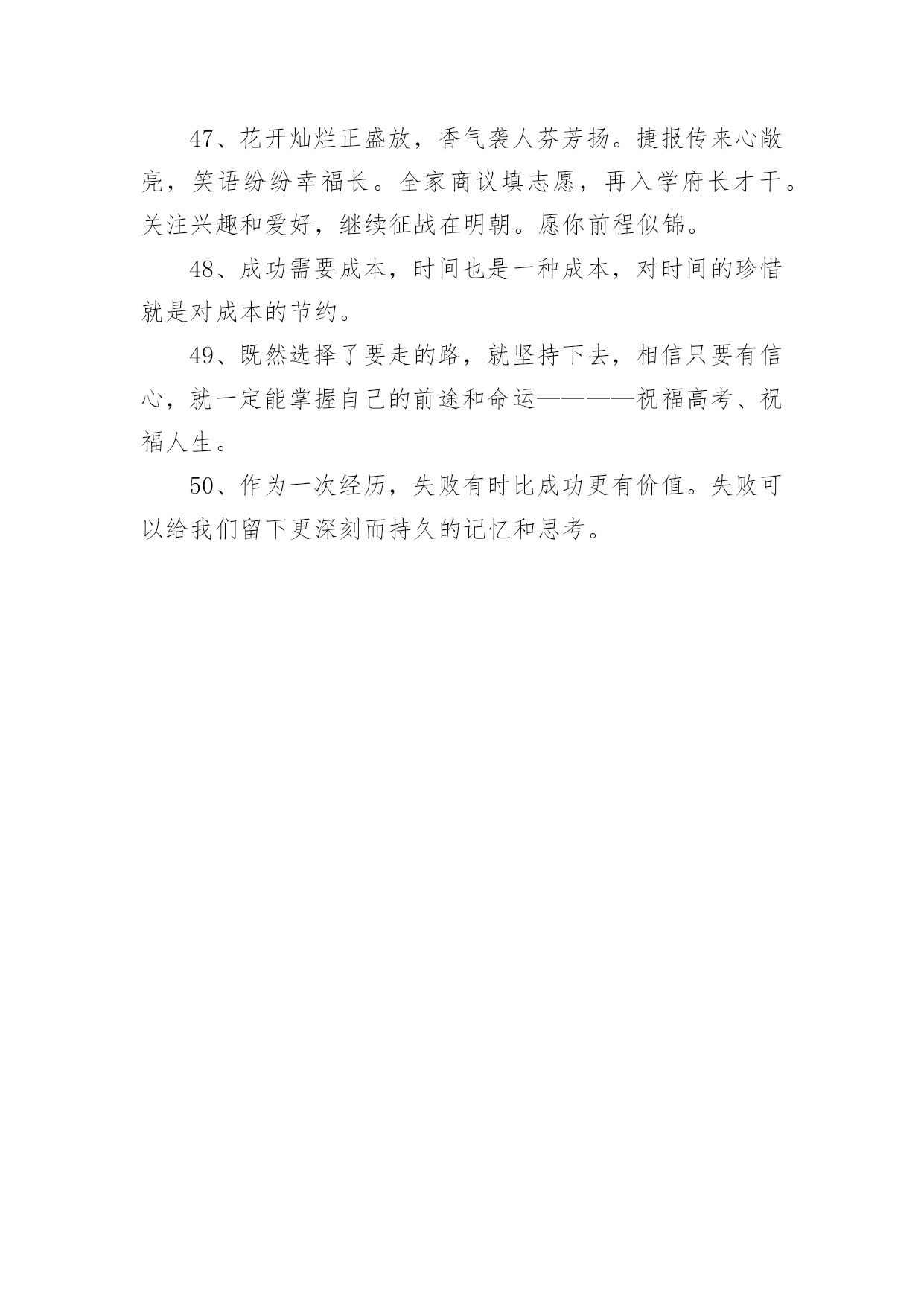 为高考生加油的话为高考生加油的话高考是人生大事,它将决定我们每个人的命运!下面小编带来的是为高考生加油的话,希望对你有所帮助!1、六十同窗同甘共苦拼搏从此时,十二春秋风雨兼程成败在今年。2、六月,有一份期待,年轻绘就畅想的星海,思想的热血随考卷涌动,灵魂的脉搏应分数澎湃,扶犁黑土地上耕耘,总希冀有一眼金黄黄的未来。3、送走了五月花丛的芬芳,迎来六月桃李的时光;高考在即,给你发条短信。你可以不用理我,但不能失去自我,你可以不看短信,但不能没有自信,预祝高考顺利!4、一天天积累,一点点努力,一步步前进,一滴滴汇聚,终于到了高考这一天。放松心情,面带微笑,保持信心,你必将拥有灿烂的人生。祝高考顺利!5、聪明的人总能把事情想得比别人早一步,杰出的人总是步子迈出得比别人快一步;你这样的人总能考试发挥得比别人好一步,我这样的人总是祝福送出的比别人先一步。高考,祝你一如继往考试顺利、发挥出色!越考越好!6、我有自己的<憧憬>,对高考的憧憬,对未来的憧憬。憧憬着金榜提名时那一瞬的喜悦;憧憬着漫步于梧桐树下的自在闲适;憧憬着未来有片明媚的阳光洒在大学的校园里。7、试纸粘墨香,金笔下千言。思虑心平定,谨慎落笔闲。且喜平常度,切忌神慌乱。畅游题海后,金榜题君名。六月高考了,祝你成功。8、执的是自信之笔,答的是满意之卷;写的是高分之字,考的是幸运之篇;做的是如意之题,挥的是称心之汗;吹的是成功之号,打的是胜利之战。祝你高考顺利,金榜题名。9、高考没有什么大不了的,我能做得出的题目别人不一定能做出来,我做不出的题目别人同样做不出,我所做的就是对的,我就是最棒的`!10、积一时之跬步,臻千里之遥程。高考第一天,祝福送到手。考前准备要做好,学习用品要带好,上了考场莫紧张,平常心对待莫要忘。相信我能行,相信我最棒,给自己一份鼓励,给自己创造一个良好的考试环境。祝你高考成功!11、华丽的跌倒胜过无谓的徘徊,当希望战胜彷徨,精彩一定会绽放。无论梦想有多坎坷,路有多难走,绝不放弃,酸酸甜甜的梦一定会实现。12、高考加油!亲爱的朋友:平和一下自己的心态,控制自己的情绪,以平常心态应考,考完一门忘一门,让自己尽量放松,好好休息。希望你一举高中喔!13、莘莘学子辛苦忙,数年辛苦也芬芳。今朝好比征战场,一腔热血满胸腔。万千才思心中藏,文如泉涌书千行。面带微笑出考场,金榜题名在飞扬。全国高考日,愿考生们赢得辉煌成就。14、昨日撒下勤奋种,今朝一搏必成功。鲤鱼一跃便成龙,大鹏展翅震长空。前程似锦圆美梦,锦衣凯旋沐春风。寒窗不负苦心人,金榜有你祝高中。高考顺利,愿你成功!15、忠心的祝愿你能取得优异的成绩,如愿以偿,金榜题名。因为这一年你付出了好多,也吃了不少的苦,受了不少的累。我们想,“天道酬勤”16、青春年华药家鑫,高考当日别凡尘。街头市民齐欢庆,法院公正印人心。一人伏法两家痛,可怜天下浓浓情。长伴叹息作深思,祸因岂是他一人?17、感亲恩实高三年滴水穿石永不言弃;报师情火热六月蟾宫折桂志在必得。18、一份耕耘,一份收获,上苍从来不会忘记努力学习的人!尽量去考,因为天道酬勤。大胆去考,没必要杞人忧天、患得患失,天生我才必有用!假如有些紧张,就告诉自己:“紧张”实际上也是一种兴奋,也有利于发挥。适当的紧张是正常的和必要的。祝所有高考考生沉着应战!19、月寒更觉日暖,分别更恋相聚,在这毕业之时,祝愿你--万事如意,我们的生活充满了阳光和欢笑快乐地跳吧,世界属于我们!20、喜鹊枝头喳喳叫,喜讯传来乐淘陶。群芳竞秀艺超群,金榜题名笑纷纷。苦读十年见成效,梦想实现在今朝。著名学府朝你笑,明朝归来是英豪。愿你前途无量。21、有些东西你相信它才会存在,你要相信自己,要相信奇迹,不必感伤不必害怕,因为你就是那个奇迹。22、那天,住进县城最好的宾馆;那晚,聚在一起聊聊心事;那时,互相讨论最后一天的考试;那会儿,吃不好更睡不好。回忆那年高考,有太多期待,有忐忑不安,更有无限美好!23、日子象念珠一样,一天接着一天滑过,串成周,串成月。24、立志高远,脚踏实地;刻苦钻研,勤学苦思;稳定心态,不馁不弃;全力以赴,夺取胜利。25、家中父母吃苦受累盼的是捷报频传,灯下学子沤心沥血想的是金板题名26、高考前要做到;觉要睡好,饭要吃好,复习做好,文具备好,心态要好,做到以上五好,你的成绩一定最好,愿你考出好成绩!祝你马到功成,开心快乐!27、六月鲜花尽芬芳,捷报频传喜气漾。金榜题名心愿遂,笑语声中眉飞扬。亲朋好友来祝贺,举杯共饮祝福长。愿你学府再努力,博学多识做栋梁!28、不要以为自己成功一次就可以了,也不要以为过去的光荣可以被永远肯定。29、你笔下拥有一个色彩绚丽的世界:愿你,也相信你,拥有另一个笔下灿烂的图景。30、当离别拉开窗帘,当回忆睡在胸前,要说再见真的很伤感,只有爱依旧灿烂!友谊