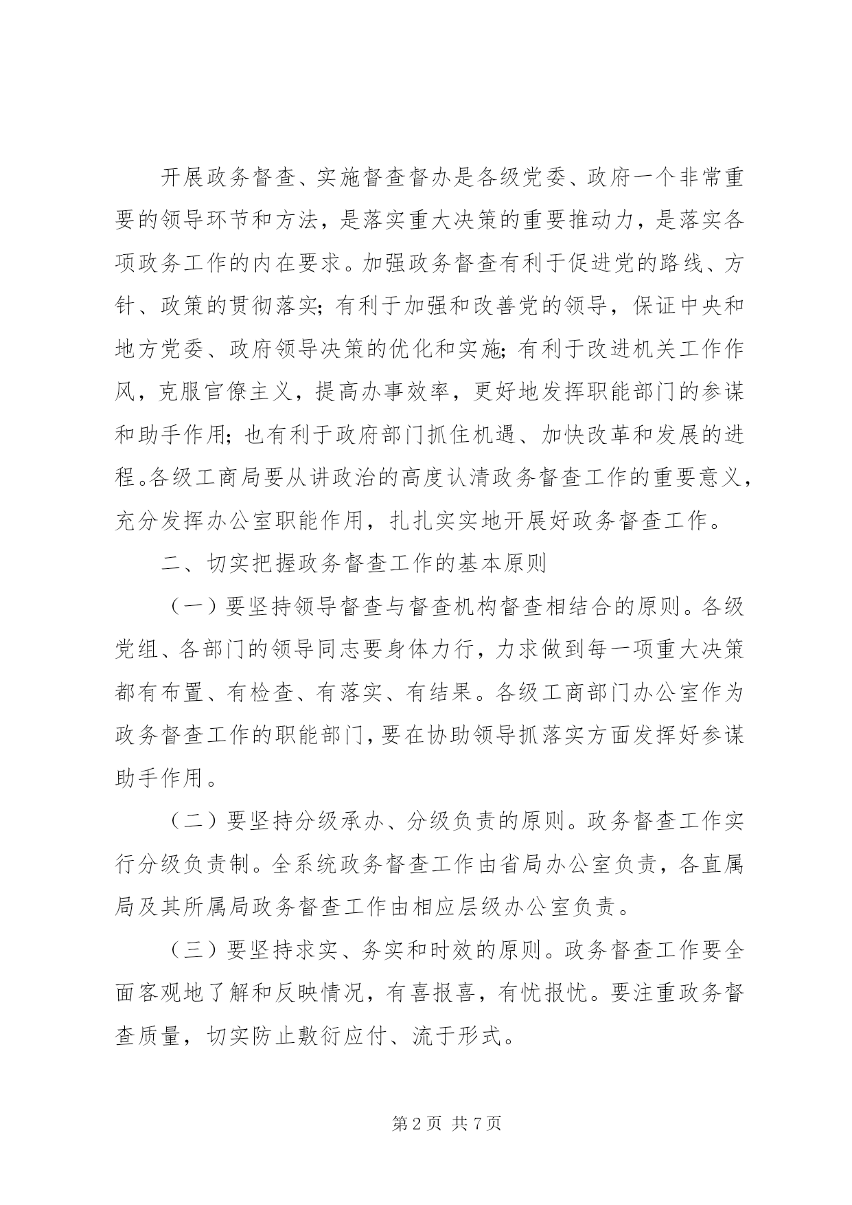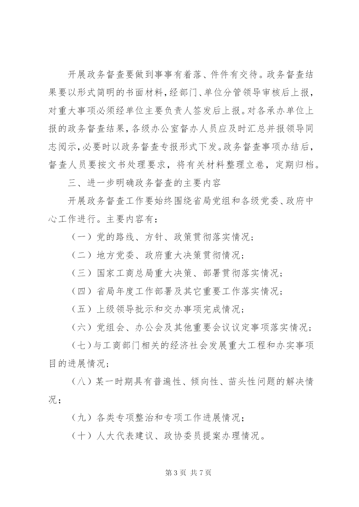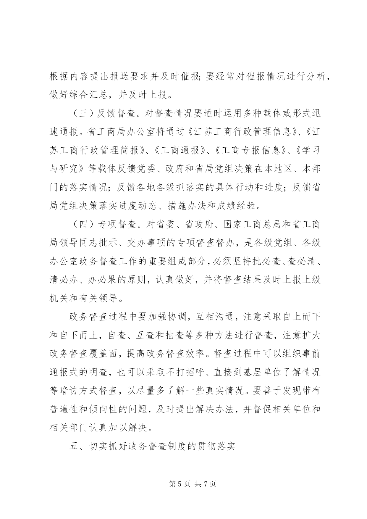 第PAGE\*Arabic\*MERGEFORMAT7页共NUMPAGES\*MERGEFORMAT7页加强工商系统政务督查工作方案编者按:本文主要从充分认识加强政务督查工作的重要意义;切实把握政务督查工作的基本原则;进一步明确政务督查的主要内容;注意把握政务督查的形式和方法;切实抓好政务督查制度的贯彻落实;不断加强对政务督查工作的组织和领导进行讲述。其中,主要包括:要从讲政治的高度认清政务督查工作的重要意义,充分发挥办公室职能作用,扎扎实实地开展好政务督查工作、要坚持领导督查与督查机构督查相结合的原则、要坚持分级承办、分级负责的原则、要坚持求实、务实和时效的原则、开展政务督查工作要始终围绕省局党组和各级党委、政府中心工作进行、开展政务督查工作要注意方式方法、报告工作制度、考核奖惩制度、培训制度、要高度重视政务督查工作,切实把政务督查工作列入重要工作,摆到重要位置等,具体材料请详见:全省工商系统的政务督查工作在省局党组的直接领导下,取得了较好成绩,为系统内各项工作的顺利开展、确保政令畅通起到了积极作用。为进一步加强政务督查,全面推进督查督办工作走上经常化、规范化、制度化的轨道,保证省委、省政府、国家工商总局和省局党组重大决策、重要工作部署的贯彻与落实,确保系统内政令畅通,现就进一步加强全省工商系统政务督查工作提出如下意见。一、充分认识加强政务督查工作的重要意义开展政务督查、实施督查督办是各级党委、政府一个非常重要的领导环节和方法,是落实重大决策的重要推动力,是落实各项政务工作的内在要求。加强政务督查有利于促进党的路线、方针、政策的贯彻落实;有利于加强和改善党的领导,保证中央和地方党委、政府领导决策的优化和实施;有利于改进机关工作作风,克服官僚主义,提高办事效率,更好地发挥职能部门的参谋和助手作用;也有利于政府部门抓住机遇、加快改革和发展的进程。各级工商局要从讲政治的高度认清政务督查工作的重要意义,充分发挥办公室职能作用,扎扎实实地开展好政务督查工作。二、切实把握政务督查工作的基本原则(一)要坚持领导督查与督查机构督查相结合的原则。各级党组、各部门的领导同志要身体力行,力求做到每一项重大决策都有布置、有检查、有落实、有结果。各级工商部门办公室作为政务督查工作的职能部门,要在协助领导抓落实方面发挥好参谋助手作用。(二)要坚持分级承办、分级负责的原则。政务督查工作实行分级负责制。全系统政务督查工作由省局办公室负责,各直属局及其所属局政务督查工作由相应层级办公室负责。(三)要坚持求实、务实和时效的原则。政务督查工作要全面客观地了解和反映情况,有喜报喜,有忧报忧。要注重政务督查质量,切实防止敷衍应付、流于形式。开展政务督查要做到事事有着落、件件有交待。政务督查结果要以形式简明的书面材料,经部门、单位分管领导审核后上报,对重大事项必须经单位主要负责人签发后上报。对各承办单位上报的政务督查结果,各级办公室督办人员应及时汇总并报领导同志阅示,必要时以政务督查专报形式下发。政务督查事项办结后,督查人员要按文书处理要求,将有关材料整理立卷,定期归档。三、进一步明确政务督查的主要内容开展政务督查工作要始终围绕省局党组和各级党委、政府中心工作进行。主要内容有:(一)党的路线、方针、政策贯彻落实情况;(二)地方党委、政府重大决策贯彻情况;(三)国家工商总局重大决策、部署贯彻落实情况;(四)省局年度工作部署及其它重要工作落实情况;(五)上级领导批示和交办事项完成情况;(六)党组会、办公会及其他重要会议议定事项落实情况;(七)与工商部门相关的经济社会发展重大工程和办实事项目的进展情况;(八)某一时期具有普遍性、倾向性、苗头性问题的解决情况;(九)各类专项整治和专项工作进展情况;(十)人大代表建议、政协委员提案办理情况。四、注意把握政务督查的形式和方法开展政务督查工作要注意方式方法。对上级机关做出的重大决策和重要工作部署,办公室要拟定政务督查方案,明确政务督查责任,及时反馈决策落实情况,着重抓问题的解决。要把职能部门的政务督查纳入领导督查内容通盘考虑,取得领导重视和支持。开展政务督查要吃透上级精神和掌握基层部门情况,准确领会领导意图。政务督查工作重在推动,重在协助,重在引导,要把政务督查的过程变成抓落实的过程,形成上下抓督查、层层抓落实的格局。各级办公室要根据党组的授权和要求搞好政务督查工作中的组织协调,尤其是协调和推动各职能部门开展政务督查,充分依靠各职能部门共同协作、共同开展政务督查工作。要着重把握下列四类督查形式和方法:(一)调研督查。调查研究既是领导决策前的一项重要工作,也是检查落实决策情况的重要方式。对决策确立后,在实施过程中遇到的问题和矛盾要及时深入基层了解真实情况,掌握第一手材料,提出解决问题和矛盾的方法,提出深入抓落