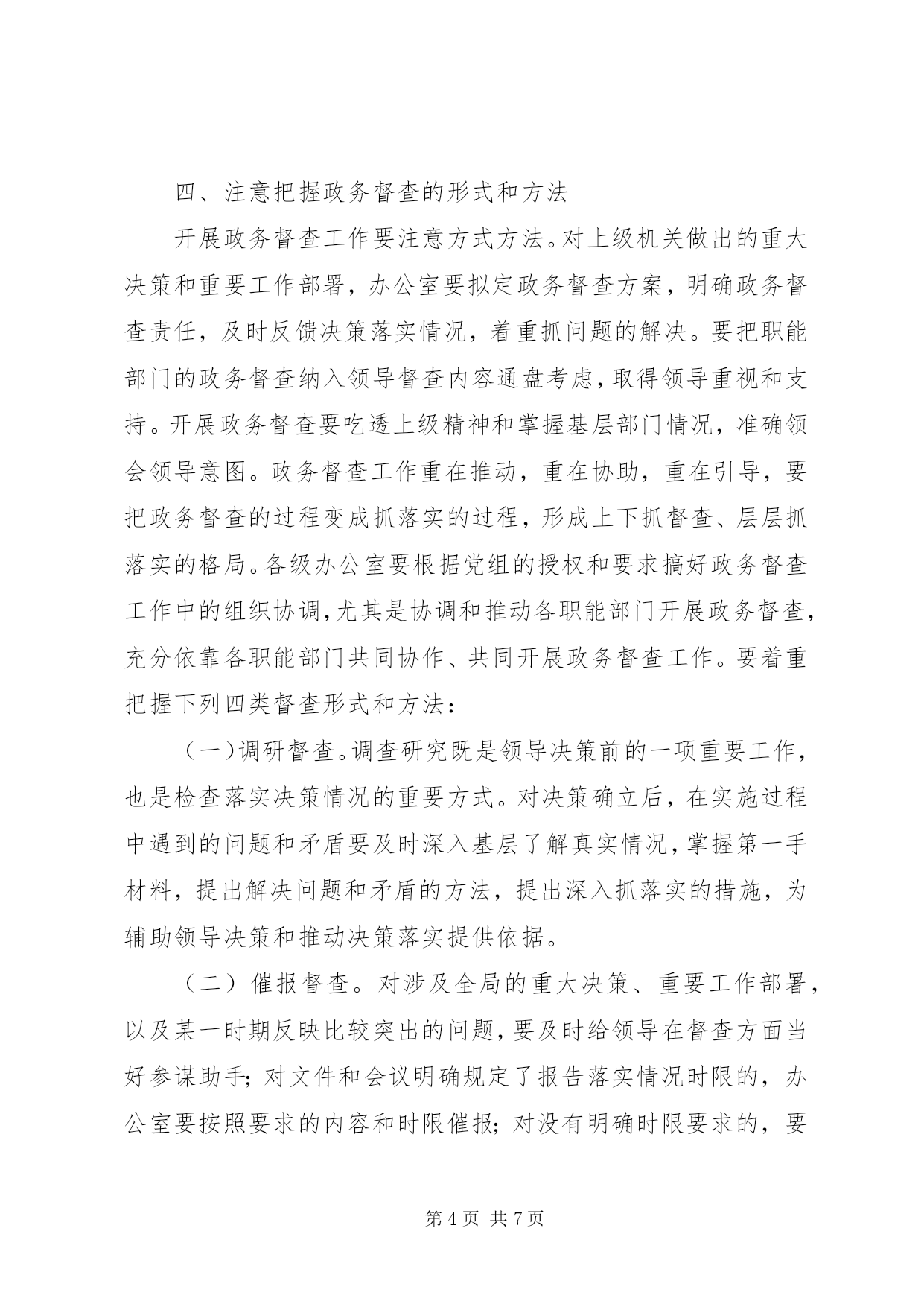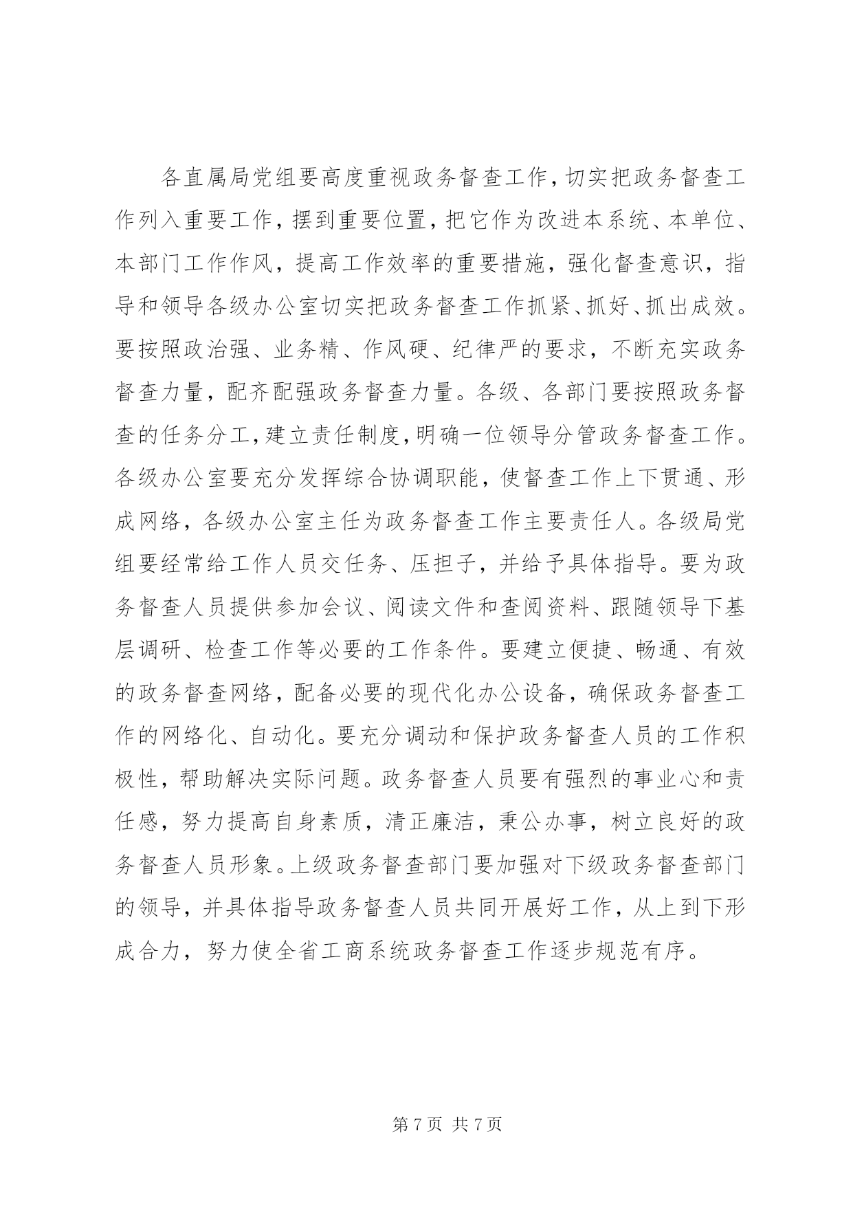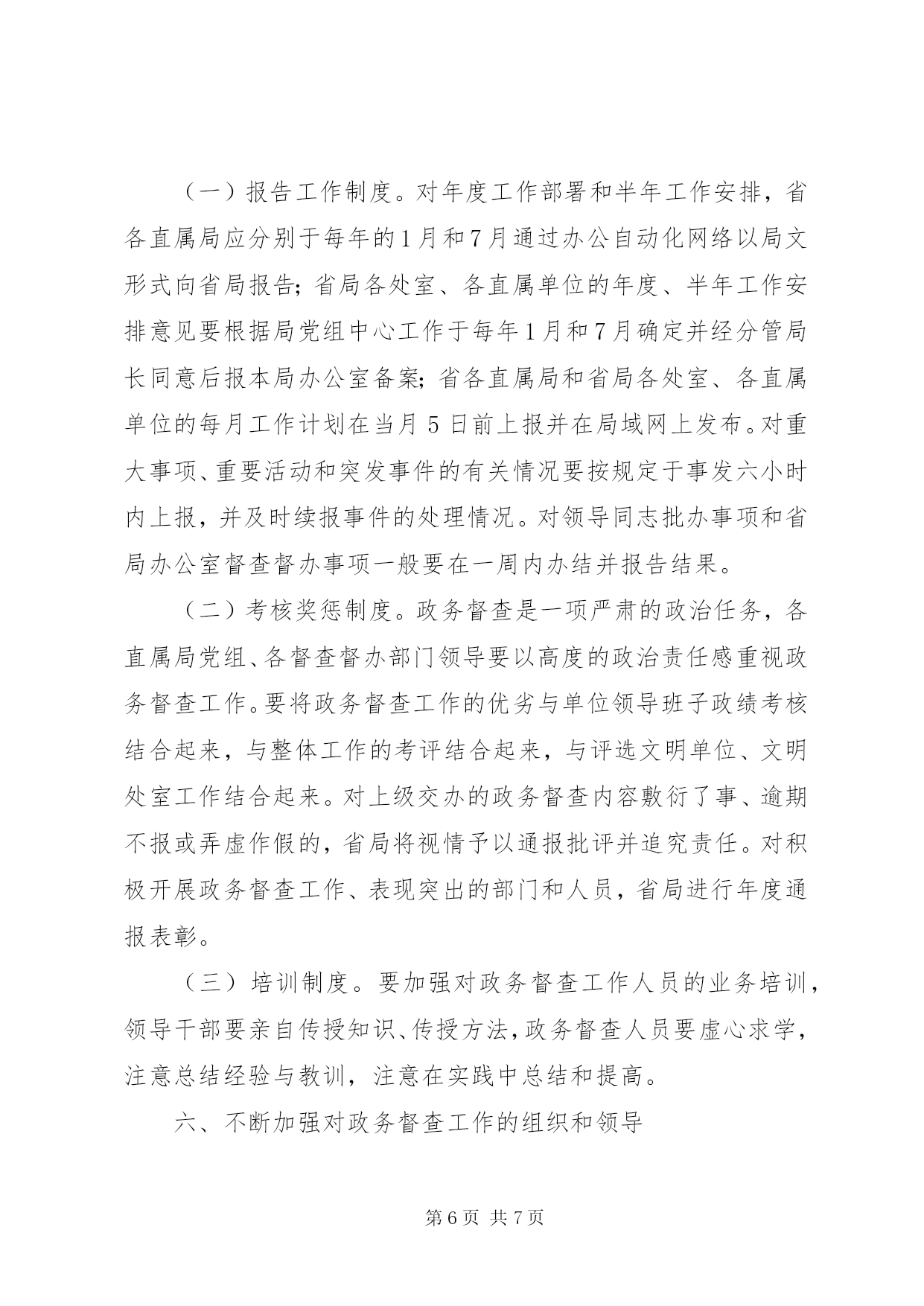 第PAGE\*Arabic\*MERGEFORMAT7页共NUMPAGES\*MERGEFORMAT7页加强工商系统政务督查工作方案编者按:本文主要从充分认识加强政务督查工作的重要意义;切实把握政务督查工作的基本原则;进一步明确政务督查的主要内容;注意把握政务督查的形式和方法;切实抓好政务督查制度的贯彻落实;不断加强对政务督查工作的组织和领导进行讲述。其中,主要包括:要从讲政治的高度认清政务督查工作的重要意义,充分发挥办公室职能作用,扎扎实实地开展好政务督查工作、要坚持领导督查与督查机构督查相结合的原则、要坚持分级承办、分级负责的原则、要坚持求实、务实和时效的原则、开展政务督查工作要始终围绕省局党组和各级党委、政府中心工作进行、开展政务督查工作要注意方式方法、报告工作制度、考核奖惩制度、培训制度、要高度重视政务督查工作,切实把政务督查工作列入重要工作,摆到重要位置等,具体材料请详见:全省工商系统的政务督查工作在省局党组的直接领导下,取得了较好成绩,为系统内各项工作的顺利开展、确保政令畅通起到了积极作用。为进一步加强政务督查,全面推进督查督办工作走上经常化、规范化、制度化的轨道,保证省委、省政府、国家工商总局和省局党组重大决策、重要工作部署的贯彻与落实,确保系统内政令畅通,现就进一步加强全省工商系统政务督查工作提出如下意见。一、充分认识加强政务督查工作的重要意义开展政务督查、实施督查督办是各级党委、政府一个非常重要的领导环节和方法,是落实重大决策的重要推动力,是落实各项政务工作的内在要求。加强政务督查有利于促进党的路线、方针、政策的贯彻落实;有利于加强和改善党的领导,保证中央和地方党委、政府领导决策的优化和实施;有利于改进机关工作作风,克服官僚主义,提高办事效率,更好地发挥职能部门的参谋和助手作用;也有利于政府部门抓住机遇、加快改革和发展的进程。各级工商局要从讲政治的高度认清政务督查工作的重要意义,充分发挥办公室职能作用,扎扎实实地开展好政务督查工作。二、切实把握政务督查工作的基本原则(一)要坚持领导督查与督查机构督查相结合的原则。各级党组、各部门的领导同志要身体力行,力求做到每一项重大决策都有布置、有检查、有落实、有结果。各级工商部门办公室作为政务督查工作的职能部门,要在协助领导抓落实方面发挥好参谋助手作用。(二)要坚持分级承办、分级负责的原则。政务督查工作实行分级负责制。全系统政务督查工作由省局办公室负责,各直属局及其所属局政务督查工作由相应层级办公室负责。(三)要坚持求实、务实和时效的原则。政务督查工作要全面客观地了解和反映情况,有喜报喜,有忧报忧。要注重政务督查质量,切实防止敷衍应付、流于形式。开展政务督查要做到事事有着落、件件有交待。政务督查结果要以形式简明的书面材料,经部门、单位分管领导审核后上报,对重大事项必须经单位主要负责人签发后上报。对各承办单位上报的政务督查结果,各级办公室督办人员应及时汇总并报领导同志阅示,必要时以政务督查专报形式下发。政务督查事项办结后,督查人员要按文书处理要求,将有关材料整理立卷,定期归档。三、进一步明确政务督查的主要内容开展政务督查工作要始终围绕省局党组和各级党委、政府中心工作进行。主要内容有:(一)党的路线、方针、政策贯彻落实情况;(二)地方党委、政府重大决策贯彻情况;(三)国家工商总局重大决策、部署贯彻落实情况;(四)省局年度工作部署及其它重要工作落实情况;(五)上级领导批示和交办事项完成情况;(六)党组会、办公会及其他重要会议议定事项落实情况;(七)与工商部门相关的经济社会发展重大工程和办实事项目的进展情况;(八)某一时期具有普遍性、倾向性、苗头性问题的解决情况;(九)各类专项整治和专项工作进展情况;(十)人大代表建议、政协委员提案办理情况。四、注意把握政务督查的形式和方法开展政务督查工作要注意方式方法。对上级机关做出的重大决策和重要工作部署,办公室要拟定政务督查方案,明确政务督查责任,及时反馈决策落实情况,着重抓问题的解决。要把职能部门的政务督查纳入领导督查内容通盘考虑,取得领导重视和支持。开展政务督查要吃透上级精神和掌握基层部门情况,准确领会领导意图。政务督查工作重在推动,重在协助,重在引导,要把政务督查的过程变成抓落实的过程,形成上下抓督查、层层抓落实的格局。各级办公室要根据党组的授权和要求搞好政务督查工作中的组织协调,尤其是协调和推动各职能部门开展政务督查,充分依靠各职能部门共同协作、共同开展政务督查工作。要着重把握下列四类督查形式和方法:(一)调研督查。调查研究既是领导决策前的一项重要工作,也是检查落实决策情况的重要方式。对决策确立后,在实施过程中遇到的问题和矛盾要及时深入基层了解真实情况,掌握第一手材料,提出解决问题和矛盾的方法,提出深入抓落