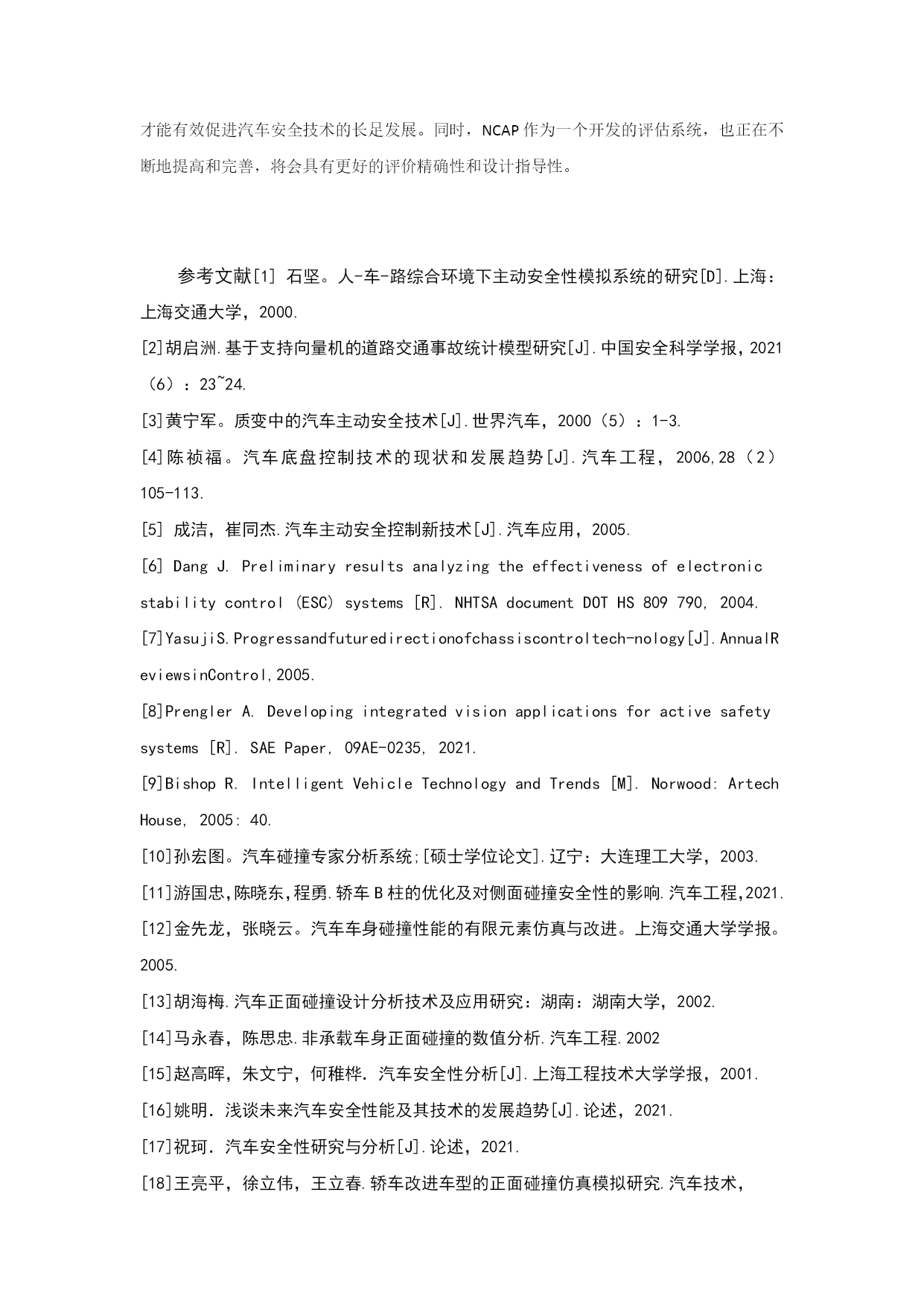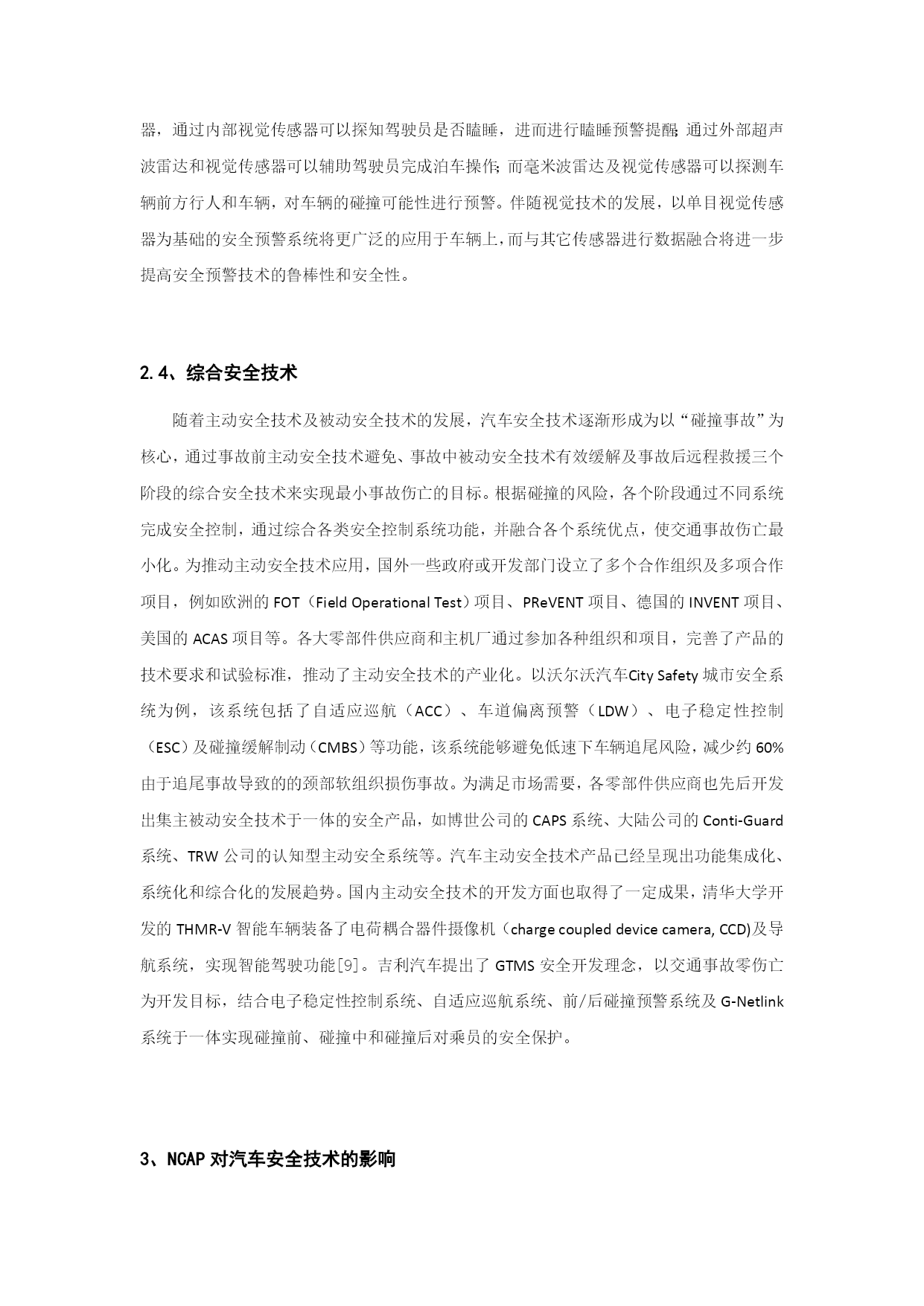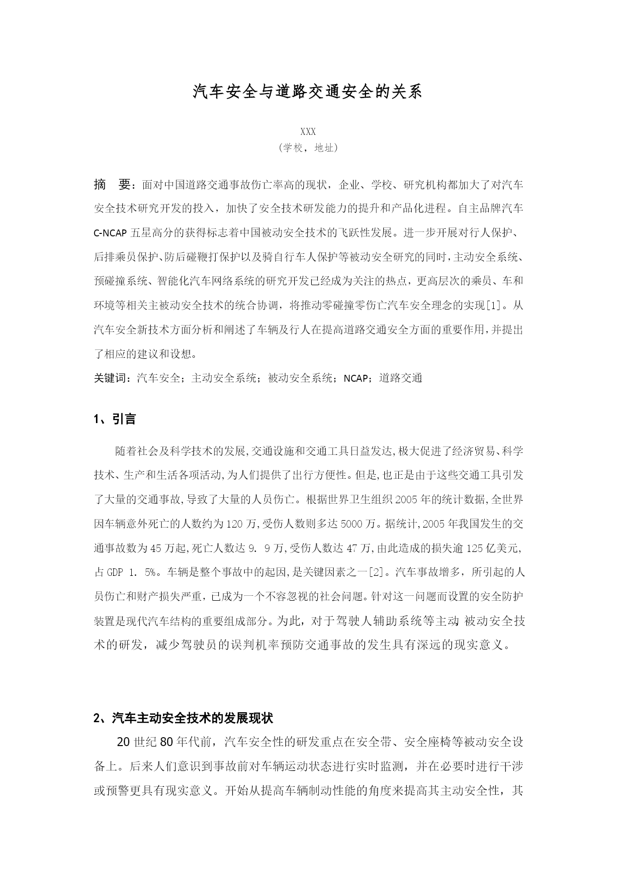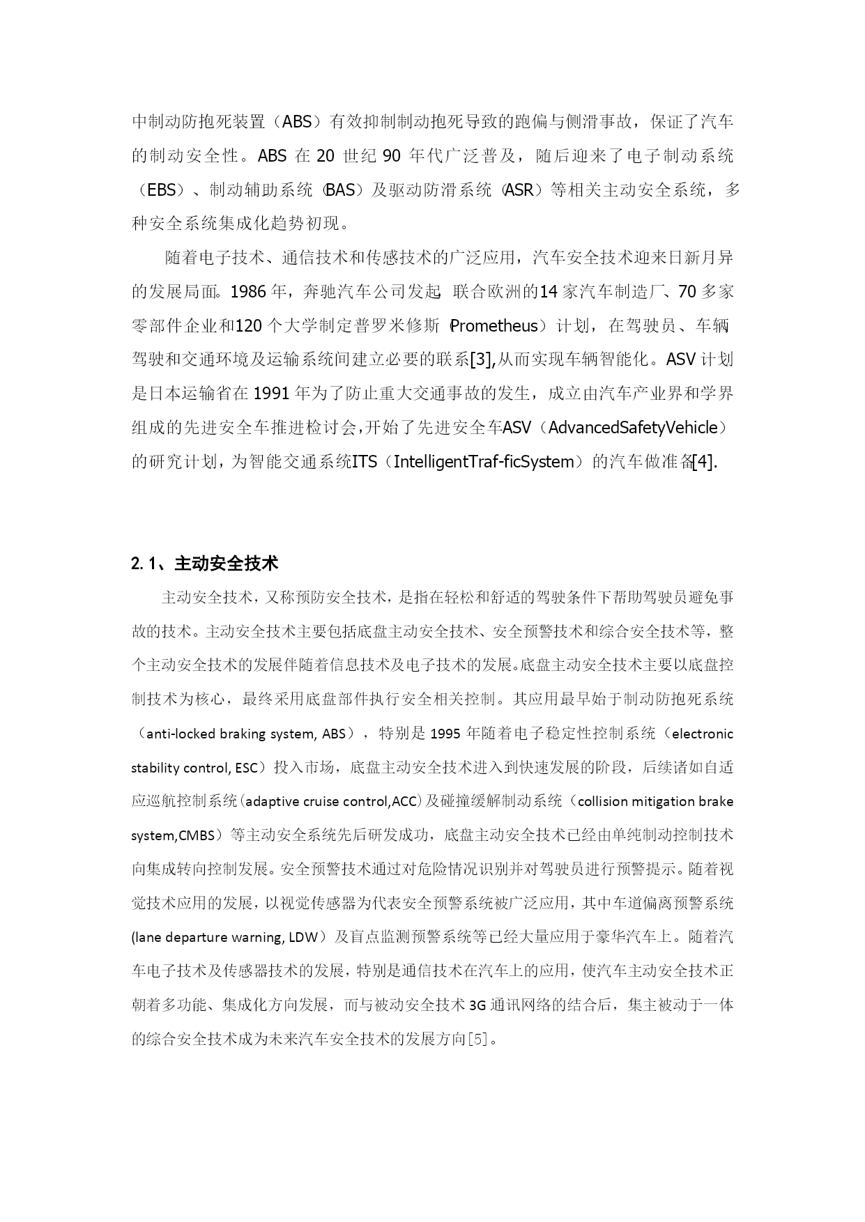 汽车安全与道路交通安全优质资料(可以直接使用,可编辑优质资料,欢迎下载)汽车安全与道路交通安全的关系XXX(学校,地址)摘要:面对中国道路交通事故伤亡率高的现状,企业、学校、研究机构都加大了对汽车安全技术研究开发的投入,加快了安全技术研发能力的提升和产品化进程。自主品牌汽车C-NCAP五星高分的获得标志着中国被动安全技术的飞跃性发展。进一步开展对行人保护、后排乘员保护、防后碰鞭打保护以及骑自行车人保护等被动安全研究的同时,主动安全系统、预碰撞系统、智能化汽车网络系统的研究开发已经成为关注的热点,更高层次的乘员、车和环境等相关主被动安全技术的统合协调,将推动零碰撞零伤亡汽车安全理念的实现[1]。从汽车安全新技术方面分析和阐述了车辆及行人在提高道路交通安全方面的重要作用,并提出了相应的建议和设想。关键词:汽车安全;主动安全系统;被动安全系统;NCAP;道路交通1、引言随着社会及科学技术的发展,交通设施和交通工具日益发达,极大促进了经济贸易、科学技术、生产和生活各项活动,为人们提供了出行方便性。但是,也正是由于这些交通工具引发了大量的交通事故,导致了大量的人员伤亡。根据世界卫生组织2005年的统计数据,全世界因车辆意外死亡的人数约为120万,受伤人数则多达5000万。据统计,2005年我国发生的交通事故数为45万起,死亡人数达9.9万,受伤人数达47万,由此造成的损失逾125亿美元,占GDP1.5%。车辆是整个事故中的起因,是关键因素之一[2]。汽车事故增多,所引起的人员伤亡和财产损失严重,已成为一个不容忽视的社会问题。针对这一问题而设置的安全防护装置是现代汽车结构的重要组成部分。为此,对于驾驶人辅助系统等主动、被动安全技术的研发,减少驾驶员的误判机率预防交通事故的发生具有深远的现实意义。2、汽车主动安全技术的发展现状20世纪80年代前,汽车安全性的研发重点在安全带、安全座椅等被动安全设备上。后来人们意识到事故前对车辆运动状态进行实时监测,并在必要时进行干涉或预警更具有现实意义。开始从提高车辆制动性能的角度来提高其主动安全性,其中制动防抱死装置(ABS)有效抑制制动抱死导致的跑偏与侧滑事故,保证了汽车的制动安全性。ABS在20世纪90年代广泛普及,随后迎来了电子制动系统(EBS)、制动辅助系统(BAS)及驱动防滑系统(ASR)等相关主动安全系统,多种安全系统集成化趋势初现。随着电子技术、通信技术和传感技术的广泛应用,汽车安全技术迎来日新月异的发展局面。1986年,奔驰汽车公司发起,联合欧洲的14家汽车制造厂、70多家零部件企业和120个大学制定普罗米修斯(Prometheus)计划,在驾驶员、车辆、驾驶和交通环境及运输系统间建立必要的联系[3],从而实现车辆智能化。ASV计划是日本运输省在1991年为了防止重大交通事故的发生,成立由汽车产业界和学界组成的先进安全车推进检讨会,开始了先进安全车ASV(AdvancedSafetyVehicle)的研究计划,为智能交通系统ITS(IntelligentTraf-ficSystem)的汽车做准备[4].2.1、主动安全技术主动安全技术,又称预防安全技术,是指在轻松和舒适的驾驶条件下帮助驾驶员避免事故的技术。主动安全技术主要包括底盘主动安全技术、安全预警技术和综合安全技术等,整个主动安全技术的发展伴随着信息技术及电子技术的发展。底盘主动安全技术主要以底盘控制技术为核心,最终采用底盘部件执行安全相关控制。其应用最早始于制动防抱死系统(anti-lockedbrakingsystem,ABS),特别是1995年随着电子稳定性控制系统(electronicstabilitycontrol,ESC)投入市场,底盘主动安全技术进入到快速发展的阶段,后续诸如自适应巡航控制系统(adaptivecruisecontrol,ACC)及碰撞缓解制动系统(collisionmitigationbrakesystem,CMBS)等主动安全系统先后研发成功,底盘主动安全技术已经由单纯制动控制技术向集成转向控制发展。安全预警技术通过对危险情况识别并对驾驶员进行预警提示。随着视觉技术应用的发展,以视觉传感器为代表安全预警系统被广泛应用,其中车道偏离预警系统(lanedeparturewarning,LDW)及盲点监测预警系统等已经大量应用于豪华汽车上。随着汽车电子技术及传感器技术的发展,特别是通信技术在汽车上的应用,使汽车主动安全技术正朝着多功能、集成化方向发展,而与被动安全技术3G通讯网络的结合后,集主被动于一体的综合安全技术成为未来汽车安全技术的发展方向[5]。2.2、底盘主动控制技术汽车主动安全控制通常是通过底盘主动安全控制实现其执行功能。其中电子制动控制是底盘主动控制技