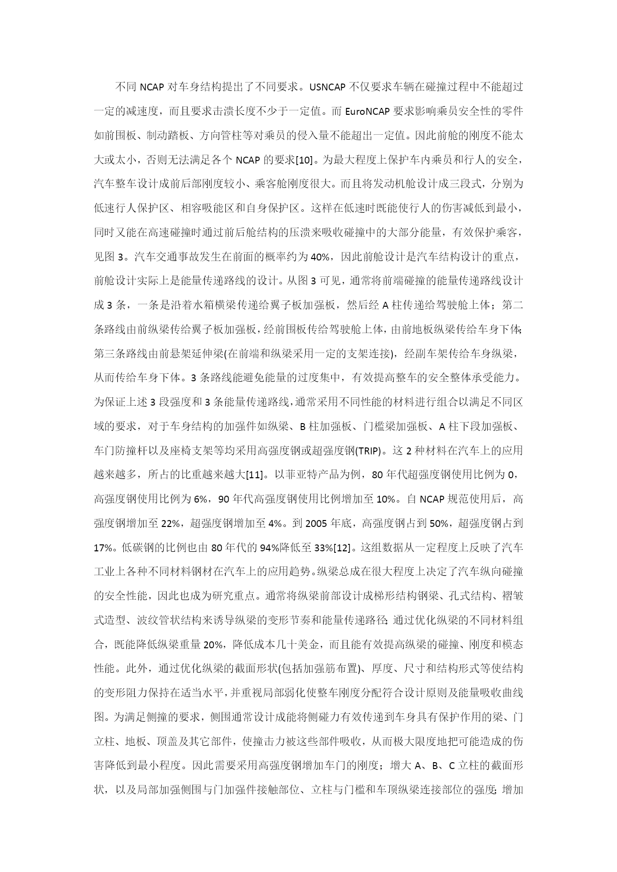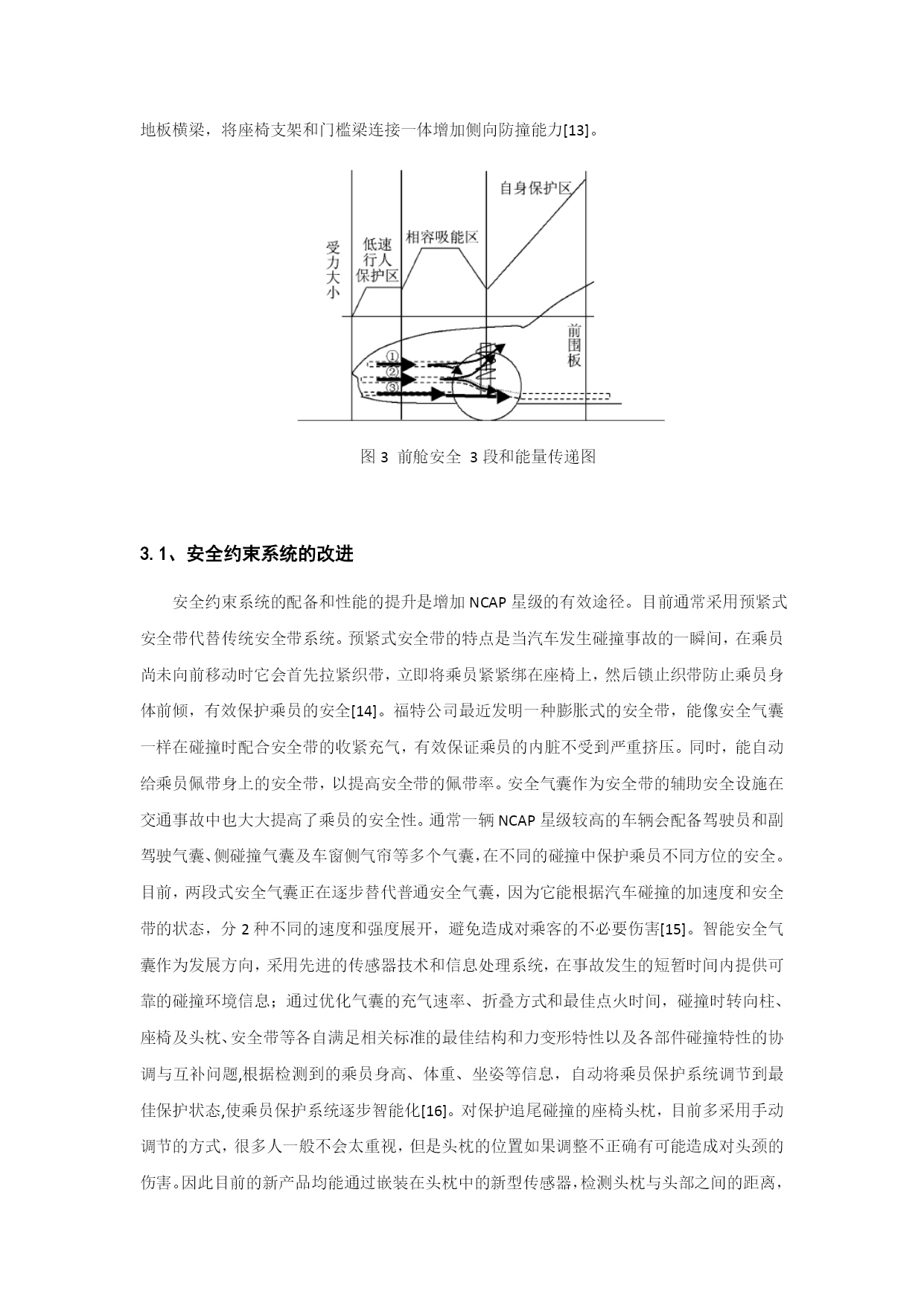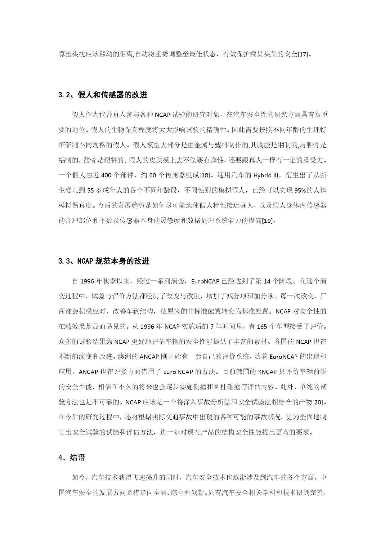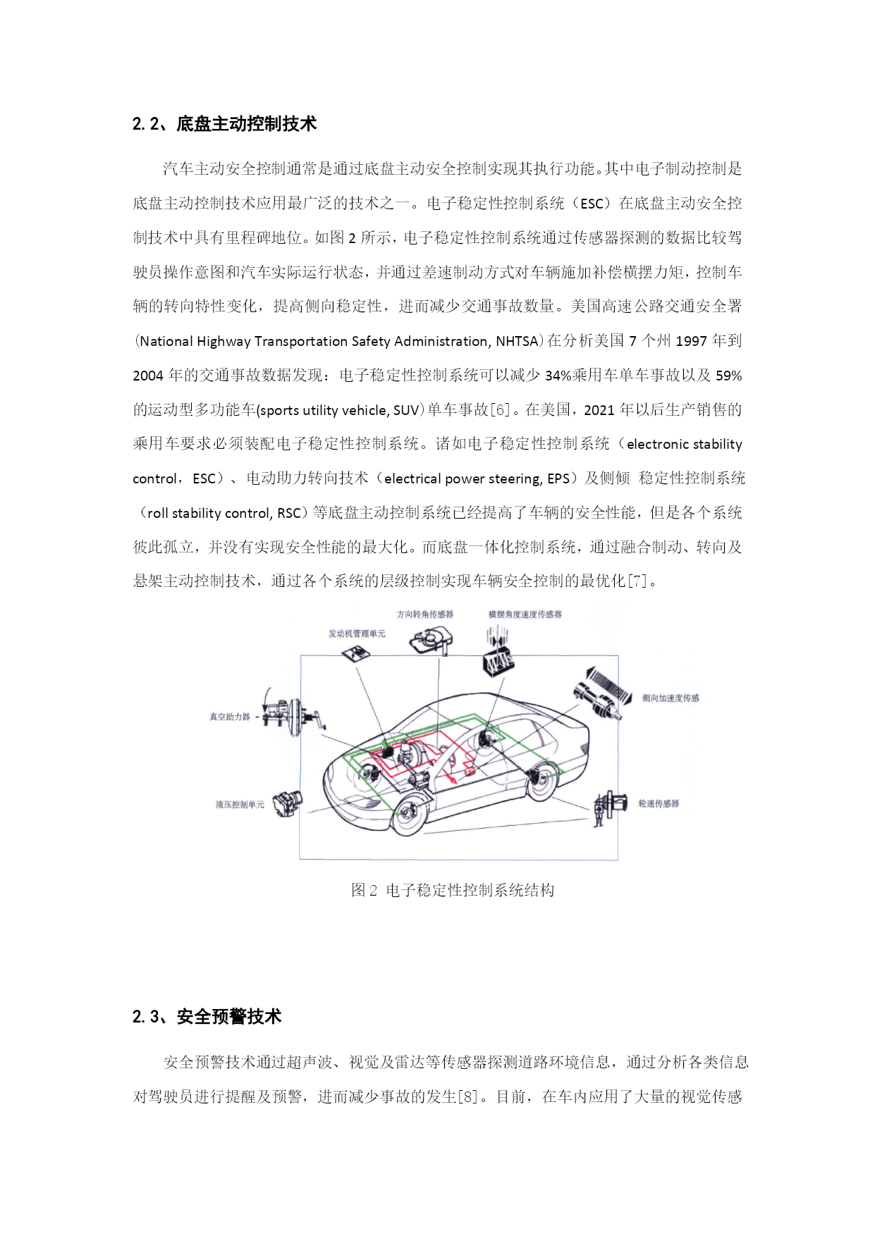 汽车安全与道路交通安全优质资料(可以直接使用,可编辑优质资料,欢迎下载)汽车安全与道路交通安全的关系XXX(学校,地址)摘要:面对中国道路交通事故伤亡率高的现状,企业、学校、研究机构都加大了对汽车安全技术研究开发的投入,加快了安全技术研发能力的提升和产品化进程。自主品牌汽车C-NCAP五星高分的获得标志着中国被动安全技术的飞跃性发展。进一步开展对行人保护、后排乘员保护、防后碰鞭打保护以及骑自行车人保护等被动安全研究的同时,主动安全系统、预碰撞系统、智能化汽车网络系统的研究开发已经成为关注的热点,更高层次的乘员、车和环境等相关主被动安全技术的统合协调,将推动零碰撞零伤亡汽车安全理念的实现[1]。从汽车安全新技术方面分析和阐述了车辆及行人在提高道路交通安全方面的重要作用,并提出了相应的建议和设想。关键词:汽车安全;主动安全系统;被动安全系统;NCAP;道路交通1、引言随着社会及科学技术的发展,交通设施和交通工具日益发达,极大促进了经济贸易、科学技术、生产和生活各项活动,为人们提供了出行方便性。但是,也正是由于这些交通工具引发了大量的交通事故,导致了大量的人员伤亡。根据世界卫生组织2005年的统计数据,全世界因车辆意外死亡的人数约为120万,受伤人数则多达5000万。据统计,2005年我国发生的交通事故数为45万起,死亡人数达9.9万,受伤人数达47万,由此造成的损失逾125亿美元,占GDP1.5%。车辆是整个事故中的起因,是关键因素之一[2]。汽车事故增多,所引起的人员伤亡和财产损失严重,已成为一个不容忽视的社会问题。针对这一问题而设置的安全防护装置是现代汽车结构的重要组成部分。为此,对于驾驶人辅助系统等主动、被动安全技术的研发,减少驾驶员的误判机率预防交通事故的发生具有深远的现实意义。2、汽车主动安全技术的发展现状20世纪80年代前,汽车安全性的研发重点在安全带、安全座椅等被动安全设备上。后来人们意识到事故前对车辆运动状态进行实时监测,并在必要时进行干涉或预警更具有现实意义。开始从提高车辆制动性能的角度来提高其主动安全性,其中制动防抱死装置(ABS)有效抑制制动抱死导致的跑偏与侧滑事故,保证了汽车的制动安全性。ABS在20世纪90年代广泛普及,随后迎来了电子制动系统(EBS)、制动辅助系统(BAS)及驱动防滑系统(ASR)等相关主动安全系统,多种安全系统集成化趋势初现。随着电子技术、通信技术和传感技术的广泛应用,汽车安全技术迎来日新月异的发展局面。1986年,奔驰汽车公司发起,联合欧洲的14家汽车制造厂、70多家零部件企业和120个大学制定普罗米修斯(Prometheus)计划,在驾驶员、车辆、驾驶和交通环境及运输系统间建立必要的联系[3],从而实现车辆智能化。ASV计划是日本运输省在1991年为了防止重大交通事故的发生,成立由汽车产业界和学界组成的先进安全车推进检讨会,开始了先进安全车ASV(AdvancedSafetyVehicle)的研究计划,为智能交通系统ITS(IntelligentTraf-ficSystem)的汽车做准备[4].2.1、主动安全技术主动安全技术,又称预防安全技术,是指在轻松和舒适的驾驶条件下帮助驾驶员避免事故的技术。主动安全技术主要包括底盘主动安全技术、安全预警技术和综合安全技术等,整个主动安全技术的发展伴随着信息技术及电子技术的发展。底盘主动安全技术主要以底盘控制技术为核心,最终采用底盘部件执行安全相关控制。其应用最早始于制动防抱死系统(anti-lockedbrakingsystem,ABS),特别是1995年随着电子稳定性控制系统(electronicstabilitycontrol,ESC)投入市场,底盘主动安全技术进入到快速发展的阶段,后续诸如自适应巡航控制系统(adaptivecruisecontrol,ACC)及碰撞缓解制动系统(collisionmitigationbrakesystem,CMBS)等主动安全系统先后研发成功,底盘主动安全技术已经由单纯制动控制技术向集成转向控制发展。安全预警技术通过对危险情况识别并对驾驶员进行预警提示。随着视觉技术应用的发展,以视觉传感器为代表安全预警系统被广泛应用,其中车道偏离预警系统(lanedeparturewarning,LDW)及盲点监测预警系统等已经大量应用于豪华汽车上。随着汽车电子技术及传感器技术的发展,特别是通信技术在汽车上的应用,使汽车主动安全技术正朝着多功能、集成化方向发展,而与被动安全技术3G通讯网络的结合后,集主被动于一体的综合安全技术成为未来汽车安全技术的发展方向[5]。2.2、底盘主动控制技术汽车主动安全控制通常是通过底盘主动安全控制实现其执行功能。其中电子制动控制是底盘主动控制技