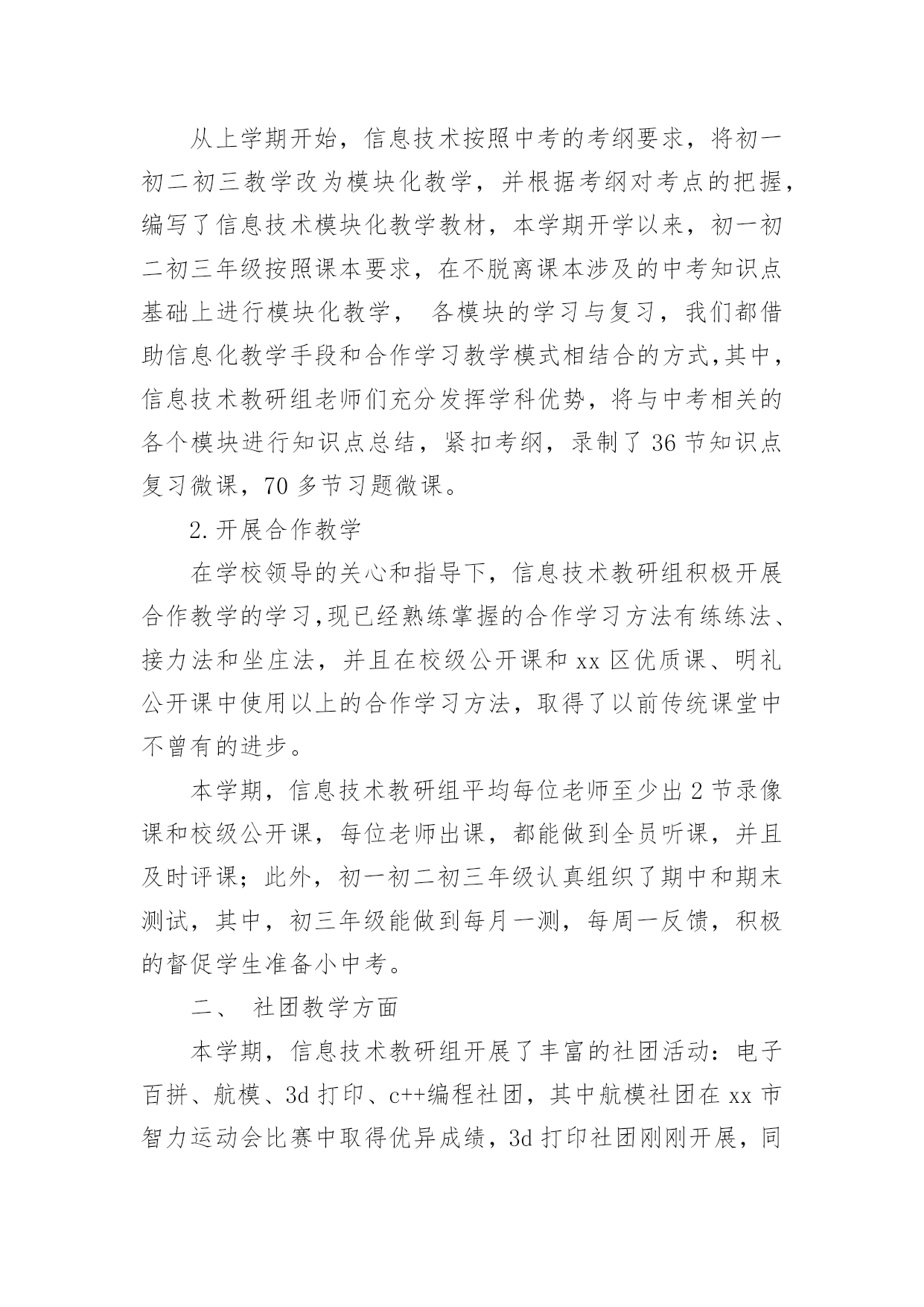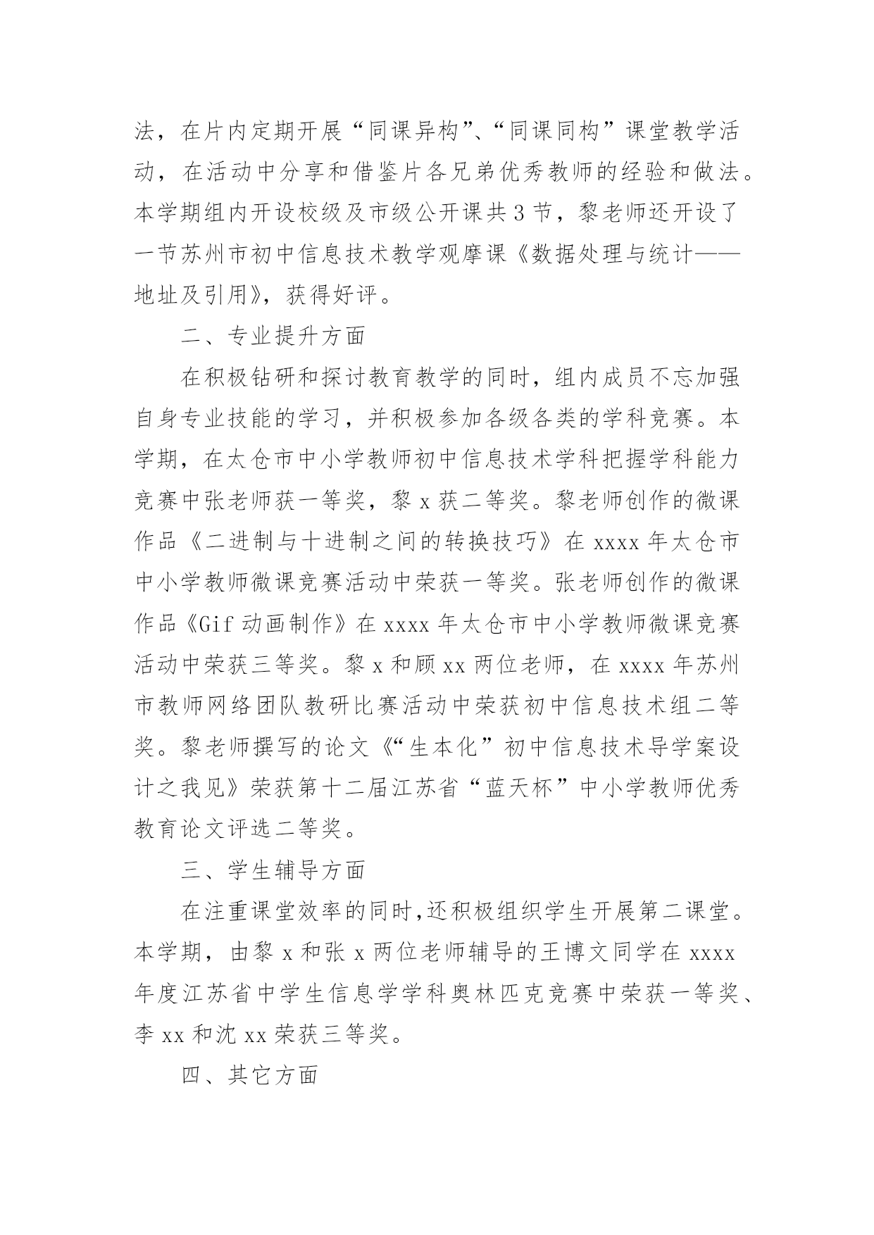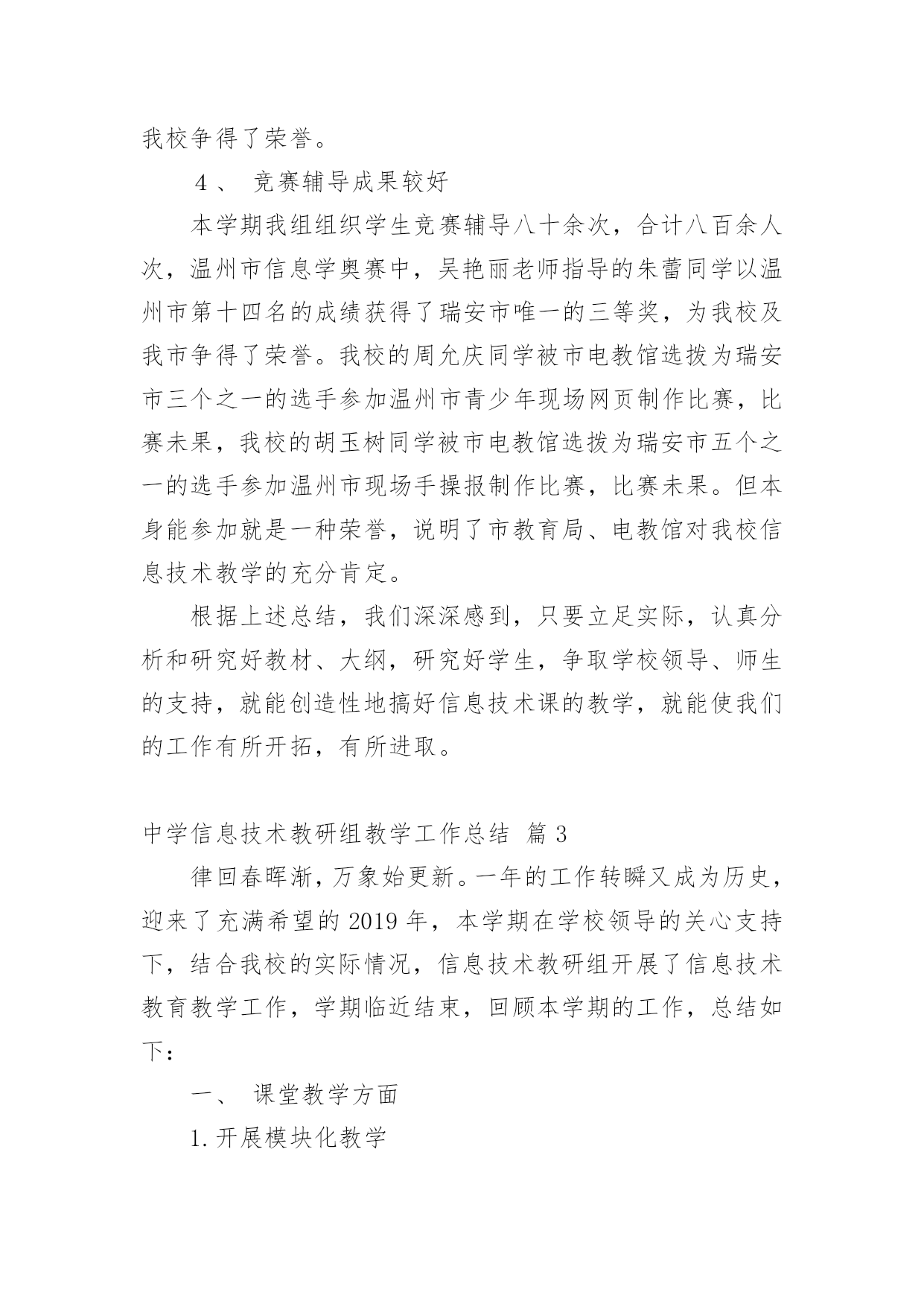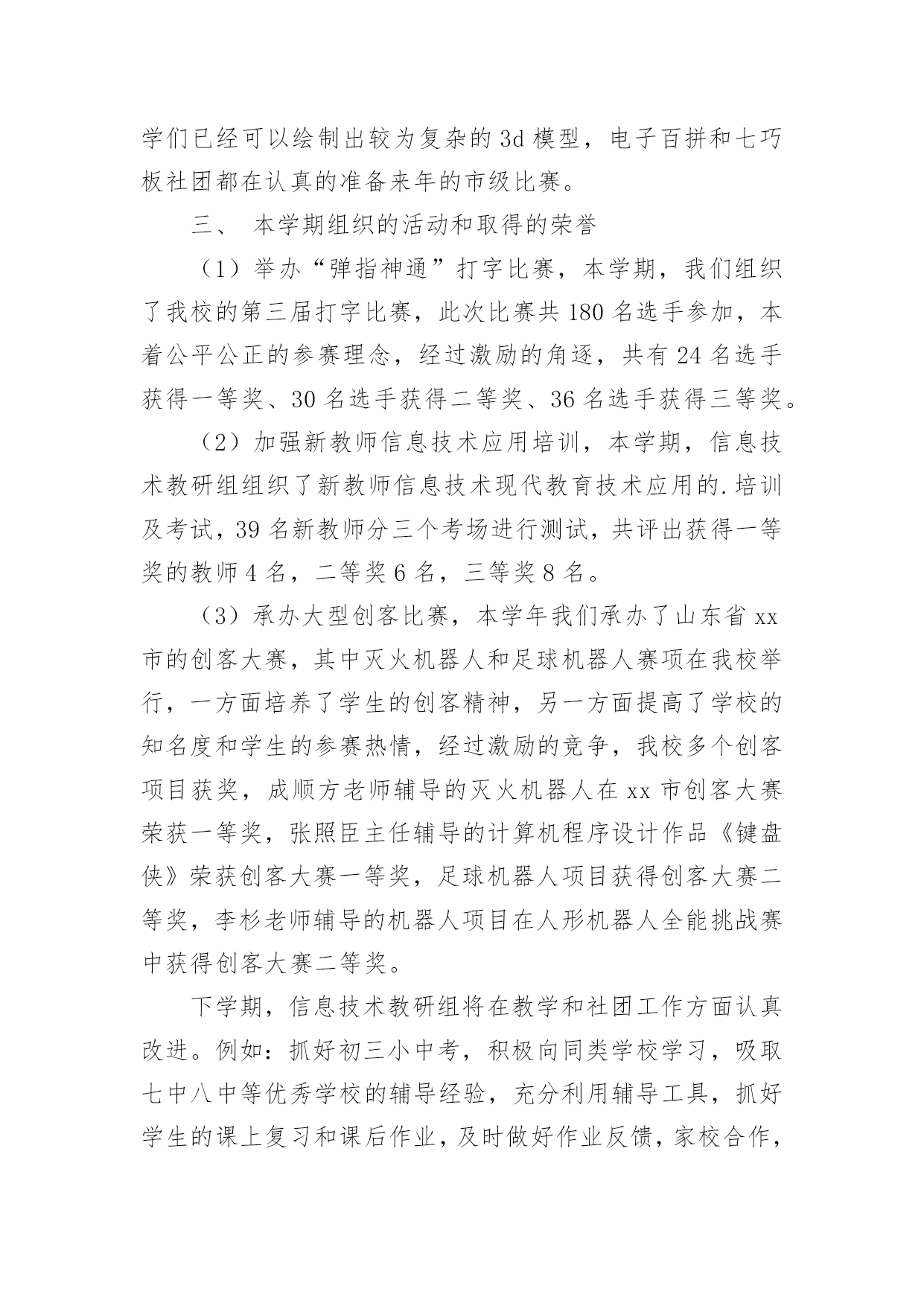 中学信息技术教研组教学工作总结中学信息技术教研组教学工作总结(通用12篇)在我们无暇顾及时间时,时间早已匆匆流逝,在这段时间的教学中我们通过努力地工作,也有了一点收获,这也意味着,又要准备开始写教学总结了。想必许多人都在为如何写好教学总结而烦恼吧,下面是小编精心整理的中学信息技术教研组教学工作总结,供大家参考借鉴,希望可以帮助到有需要的朋友。中学信息技术教研组教学工作总结篇1学期工作即将结束,为了以更好的姿态展望xxxx年,现将一学期教研组所做的主要工作和取得的成绩做如下总结:一、教育科研方面积极参加教师发展中心组织的各项教研活动,认真组织好教研组内每周一次的集体备课活动。借助QQ群网络平台与兄弟学校教师积极探讨教育教学上所遇到的各种问题。继续深入探索新课改、网络环境下的.初中信息技术教学方式。利用每周一次的组内集体备课,进一步巩固《初中信息技术课堂生本教学的研究与实践》课题的研究成果。围绕课题的研究,在极推进初一年级信息技术导学案教学的全面开展,不断提高全体学生网络自主学习、小组合作学习的能力,进而提高课堂的效率。组内老师深入学习新教材,积极探讨教法,在片内定期开展“同课异构”、“同课同构”课堂教学活动,在活动中分享和借鉴片各兄弟优秀教师的经验和做法。本学期组内开设校级及市级公开课共3节,黎老师还开设了一节苏州市初中信息技术教学观摩课《数据处理与统计——地址及引用》,获得好评。二、专业提升方面在积极钻研和探讨教育教学的同时,组内成员不忘加强自身专业技能的学习,并积极参加各级各类的学科竞赛。本学期,在太仓市中小学教师初中信息技术学科把握学科能力竞赛中张老师获一等奖,黎x获二等奖。黎老师创作的微课作品《二进制与十进制之间的转换技巧》在xxxx年太仓市中小学教师微课竞赛活动中荣获一等奖。张老师创作的微课作品《Gif动画制作》在xxxx年太仓市中小学教师微课竞赛活动中荣获三等奖。黎x和顾xx两位老师,在xxxx年苏州市教师网络团队教研比赛活动中荣获初中信息技术组二等奖。黎老师撰写的论文《“生本化”初中信息技术导学案设计之我见》荣获第十二届江苏省“蓝天杯”中小学教师优秀教育论文评选二等奖。三、学生辅导方面在注重课堂效率的同时,还积极组织学生开展第二课堂。本学期,由黎x和张x两位老师辅导的王博文同学在xxxx年度江苏省中学生信息学学科奥林匹克竞赛中荣获一等奖、李xx和沈xx荣获三等奖。四、其它方面组员除了认真完成教育教学任务外,还一如既往地及时高效地做好机房、教室、老师电脑的日常维护工作,保证学校网络秩序、课堂秩序及老师办公的正常进行。本学期,学校网站在“xxxx年苏州市中小学优秀校园网站评比”活动中荣获初中组二等奖。黎老师被评为太仓市教育信息化先进个人。中学信息技术教研组教学工作总结篇2这个学期,我们信息技术教研组的教学工作得到了学校领导的大力支持,先后花费资金十几万元为学校新添置了一个拥有三十台微机的电子阅览室,为一个拥有四十三台微机的旧机房从10M带宽的集线器升级到100M带宽的交换机,从而实现了我校两百多台电脑全部接入校园网的愿望,撤除电子备课室,新置课件制作中心,为每个学科办公室配备一台微机,解决了教师做课件、查找获取信息不方便的难题,并为三个计算机教室配备了新椅子。使我们信息技术教研组的老师得到了莫大的鼓舞。在学校领导的关心支持下,我们信息技术组的`老师也在这个学期立足实际、搞好教学,并且不断更新知识、提高自身素质,在这个基础上,还为各级信息技术竞赛付出了辛勤的汗水。现将这个学期教研组工作总结如下:1、立足实际、搞好教学。我校的学生在信息技术方面的情况比较特殊,因为拥有一些转学生,与其它学科不同的是这些转学生之前从没有学过信息技术,在这方面是个空白,甚至不知道鼠标的用法,不知道开关机的方法,而其他的学生呢?已经会在网上邻居查找游戏,知道怎么将一个文件夹共享、隐藏、给共享加访问权限,有的时候老师都拿他没有办法。怎样让一个从未接触过信息技术知识的学生,熟练地掌握最基本的知识,我们组的老师进行了“分层教学”的模式,并加强个别辅导、实现同学间一帮一、多帮一,基本解决了常规教学中难以攻克的难题。2、立足教学、搞好教研组工作在教务处的要求与指导下,这个学期的教研组工作是非常正常的,每个月都有教研组工作小结,集中学习的时间、地点,内容落实,并有记载,每月至少有一次专题性理论学习,内容针对强,且有带头中心发言,积极参加教研组的课堂教学专题性研究。每月组内至少开出两节研究课,每月至少听课四节以上。并做好听课笔记。3、加强学习,提高业务水平组内三位教师平时注重自己的文化、业务学习,能攻记一本教学理论书,泛读两种以上杂志,撰写一定质量、教学论文,卡片摘记每月十张以上。任何教学活动总离不开理论与实践相结合这条主线,信息技术更是如此。在学校领导的