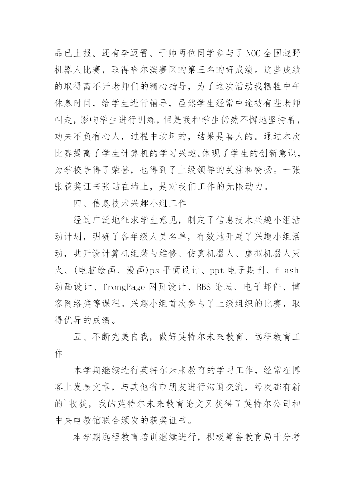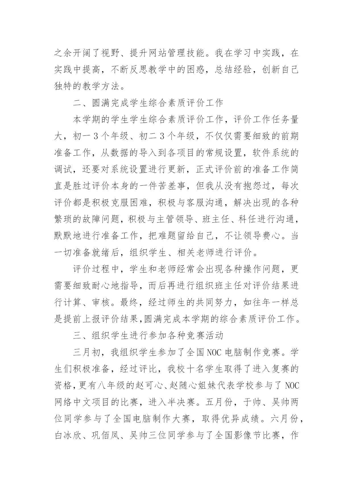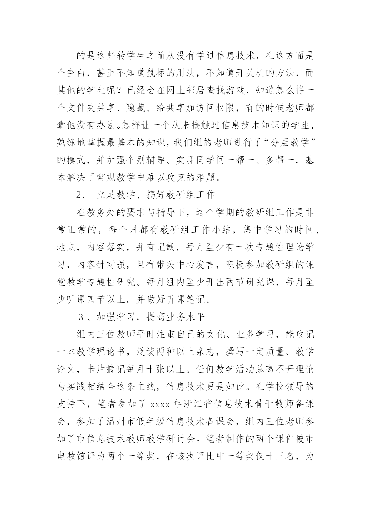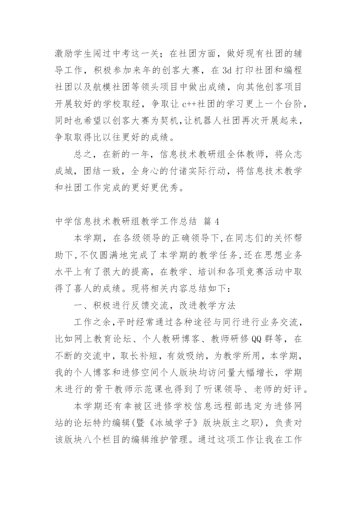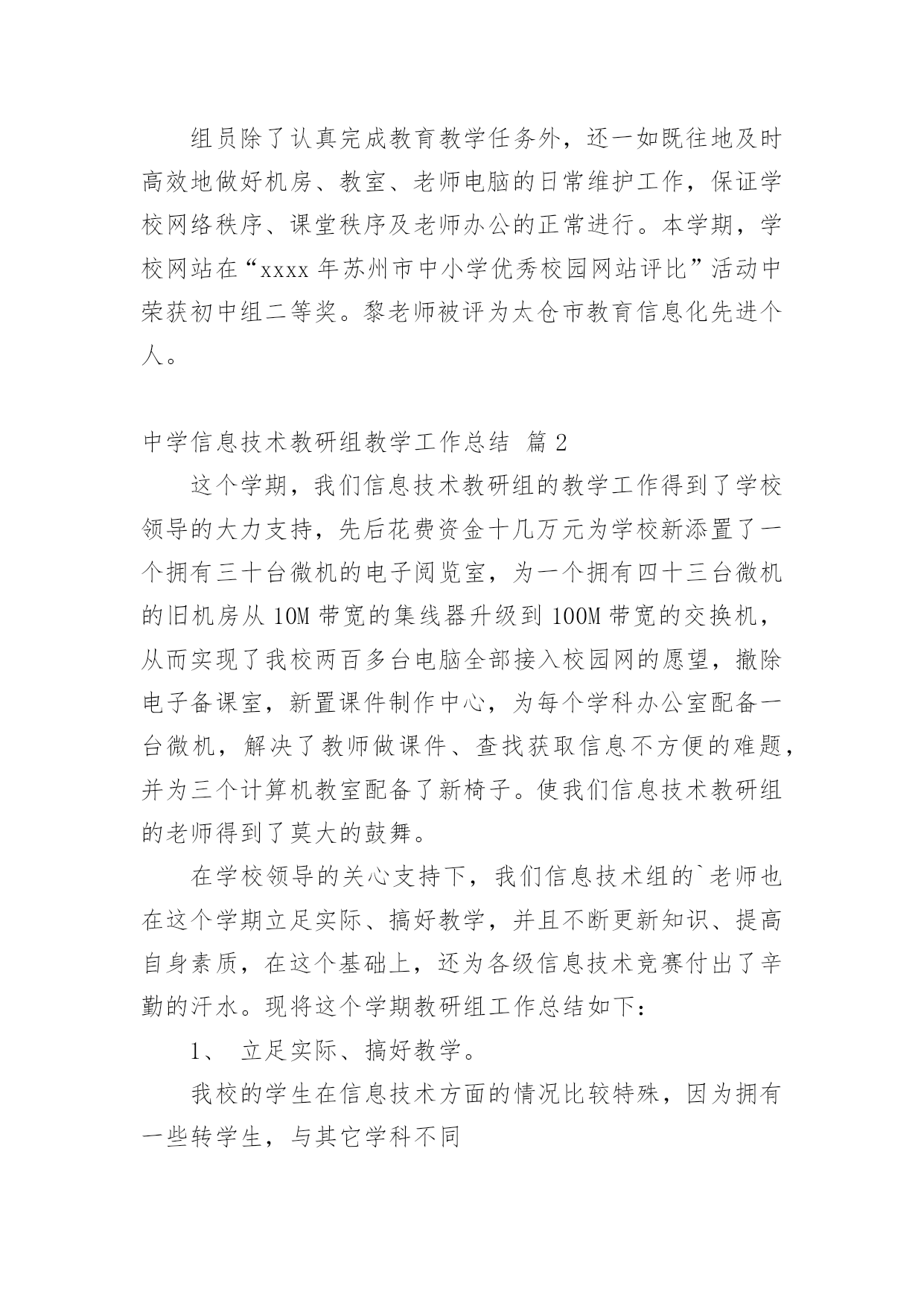 中学信息技术教研组教学工作总结中学信息技术教研组教学工作总结(通用12篇)在我们无暇顾及时间时,时间早已匆匆流逝,在这段时间的教学中我们通过努力地工作,也有了一点收获,这也意味着,又要准备开始写教学总结了。想必许多人都在为如何写好教学总结而烦恼吧,下面是小编精心整理的中学信息技术教研组教学工作总结,供大家参考借鉴,希望可以帮助到有需要的朋友。中学信息技术教研组教学工作总结篇1学期工作即将结束,为了以更好的姿态展望xxxx年,现将一学期教研组所做的主要工作和取得的成绩做如下总结:一、教育科研方面积极参加教师发展中心组织的各项教研活动,认真组织好教研组内每周一次的集体备课活动。借助QQ群网络平台与兄弟学校教师积极探讨教育教学上所遇到的各种问题。继续深入探索新课改、网络环境下的.初中信息技术教学方式。利用每周一次的组内集体备课,进一步巩固《初中信息技术课堂生本教学的研究与实践》课题的研究成果。围绕课题的研究,在极推进初一年级信息技术导学案教学的全面开展,不断提高全体学生网络自主学习、小组合作学习的能力,进而提高课堂的效率。组内老师深入学习新教材,积极探讨教法,在片内定期开展“同课异构”、“同课同构”课堂教学活动,在活动中分享和借鉴片各兄弟优秀教师的经验和做法。本学期组内开设校级及市级公开课共3节,黎老师还开设了一节苏州市初中信息技术教学观摩课《数据处理与统计——地址及引用》,获得好评。二、专业提升方面在积极钻研和探讨教育教学的同时,组内成员不忘加强自身专业技能的学习,并积极参加各级各类的学科竞赛。本学期,在太仓市中小学教师初中信息技术学科把握学科能力竞赛中张老师获一等奖,黎x获二等奖。黎老师创作的微课作品《二进制与十进制之间的转换技巧》在xxxx年太仓市中小学教师微课竞赛活动中荣获一等奖。张老师创作的微课作品《Gif动画制作》在xxxx年太仓市中小学教师微课竞赛活动中荣获三等奖。黎x和顾xx两位老师,在xxxx年苏州市教师网络团队教研比赛活动中荣获初中信息技术组二等奖。黎老师撰写的论文《“生本化”初中信息技术导学案设计之我见》荣获第十二届江苏省“蓝天杯”中小学教师优秀教育论文评选二等奖。三、学生辅导方面在注重课堂效率的同时,还积极组织学生开展第二课堂。本学期,由黎x和张x两位老师辅导的王博文同学在xxxx年度江苏省中学生信息学学科奥林匹克竞赛中荣获一等奖、李xx和沈xx荣获三等奖。四、其它方面组员除了认真完成教育教学任务外,还一如既往地及时高效地做好机房、教室、老师电脑的日常维护工作,保证学校网络秩序、课堂秩序及老师办公的正常进行。本学期,学校网站在“xxxx年苏州市中小学优秀校园网站评比”活动中荣获初中组二等奖。黎老师被评为太仓市教育信息化先进个人。中学信息技术教研组教学工作总结篇2这个学期,我们信息技术教研组的教学工作得到了学校领导的大力支持,先后花费资金十几万元为学校新添置了一个拥有三十台微机的电子阅览室,为一个拥有四十三台微机的旧机房从10M带宽的集线器升级到100M带宽的交换机,从而实现了我校两百多台电脑全部接入校园网的愿望,撤除电子备课室,新置课件制作中心,为每个学科办公室配备一台微机,解决了教师做课件、查找获取信息不方便的难题,并为三个计算机教室配备了新椅子。使我们信息技术教研组的老师得到了莫大的鼓舞。在学校领导的关心支持下,我们信息技术组的`老师也在这个学期立足实际、搞好教学,并且不断更新知识、提高自身素质,在这个基础上,还为各级信息技术竞赛付出了辛勤的汗水。现将这个学期教研组工作总结如下:1、立足实际、搞好教学。我校的学生在信息技术方面的情况比较特殊,因为拥有一些转学生,与其它学科不同的是这些转学生之前从没有学过信息技术,在这方面是个空白,甚至不知道鼠标的用法,不知道开关机的方法,而其他的学生呢?已经会在网上邻居查找游戏,知道怎么将一个文件夹共享、隐藏、给共享加访问权限,有的时候老师都拿他没有办法。怎样让一个从未接触过信息技术知识的学生,熟练地掌握最基本的知识,我们组的老师进行了“分层教学”的模式,并加强个别辅导、实现同学间一帮一、多帮一,基本解决了常规教学中难以攻克的难题。2、立足教学、搞好教研组工作在教务处的要求与指导下,这个学期的教研组工作是非常正常的,每个月都有教研组工作小结,集中学习的时间、地点,内容落实,并有记载,每月至少有一次专题性理论学习,内容针对强,且有带头中心发言,积极参加教研组的课堂教学专题性研究。每月组内至少开出两节研究课,每月至少听课四节以上。并做好听课笔记。3、加强学习,提高业务水平组内三位教师平时注重自己的文化、业务学习,能攻记一本教学理论书,泛读两种以上杂志,撰写一定质量、教学论文,卡片摘记每月十张以上。任何教学活动总离不开理论与实践相结合这条主线,信息技术更是如此。在学校领导的