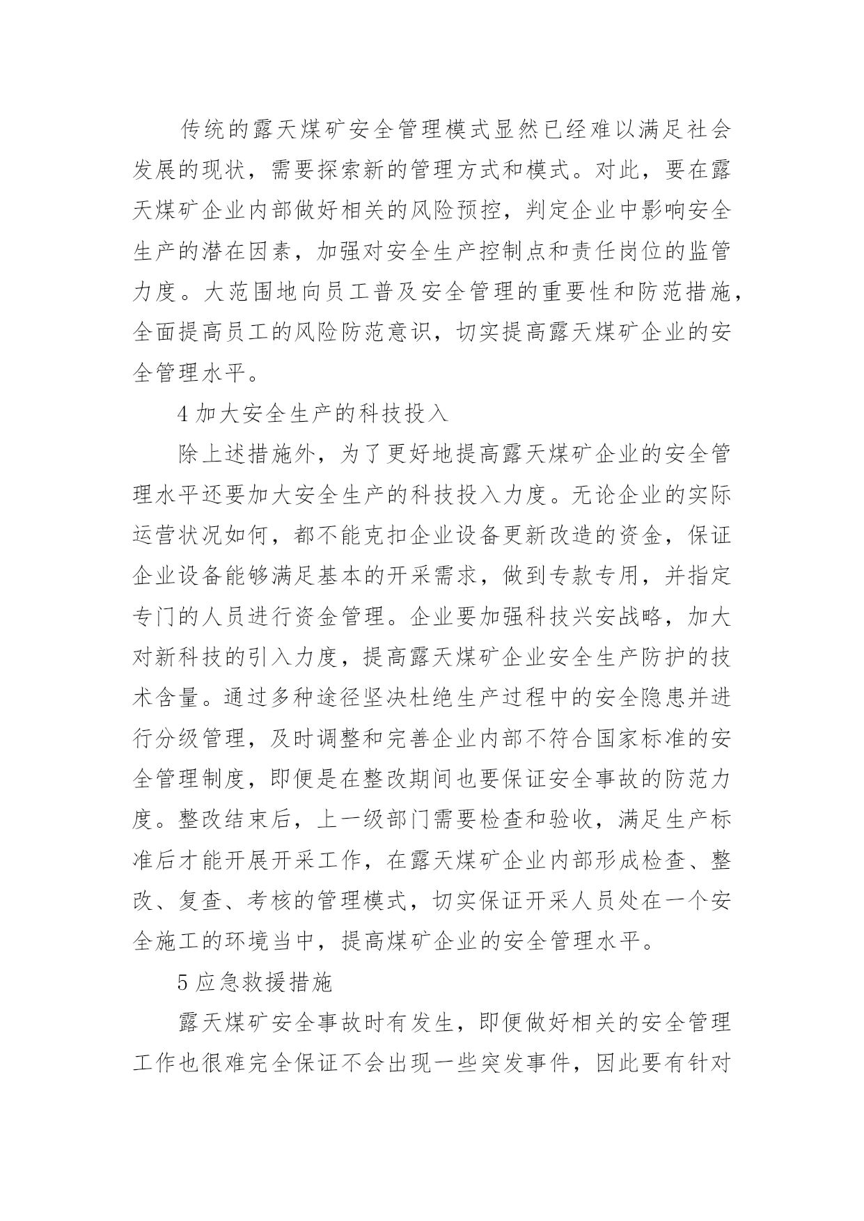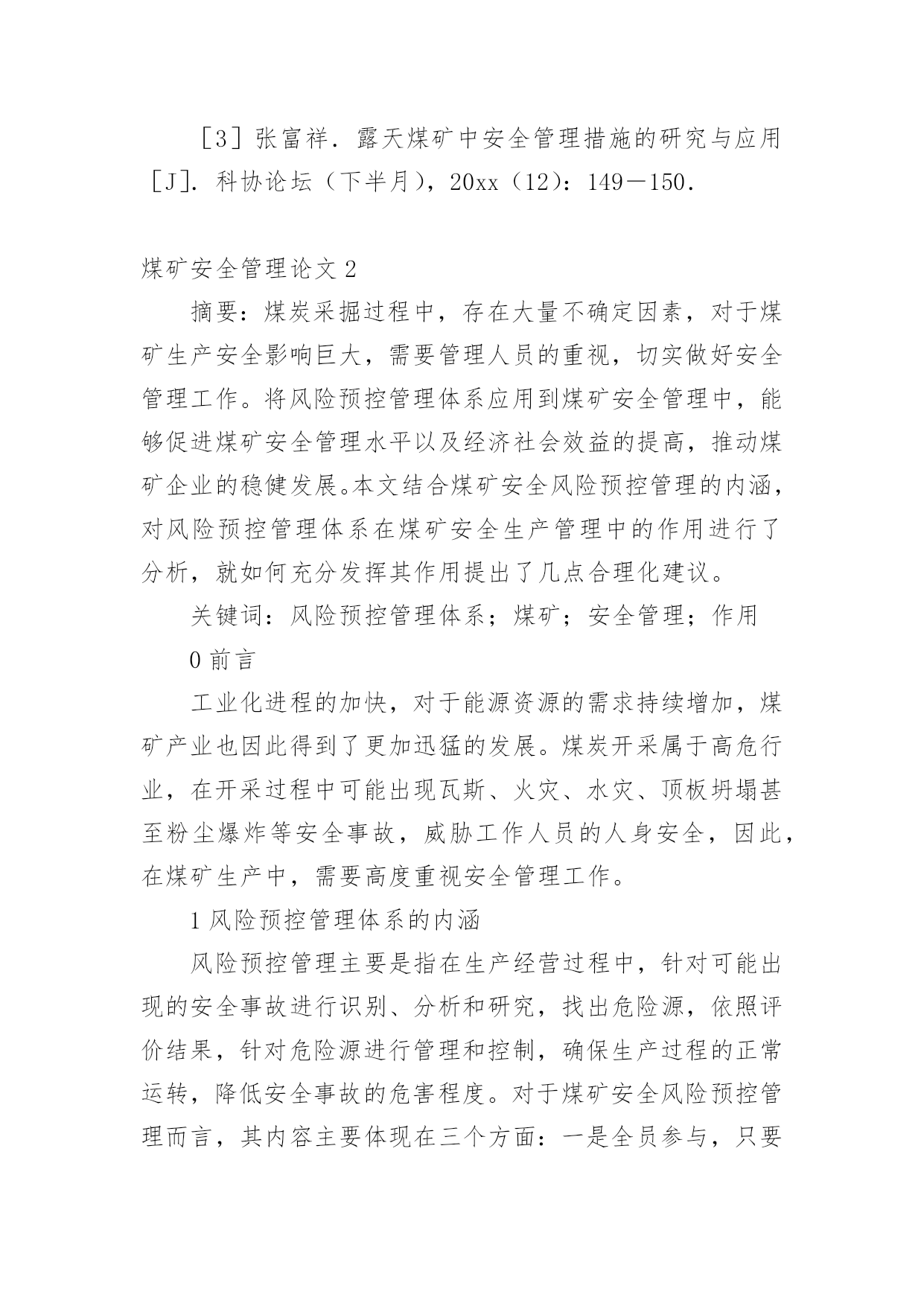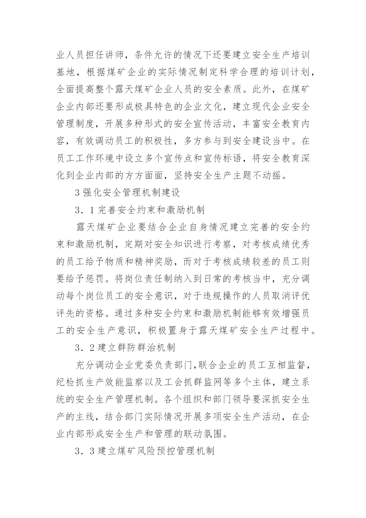 煤矿安全管理论文无论是在学校还是在社会中,大家都写过论文,肯定对各类论文都很熟悉吧,论文是探讨问题进行学术研究的一种手段。一篇什么样的论文才能称为优秀论文呢?以下是小编为大家整理的煤矿安全管理论文,仅供参考,欢迎大家阅读。煤矿安全管理论文1摘要:安全管理作为露天煤矿管理的重要组成部分,其管理水平的高低对露天煤矿的发展具有不可忽视的影响。针对露天煤矿安全管理进行研究,并提出了相关的管理对策。关键词:露天煤矿;安全管理;对策目前,露天煤矿发生的安全事故较多,对施工人员的生命安全造成巨大的威胁,同时也造成了许多不必要的经济损失。1我国露天煤矿开采安全状况1.1自然环境我国大陆多由小型地块汇聚组成,地块在汇聚的过程中会发生挤压、碰撞出现变形的情况,大大增加了煤矿开采的复杂性。近些年来由于印度板块不断向我国大陆凸起,造成我国地质条件更为复杂,煤矿开采过程中难度更大,容易发生瓦斯压力、地应力等问题,影响露天煤矿的发展。自然环境对煤矿开采具有直接影响,其难度系数制约煤矿的安全生产[1]。1.2技术因素我国大约27个省、自治区有煤矿,但由于自然环境的巨大差异,在开采时往往受到多方面条件的限制。总体来说我国露天煤矿开采过程中机械化水平较低,一些煤矿的机械化程度甚至不到50%,开采方式以井工开采为主,尽管生产效率较高,但开采安全无法保障。露天煤矿开采因其自身的特点导致易流失高素质人才,目前呈现人才匮乏的局面,不利于露天煤矿安全管理水平的提高。1.3安全管理水平只有在强有力的安全措施支撑下安全管理才能得以保障,许多安全事故都是由于安全技术措施落实不到位造成的,大多数的事故都属于责任事故。露天煤矿缺乏高素质人才导致安全管理水平长期得不到提高,人员的素质明显偏低。另外,煤矿企业技术手段较为落后,仍然采用传统的安全管理方法,创新力不足,遏制不住重复性安全事故的发生。2健全露天煤矿安全保证体系2.1完善安全规章制度健全露天煤矿安全保障体系的关键就是要完善安全规章制度,秉承“管生产必须管安全”的原则。涉及露天煤矿安全管理的所有岗位都要建立相关的生产责任制,并根据实际情况不断调整和完善。以现有的露天煤矿安全管理为依托,制定相关的规章制度,健全安全保证体系。露天煤矿管理中的各个岗位都要签订生产责任状,使每个岗位和岗位人员都明确自身的职责,任务清晰,在整个煤矿企业都营造一个人人关注生产安全的环境。由于煤矿开采是一个极为复杂的项目,开采过程中需要使用到多种设备,而目前多数煤矿企业的设备都较为老化,不能顺应现代化煤矿开采的需求,因此煤矿企业要加大对煤矿开采设备的管理力度,在煤矿开采的过程中如果需要交叉作业,应事先做好相关的交叉作业规程,保证交叉作业完全符合安全管理规定,避免安全事故的发生[2]。2.2建设安全生产监管体系对于露天煤矿,安全管理应该贯彻于环境、工作待遇以及机构设置等方方面面,无论企业的规模和业务如何拓展,都不能削弱露天煤矿安全生产监督管理的力度。煤矿企业在高度重视安全管理的同时,应该将一些具有责任心、勤奋、业务精湛的员工分配到生产监督管理工作当中。健全安全管理结构,每个岗位都要配置专业的安全监督管理员并设置相关科室。完善企业安全生产管理办法,定期对安全管理人员以及煤矿生产环节进行抽查,充分发挥安全管理员的职能和作用,在煤矿企业内部打造一支具有高度责任感、使命感的高素质人才队伍。2.3加强安全生产教育体系建设露天煤矿作业人员较多,同时也涉及多个高新技术设备,因而需加强对操作人员的安全生产教育,软硬建设兼具,以日常培训为主要教育途径,还要结合脱产培训的方式,主要培训员工的薄弱环节。为了保证安全生产教育能够长期的存在并发展,露天煤矿企业应该建立完善的培训制度,聘请专业人员担任讲师,条件允许的情况下还要建立安全生产培训基地,根据煤矿企业的实际情况制定科学合理的培训计划,全面提高整个露天煤矿企业人员的安全素质。此外,在煤矿企业内部还要形成极具特色的企业文化,建立现代企业安全管理制度,开展多种形式的安全宣传活动,丰富安全教育内容,有效调动员工的积极性,多方参与到安全建设当中。在员工工作环境中设立多个宣传点和宣传标语,将安全教育深化到企业内部的方方面面,坚持安全生产主题不动摇。3强化安全管理机制建设3.1完善安全约束和激励机制露天煤矿企业要结合企业自身情况建立完善的安全约束和激励机制,定期对安全知识进行考察,对考核成绩优秀的员工给予物质和精神奖励,而对于考核成绩较差的员工则要给予惩罚。将岗位责任制纳入到日常的考核当中,充分调动每个岗位员工的安全意识,对于违规操作的人员取消评优评先的资格。通过多种安全约束和激励机制能够有效增强员工的安全生产意识,积极置身于露天煤矿安全生产过程中。3.2建立群防群治机制充分调动企业党委负责部门,联合企业的员工互相监督,纪检抓生产效能监