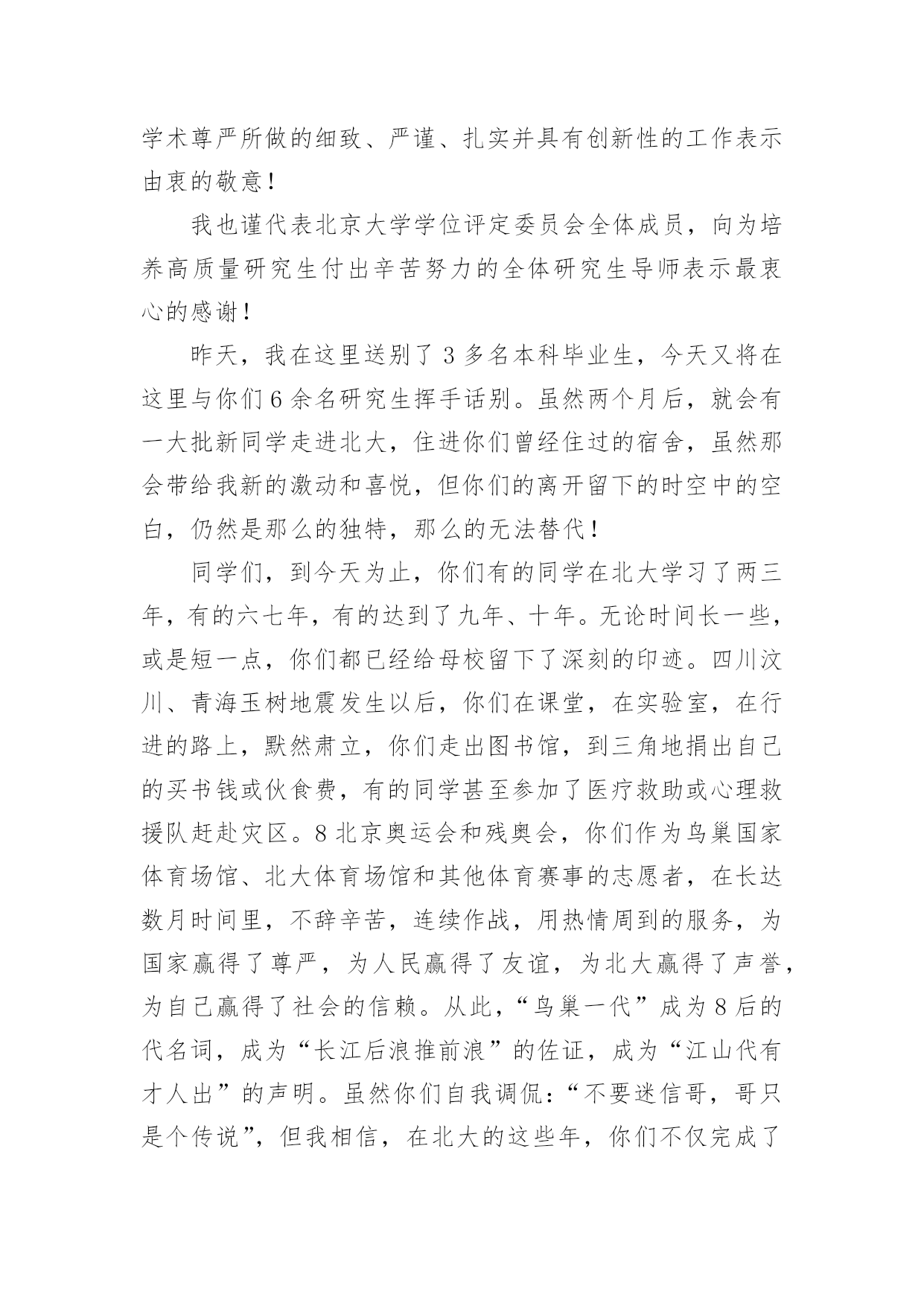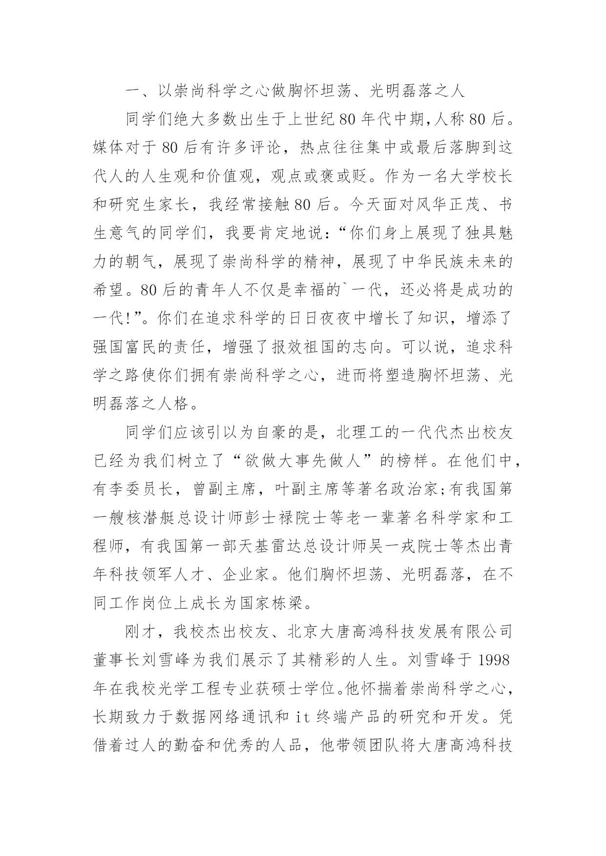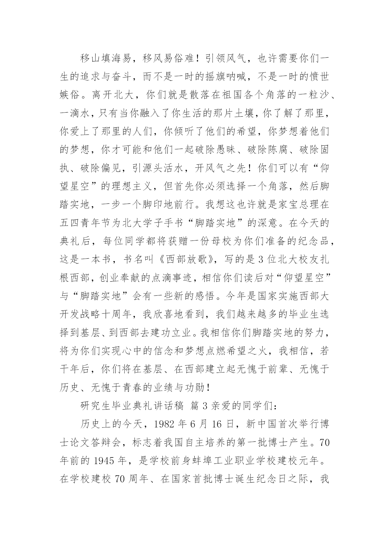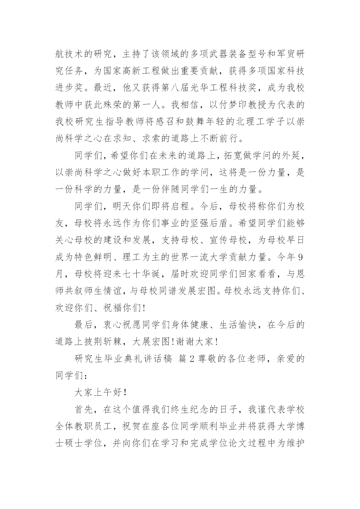 研究生毕业典礼讲话稿研究生毕业典礼讲话稿在不断进步的时代,各种讲话稿频频出现,讲话稿可以按照用途、性质等来划分,是演讲上一个重要的准备工作。还是对讲话稿一筹莫展吗?下面是小编为大家整理的研究生毕业典礼讲话稿,欢迎大家分享。研究生毕业典礼讲话稿篇1老师们,同学们:首先,我代表全校师生员工,祝贺20xx届研究生顺利完成学业并获得学位,祝贺你们即将踏上新的人生旅途!看到数百位身着学位服的优秀毕业生代表,我脑海中自然浮现出同学们怀揣崇尚科学之心,在追求科学的道路上付出的点点滴滴。我仿佛看到研究生教学楼的悠悠课堂,仿佛看到硕博公寓的点点星光,仿佛看到你们苦读的身影和从事研究的执着。由此,我深深感受到北理工学子追求科学、崇尚科学的强大力量!每年这个季节,校园中到处都有三五成群身着学位服合影留念的毕业生,我也多次被邀请加入到同学们的行列之中。由此,我感受到同学们对于母校的依依不舍,更感受到同学们收获科学探索成果后的喜悦。在同学们青春有志、满怀豪情,即将踏上新征途之际,作为校长和学长,我要深深地祝福每一位毕业研究生,并借此机会送上我的期望和祝福,这就是“用崇尚科学之心做人、做事、做学问,点亮精彩人生!”一、以崇尚科学之心做胸怀坦荡、光明磊落之人同学们绝大多数出生于上世纪80年代中期,人称80后。媒体对于80后有许多评论,热点往往集中或最后落脚到这代人的人生观和价值观,观点或褒或贬。作为一名大学校长和研究生家长,我经常接触80后。今天面对风华正茂、书生意气的同学们,我要肯定地说:“你们身上展现了独具魅力的朝气,展现了崇尚科学的精神,展现了中华民族未来的希望。80后的青年人不仅是幸福的`一代,还必将是成功的一代!”。你们在追求科学的日日夜夜中增长了知识,增添了强国富民的责任,增强了报效祖国的志向。可以说,追求科学之路使你们拥有崇尚科学之心,进而将塑造胸怀坦荡、光明磊落之人格。同学们应该引以为自豪的是,北理工的一代代杰出校友已经为我们树立了“欲做大事先做人”的榜样。在他们中,有李委员长,曾副主席,叶副主席等著名政治家;有我国第一艘核潜艇总设计师彭士禄院士等老一辈著名科学家和工程师,有我国第一部天基雷达总设计师吴一戎院士等杰出青年科技领军人才、企业家。他们胸怀坦荡、光明磊落,在不同工作岗位上成长为国家栋梁。刚才,我校杰出校友、北京大唐高鸿科技发展有限公司董事长刘雪峰为我们展示了其精彩的人生。刘雪峰于1998年在我校光学工程专业获硕士学位。他怀揣着崇尚科学之心,长期致力于数据网络通讯和it终端产品的研究和开发。凭借着过人的勤奋和优秀的人品,他带领团队将大唐高鸿科技打造成为目前国内it终端产品流通领域的领军企业。当代企业家有一个共识——“要做企业先做人”,并将是否有崇高的人格作为选人用人的第一标准。在此,我请同学们以刘雪峰等杰出校友为榜样,怀崇尚科学之心,揣凌云壮志理想,通过历练,做到像前辈般精彩。同学们,希望你们在未来的道路上,塑造品格,凝聚力量,以崇尚科学之心做胸怀坦荡、光明磊落的人,在各自的岗位上取得骄人的成绩,成长为国家栋梁。二、以崇尚科学之心做志存高远、脚踏实地之事在追求科学的道路上,所有北理工人始终牢记徐特立老院长的教诲:实事求是,不自以为是。七十载岁月峥嵘,延安精神薪火相传。延安精神作为我校的办学特色之一,其精髓是北理工人追求科学的力量之源。希望同学们秉承延安精神的优良传统,以崇尚科学之心不断历练求真务实、脚踏实地之风气,严于律己,认真做事。在此,我要向同学们介绍20xx年首都十大教育新闻人物、我校软件学院院长丁刚毅教授。他1993年在我校获博士学位并留校任教。在长期的教学和科研工作中,丁刚毅教授脚踏实地,认真做事。他率领团队成功组织建设了北京市重点交叉学科“数字表演与仿真技术”,成为国内该领域第一个省部级重点交叉学科。他带领团队发扬严谨求实的精神,克服无数困难,成功研制出“北京奥运会开闭幕式全景智能仿真编排系统”、“首都国庆60周年群众游行和联欢晚会数字仿真系统”,为这两次具有世界影响的国家重大活动提供了主要技术支持,受到国家表彰。在北京理工大学,正是有了一大批“志存高远、脚踏实地”的教师和研究生,学校的科技工作水平不断提升。20xx年、20xx年,我校获得国家科学技术奖数量分别居全国高校第四位和第六位。今年,我校吴嗣亮教授等完成的某军用测量技术已通过国家技术发明奖一等奖初评,成为全国进入公示阶段的三项顶级技术发明成果之一。在这些科技成果中,包含了许多研究生的贡献。在此,我要对同学们的辛勤工作和重要贡献表示深深的敬意和感谢。同学们,希望你们在未来的道路上,塑造执着,培养坚毅,时刻提醒自己“再踏实一些,再认真一些,再严谨一些”,以崇尚科学之心做好脚踏实地之事。三、以崇尚科学之心做博大精深、严谨卓越之学问古人将成才归结为,“读万卷书,行万