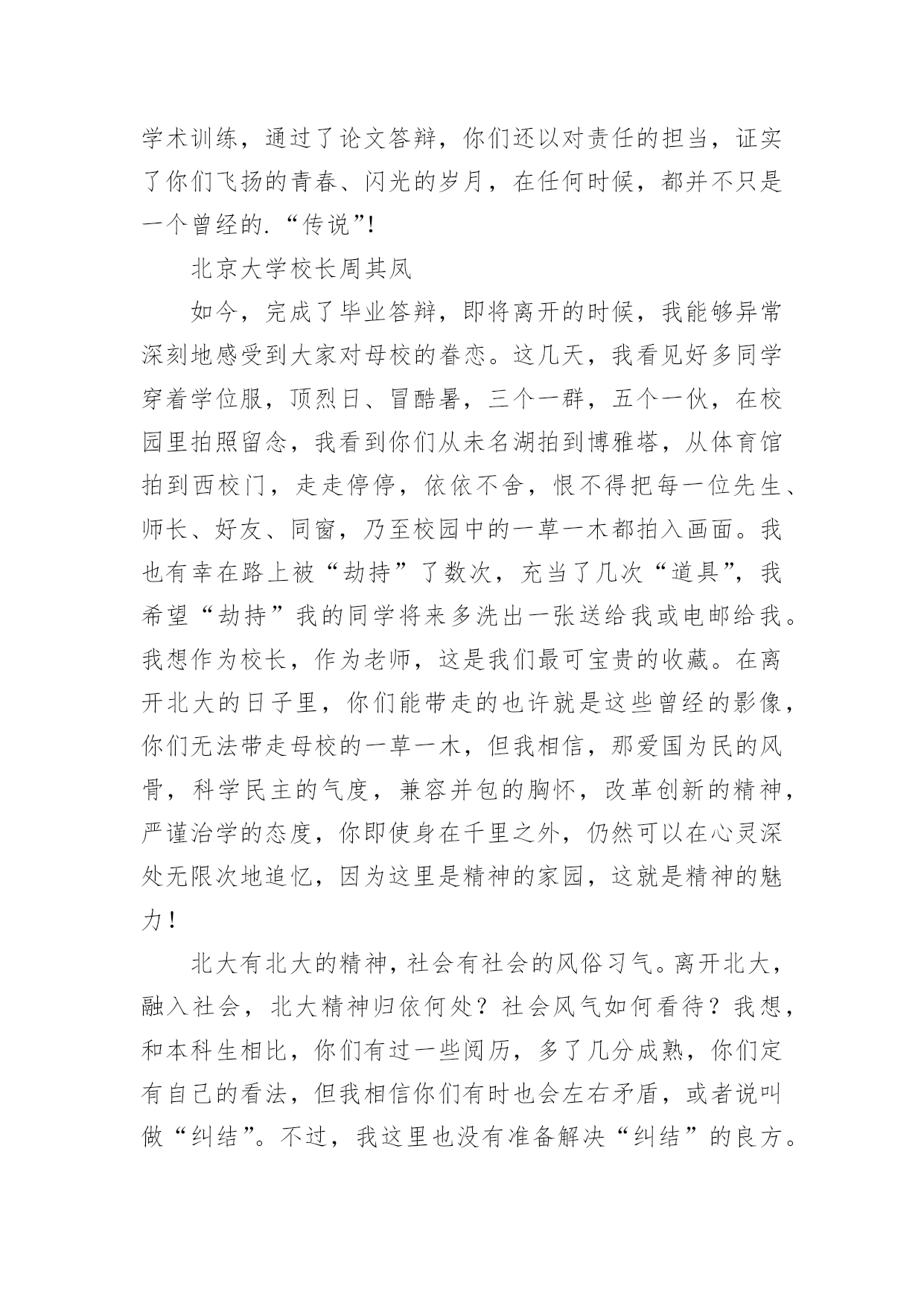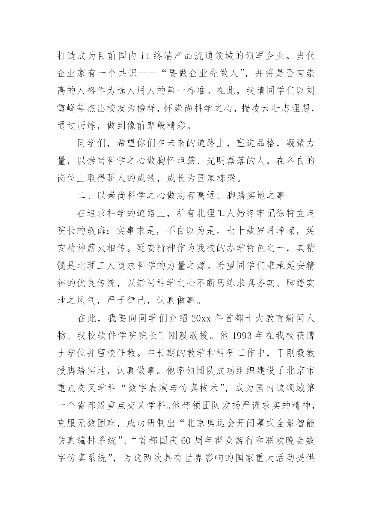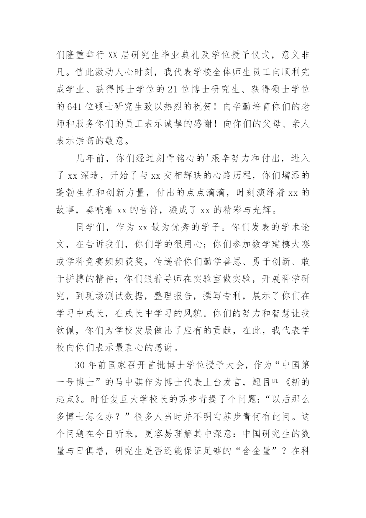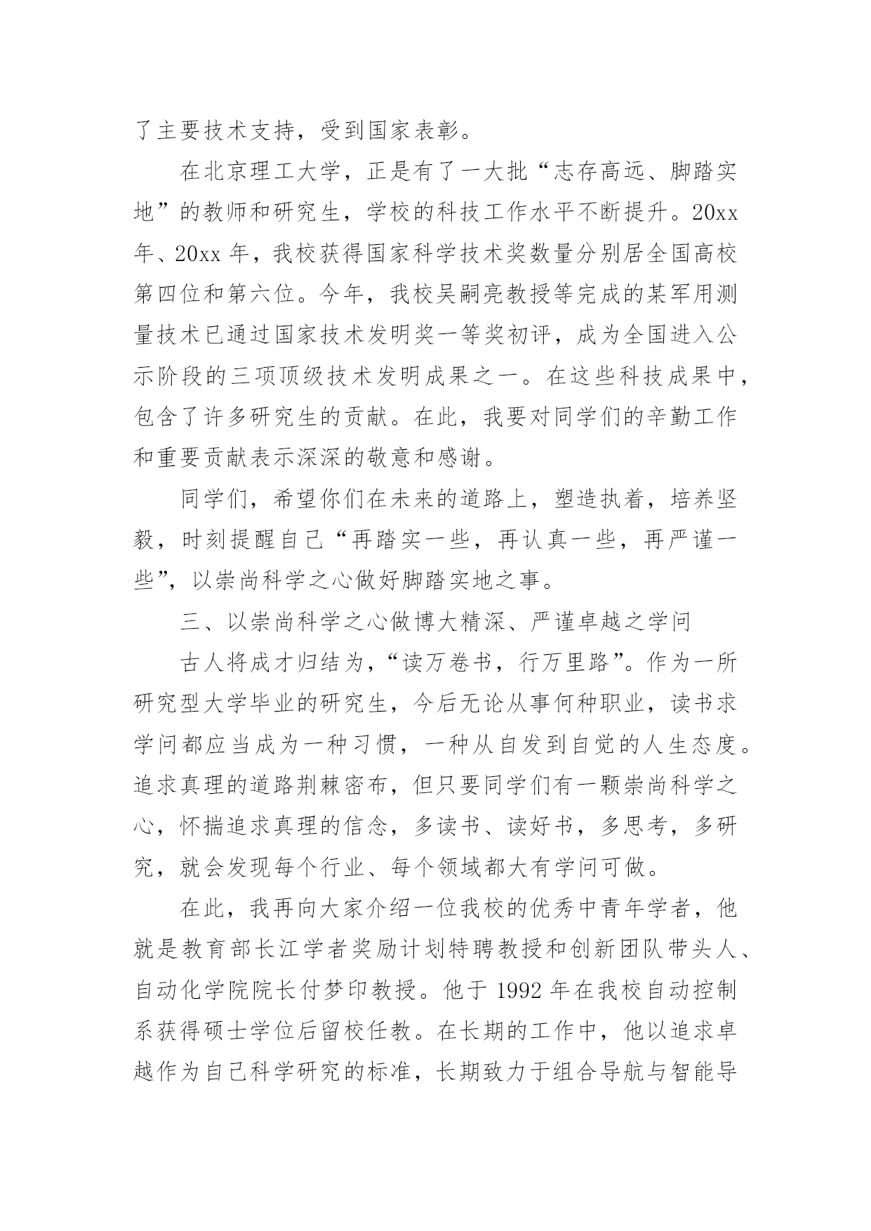 研究生毕业典礼讲话稿研究生毕业典礼讲话稿在不断进步的时代,各种讲话稿频频出现,讲话稿可以按照用途、性质等来划分,是演讲上一个重要的准备工作。还是对讲话稿一筹莫展吗?下面是小编为大家整理的研究生毕业典礼讲话稿,欢迎大家分享。研究生毕业典礼讲话稿篇1老师们,同学们:首先,我代表全校师生员工,祝贺20xx届研究生顺利完成学业并获得学位,祝贺你们即将踏上新的人生旅途!看到数百位身着学位服的优秀毕业生代表,我脑海中自然浮现出同学们怀揣崇尚科学之心,在追求科学的道路上付出的点点滴滴。我仿佛看到研究生教学楼的悠悠课堂,仿佛看到硕博公寓的点点星光,仿佛看到你们苦读的身影和从事研究的执着。由此,我深深感受到北理工学子追求科学、崇尚科学的强大力量!每年这个季节,校园中到处都有三五成群身着学位服合影留念的毕业生,我也多次被邀请加入到同学们的行列之中。由此,我感受到同学们对于母校的依依不舍,更感受到同学们收获科学探索成果后的喜悦。在同学们青春有志、满怀豪情,即将踏上新征途之际,作为校长和学长,我要深深地祝福每一位毕业研究生,并借此机会送上我的期望和祝福,这就是“用崇尚科学之心做人、做事、做学问,点亮精彩人生!”一、以崇尚科学之心做胸怀坦荡、光明磊落之人同学们绝大多数出生于上世纪80年代中期,人称80后。媒体对于80后有许多评论,热点往往集中或最后落脚到这代人的人生观和价值观,观点或褒或贬。作为一名大学校长和研究生家长,我经常接触80后。今天面对风华正茂、书生意气的同学们,我要肯定地说:“你们身上展现了独具魅力的朝气,展现了崇尚科学的精神,展现了中华民族未来的希望。80后的青年人不仅是幸福的`一代,还必将是成功的一代!”。你们在追求科学的日日夜夜中增长了知识,增添了强国富民的责任,增强了报效祖国的志向。可以说,追求科学之路使你们拥有崇尚科学之心,进而将塑造胸怀坦荡、光明磊落之人格。同学们应该引以为自豪的是,北理工的一代代杰出校友已经为我们树立了“欲做大事先做人”的榜样。在他们中,有李委员长,曾副主席,叶副主席等著名政治家;有我国第一艘核潜艇总设计师彭士禄院士等老一辈著名科学家和工程师,有我国第一部天基雷达总设计师吴一戎院士等杰出青年科技领军人才、企业家。他们胸怀坦荡、光明磊落,在不同工作岗位上成长为国家栋梁。刚才,我校杰出校友、北京大唐高鸿科技发展有限公司董事长刘雪峰为我们展示了其精彩的人生。刘雪峰于1998年在我校光学工程专业获硕士学位。他怀揣着崇尚科学之心,长期致力于数据网络通讯和it终端产品的研究和开发。凭借着过人的勤奋和优秀的人品,他带领团队将大唐高鸿科技打造成为目前国内it终端产品流通领域的领军企业。当代企业家有一个共识——“要做企业先做人”,并将是否有崇高的人格作为选人用人的第一标准。在此,我请同学们以刘雪峰等杰出校友为榜样,怀崇尚科学之心,揣凌云壮志理想,通过历练,做到像前辈般精彩。同学们,希望你们在未来的道路上,塑造品格,凝聚力量,以崇尚科学之心做胸怀坦荡、光明磊落的人,在各自的岗位上取得骄人的成绩,成长为国家栋梁。二、以崇尚科学之心做志存高远、脚踏实地之事在追求科学的道路上,所有北理工人始终牢记徐特立老院长的教诲:实事求是,不自以为是。七十载岁月峥嵘,延安精神薪火相传。延安精神作为我校的办学特色之一,其精髓是北理工人追求科学的力量之源。希望同学们秉承延安精神的优良传统,以崇尚科学之心不断历练求真务实、脚踏实地之风气,严于律己,认真做事。在此,我要向同学们介绍20xx年首都十大教育新闻人物、我校软件学院院长丁刚毅教授。他1993年在我校获博士学位并留校任教。在长期的教学和科研工作中,丁刚毅教授脚踏实地,认真做事。他率领团队成功组织建设了北京市重点交叉学科“数字表演与仿真技术”,成为国内该领域第一个省部级重点交叉学科。他带领团队发扬严谨求实的精神,克服无数困难,成功研制出“北京奥运会开闭幕式全景智能仿真编排系统”、“首都国庆60周年群众游行和联欢晚会数字仿真系统”,为这两次具有世界影响的国家重大活动提供了主要技术支持,受到国家表彰。在北京理工大学,正是有了一大批“志存高远、脚踏实地”的教师和研究生,学校的科技工作水平不断提升。20xx年、20xx年,我校获得国家科学技术奖数量分别居全国高校第四位和第六位。今年,我校吴嗣亮教授等完成的某军用测量技术已通过国家技术发明奖一等奖初评,成为全国进入公示阶段的三项顶级技术发明成果之一。在这些科技成果中,包含了许多研究生的贡献。在此,我要对同学们的辛勤工作和重要贡献表示深深的敬意和感谢。同学们,希望你们在未来的道路上,塑造执着,培养坚毅,时刻提醒自己“再踏实一些,再认真一些,再严谨一些”,以崇尚科学之心做好脚踏实地之事。三、以崇尚科学之心做博大精深、严谨卓越之学问古人将成才归结为,“读万卷书,行万
