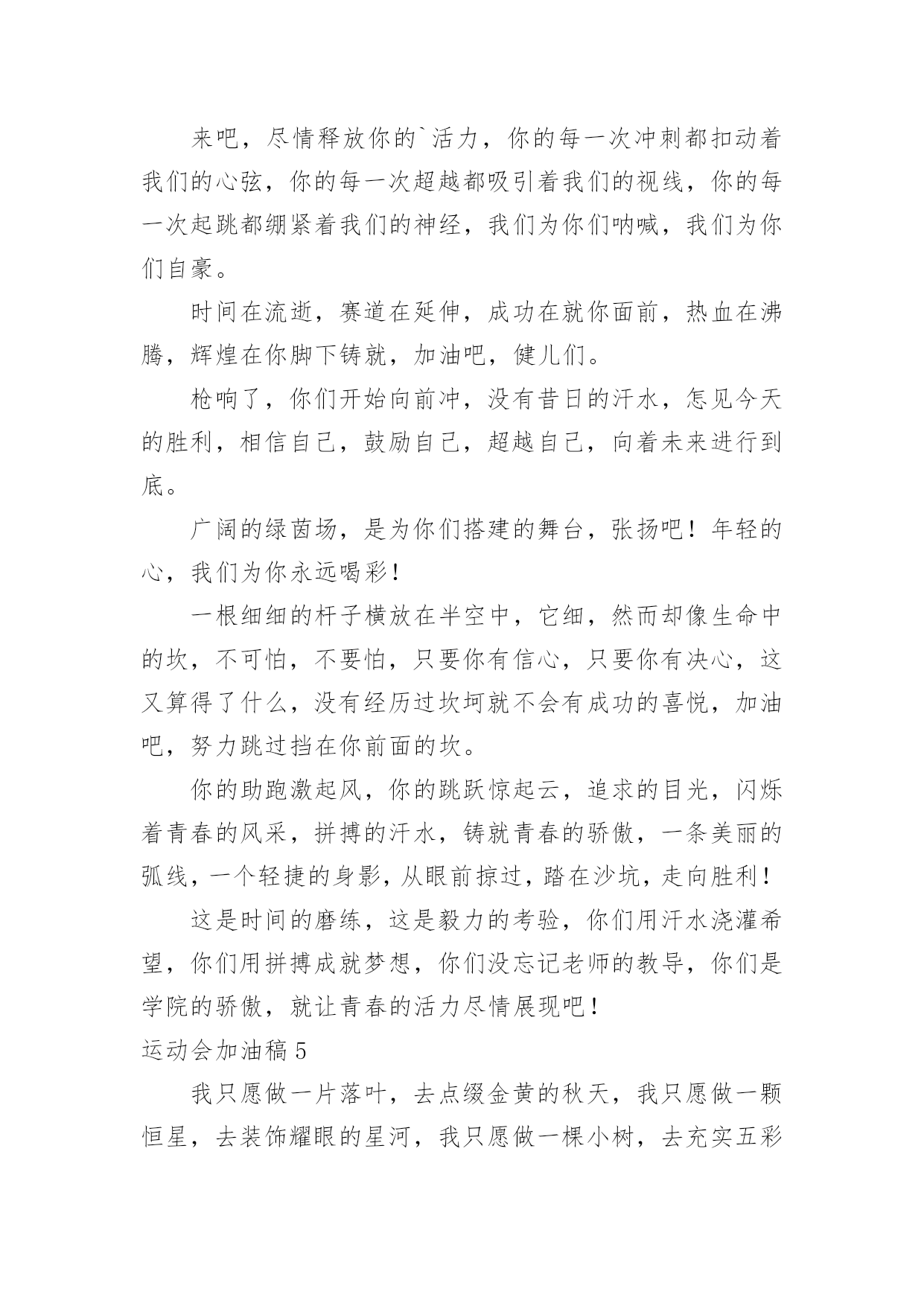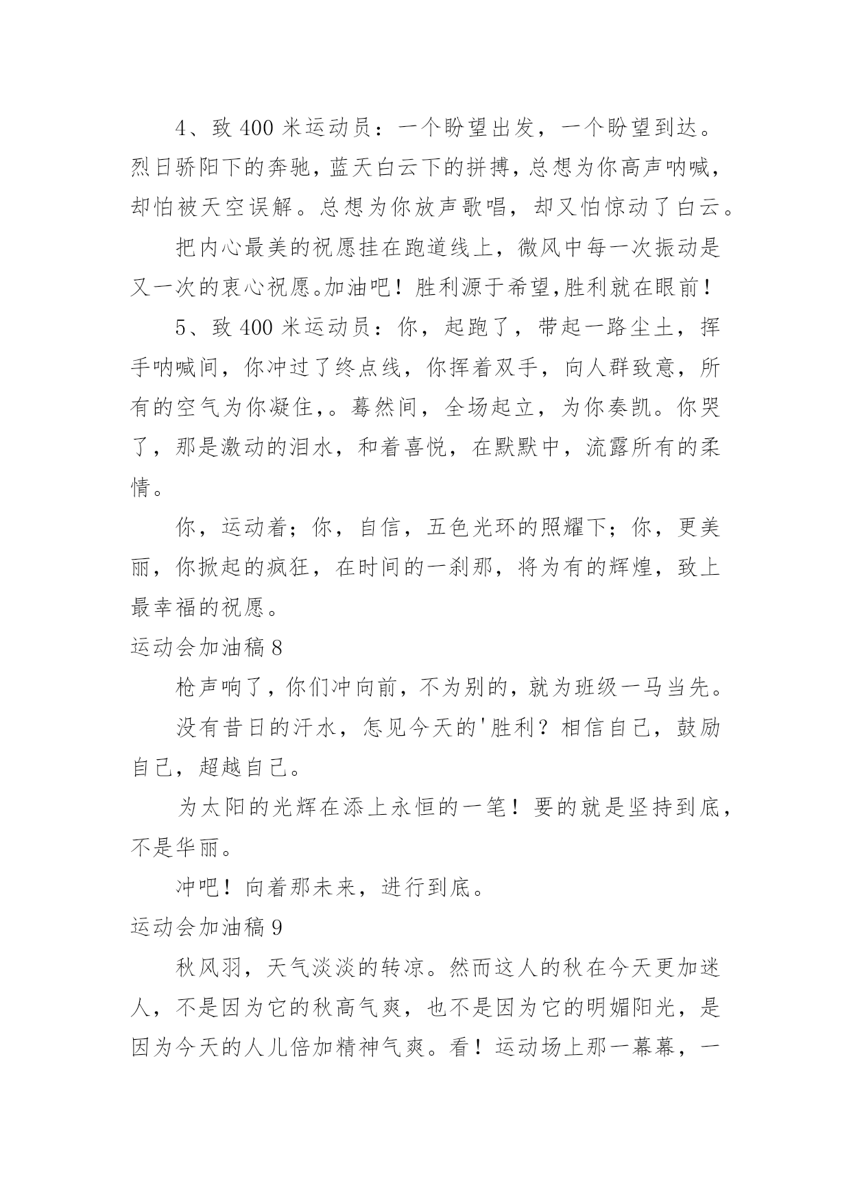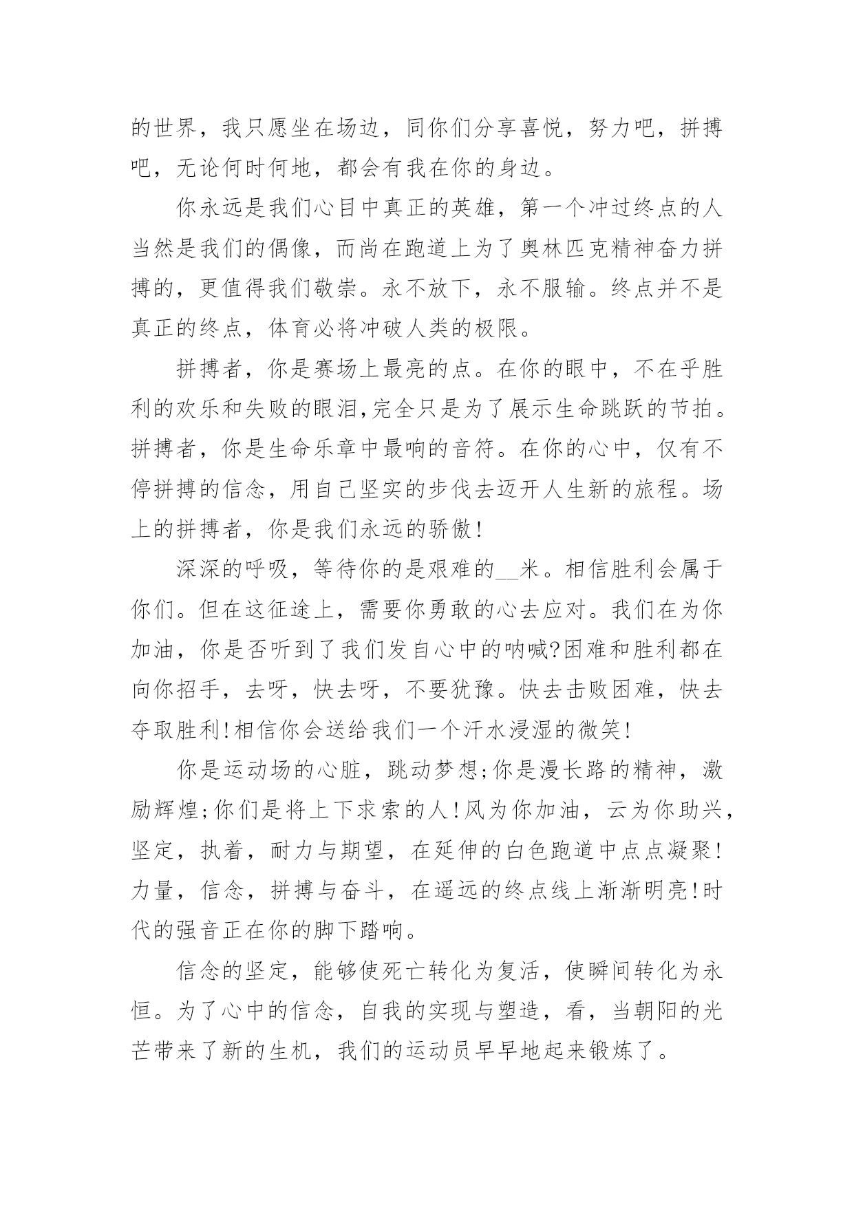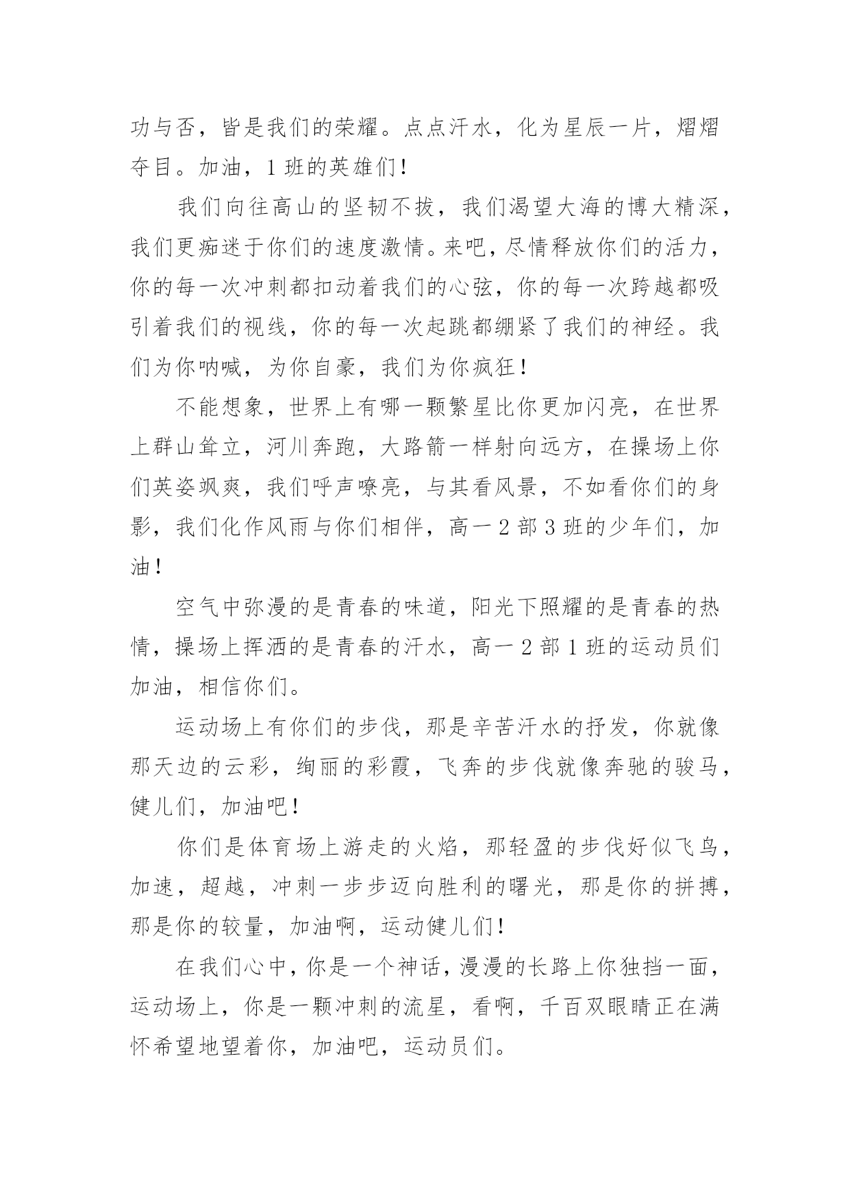 运动会加油稿运动会加油稿在不断进步的时代,需要使用加油稿的场合越来越多,加油稿可以起到活跃气氛的作用。那么问题来了,到底应如何写好一份加油稿呢?以下是小编为大家收集的运动会加油稿,仅供参考,欢迎大家阅读。运动会加油稿1拼搏者拼搏者,你是赛场上最亮的点。在你的眼中,不在乎胜利的欢乐和失败的眼泪,完全只是为了展示生命跳跃的节拍。拼搏者,你是生命乐章中最响的音符。在你的心中,只有不停拼搏的信念,用自己坚实的步伐去迈开人生新的旅程。场上的拼搏者,你是我们永远的骄傲!珍惜每一次每一次起跑,都充满了希望,每一次腾空,都迸发出力量。每一次成功,都书写着激昂。每一次失败,都孕育着成长。珍惜这每一次的喜悦和失落,珍惜这每一次的`感动和忧伤。让花季的心情挥洒万一片绮丽的彩霞,让青春的理想谱写出一段美妙的乐章。不要沉默不要沉默,不要卑怯的退缩;不要沉默,不要颓废的包裹;不要沉默,我们要拼搏,要在沉静中奋起,丢开羞涩,不要沉默!运动会加油稿2我们的运动会在今天开幕了我们初x(x)班,52个人,52个梦想即将在这里放飞我们热情,我们追求,我们执着,为的是在赛场上赛出好成绩在此,我要为我们不吝指教的'江悦同学加油,他坚持不懈,努力追求,热情执着是我们班的一颗最闪耀的星我还要为我们班的所有运动员加油!让我们为了我们的梦想,梦想执著追求吧!运动会加油稿3尊敬的老师、亲爱的同学们:今天,我们迎来了一年一度的运动会,这是一场展现我们体育精神和团队精神的盛宴。在这个充满竞争和机遇的时代,体育精神越来越被人们所重视,因为它代表着勇气、拼搏和坚持。比赛中,每一位参赛选手都在为我们学校的荣誉和声誉而奋斗。你们用汗水和努力,诠释了体育精神,展现了拼搏精神,让我们看到了无畏的勇气和不屈的毅力。我相信,每一位参赛选手都是勇敢的、坚强的、拼搏的。无论你在比赛中遇到什么困难和挫折,都要坚信自己,勇往直前。因为只有不断超越自己,才能成为更好的'自己,也才能成为最优秀的代表。在这个特别的日子里,让我们用热情和力量,为参赛选手加油打气。让我们共同见证运动员们的勇气和实力,感受体育精神的力量和魅力。最后,祝愿所有的参赛选手在比赛中取得好成绩,同时也希望所有的观众和支持者,能够用热烈的掌声和喝彩声,为我们的选手加油打气,为我们的学校加油助威!加油!加油!加油!运动会加油稿4四个完美的弧线,被一根小小的棒儿连接,这是人生的完美,这是运动的极限,莫要问他们为什么这样紧密团结,因为他们是情同手足的体育健儿。四月,生机勃勃的月份,我们也迎来了活力,运动场上轻盈的步伐,矫健的身姿,我们渴望着你们的胜利,期待着你们的纵身一跃,你们在运动场的上画出完美的弧线,好似猛虎跳闸,恰似虎跃深潭,跳吧,向着新的目标。年轻的你们自信飞扬,青春的气息如同初生的朝阳,磅礴的力量如同阳光,此时此刻,跑道便是你们精彩的舞台,声声加油,便是我们最高的奖项,加油吧,运动健儿们,冲刺吧,终点就在眼前。今天你们英姿飒爽,今天你们朝气蓬勃,今天你们一马当先,相信自己,你是最棒的,不要放弃,不要气馁,成功永远属于你们。漫漫长路,你一人独自挑战着体力与精神的极限,汗水喷涌而出,可脚步却从不停歇,好样的,你定会赢得最后的掌声。200米只刹那一瞬间,却成就一段永恒的胜利,200米只弯过一个转折,却折出多少汗水,冲向你那辉煌的胜利吧,胜利在向你招手。赛场上你们叱咤风云,挥汗如雨,看台上喊声震天,呐喊中饱含着期望,期望成功,期望胜利,奋斗吧,拼搏吧,跑出你的自信,跑出你的实力,跑出你的胜利山颠。心中坚定的信念,脚下沉稳的步伐,你用行动告诉我们一个不变之理,没有走不完的路,没有过不了的山,成功就在终点冲着你高高招手,你用顽强的意志去努力迎接终点的鲜花与掌声,相信成功一定属于你。即使身处深秋,你身上的光芒迸发着,感染着周围的我们,飞奔、呐喊、狂呼、掌声……白日不到处,青春恰自来,掌声送给七班的运动健儿们!一声枪响,十人出鞘;16接力,百米赛跑;挥洒汗水,恣意青春;谁是冠军?皆你与我。汗水、泪水,笑声、歌声,我们尽情挥洒。开幕式上,运动场上,我们尽情展现,多么艰辛,多么困苦,我们勇敢承担。因为年轻,因为张扬,因为我们知道,用今天的汗水换来明天的微笑!才智既出谓之英,勇气过人谓之雄。加油,英雄们!成功与否,皆是我们的荣耀。点点汗水,化为星辰一片,熠熠夺目。加油,1班的英雄们!我们向往高山的坚韧不拔,我们渴望大海的博大精深,我们更痴迷于你们的速度激情。来吧,尽情释放你们的活力,你的每一次冲刺都扣动着我们的心弦,你的每一次跨越都吸引着我们的视线,你的每一次起跳都绷紧了我们的神经。我们为你呐喊,为你自豪,我们为你疯狂!不能想象,世界上有哪一颗繁星比你更加闪亮,在世界上群山耸立,河川奔跑,大路箭一样射向远方,在操场上你们英姿飒爽,我们呼声嘹亮,与其看风景,