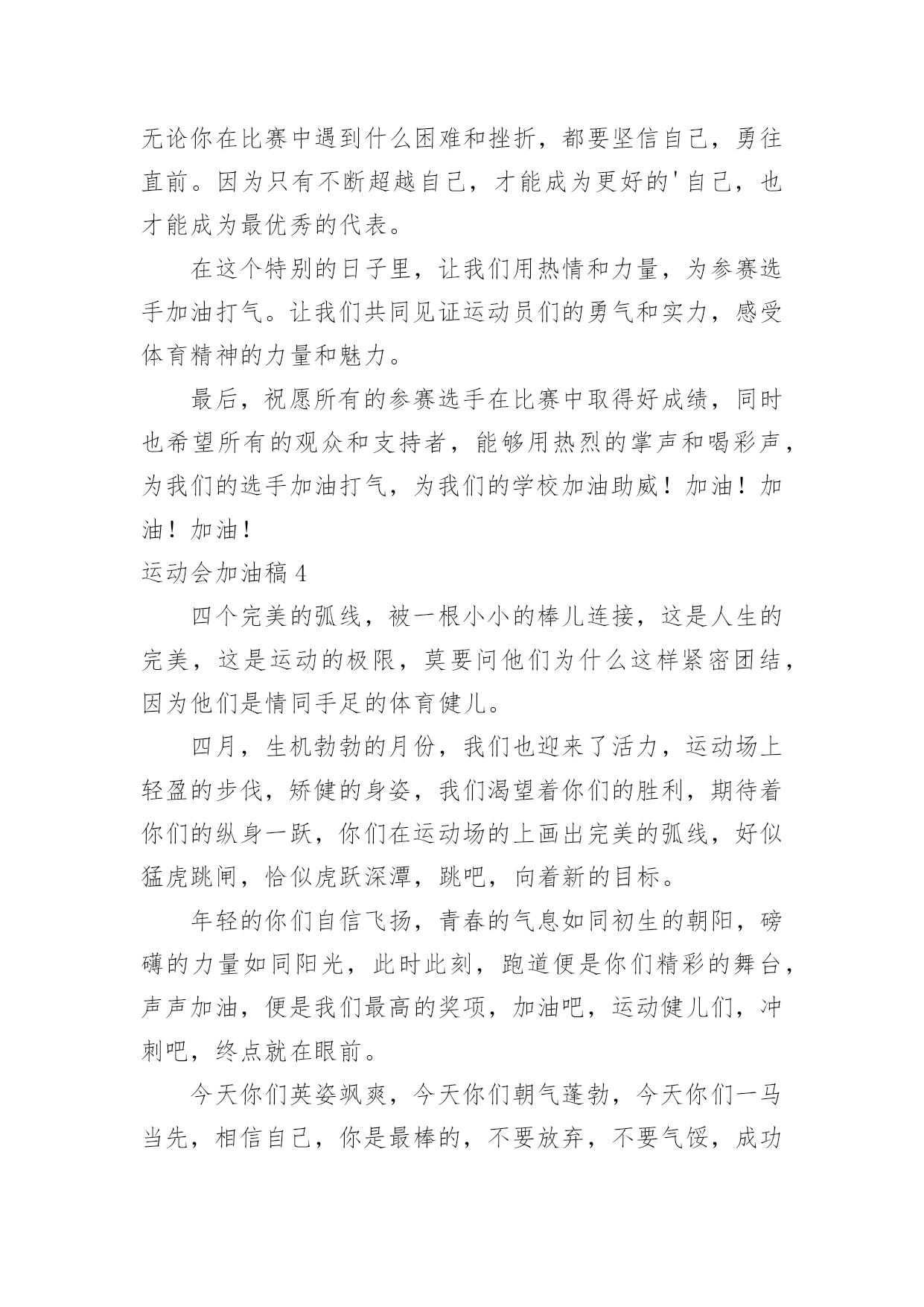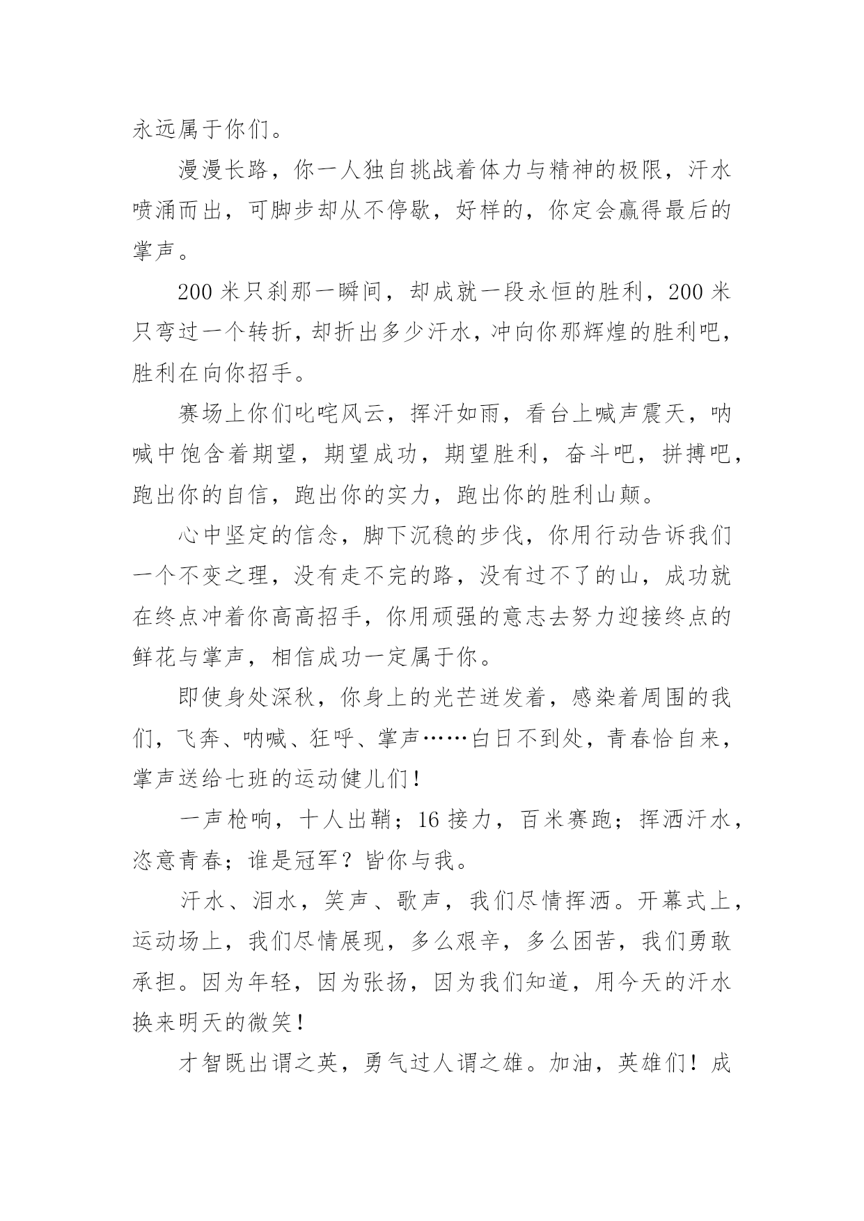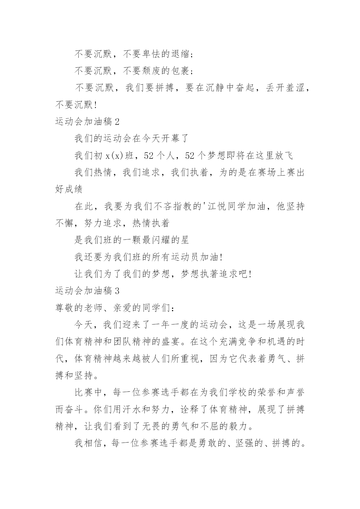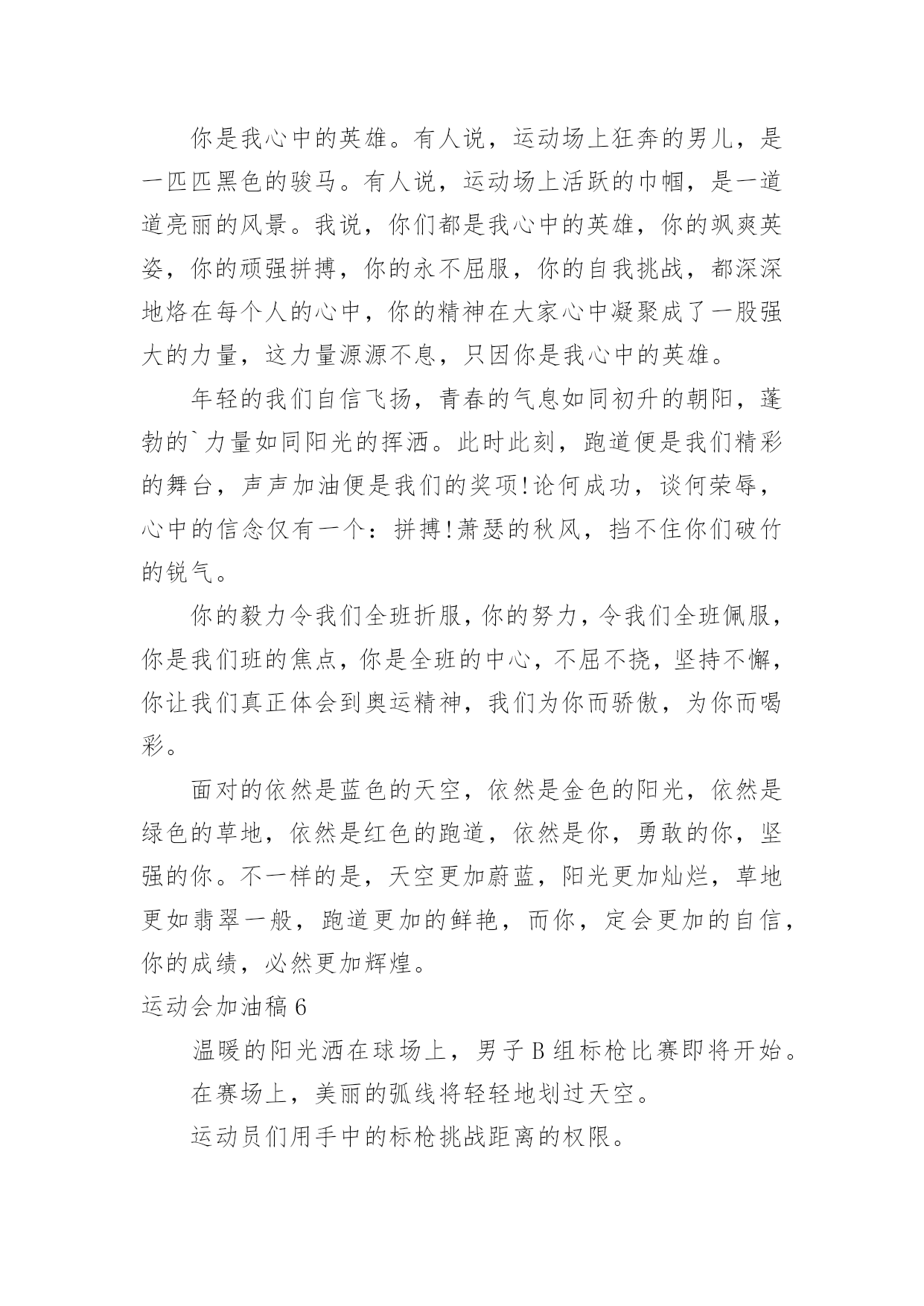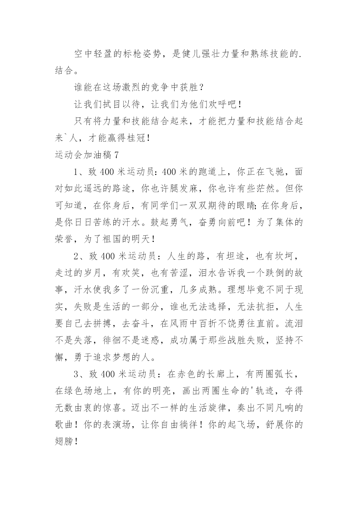 运动会加油稿运动会加油稿在不断进步的时代,需要使用加油稿的场合越来越多,加油稿可以起到活跃气氛的作用。那么问题来了,到底应如何写好一份加油稿呢?以下是小编为大家收集的运动会加油稿,仅供参考,欢迎大家阅读。运动会加油稿1拼搏者拼搏者,你是赛场上最亮的点。在你的眼中,不在乎胜利的欢乐和失败的眼泪,完全只是为了展示生命跳跃的节拍。拼搏者,你是生命乐章中最响的音符。在你的心中,只有不停拼搏的信念,用自己坚实的步伐去迈开人生新的旅程。场上的拼搏者,你是我们永远的骄傲!珍惜每一次每一次起跑,都充满了希望,每一次腾空,都迸发出力量。每一次成功,都书写着激昂。每一次失败,都孕育着成长。珍惜这每一次的喜悦和失落,珍惜这每一次的`感动和忧伤。让花季的心情挥洒万一片绮丽的彩霞,让青春的理想谱写出一段美妙的乐章。不要沉默不要沉默,不要卑怯的退缩;不要沉默,不要颓废的包裹;不要沉默,我们要拼搏,要在沉静中奋起,丢开羞涩,不要沉默!运动会加油稿2我们的运动会在今天开幕了我们初x(x)班,52个人,52个梦想即将在这里放飞我们热情,我们追求,我们执着,为的是在赛场上赛出好成绩在此,我要为我们不吝指教的'江悦同学加油,他坚持不懈,努力追求,热情执着是我们班的一颗最闪耀的星我还要为我们班的所有运动员加油!让我们为了我们的梦想,梦想执著追求吧!运动会加油稿3尊敬的老师、亲爱的同学们:今天,我们迎来了一年一度的运动会,这是一场展现我们体育精神和团队精神的盛宴。在这个充满竞争和机遇的时代,体育精神越来越被人们所重视,因为它代表着勇气、拼搏和坚持。比赛中,每一位参赛选手都在为我们学校的荣誉和声誉而奋斗。你们用汗水和努力,诠释了体育精神,展现了拼搏精神,让我们看到了无畏的勇气和不屈的毅力。我相信,每一位参赛选手都是勇敢的、坚强的、拼搏的。无论你在比赛中遇到什么困难和挫折,都要坚信自己,勇往直前。因为只有不断超越自己,才能成为更好的'自己,也才能成为最优秀的代表。在这个特别的日子里,让我们用热情和力量,为参赛选手加油打气。让我们共同见证运动员们的勇气和实力,感受体育精神的力量和魅力。最后,祝愿所有的参赛选手在比赛中取得好成绩,同时也希望所有的观众和支持者,能够用热烈的掌声和喝彩声,为我们的选手加油打气,为我们的学校加油助威!加油!加油!加油!运动会加油稿4四个完美的弧线,被一根小小的棒儿连接,这是人生的完美,这是运动的极限,莫要问他们为什么这样紧密团结,因为他们是情同手足的体育健儿。四月,生机勃勃的月份,我们也迎来了活力,运动场上轻盈的步伐,矫健的身姿,我们渴望着你们的胜利,期待着你们的纵身一跃,你们在运动场的上画出完美的弧线,好似猛虎跳闸,恰似虎跃深潭,跳吧,向着新的目标。年轻的你们自信飞扬,青春的气息如同初生的朝阳,磅礴的力量如同阳光,此时此刻,跑道便是你们精彩的舞台,声声加油,便是我们最高的奖项,加油吧,运动健儿们,冲刺吧,终点就在眼前。今天你们英姿飒爽,今天你们朝气蓬勃,今天你们一马当先,相信自己,你是最棒的,不要放弃,不要气馁,成功永远属于你们。漫漫长路,你一人独自挑战着体力与精神的极限,汗水喷涌而出,可脚步却从不停歇,好样的,你定会赢得最后的掌声。200米只刹那一瞬间,却成就一段永恒的胜利,200米只弯过一个转折,却折出多少汗水,冲向你那辉煌的胜利吧,胜利在向你招手。赛场上你们叱咤风云,挥汗如雨,看台上喊声震天,呐喊中饱含着期望,期望成功,期望胜利,奋斗吧,拼搏吧,跑出你的自信,跑出你的实力,跑出你的胜利山颠。心中坚定的信念,脚下沉稳的步伐,你用行动告诉我们一个不变之理,没有走不完的路,没有过不了的山,成功就在终点冲着你高高招手,你用顽强的意志去努力迎接终点的鲜花与掌声,相信成功一定属于你。即使身处深秋,你身上的光芒迸发着,感染着周围的我们,飞奔、呐喊、狂呼、掌声……白日不到处,青春恰自来,掌声送给七班的运动健儿们!一声枪响,十人出鞘;16接力,百米赛跑;挥洒汗水,恣意青春;谁是冠军?皆你与我。汗水、泪水,笑声、歌声,我们尽情挥洒。开幕式上,运动场上,我们尽情展现,多么艰辛,多么困苦,我们勇敢承担。因为年轻,因为张扬,因为我们知道,用今天的汗水换来明天的微笑!才智既出谓之英,勇气过人谓之雄。加油,英雄们!成功与否,皆是我们的荣耀。点点汗水,化为星辰一片,熠熠夺目。加油,1班的英雄们!我们向往高山的坚韧不拔,我们渴望大海的博大精深,我们更痴迷于你们的速度激情。来吧,尽情释放你们的活力,你的每一次冲刺都扣动着我们的心弦,你的每一次跨越都吸引着我们的视线,你的每一次起跳都绷紧了我们的神经。我们为你呐喊,为你自豪,我们为你疯狂!不能想象,世界上有哪一颗繁星比你更加闪亮,在世界上群山耸立,河川奔跑,大路箭一样射向远方,在操场上你们英姿飒爽,我们呼声嘹亮,与其看风景,