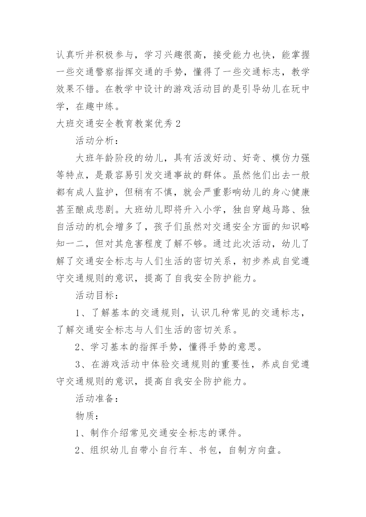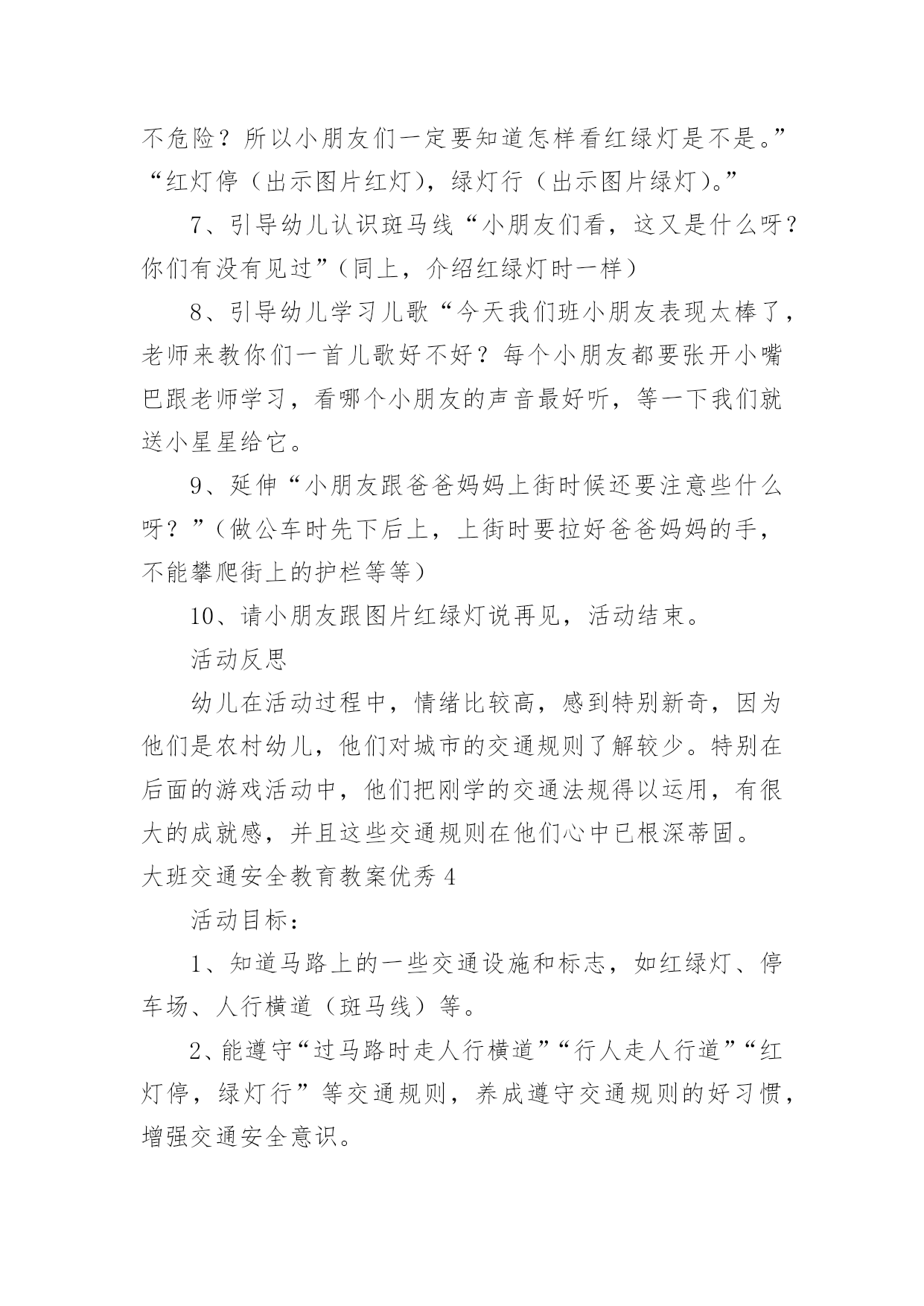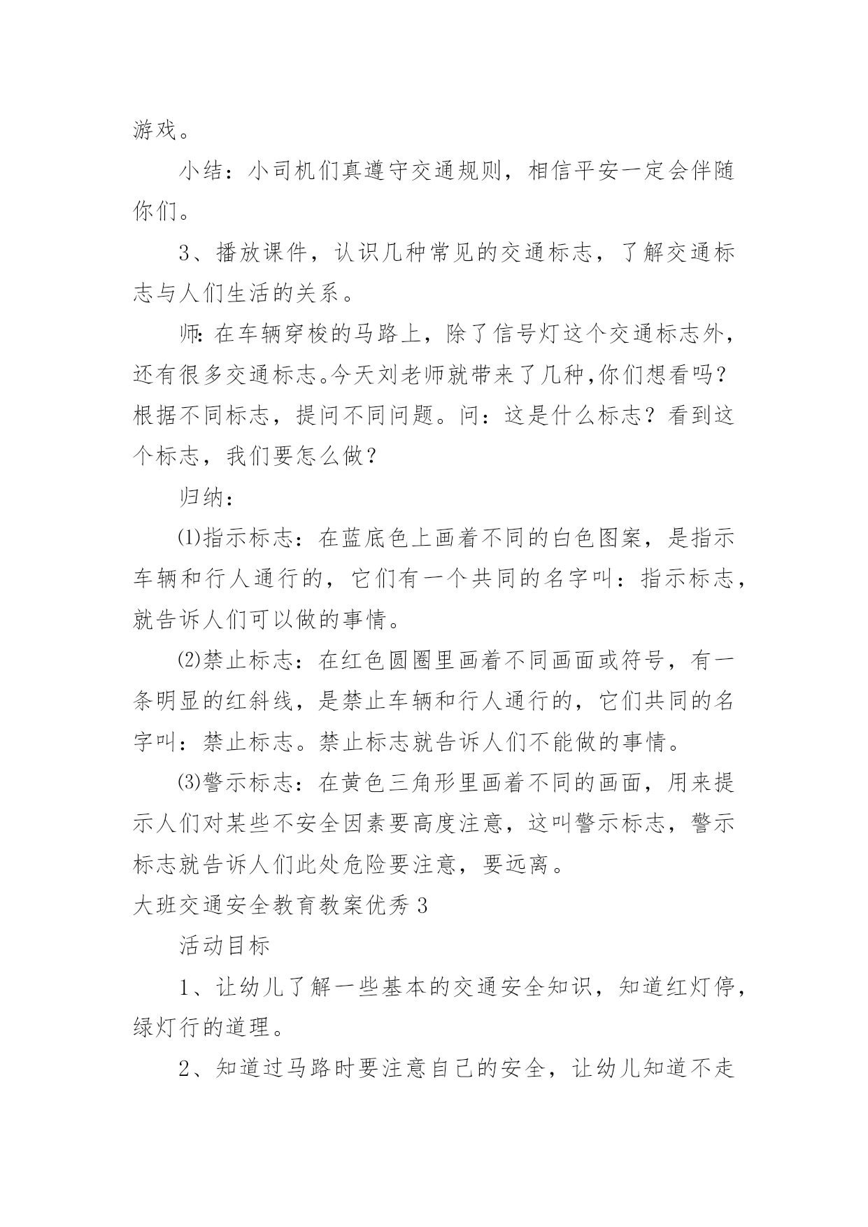 大班交通安全教育教案优秀大班交通安全教育教案优秀作为一名人民教师,编写教案是必不可少的,借助教案可以恰当地选择和运用教学方法,调动学生学习的积极性。那么写教案需要注意哪些问题呢?以下是小编精心整理的大班交通安全教育教案优秀,希望能够帮助到大家。大班交通安全教育教案优秀1活动设计背景交通安全很重要,我们时刻都不可忽视。本次活动主要是讲有关交通方面的知识,遵守交通规则要从幼儿抓起。让幼儿懂得交通警察在马路上指挥交通时所做的手势,并让他们学习一些简单的指挥交通的动作手势和交通标志,使幼儿明白遵守交通规则对交通顺畅和保障生命安全的意义。活动目标1、了解一些常见的交通指挥手势。2、认识一些交通标志。3、培养幼儿自觉遵守交通规则。4、激发对交通警察的尊敬和爱戴之情。5、遵守交通行为规则,不做“禁止”的事。教学重点、难点重点是学习一些常见的交通指挥手势和标志。难点是让幼儿自觉遵守交通规则。活动准备1、交通警察指挥交通的图片。2、一些交通标志如斑马线,人行横道,禁止行人通行,左转右转等。3、警帽,哨子。活动过程1、组织幼儿观看交通警察指挥交通的图片并让幼儿说说交通警察在马路上指挥交通时都做了哪些手势。指导幼儿学习一些简单的指挥交通的动作和手势。如左转右转,停止,直行等。2、启发幼儿说说日常生活当中在马路上如果没有交通警察会发生什么事?3、出示图片帮助幼儿认识人行道,禁止行人通行,左转右转等交通标志。4、引导幼儿回忆在街上见到的不遵守交通规则的行为或交通事故,讨论在街上应该怎样走,怎样过马路,乘车时怎样做才能保证安全。5、游戏,带幼儿到操场上,教师画出十字路口路线,让幼儿扮演交通警察指挥交通,其他幼儿模仿司机开车的.动作,在马路上行驶,按交通警察的哨声和手势停止,左转,右转,直行等。然后再轮流交替扮演做游戏。教学反思本人组织这次活动比较接近日常生活,所以孩子们都很认真听并积极参与,学习兴趣很高,接受能力也快,能掌握一些交通警察指挥交通的手势,懂得了一些交通标志,教学效果不错。在教学中设计的游戏活动目的是引导幼儿在玩中学,在趣中练。大班交通安全教育教案优秀2活动分析:大班年龄阶段的幼儿,具有活泼好动、好奇、模仿力强等特点,是最容易引发交通事故的群体。虽然他们出去一般都有成人监护,但稍有不慎,就会严重影响幼儿的身心健康甚至酿成悲剧。大班幼儿即将升入小学,独自穿越马路、独自活动的机会增多了,孩子们虽然对交通安全方面的知识略知一二,但对其危害程度了解不够。通过此次活动,幼儿了解了交通安全标志与人们生活的密切关系,初步养成自觉遵守交通规则的意识,提高了自我安全防护能力。活动目标:1、了解基本的交通规则,认识几种常见的交通标志,了解交通安全标志与人们生活的密切关系。2、学习基本的指挥手势,懂得手势的意思。3、在游戏活动中体验交通规则的重要性,养成自觉遵守交通规则的意识,提高自我安全防护能力。活动准备:物质:1、制作介绍常见交通安全标志的课件。2、组织幼儿自带小自行车、书包,自制方向盘。3、将场地布置成马路十字路口的样子,停车场标志、自行车标志。4、与交警联系好,邀请前来讲解。5、音乐磁带,多媒体设备(搜索flash动画)。心理:观察马路上的交通标志。活动过程:一、导入创设情景,引起幼儿的兴趣。师:小朋友你们看,这里有斑马线、栏杆,这里象什么地方?(马路)我们就来看马路上发生了什么事情?看谁看得最仔细。二、展开(一)观看情景表演,引起幼儿思考(注意提醒:又发生了一件事情)(表演内容:a、一名汽车司机车速较快,撞伤了横穿马路的小学生;b、一名行人看到交警不在,翻越栏杆横过马路。)问:"刚才你看到了什么?""是什么原因造成了危险事情的发生?""你想对他们说什么?"小结:多么危险可怕的事情,为了我们的生命安全,我们一定要遵守交通规则。(二)认识信号灯标识及几种常见交通标志1、认识信号灯,说说信号灯的作用。师:在生活中,很多马路上都有信号灯,信号灯有几种颜色?它告诉我们什么?(红灯停、绿灯行、黄灯亮了等一等)2、模拟游戏,体验信号灯在交通中的作用。师:我们来个做游戏,《遵守规则的'小司机》。男孩扮演小司机,女孩扮演小学生,看信号过马路。交换角色再次游戏。小结:小司机们真遵守交通规则,相信平安一定会伴随你们。3、播放课件,认识几种常见的交通标志,了解交通标志与人们生活的关系。师:在车辆穿梭的马路上,除了信号灯这个交通标志外,还有很多交通标志。今天刘老师就带来了几种,你们想看吗?根据不同标志,提问不同问题。问:这是什么标志?看到这个标志,我们要怎么做?归纳:⑴指示标志:在蓝底色上画着不同的白色图案,是指示车辆和行人通行的,它们有一个共同的名字叫:指示标志,就告诉人们可以做的事情。⑵禁止标志:在红色圆圈里画着不同画面或符号,有一条明显的红斜线,是禁止车辆和行人通行的,