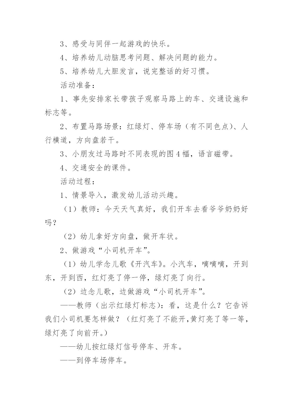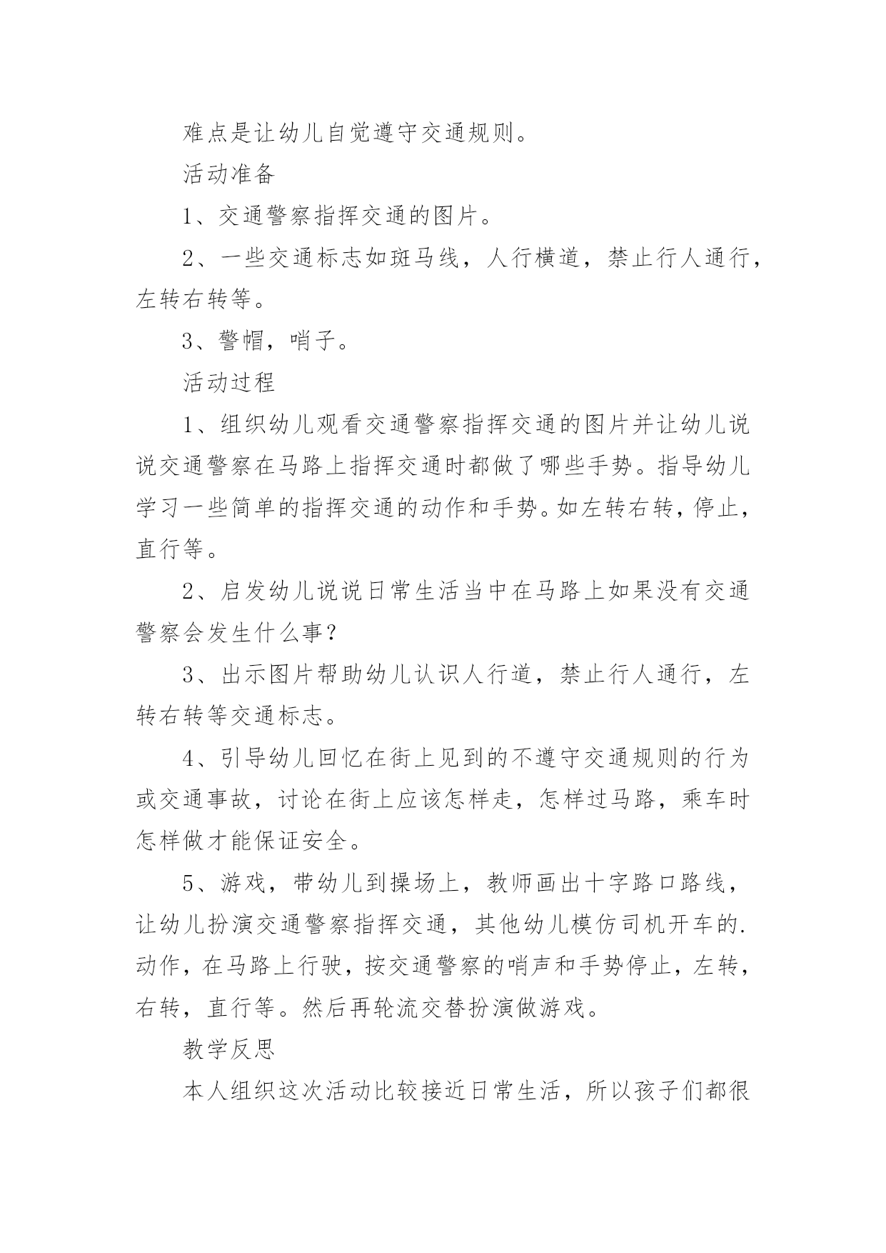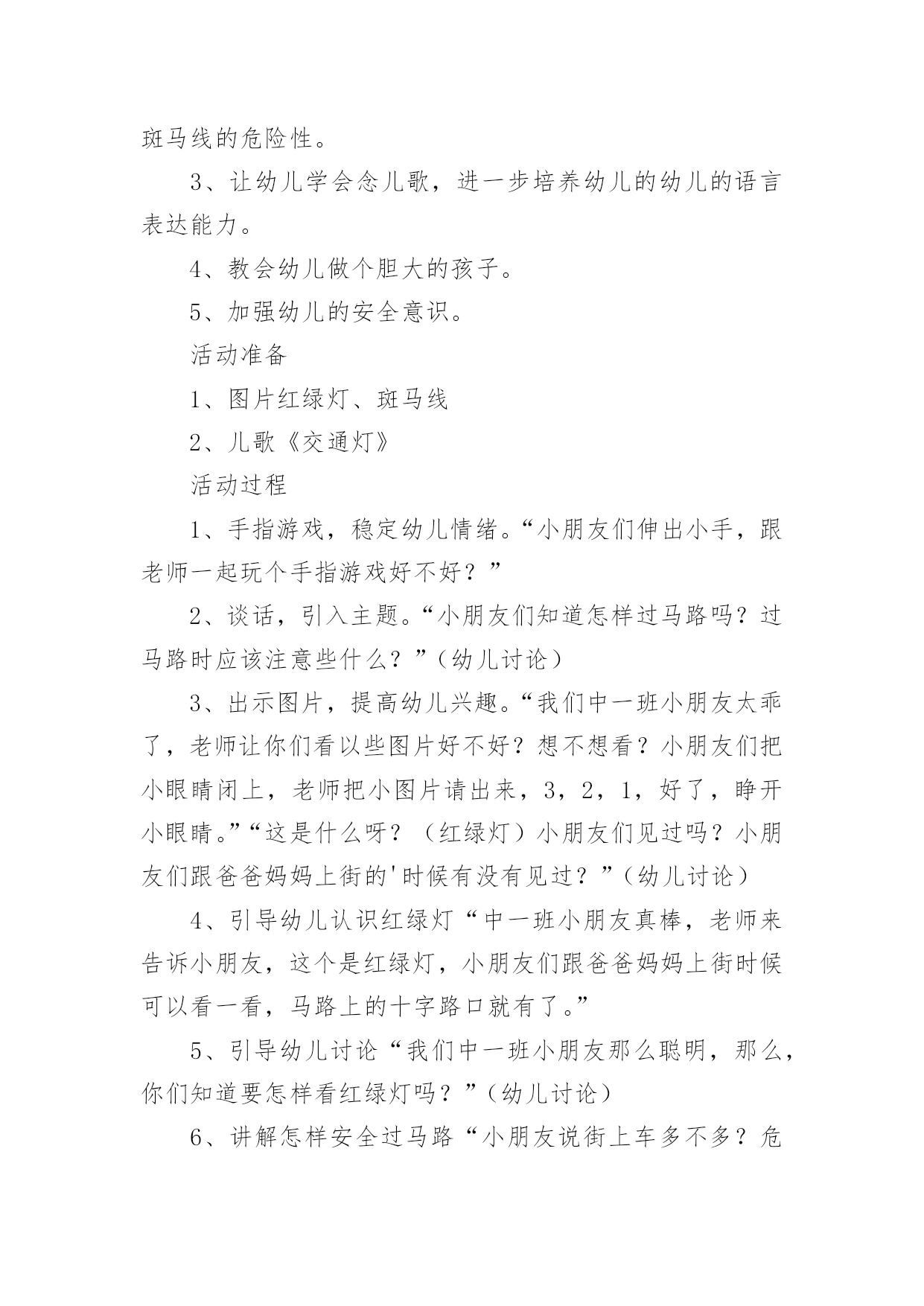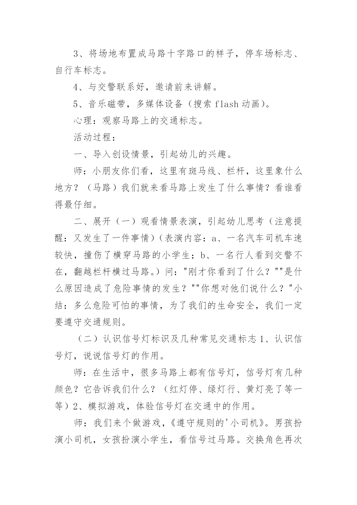 大班交通安全教育教案优秀大班交通安全教育教案优秀作为一名人民教师,编写教案是必不可少的,借助教案可以恰当地选择和运用教学方法,调动学生学习的积极性。那么写教案需要注意哪些问题呢?以下是小编精心整理的大班交通安全教育教案优秀,希望能够帮助到大家。大班交通安全教育教案优秀1活动设计背景交通安全很重要,我们时刻都不可忽视。本次活动主要是讲有关交通方面的知识,遵守交通规则要从幼儿抓起。让幼儿懂得交通警察在马路上指挥交通时所做的手势,并让他们学习一些简单的指挥交通的动作手势和交通标志,使幼儿明白遵守交通规则对交通顺畅和保障生命安全的意义。活动目标1、了解一些常见的交通指挥手势。2、认识一些交通标志。3、培养幼儿自觉遵守交通规则。4、激发对交通警察的尊敬和爱戴之情。5、遵守交通行为规则,不做“禁止”的事。教学重点、难点重点是学习一些常见的交通指挥手势和标志。难点是让幼儿自觉遵守交通规则。活动准备1、交通警察指挥交通的图片。2、一些交通标志如斑马线,人行横道,禁止行人通行,左转右转等。3、警帽,哨子。活动过程1、组织幼儿观看交通警察指挥交通的图片并让幼儿说说交通警察在马路上指挥交通时都做了哪些手势。指导幼儿学习一些简单的指挥交通的动作和手势。如左转右转,停止,直行等。2、启发幼儿说说日常生活当中在马路上如果没有交通警察会发生什么事?3、出示图片帮助幼儿认识人行道,禁止行人通行,左转右转等交通标志。4、引导幼儿回忆在街上见到的不遵守交通规则的行为或交通事故,讨论在街上应该怎样走,怎样过马路,乘车时怎样做才能保证安全。5、游戏,带幼儿到操场上,教师画出十字路口路线,让幼儿扮演交通警察指挥交通,其他幼儿模仿司机开车的.动作,在马路上行驶,按交通警察的哨声和手势停止,左转,右转,直行等。然后再轮流交替扮演做游戏。教学反思本人组织这次活动比较接近日常生活,所以孩子们都很认真听并积极参与,学习兴趣很高,接受能力也快,能掌握一些交通警察指挥交通的手势,懂得了一些交通标志,教学效果不错。在教学中设计的游戏活动目的是引导幼儿在玩中学,在趣中练。大班交通安全教育教案优秀2活动分析:大班年龄阶段的幼儿,具有活泼好动、好奇、模仿力强等特点,是最容易引发交通事故的群体。虽然他们出去一般都有成人监护,但稍有不慎,就会严重影响幼儿的身心健康甚至酿成悲剧。大班幼儿即将升入小学,独自穿越马路、独自活动的机会增多了,孩子们虽然对交通安全方面的知识略知一二,但对其危害程度了解不够。通过此次活动,幼儿了解了交通安全标志与人们生活的密切关系,初步养成自觉遵守交通规则的意识,提高了自我安全防护能力。活动目标:1、了解基本的交通规则,认识几种常见的交通标志,了解交通安全标志与人们生活的密切关系。2、学习基本的指挥手势,懂得手势的意思。3、在游戏活动中体验交通规则的重要性,养成自觉遵守交通规则的意识,提高自我安全防护能力。活动准备:物质:1、制作介绍常见交通安全标志的课件。2、组织幼儿自带小自行车、书包,自制方向盘。3、将场地布置成马路十字路口的样子,停车场标志、自行车标志。4、与交警联系好,邀请前来讲解。5、音乐磁带,多媒体设备(搜索flash动画)。心理:观察马路上的交通标志。活动过程:一、导入创设情景,引起幼儿的兴趣。师:小朋友你们看,这里有斑马线、栏杆,这里象什么地方?(马路)我们就来看马路上发生了什么事情?看谁看得最仔细。二、展开(一)观看情景表演,引起幼儿思考(注意提醒:又发生了一件事情)(表演内容:a、一名汽车司机车速较快,撞伤了横穿马路的小学生;b、一名行人看到交警不在,翻越栏杆横过马路。)问:"刚才你看到了什么?""是什么原因造成了危险事情的发生?""你想对他们说什么?"小结:多么危险可怕的事情,为了我们的生命安全,我们一定要遵守交通规则。(二)认识信号灯标识及几种常见交通标志1、认识信号灯,说说信号灯的作用。师:在生活中,很多马路上都有信号灯,信号灯有几种颜色?它告诉我们什么?(红灯停、绿灯行、黄灯亮了等一等)2、模拟游戏,体验信号灯在交通中的作用。师:我们来个做游戏,《遵守规则的'小司机》。男孩扮演小司机,女孩扮演小学生,看信号过马路。交换角色再次游戏。小结:小司机们真遵守交通规则,相信平安一定会伴随你们。3、播放课件,认识几种常见的交通标志,了解交通标志与人们生活的关系。师:在车辆穿梭的马路上,除了信号灯这个交通标志外,还有很多交通标志。今天刘老师就带来了几种,你们想看吗?根据不同标志,提问不同问题。问:这是什么标志?看到这个标志,我们要怎么做?归纳:⑴指示标志:在蓝底色上画着不同的白色图案,是指示车辆和行人通行的,它们有一个共同的名字叫:指示标志,就告诉人们可以做的事情。⑵禁止标志:在红色圆圈里画着不同画面或符号,有一条明显的红斜线,是禁止车辆和行人通行的,