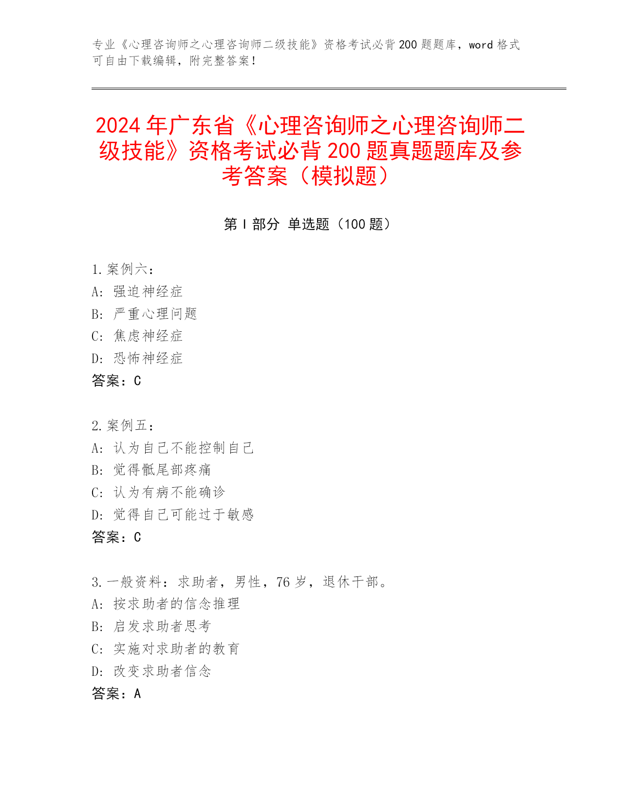 2024年广东省《心理咨询师之心理咨询师二级技能》资格考试必背200题真题题库及参考答案(模拟题)