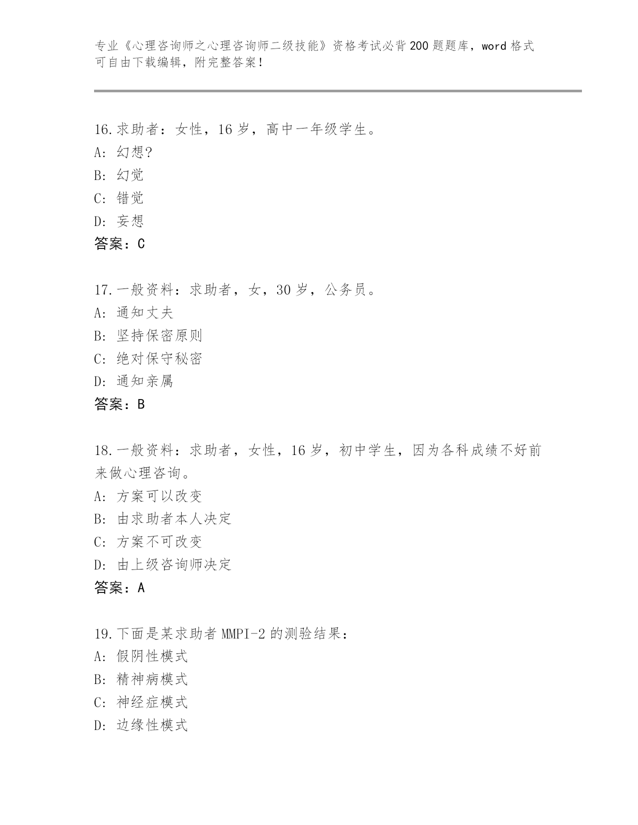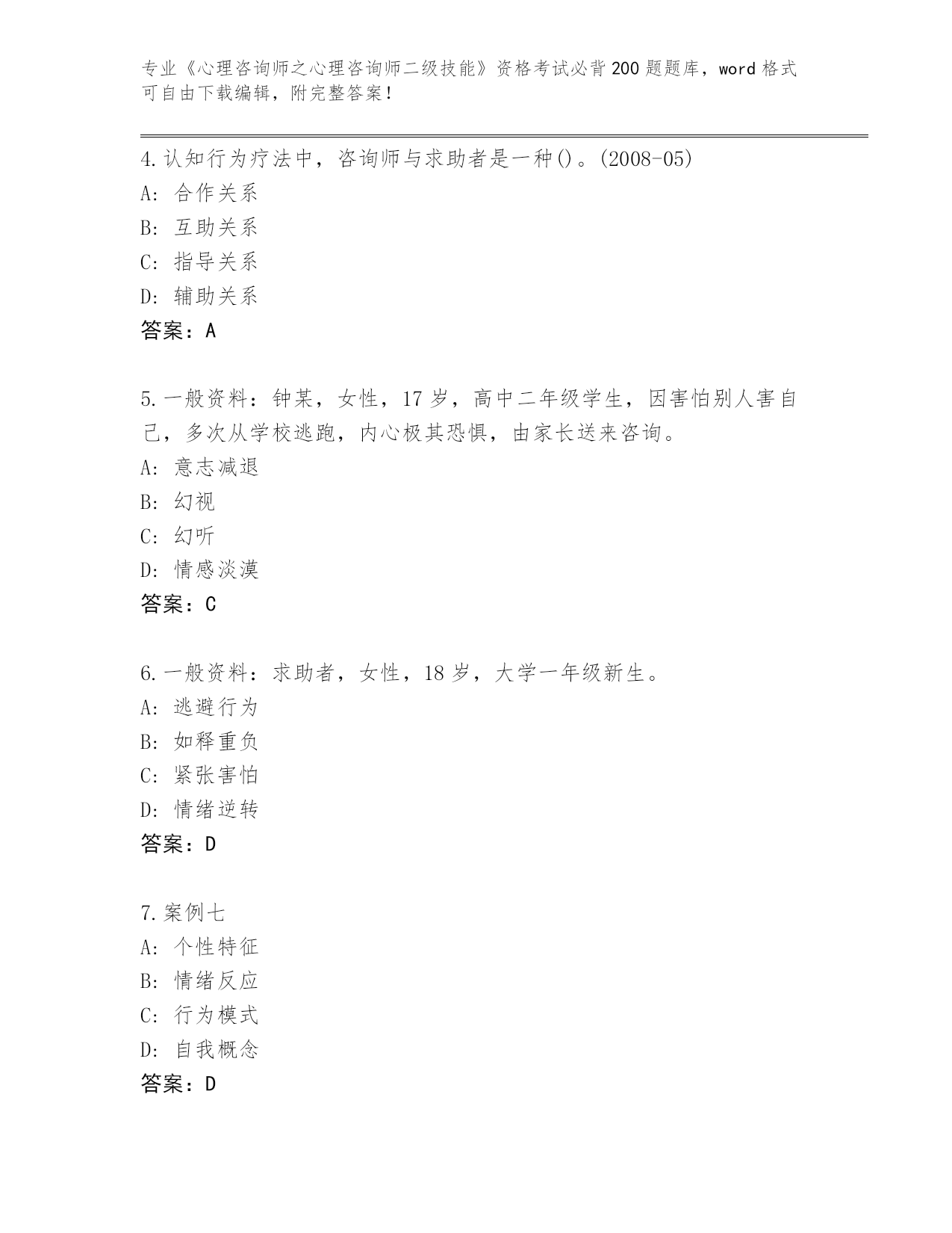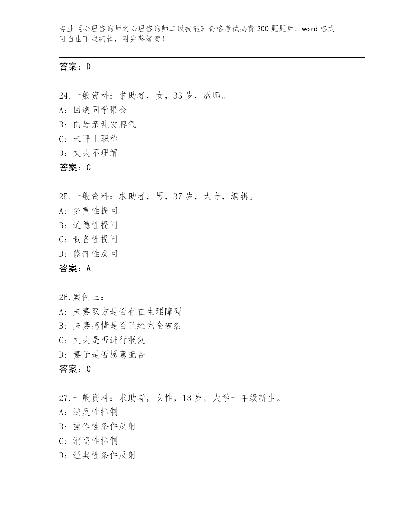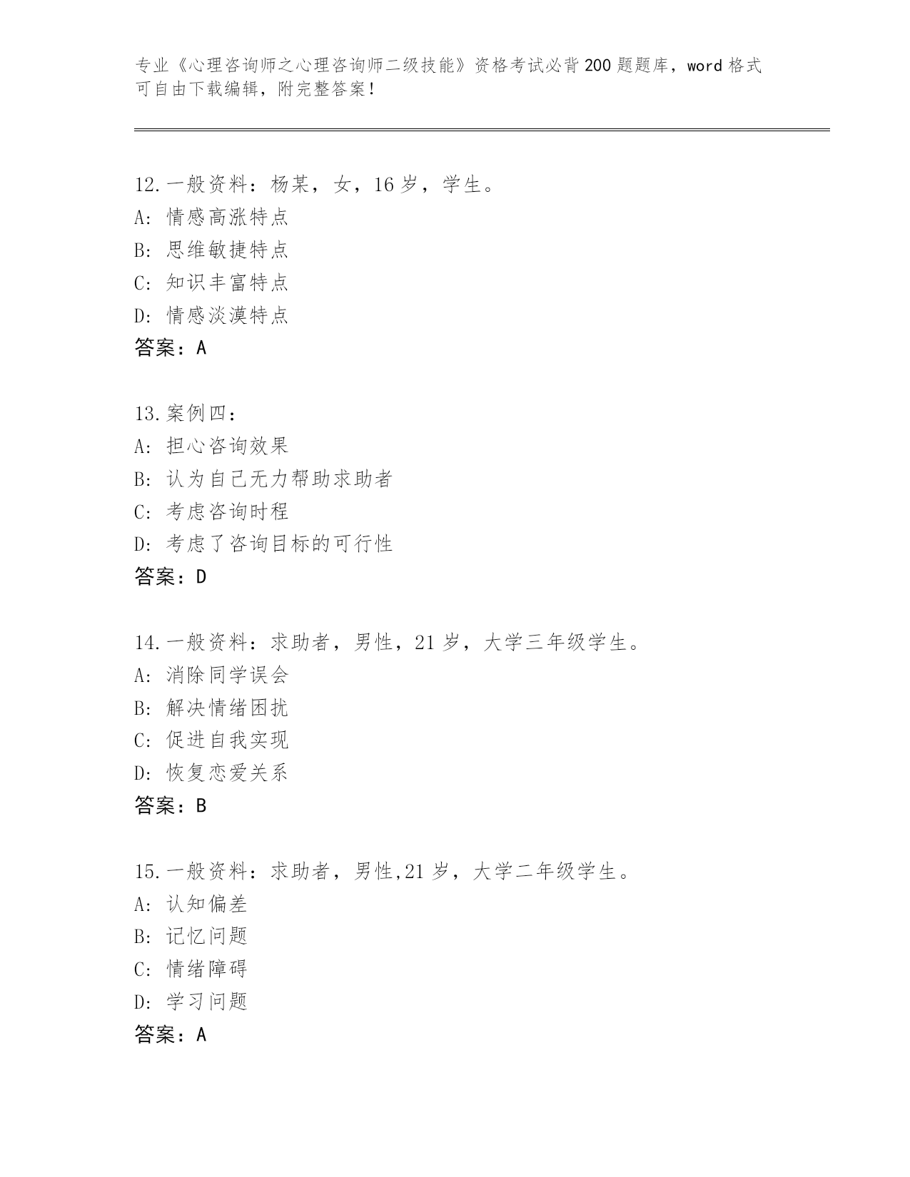 河南省《心理咨询师之心理咨询师二级技能》资格考试必背200题真题题库及答案()