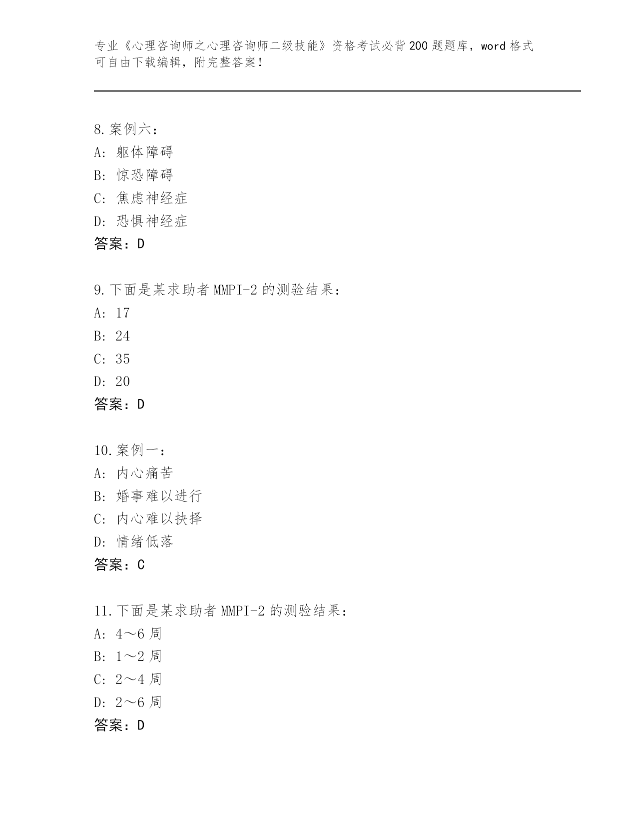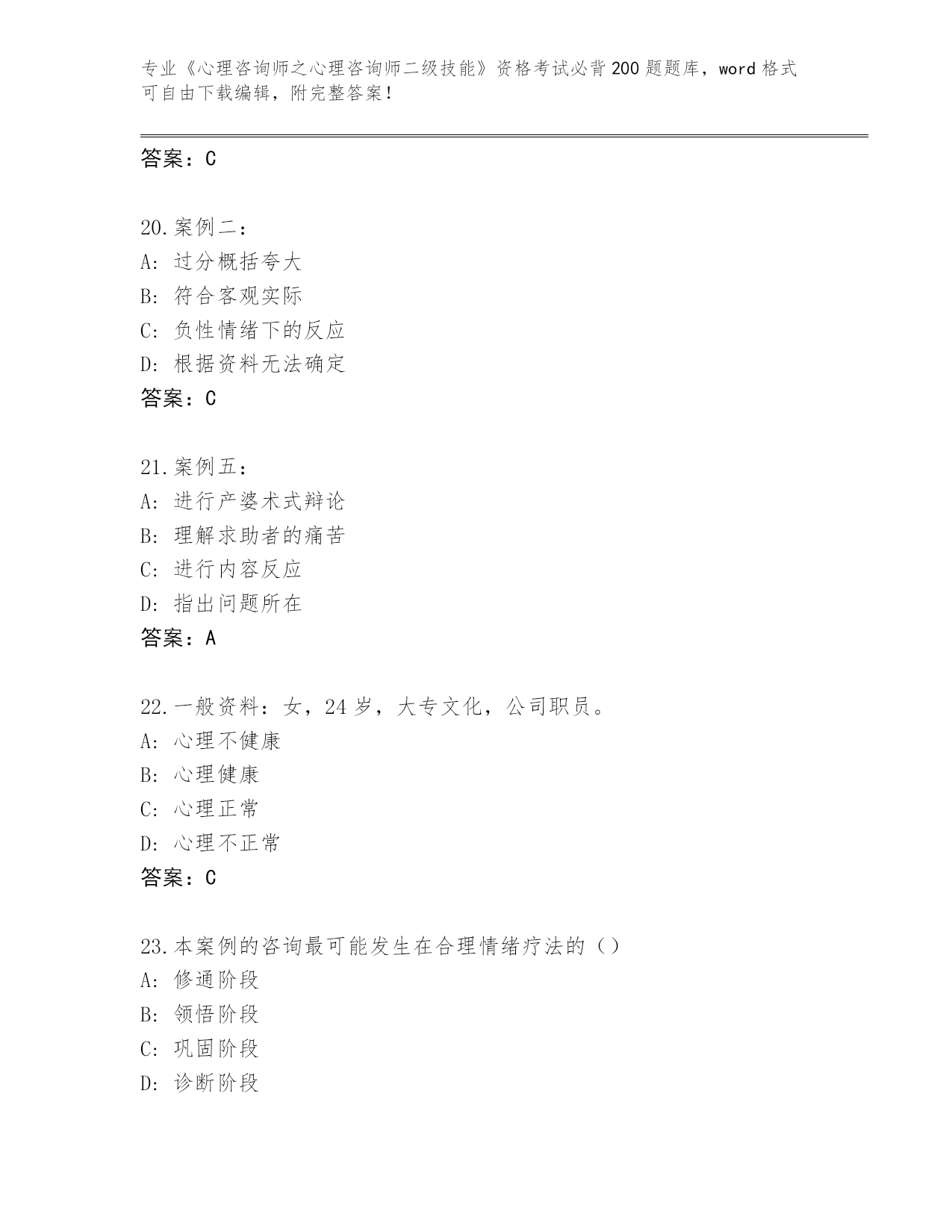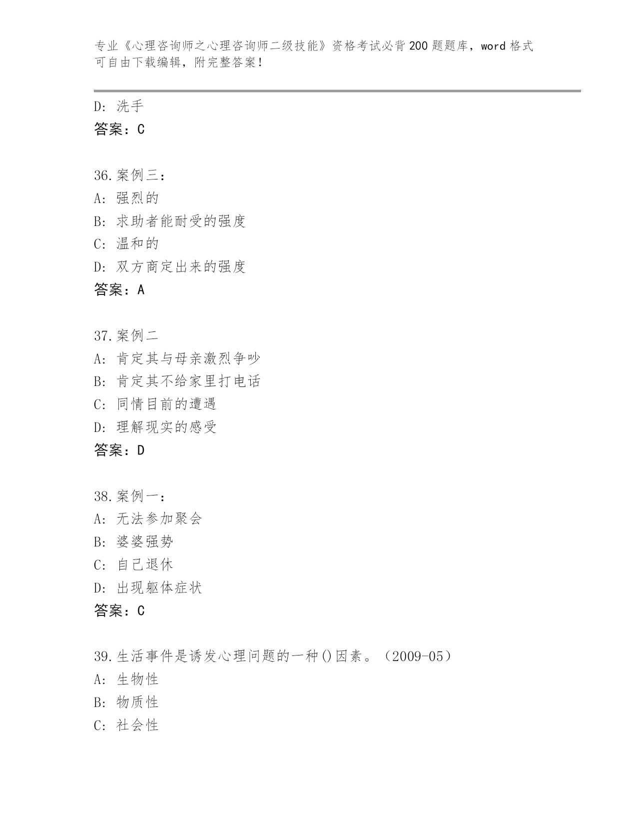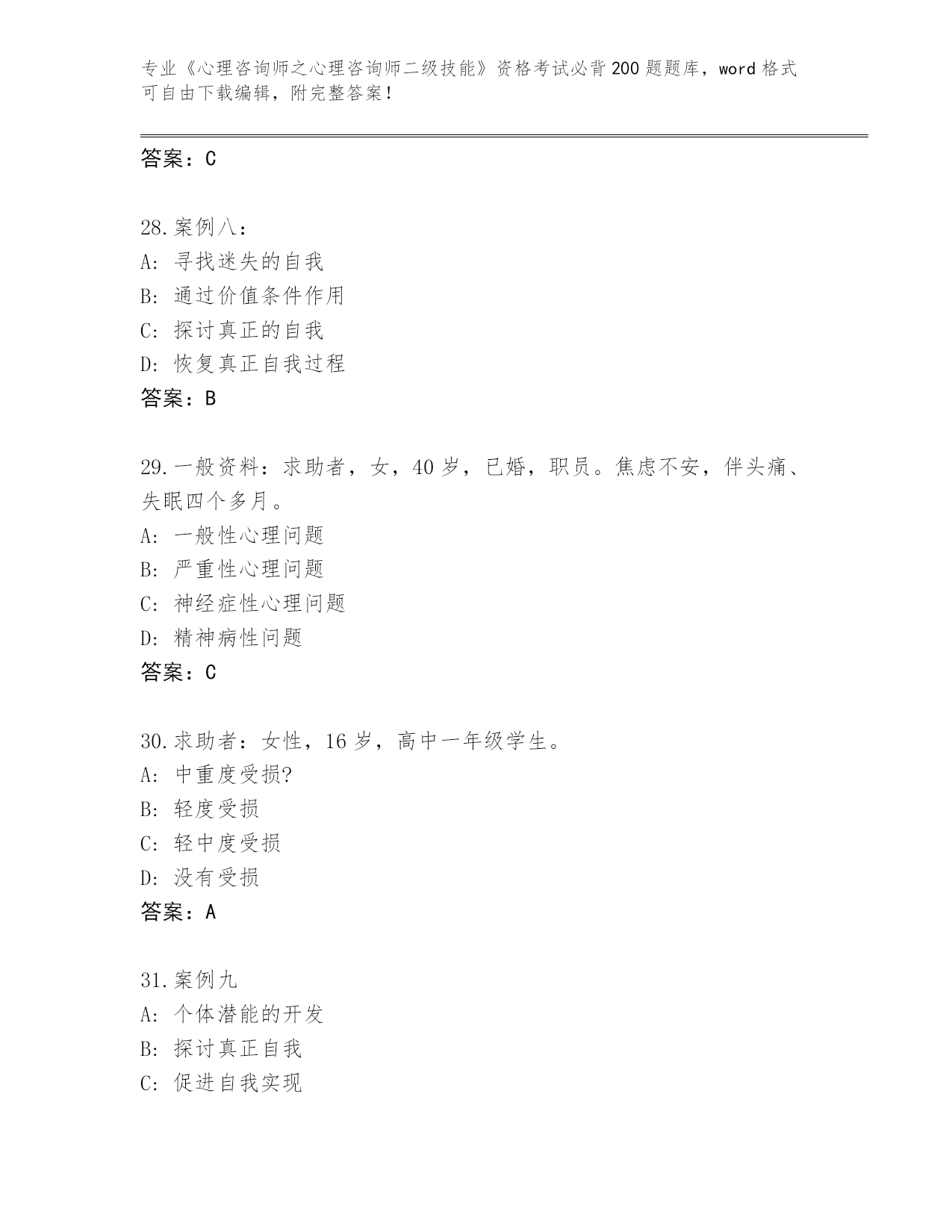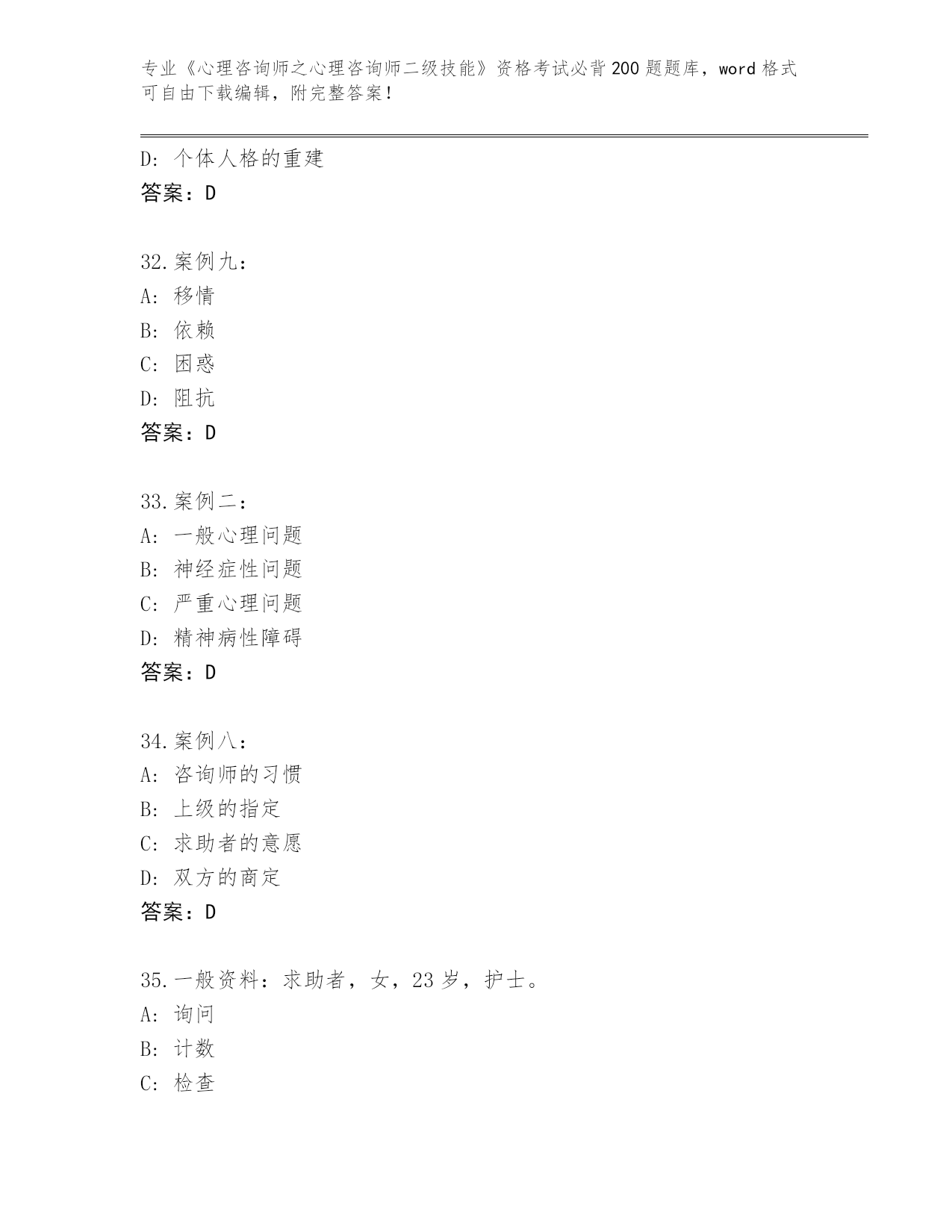 河南省《心理咨询师之心理咨询师二级技能》资格考试必背200题真题题库及答案()