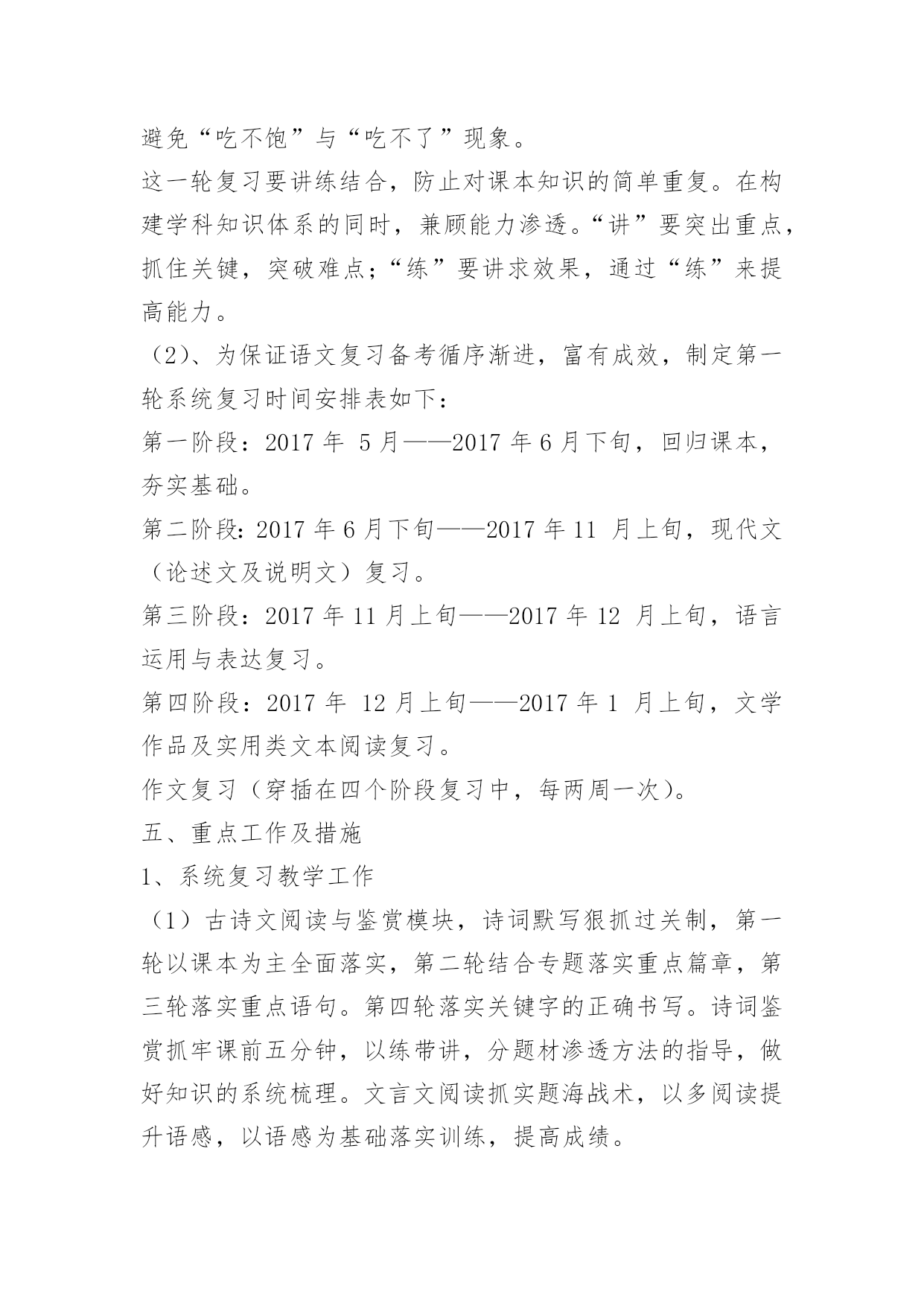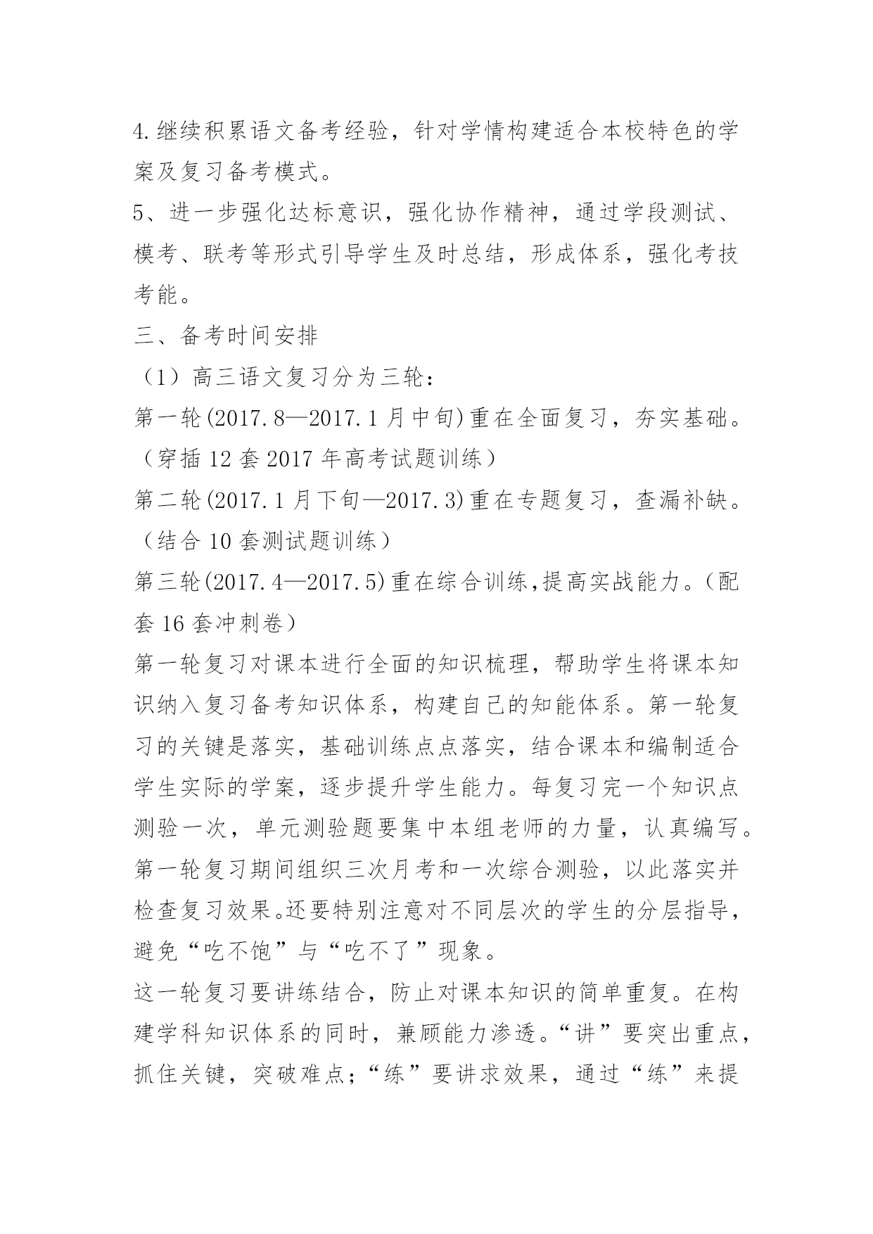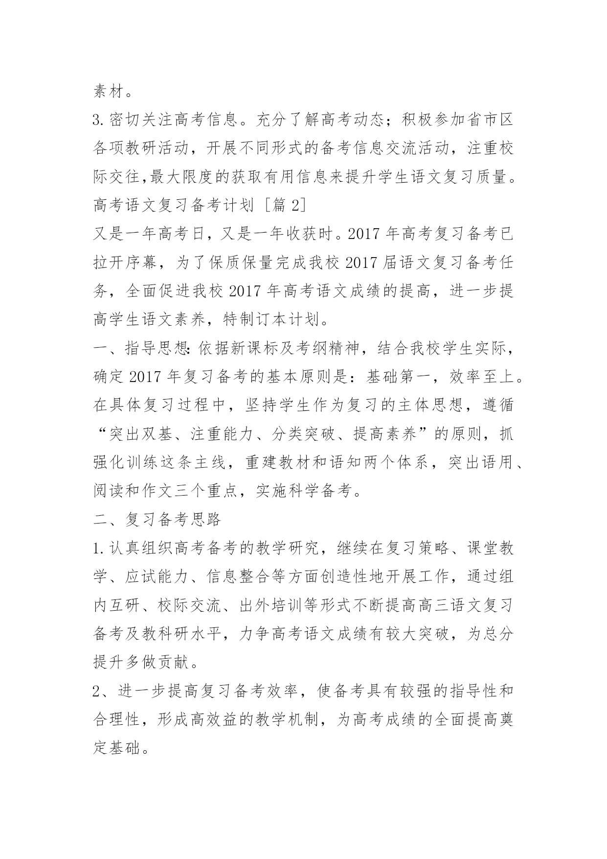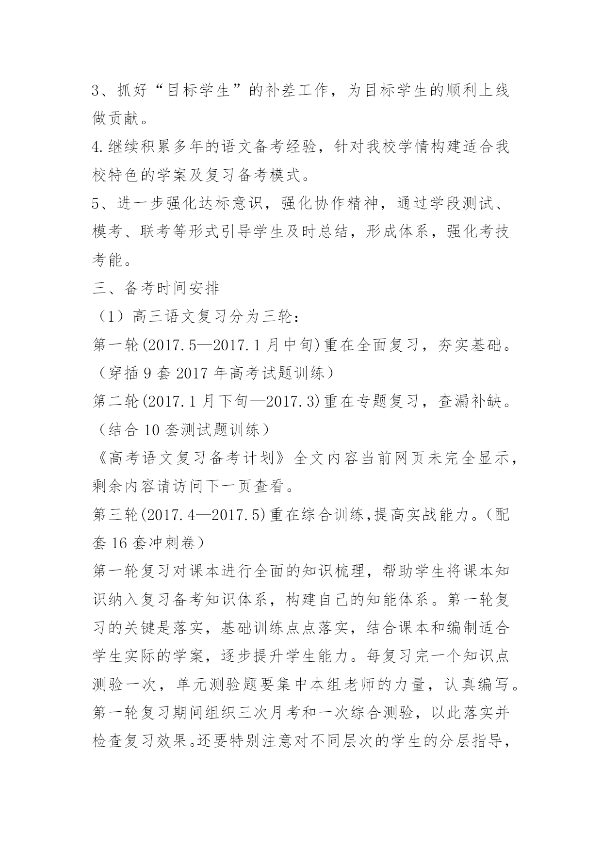 高考语文复习备考计划高考语文复习备考计划又是一年高考日,又是一年收获时。2017年高考复习备考已拉开序幕,为了保质保量完成高三毕业生的语文复习备考任务,全面促进2017年高考语文成绩的提高,进一步提高学生语文素养,特制定本计划。一、指导思想:依据新课标及考纲精神,结合我校学生实际,确定2017年复习备考的基本原则是:基础第一,效率至上。在具体复习过程中,坚持学生作为复习的主体思想,遵循“突出双基、注重能力、分类突破、提高素养”的原则,抓强化训练这条主线,重建教材和语知两个体系,突出语用、阅读和作文三个重点,实施科学备考。二、复习备考思路1.认真组织高考备考的教学研究,继续在复习策略、课堂教学、应试能力、信息整合等方面创造性地开展工作,通过组内互研、校际交流、出外培训等形式不断提高高三语文复习备考及教科研水平,力争高考语文成绩有较大突破,为总分提升多做贡献。2、进一步提高复习备考效率,使备考具有较强的指导性和合理性,形成高效益的教学机制,为高考成绩的全面提高奠定基础。3、抓好“目标学生”的补差工作,为目标学生的顺利上线做贡献。4.继续积累语文备考经验,针对学情构建适合本校特色的学案及复习备考模式。5、进一步强化达标意识,强化协作精神,通过学段测试、模考、联考等形式引导学生及时总结,形成体系,强化考技考能。三、备考时间安排(1)高三语文复习分为三轮:第一轮(2017.8—2017.1月中旬)重在全面复习,夯实基础。(穿插12套2017年高考试题训练)第二轮(2017.1月下旬—2017.3)重在专题复习,查漏补缺。(结合10套测试题训练)第三轮(2017.4—2017.5)重在综合训练,提高实战能力。(配套16套冲刺卷)第一轮复习对课本进行全面的知识梳理,帮助学生将课本知识纳入复习备考知识体系,构建自己的知能体系。第一轮复习的关键是落实,基础训练点点落实,结合课本和编制适合学生实际的学案,逐步提升学生能力。每复习完一个知识点测验一次,单元测验题要集中本组老师的力量,认真编写。第一轮复习期间组织三次月考和一次综合测验,以此落实并检查复习效果。还要特别注意对不同层次的学生的分层指导,避免“吃不饱”与“吃不了”现象。这一轮复习要讲练结合,防止对课本知识的简单重复。在构建学科知识体系的同时,兼顾能力渗透。“讲”要突出重点,抓住关键,突破难点;“练”要讲求效果,通过“练”来提高能力。五、重点工作及措施1、系统复习教学工作(1)古诗文阅读与鉴赏模块,诗词默写狠抓过关制,第一轮以课本为主全面落实,第二轮结合专题落实重点篇章,第三轮落实重点语句。第四轮落实关键字的正确书写。诗词鉴赏抓牢课前五分钟,以练带讲,分题材渗透方法的指导,做好知识的系统梳理。文言文阅读抓实题海战术,以多阅读提升语感,以语感为基础落实训练,提高成绩。(2)现代文模块主抓知识与方法的梳理,抓好知识的灵活迁移与运用。在表现技巧分析上多做文章,做好文章。(3)作文模块每两周一练,做到“有练必评、有评必改、有改必有提升”,切实抓好作文的升格训练,提高整体成绩。2、创设适合学生发展的复习备考模式、全面落实“三维目标”的教育、以量变促进质变的教育。高三在系统复习的研究课标卷,在教学实践中形成全方位课程体系的教育。六、常规工作及措施1、备课(1)充分根据学生实际实行有效教法,保证课堂上让学生积极动起来。(2)认真设计每节课复习内容,精心设计学案及配套习题,保证试题的本土化,争取自主习题,做好知识点汇总练习和错题反馈练习。(3)切实做好语文专题训练的设计,针对学生弱点突出强化习题。(4)坚持抓知识的结合点,注重理论与实际的结合。不求快,但求好,教好第一遍,学好第一遍,搞好第一轮复习。(5)以考促练。每周一考,堂堂有小考,针对我校学生懒惰、不会主动学习的特点,实行以考促练,以练促学的策略,让学生通过考试认识到自己的优、缺点,教师做到心中有数,复习有的放矢。(7)结合不同阶段设计好复习课、训练课、综合课、阅读课、写作课、考试课、讲评课等课件,利用多媒体手段,提升复习备考质量。2、授课原则:一切围绕学生,让每一个学生动起来,让每一个学生落实扎实、练习有效、高效备考、提升自我。(1)力争做到从学生实际需要出发,采取最适合自己学生的方式授课。面向全体学生,实行分层提问做题,努力做好“促尖转中补差”。《高考语文复习备考计划》全文内容当前网页未完全显示,剩余内容请访问下一页查看。(2)狠抓知识点落实,针对学生容易错的问题,反复抓,抓反复。高考考点专项训练,专题练习,补充大量高考知识。(3)严格课堂纪律,优化复习环境,保证每一个学生能认真学习、练习,创设高考备考的良好氛围。3、作业(1)认真布置作业,突出复习重点和知识整理。(2)课后抓名句、成语的落实,课上检查复习效果。(3)分层布置作业,有针对性利用