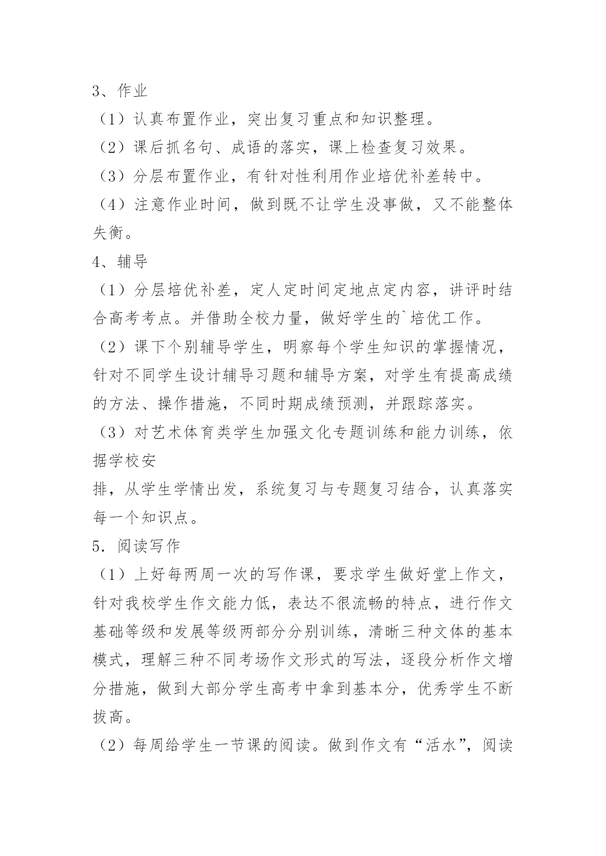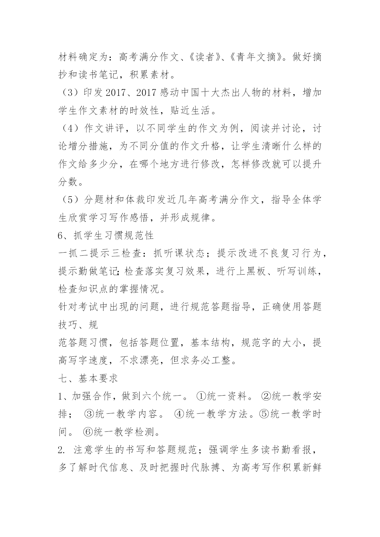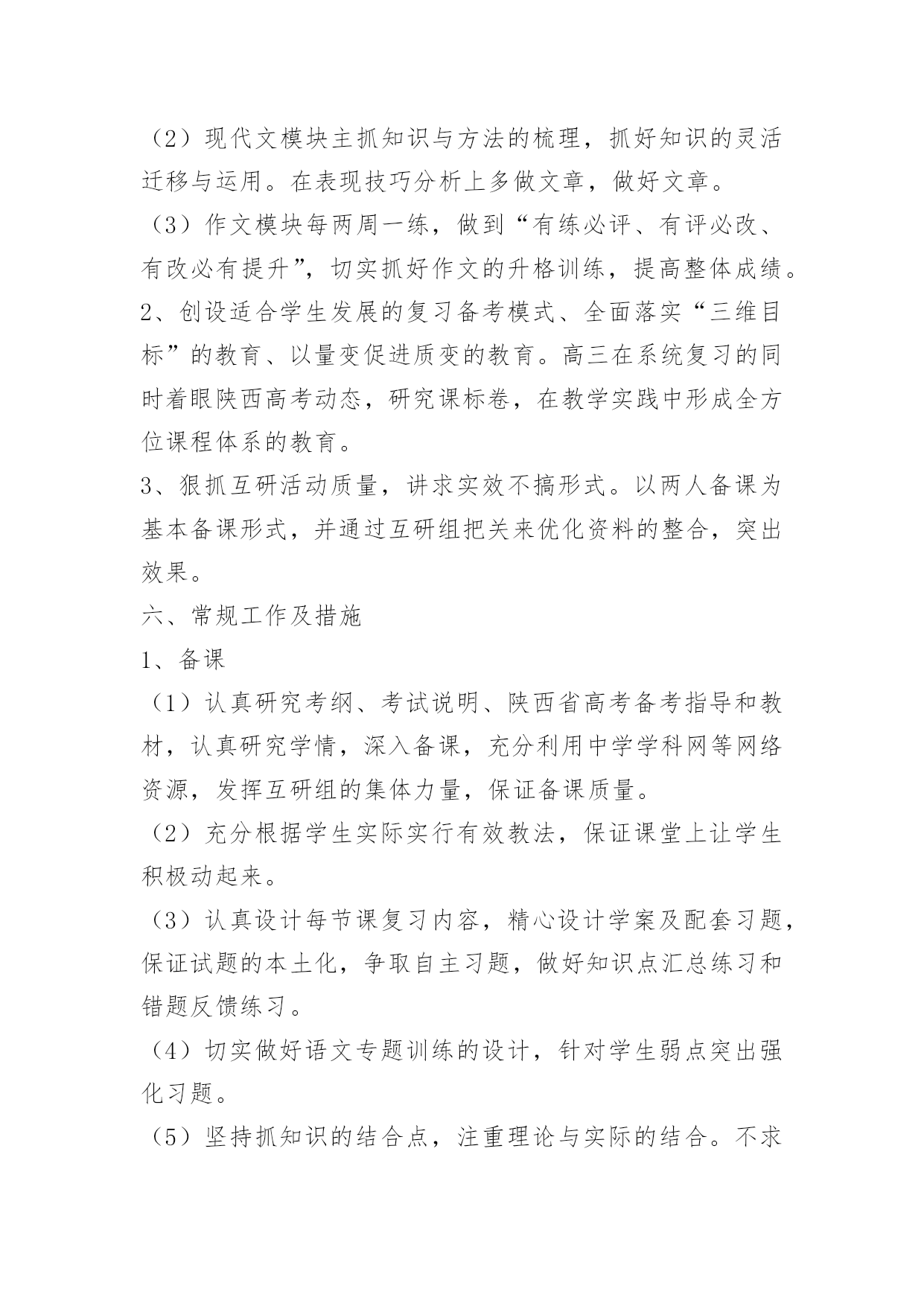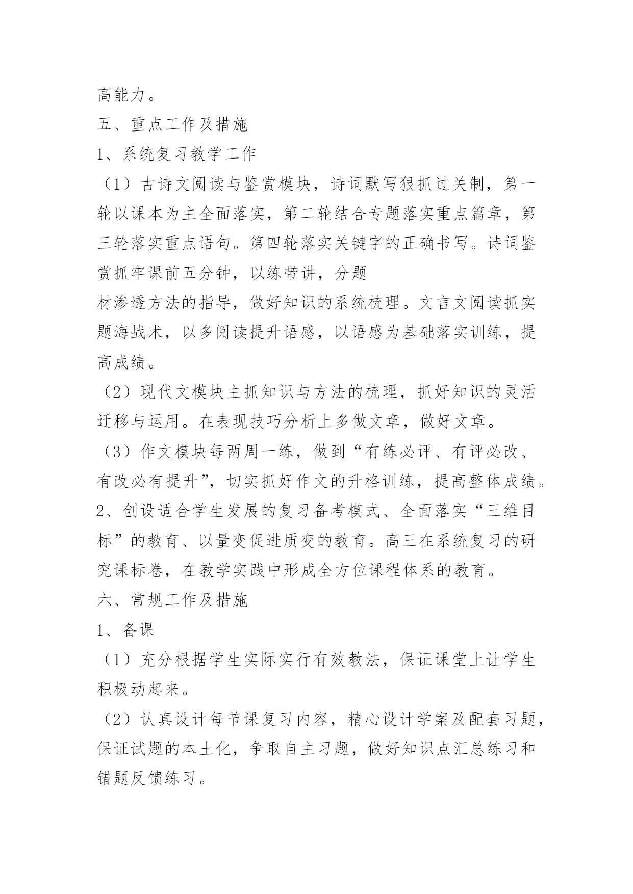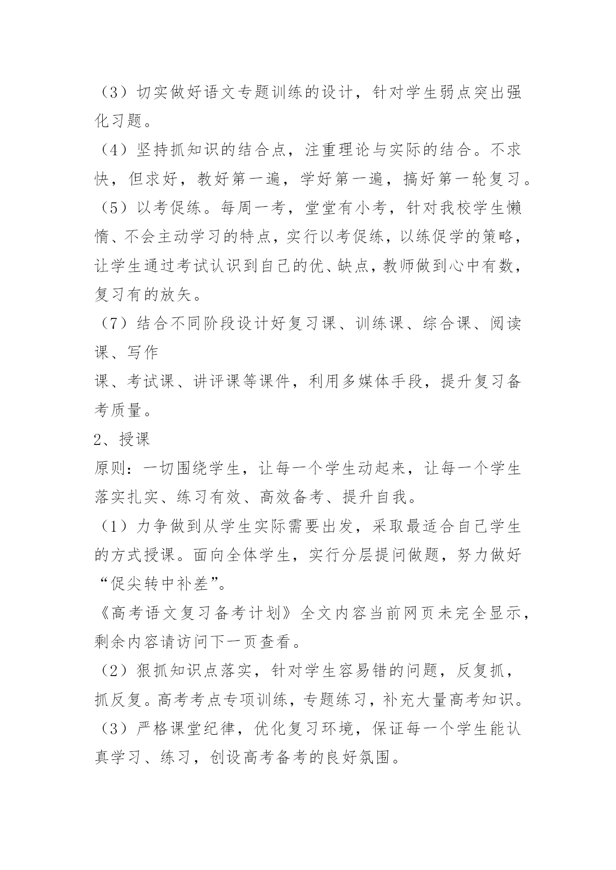 高考语文复习备考计划高考语文复习备考计划又是一年高考日,又是一年收获时。2017年高考复习备考已拉开序幕,为了保质保量完成高三毕业生的语文复习备考任务,全面促进2017年高考语文成绩的提高,进一步提高学生语文素养,特制定本计划。一、指导思想:依据新课标及考纲精神,结合我校学生实际,确定2017年复习备考的基本原则是:基础第一,效率至上。在具体复习过程中,坚持学生作为复习的主体思想,遵循“突出双基、注重能力、分类突破、提高素养”的原则,抓强化训练这条主线,重建教材和语知两个体系,突出语用、阅读和作文三个重点,实施科学备考。二、复习备考思路1.认真组织高考备考的教学研究,继续在复习策略、课堂教学、应试能力、信息整合等方面创造性地开展工作,通过组内互研、校际交流、出外培训等形式不断提高高三语文复习备考及教科研水平,力争高考语文成绩有较大突破,为总分提升多做贡献。2、进一步提高复习备考效率,使备考具有较强的指导性和合理性,形成高效益的教学机制,为高考成绩的全面提高奠定基础。3、抓好“目标学生”的补差工作,为目标学生的顺利上线做贡献。4.继续积累语文备考经验,针对学情构建适合本校特色的学案及复习备考模式。5、进一步强化达标意识,强化协作精神,通过学段测试、模考、联考等形式引导学生及时总结,形成体系,强化考技考能。三、备考时间安排(1)高三语文复习分为三轮:第一轮(2017.8—2017.1月中旬)重在全面复习,夯实基础。(穿插12套2017年高考试题训练)第二轮(2017.1月下旬—2017.3)重在专题复习,查漏补缺。(结合10套测试题训练)第三轮(2017.4—2017.5)重在综合训练,提高实战能力。(配套16套冲刺卷)第一轮复习对课本进行全面的知识梳理,帮助学生将课本知识纳入复习备考知识体系,构建自己的知能体系。第一轮复习的关键是落实,基础训练点点落实,结合课本和编制适合学生实际的学案,逐步提升学生能力。每复习完一个知识点测验一次,单元测验题要集中本组老师的力量,认真编写。第一轮复习期间组织三次月考和一次综合测验,以此落实并检查复习效果。还要特别注意对不同层次的学生的分层指导,避免“吃不饱”与“吃不了”现象。这一轮复习要讲练结合,防止对课本知识的简单重复。在构建学科知识体系的同时,兼顾能力渗透。“讲”要突出重点,抓住关键,突破难点;“练”要讲求效果,通过“练”来提高能力。五、重点工作及措施1、系统复习教学工作(1)古诗文阅读与鉴赏模块,诗词默写狠抓过关制,第一轮以课本为主全面落实,第二轮结合专题落实重点篇章,第三轮落实重点语句。第四轮落实关键字的正确书写。诗词鉴赏抓牢课前五分钟,以练带讲,分题材渗透方法的指导,做好知识的系统梳理。文言文阅读抓实题海战术,以多阅读提升语感,以语感为基础落实训练,提高成绩。(2)现代文模块主抓知识与方法的梳理,抓好知识的灵活迁移与运用。在表现技巧分析上多做文章,做好文章。(3)作文模块每两周一练,做到“有练必评、有评必改、有改必有提升”,切实抓好作文的升格训练,提高整体成绩。2、创设适合学生发展的复习备考模式、全面落实“三维目标”的教育、以量变促进质变的教育。高三在系统复习的研究课标卷,在教学实践中形成全方位课程体系的教育。六、常规工作及措施1、备课(1)充分根据学生实际实行有效教法,保证课堂上让学生积极动起来。(2)认真设计每节课复习内容,精心设计学案及配套习题,保证试题的本土化,争取自主习题,做好知识点汇总练习和错题反馈练习。(3)切实做好语文专题训练的设计,针对学生弱点突出强化习题。(4)坚持抓知识的结合点,注重理论与实际的结合。不求快,但求好,教好第一遍,学好第一遍,搞好第一轮复习。(5)以考促练。每周一考,堂堂有小考,针对我校学生懒惰、不会主动学习的特点,实行以考促练,以练促学的策略,让学生通过考试认识到自己的优、缺点,教师做到心中有数,复习有的放矢。(7)结合不同阶段设计好复习课、训练课、综合课、阅读课、写作课、考试课、讲评课等课件,利用多媒体手段,提升复习备考质量。2、授课原则:一切围绕学生,让每一个学生动起来,让每一个学生落实扎实、练习有效、高效备考、提升自我。(1)力争做到从学生实际需要出发,采取最适合自己学生的方式授课。面向全体学生,实行分层提问做题,努力做好“促尖转中补差”。《高考语文复习备考计划》全文内容当前网页未完全显示,剩余内容请访问下一页查看。(2)狠抓知识点落实,针对学生容易错的问题,反复抓,抓反复。高考考点专项训练,专题练习,补充大量高考知识。(3)严格课堂纪律,优化复习环境,保证每一个学生能认真学习、练习,创设高考备考的良好氛围。3、作业(1)认真布置作业,突出复习重点和知识整理。(2)课后抓名句、成语的落实,课上检查复习效果。(3)分层布置作业,有针对性利用