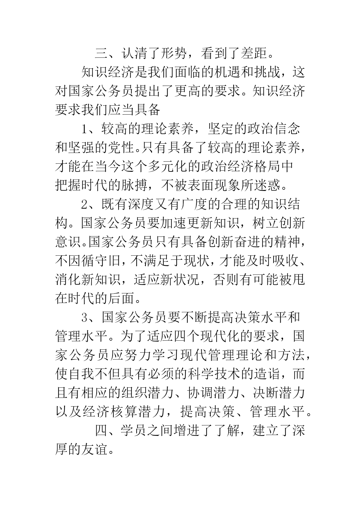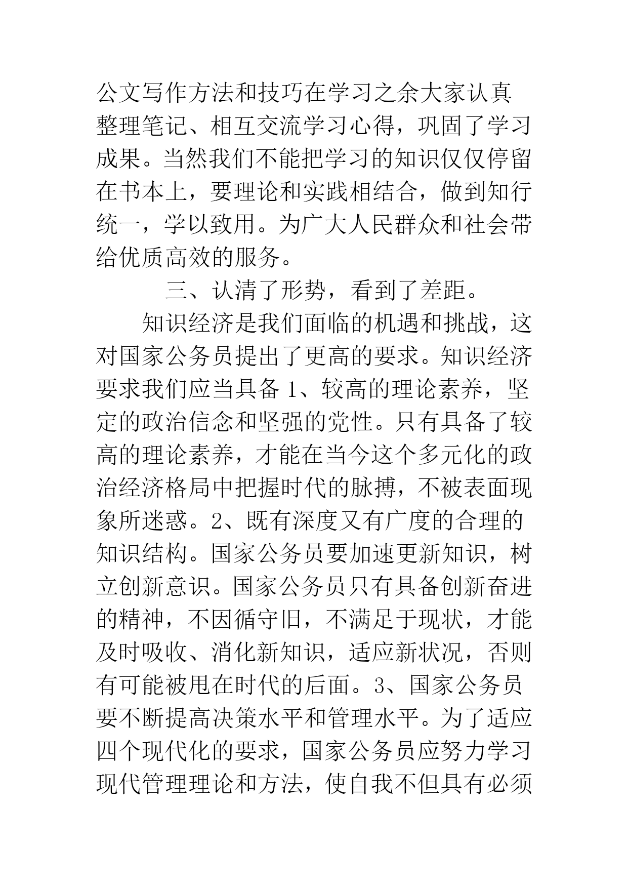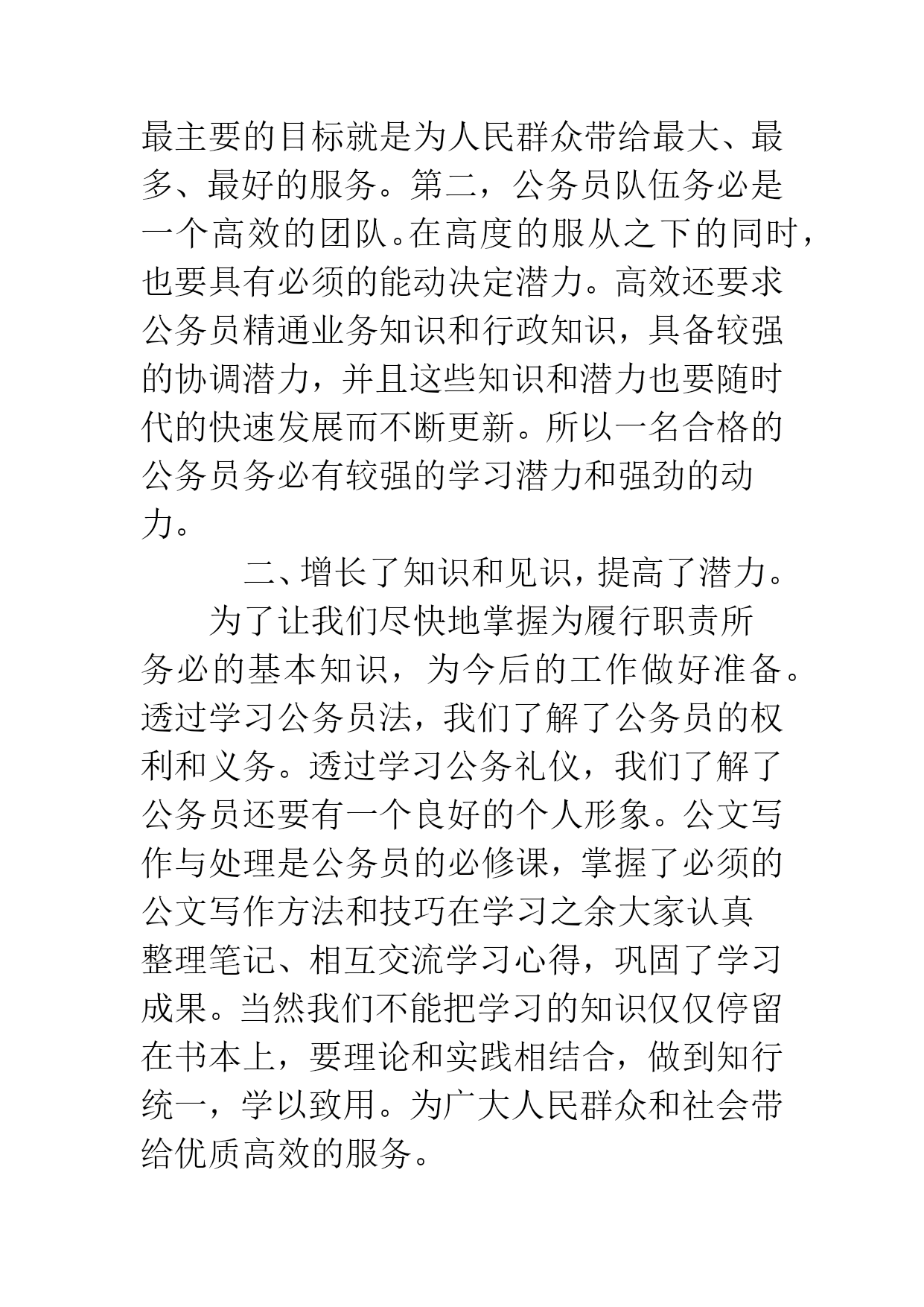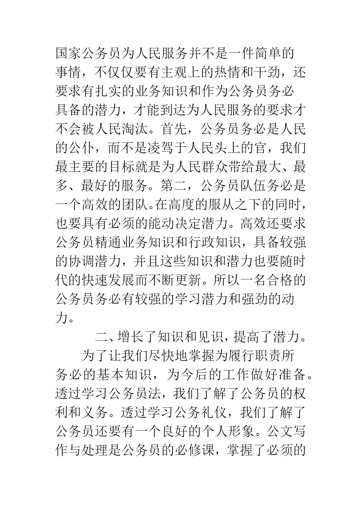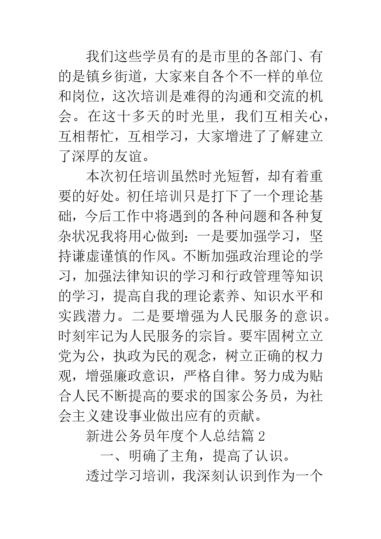 新进公务员年度个人总结一个优秀的个人总结既是对自己一年来工作的回顾又是来年新的工作计划的基础,对个人的职业规划很重要。下面小编给大家分享几篇新进公务员年度个人总结,一起看一下吧!新进公务员年度个人总结篇1在公务员初任培训这段时光里,在培训学校领导和老师的精心组织下,我始终以高昂的热情、严谨的态度全身心地投入到学习当中去,比较好的完成了培训任务,培训之后收获很多。一、明确了主角,提高了认识。透过学习培训,我深刻认识到作为一个国家公务员为人民服务并不是一件简单的事情,不仅仅要有主观上的热情和干劲,还要求有扎实的业务知识和作为公务员务必具备的潜力,才能到达为人民服务的要求才不会被人民淘汰。首先,公务员务必是人民的公仆,而不是凌驾于人民头上的官,我们最主要的目标就是为人民群众带给最大、最多、最好的服务。第二,公务员队伍务必是一个高效的团队。在高度的服从之下的同时,也要具有必须的能动决定潜力。高效还要求公务员精通业务知识和行政知识,具备较强的协调潜力,并且这些知识和潜力也要随时代的快速发展而不断更新。所以一名合格的公务员务必有较强的学习潜力和强劲的动力。二、增长了知识和见识,提高了潜力。为了让我们尽快地掌握为履行职责所务必的基本知识,为今后的工作做好准备。透过学习公务员法,我们了解了公务员的权利和义务。透过学习公务礼仪,我们了解了公务员还要有一个良好的个人形象。公文写作与处理是公务员的必修课,掌握了必须的公文写作方法和技巧在学习之余大家认真整理笔记、相互交流学习心得,巩固了学习成果。当然我们不能把学习的知识仅仅停留在书本上,要理论和实践相结合,做到知行统一,学以致用。为广大人民群众和社会带给优质高效的服务。三、认清了形势,看到了差距。知识经济是我们面临的机遇和挑战,这对国家公务员提出了更高的要求。知识经济要求我们应当具备1、较高的理论素养,坚定的政治信念和坚强的党性。只有具备了较高的理论素养,才能在当今这个多元化的政治经济格局中把握时代的脉搏,不被表面现象所迷惑。2、既有深度又有广度的合理的知识结构。国家公务员要加速更新知识,树立创新意识。国家公务员只有具备创新奋进的精神,不因循守旧,不满足于现状,才能及时吸收、消化新知识,适应新状况,否则有可能被甩在时代的后面。3、国家公务员要不断提高决策水平和管理水平。为了适应四个现代化的要求,国家公务员应努力学习现代管理理论和方法,使自我不但具有必须的科学技术的造诣,而且有相应的组织潜力、协调潜力、决断潜力以及经济核算潜力,提高决策、管理水平。四、学员之间增进了了解,建立了深厚的友谊。我们这些学员有的是市里的各部门、有的是镇乡街道,大家来自各个不一样的单位和岗位,这次培训是难得的沟通和交流的机会。在这十多天的时光里,我们互相关心,互相帮忙,互相学习,大家增进了了解建立了深厚的友谊。本次初任培训虽然时光短暂,却有着重要的好处。初任培训只是打下了一个理论基础,今后工作中将遇到的各种问题和各种复杂状况我将用心做到:一是要加强学习,坚持谦虚谨慎的作风。不断加强政治理论的学习,加强法律知识的学习和行政管理等知识的学习,提高自我的理论素养、知识水平和实践潜力。二是要增强为人民服务的意识。时刻牢记为人民服务的宗旨。要牢固树立立党为公,执政为民的观念,树立正确的权力观,增强廉政意识,严格自律。努力成为贴合人民不断提高的要求的国家公务员,为社会主义建设事业做出应有的贡献。新进公务员年度个人总结篇2一、明确了主角,提高了认识。透过学习培训,我深刻认识到作为一个国家公务员为人民服务并不是一件简单的事情,不仅仅要有主观上的热情和干劲,还要求有扎实的业务知识和作为公务员务必具备的潜力,才能到达为人民服务的要求才不会被人民淘汰。首先,公务员务必是人民的公仆,而不是凌驾于人民头上的官,我们最主要的目标就是为人民群众带给最大、最多、最好的服务。第二,公务员队伍务必是一个高效的团队。在高度的服从之下的同时,也要具有必须的能动决定潜力。高效还要求公务员精通业务知识和行政知识,具备较强的协调潜力,并且这些知识和潜力也要随时代的快速发展而不断更新。所以一名合格的公务员务必有较强的学习潜力和强劲的动力。二、增长了知识和见识,提高了潜力。为了让我们尽快地掌握为履行职责所务必的基本知识,为今后的工作做好准备。透过学习公务员法,我们了解了公务员的权利和义务。透过学习公务礼仪,我们了解了公务员还要有一个良好的个人形象。公文写作与处理是公务员的必修课,掌握了必须的公文写作方法和技巧在学习之余大家认真整理笔记、相互交流学习心得,巩固了学习成果。当然我们不能把学习的知识仅仅停留在书本上,要理论和实践相结合,做到知行统一,学以致用。为广大人民群众和社会带给优质高效的服务。三、认清了形势,看到了差距。知识经济是我们面临的机遇和挑战,这对国家公务员提出了更