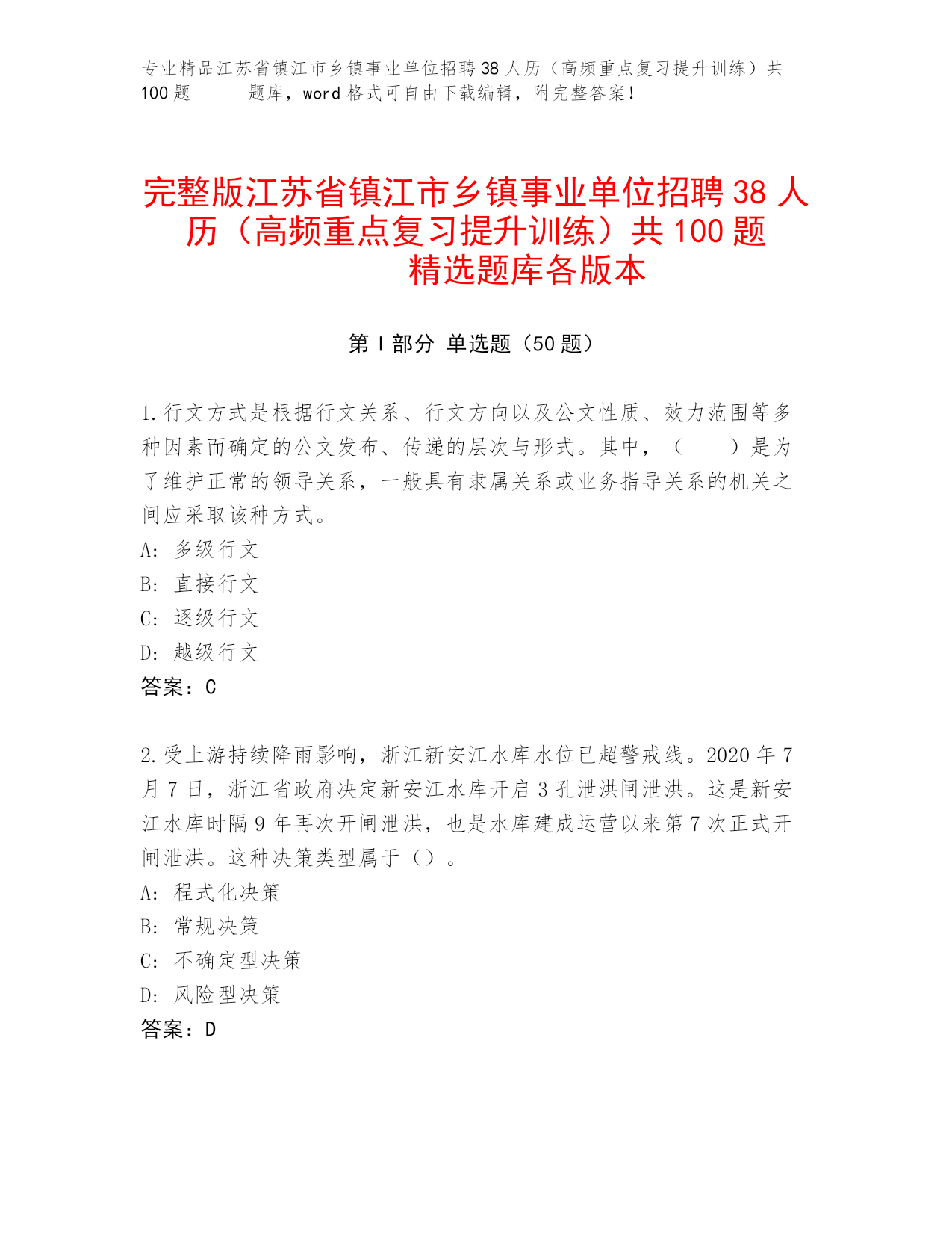 完整版江苏省镇江市乡镇事业单位招聘38人历(高频重点复习提升训练)共100题 精选题库各版本