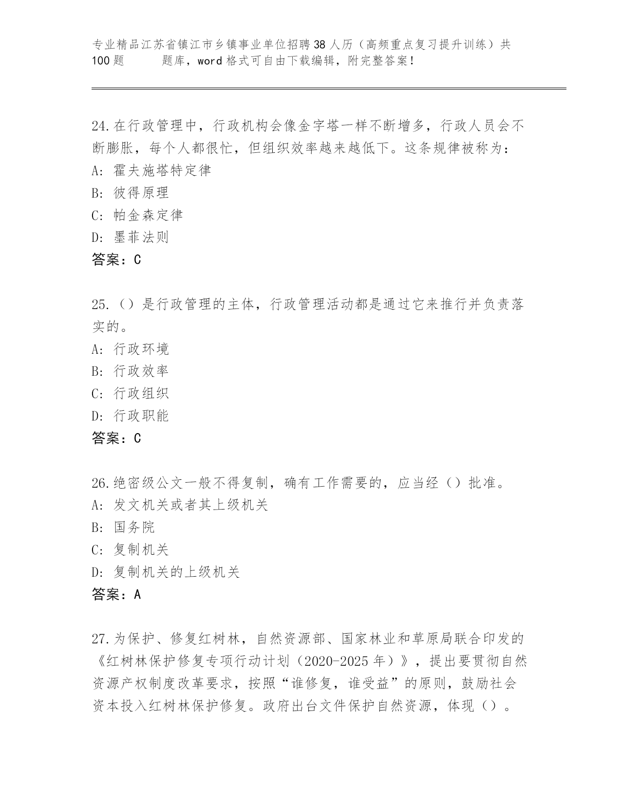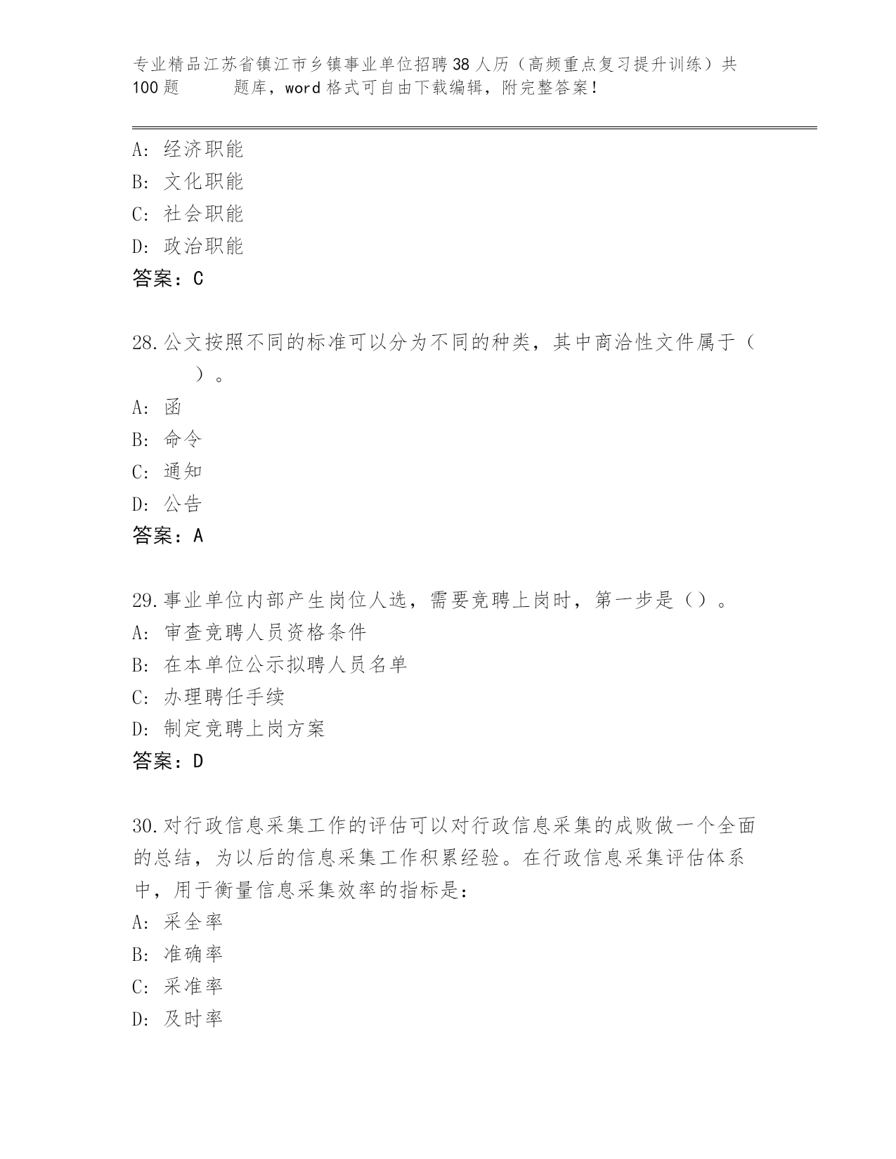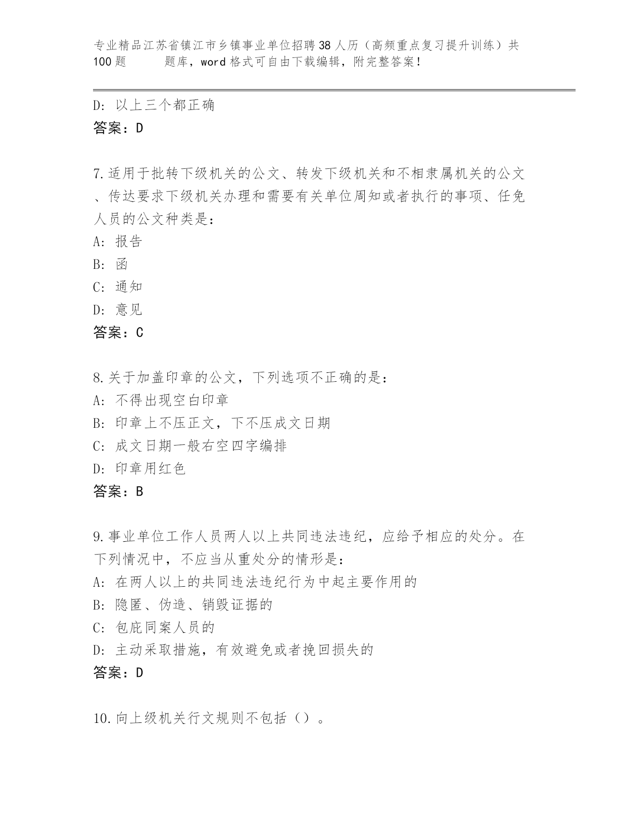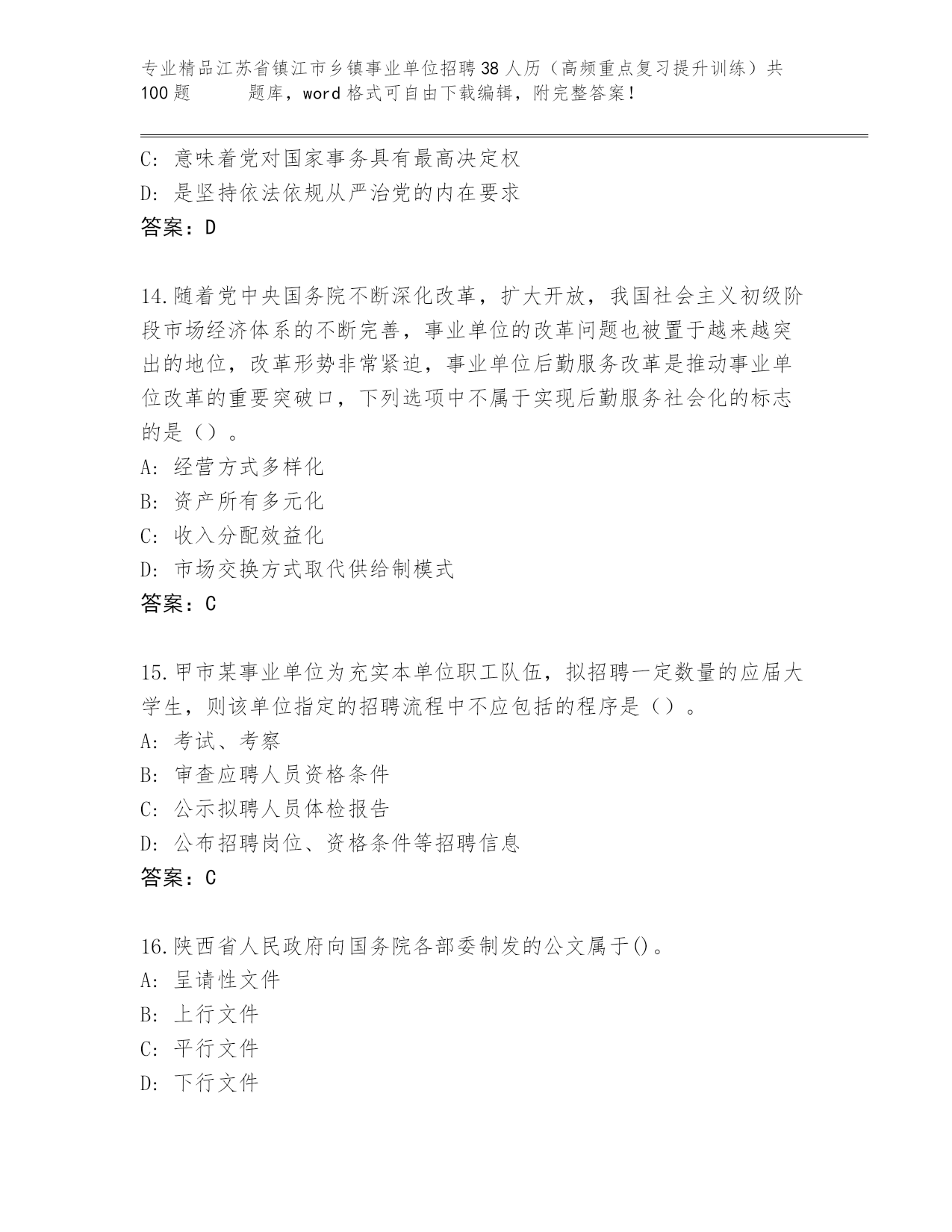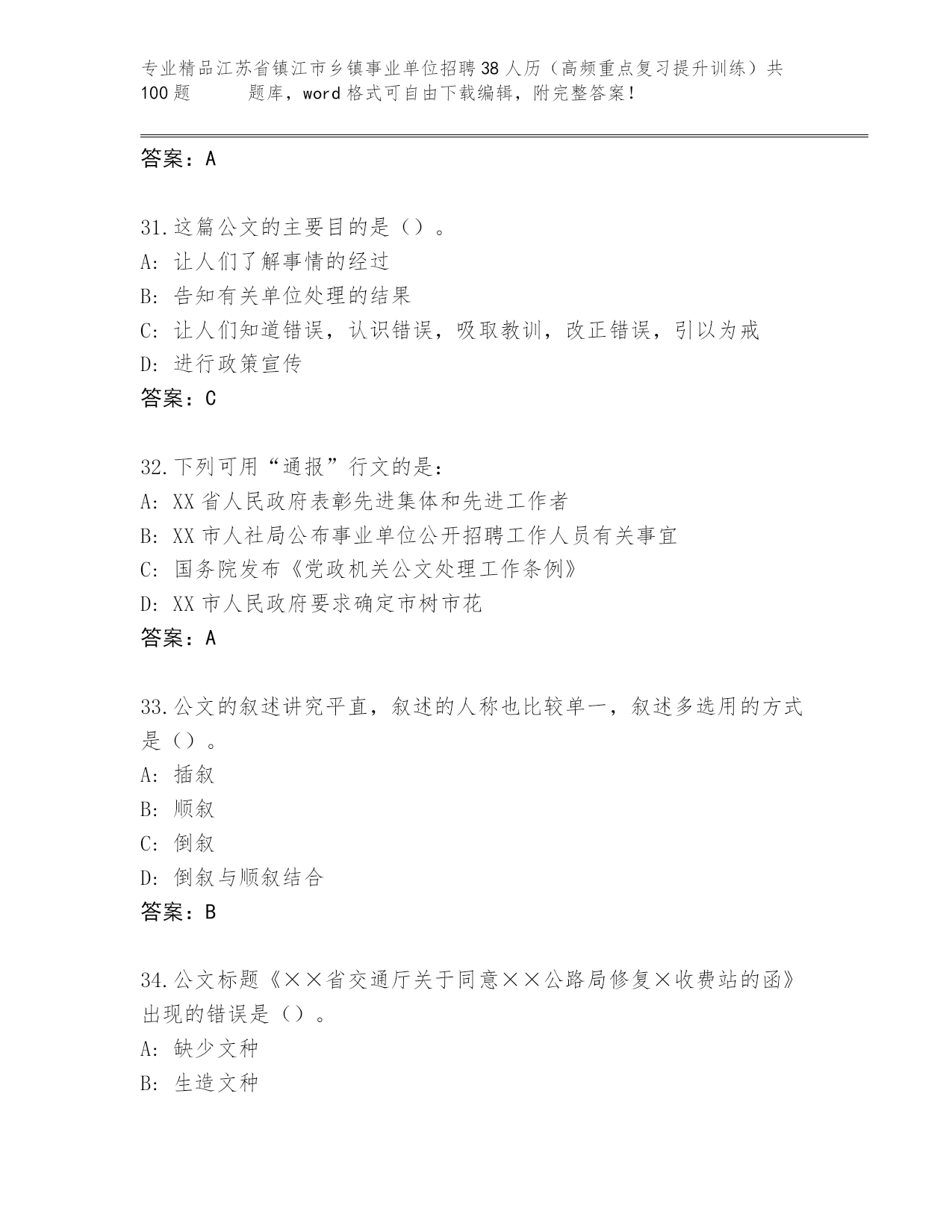 历年江苏省镇江市乡镇事业单位招聘38人历(高频重点复习提升训练)共100题 题库a4版打印