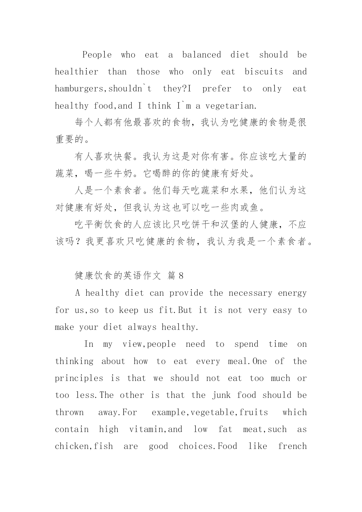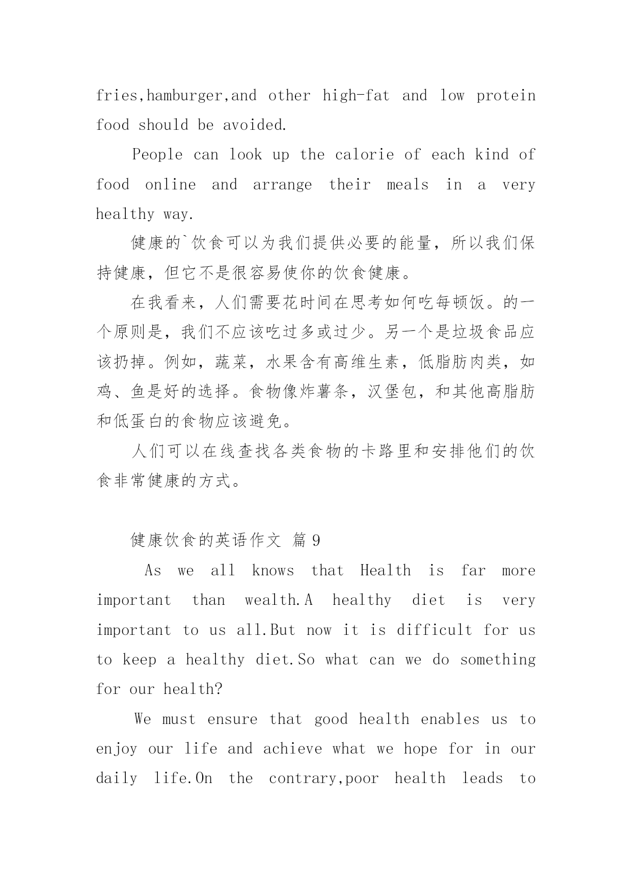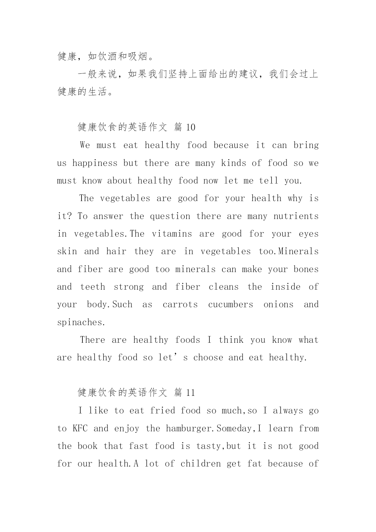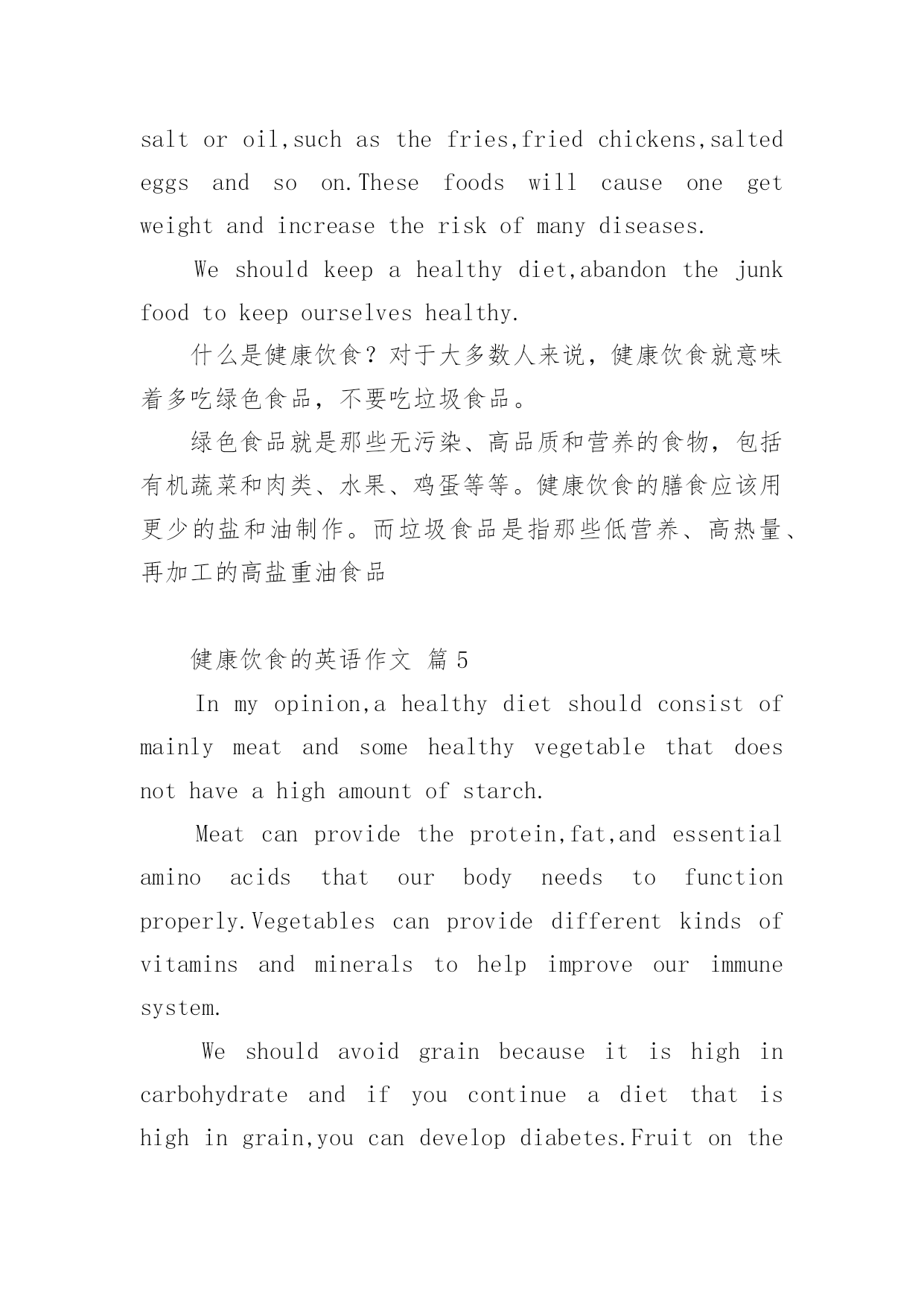 健康饮食的英语作文健康饮食的英语作文(精选20篇)在我们平凡的日常里,大家都跟作文打过交道吧,作文根据写作时限的不同可以分为限时作文和非限时作文。相信写作文是一个让许多人都头痛的问题,下面是小编为大家收集的健康饮食的英语作文,希望对大家有所帮助。健康饮食的英语作文篇1Weknowthatsomeofourstudentsdonotlikeeatinglunchatschoolbecausethefoodisn’tdelicious.Sotheyoftengooutofschooltobuysomethingtheyliketoeat.ButI’mafraidit’sbadfortheirhealthtoeatlunchoutsidebecausesomeofthefoodtheybuyisn’thealthyenough.Inmyopinion,ifourschoolswantmorestudentstobebackandenjoylunchinside,theyshouldmakethefoodmoredelicious,andalsotheyshouldofferourstudentsalargerchoiceoffoodaswell.健康饮食的英语作文篇2Healthyeatinghabitsareveryimportantforourhealth.Weshouldbuildhealthyeatinghabits.Weshouldeatfreshvegetablesandfruitseveryday.Theysupplyrichandthenecessaryvitaminsforus.Wealsoshouldeatlessmeateverday.Andwehadbetterdrinkaglassofmilkinthemorningoratnight.Besides,weshouldfocusonabalanceddiet,whichassuresusthenecessarynutritions.Junkfoodisafatalkillerforourhealthsothatweshouldstayfarfromthem.Itissaidthatmostofstudentsdonoteatanythingatallinthemorning.Itisverybadforourhealth.Breakfastisthemostimportantmealforpeople.健康的饮食习惯对我们的健康很重要。我们应该建立健康的饮食习惯。我们应该每天吃新鲜的蔬菜和水果,它们能给我们提供丰富的必要维生素。我们每天还应该少吃肉,最好每天早晚喝一杯水。此外,我们应该注意饮食平衡,这能保证我们必要的营养。垃圾食品是我们健康的致命杀手,所以我们应该远离它们。据说大部分的学生早上几乎什么都不吃,这对我们的健康是有害的。早餐是人们最重要的一餐。健康饮食的英语作文篇3Itisknownthattheexperienceswehaveinchildhoodrelatingtoconsumptionoffoodaffectourperspectiveonfoodconsumptioninlaterlife.Fromthis,weareabletodetermineourselvesourlimitsofhowmuchwewilleat,aswellasfoodswewillnoteat-whichcandevelopintoeatingdisorders,suchasanorexiaorbulimiaThisisalsotruewithhowweperceivethesizesofthemealsoramountsoffoodweconsumedaily;peoplehavedifferentinterpretationsofsmallandlargemealsbasedonupbringing.众所周知,我们在童年经历有关消费的食物影响我们对食品消费的看法。由此,我们能够确定自己的极限我们将吃多少,以及我们不会吃的食物——可发展成饮食失调,如厌食症或暴食症也是如此我们如何感知食物的大小或我们每天消耗大量的食物;小型和大型餐的人有不同的解释基于教养。健康饮食的英语作文篇4Whatishealthydiet?Tothemostpeople,healthydietmeansmoregreenfoods,nojunkfoods.Thegreenfoodisthosepollution-free,highqualityandnutrientfood,includingtheorganicvegetablesandmeats,fruits,eggsandso