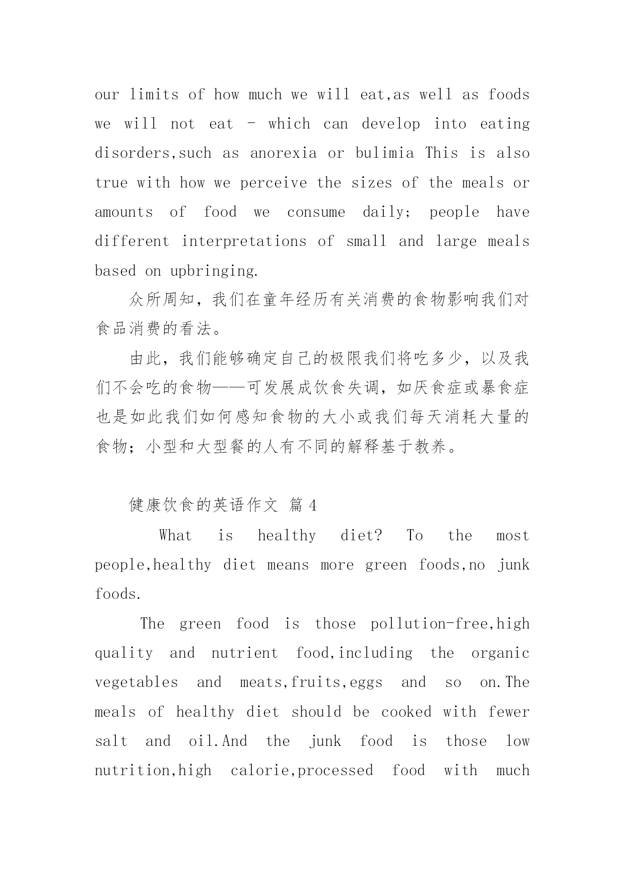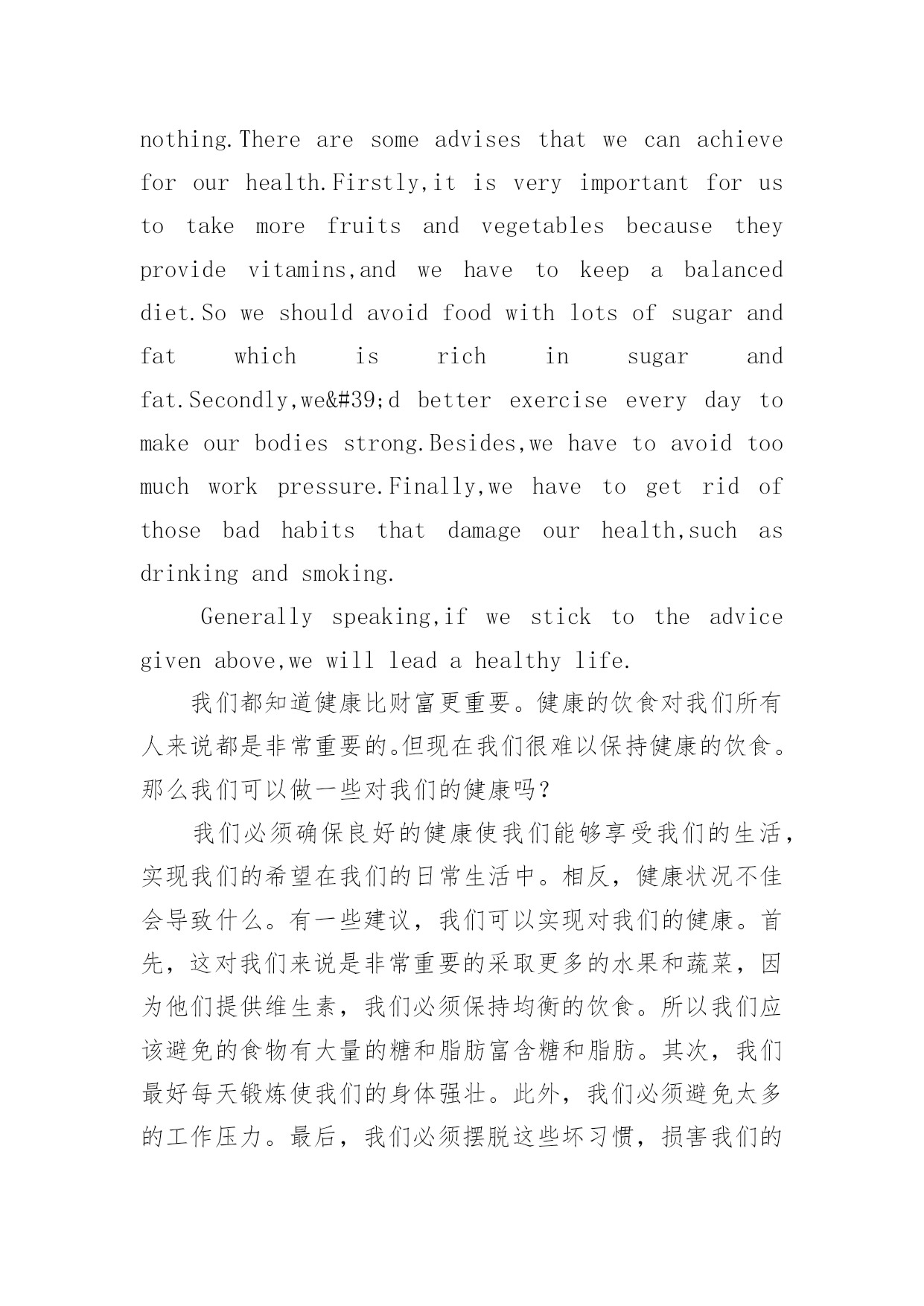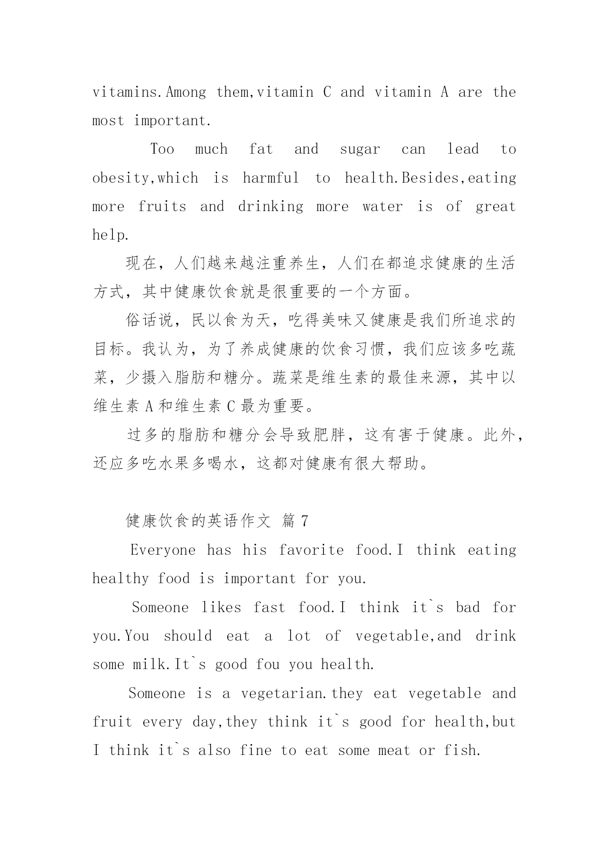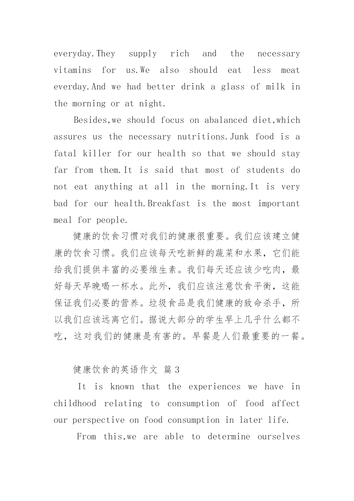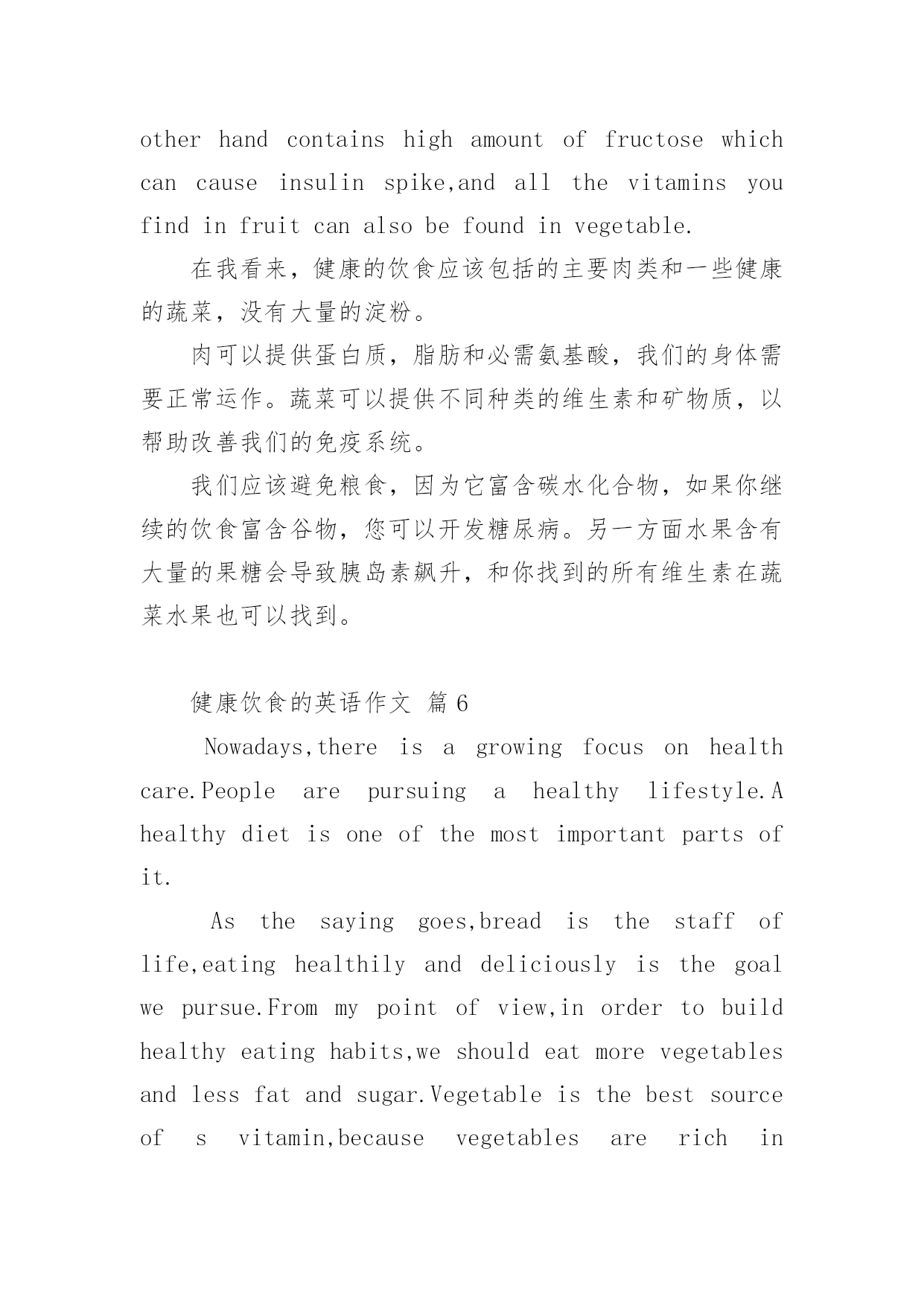 健康饮食的英语作文健康饮食的英语作文(精选20篇)在我们平凡的日常里,大家都跟作文打过交道吧,作文根据写作时限的不同可以分为限时作文和非限时作文。相信写作文是一个让许多人都头痛的问题,下面是小编为大家收集的健康饮食的英语作文,希望对大家有所帮助。健康饮食的英语作文篇1Weknowthatsomeofourstudentsdonotlikeeatinglunchatschoolbecausethefoodisn’tdelicious.Sotheyoftengooutofschooltobuysomethingtheyliketoeat.ButI’mafraidit’sbadfortheirhealthtoeatlunchoutsidebecausesomeofthefoodtheybuyisn’thealthyenough.Inmyopinion,ifourschoolswantmorestudentstobebackandenjoylunchinside,theyshouldmakethefoodmoredelicious,andalsotheyshouldofferourstudentsalargerchoiceoffoodaswell.健康饮食的英语作文篇2Healthyeatinghabitsareveryimportantforourhealth.Weshouldbuildhealthyeatinghabits.Weshouldeatfreshvegetablesandfruitseveryday.Theysupplyrichandthenecessaryvitaminsforus.Wealsoshouldeatlessmeateverday.Andwehadbetterdrinkaglassofmilkinthemorningoratnight.Besides,weshouldfocusonabalanceddiet,whichassuresusthenecessarynutritions.Junkfoodisafatalkillerforourhealthsothatweshouldstayfarfromthem.Itissaidthatmostofstudentsdonoteatanythingatallinthemorning.Itisverybadforourhealth.Breakfastisthemostimportantmealforpeople.健康的饮食习惯对我们的健康很重要。我们应该建立健康的饮食习惯。我们应该每天吃新鲜的蔬菜和水果,它们能给我们提供丰富的必要维生素。我们每天还应该少吃肉,最好每天早晚喝一杯水。此外,我们应该注意饮食平衡,这能保证我们必要的营养。垃圾食品是我们健康的致命杀手,所以我们应该远离它们。据说大部分的学生早上几乎什么都不吃,这对我们的健康是有害的。早餐是人们最重要的一餐。健康饮食的英语作文篇3Itisknownthattheexperienceswehaveinchildhoodrelatingtoconsumptionoffoodaffectourperspectiveonfoodconsumptioninlaterlife.Fromthis,weareabletodetermineourselvesourlimitsofhowmuchwewilleat,aswellasfoodswewillnoteat-whichcandevelopintoeatingdisorders,suchasanorexiaorbulimiaThisisalsotruewithhowweperceivethesizesofthemealsoramountsoffoodweconsumedaily;peoplehavedifferentinterpretationsofsmallandlargemealsbasedonupbringing.众所周知,我们在童年经历有关消费的食物影响我们对食品消费的看法。由此,我们能够确定自己的极限我们将吃多少,以及我们不会吃的食物——可发展成饮食失调,如厌食症或暴食症也是如此我们如何感知食物的大小或我们每天消耗大量的食物;小型和大型餐的人有不同的解释基于教养。健康饮食的英语作文篇4Whatishealthydiet?Tothemostpeople,healthydietmeansmoregreenfoods,nojunkfoods.Thegreenfoodisthosepollution-free,highqualityandnutrientfood,includingtheorganicvegetablesandmeats,fruits,eggsandso