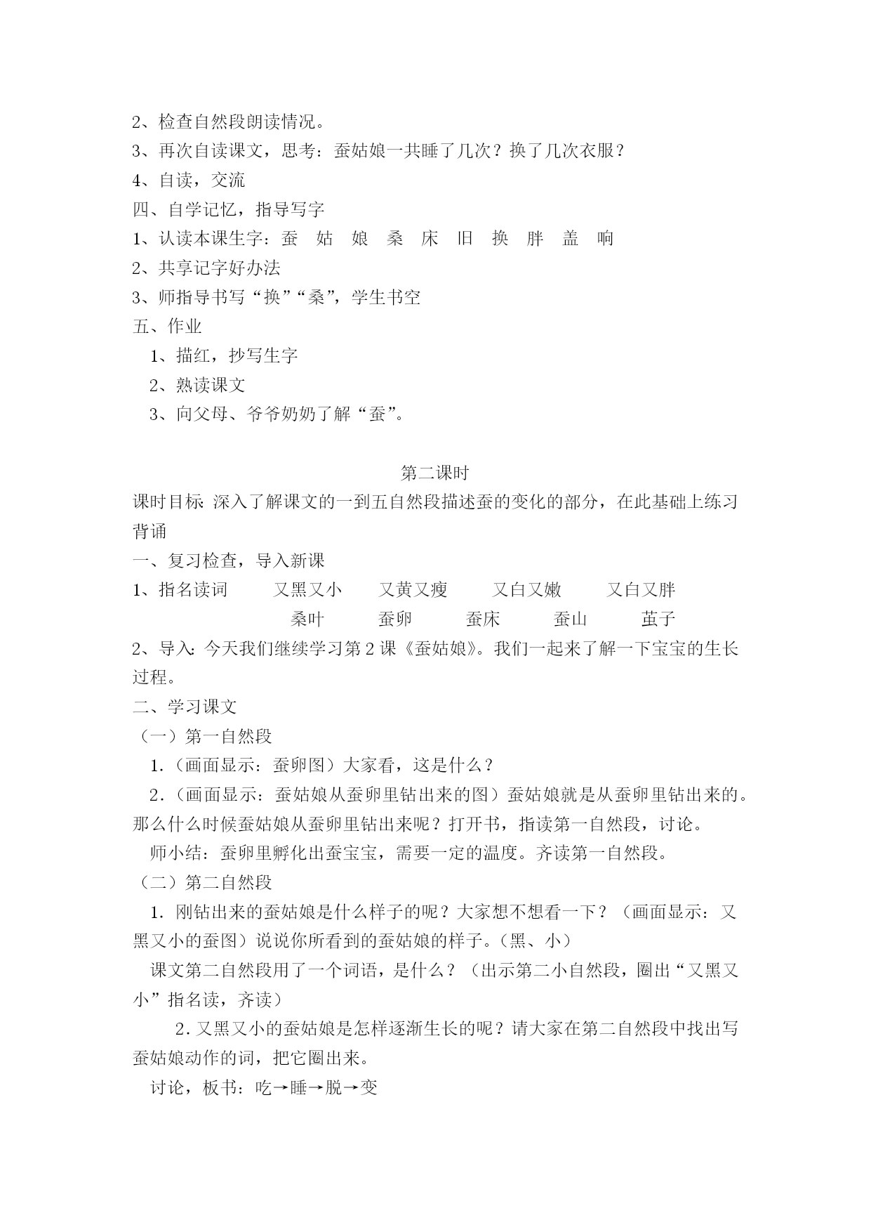 2、蚕姑娘教学目标:1、能正确、流利、有感情地朗读和背诵课文。2、学会本课10个生字,两条绿线内的4个字只识不写。理解由生字组成的词语。3、初步了解蚕的生长过程,激发学生观察、研究昆虫的兴趣。教学重难点:1、学习生字,正确书写。朗读课文。2、通过学习课文,初步了解蚕的一生。教学准备:多媒体课件教学时间:三课时教学过程:第一课时课时目标:读准课文中的生字词,读通课文,初步了解蚕的变化过程一、揭题、教学生字。1、出示“蚕”的图画今天,老师给小朋友带来一个新朋友,是什么呀?(蚕)2、出示生字“蚕”请小朋友把这个字的音读准。你用什么方法记住这个字?古时候的人们把蚕称作"天虫",蚕能吐丝结茧织成美丽的丝巾。我们亲切地把它称作"蚕宝宝",而这里小作者亲切地把它称作"蚕姑娘",谁来亲切地叫它一声?(指名读)让我们一起亲切地叫它一声"蚕姑娘"!(齐读)3、蚕姑娘非常可爱,我们先来听一听课文录音。二、听课文录音,初步感知课文内容。小朋友们,你们喜欢这可爱又有用的蚕姑娘吗?三、练读检查,读通课文(一)按要求练读课文1、第一遍自己大声读课文,标出自然段序号,遇到生字多读几遍,读准字音。2、第二遍于同桌按自然段轮读,指出读得错误或不流利的地方,并练习改正。3、第三遍两人齐读。(二)检查自读情况1、出示文中字词,开火车读蚕卵桑叶蚕床脱下蛾姑娘又白又嫩一声不响茧子渐渐长胖吐出旧衣裳又黄又瘦盖新房2、检查自然段朗读情况。3、再次自读课文,思考:蚕姑娘一共睡了几次?换了几次衣服?4、自读,交流四、自学记忆,指导写字1、认读本课生字:蚕姑娘桑床旧换胖盖响2、共享记字好办法3、师指导书写“换”“桑”,学生书空五、作业1、描红,抄写生字2、熟读课文3、向父母、爷爷奶奶了解“蚕”。第二课时课时目标:深入了解课文的一到五自然段描述蚕的变化的部分,在此基础上练习背诵一、复习检查,导入新课1、指名读词又黑又小又黄又瘦又白又嫩又白又胖桑叶蚕卵蚕床蚕山茧子2、导入:今天我们继续学习第2课《蚕姑娘》。我们一起来了解一下宝宝的生长过程。二、学习课文(一)第一自然段1.(画面显示:蚕卵图)大家看,这是什么?2.(画面显示:蚕姑娘从蚕卵里钻出来的图)蚕姑娘就是从蚕卵里钻出来的。那么什么时候蚕姑娘从蚕卵里钻出来呢?打开书,指读第一自然段,讨论。师小结:蚕卵里孵化出蚕宝宝,需要一定的温度。齐读第一自然段。(二)第二自然段1.刚钻出来的蚕姑娘是什么样子的呢?大家想不想看一下?(画面显示:又黑又小的蚕图)说说你所看到的蚕姑娘的样子。(黑、小)课文第二自然段用了一个词语,是什么?(出示第二小自然段,圈出“又黑又小”指名读,齐读)2.又黑又小的蚕姑娘是怎样逐渐生长的呢?请大家在第二自然段中找出写蚕姑娘动作的词,把它圈出来。讨论,板书:吃→睡→脱→变师:这里讲蚕姑娘吃了几天桑叶,就睡在蚕床上,不吃也不动,脱下黑衣裳,这就叫作“蚕眠”(板书,读一下这个词)。蚕眠一次就蜕一次皮,就长大一些。练读句1。蚕眠后有什么变化?(根据讨论,黄色点“变”,红色点“黄”)练读句2。(喜爱、喜悦)3.指读第二自然段、评价、再指读、齐读。4.练背[出示填空:()的蚕姑娘,吃了(),就睡在(),(),脱下()。醒了,醒了,变成()。(自背、指背、齐背。)(三)第三~五自然段1.过渡:第一次蚕眠,黑姑娘变成了黄姑娘。(画面显示:又黄又瘦的蚕图)黄姑娘又是怎样生长变化的呢?蚕的一生到底要眠几次呢?板书:(又黑又小)→(又黄又瘦)→()→()→()轻读三~五自然段。这三个自然段在句式结构上与第二自然段基本相同,但有个别的词、句改变了,请把改变的地方划出来,多读读。2.交流:(1)蚕姑娘一生要眠几次?(四次)[板书](2)它的外型、颜色有什么变化呢?我们来看:刚从蚕卵里钻出来的蚕姑娘是又黑又小的,第一次蚕眠后,变得又黄又瘦,第二次眠后,变得又白又嫩,第三次眠后,变得又白又胖,第四次蚕眠后呢?书上并没有“又白又亮”这个词,你是怎么知道的?(边问边显示图与词)3、下面我们来细看每一小自然段。(画面显示:第三自然段)(“又黄又瘦”、“又”、“黄”、“白”变色)练读。第二次蚕眠后,黄姑娘变成了白姑娘。(画面显示:又白又嫩的蚕图)(画面显示:第四自然段)(与第二节不同之处变色)练读。我们来看一下发胖的蚕姑娘。(画面显示:又白又胖的蚕图)(画面显示:第五自然段)(与第二节不同之处变色)练读。看一下发亮的蚕图。(画面显示:又白又亮的蚕图)4.小结:(画面显示:四次蚕眠的变化过程图)蚕的一生要经过四眠,吃吃睡睡,逐渐长大。由最初的又黑又小→又黄又瘦→又白又嫩→又白又胖→又白又亮,发生着许