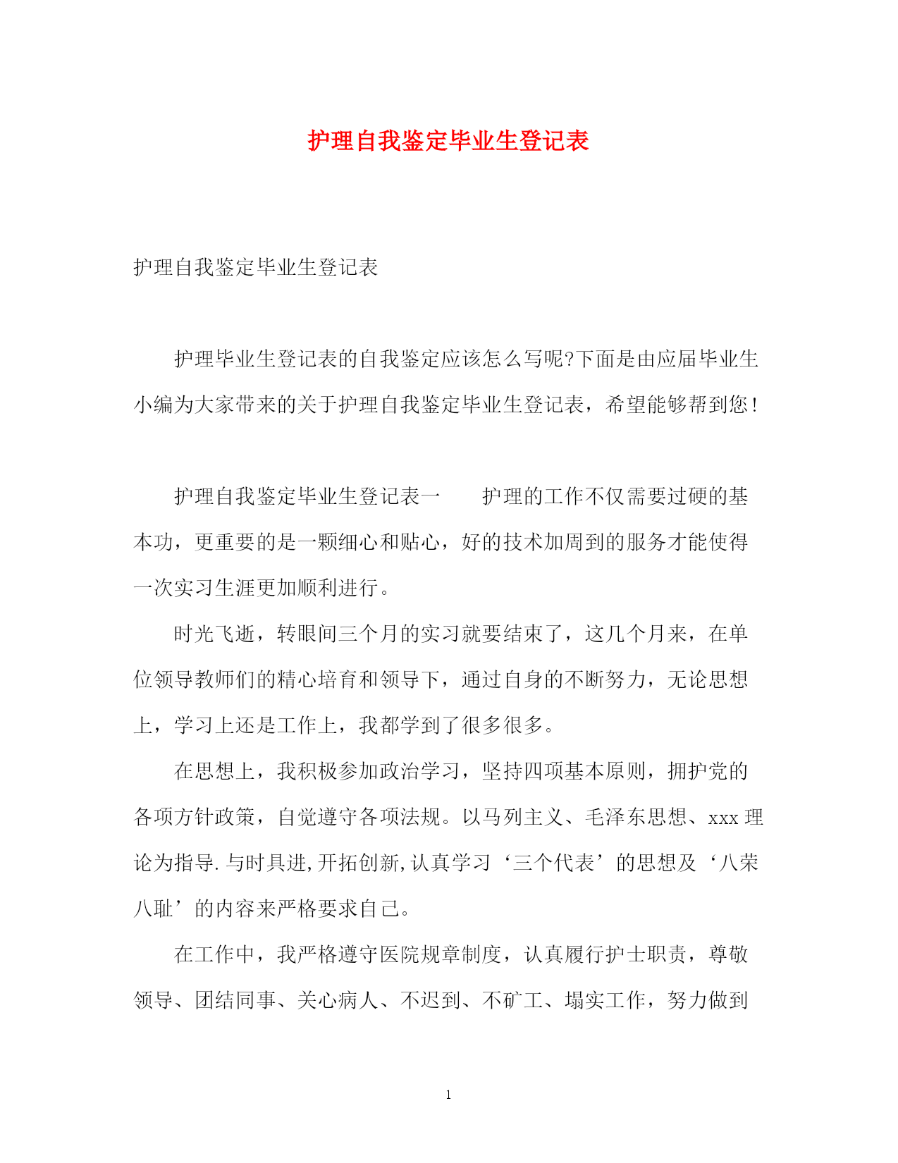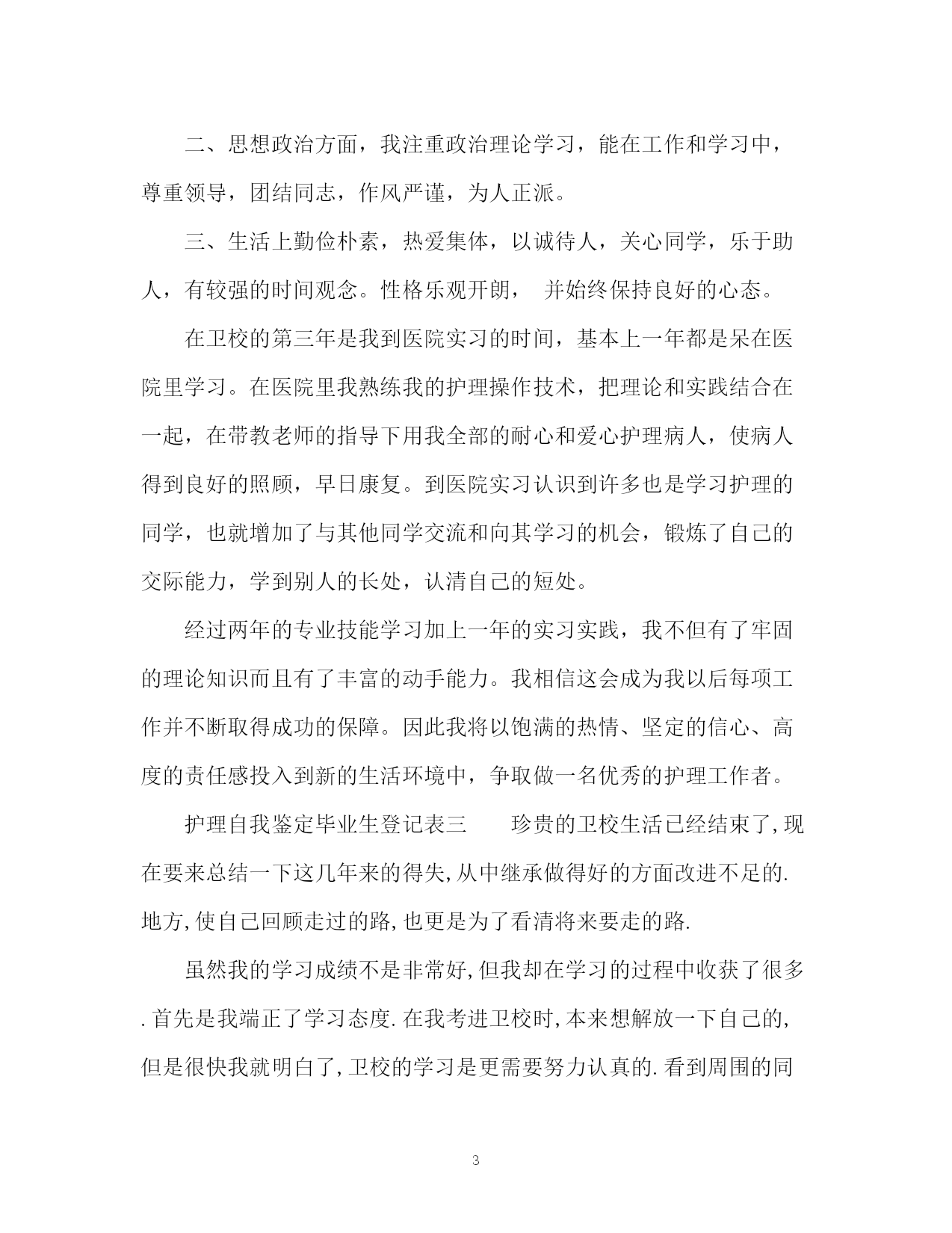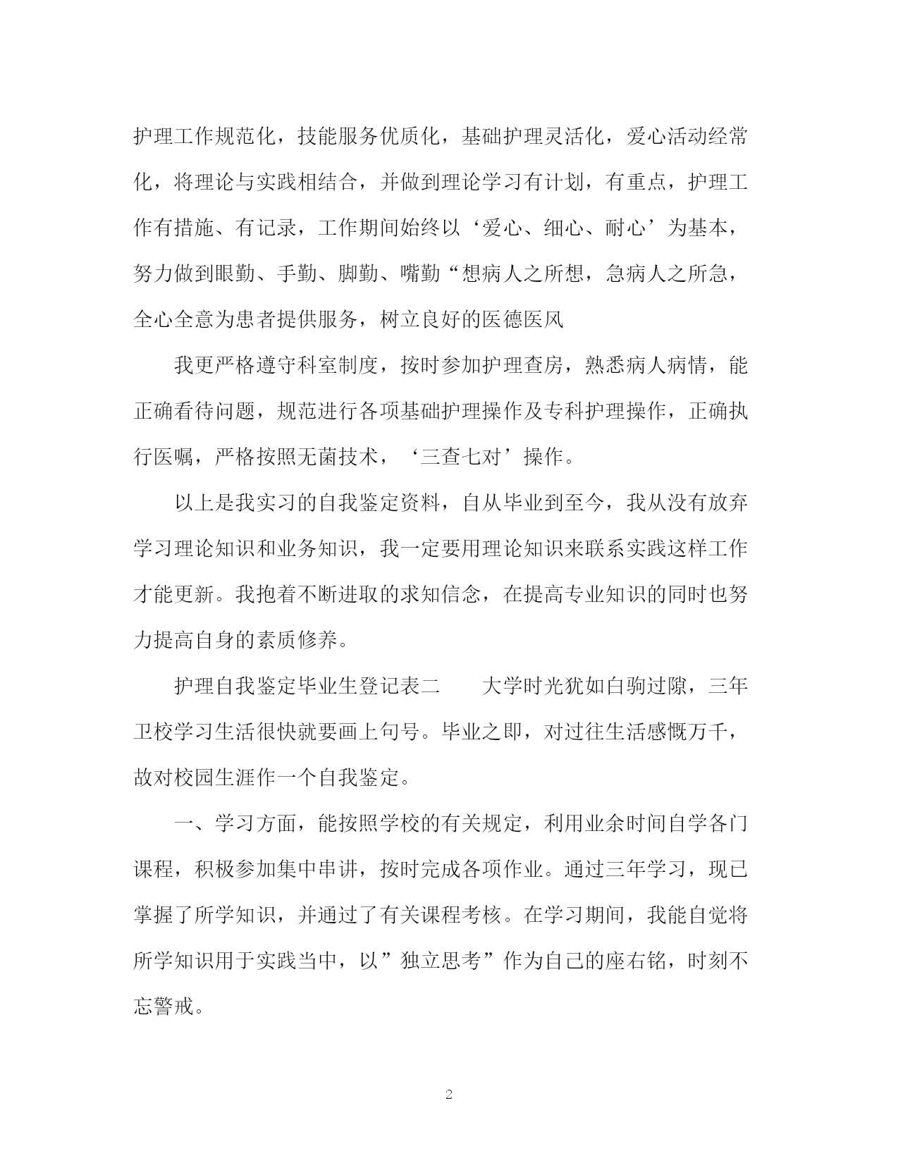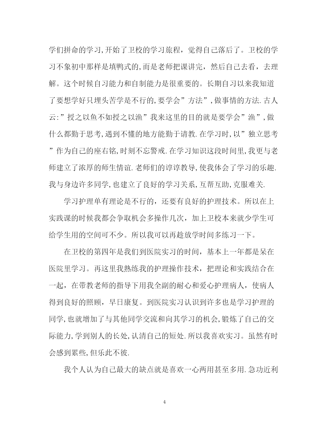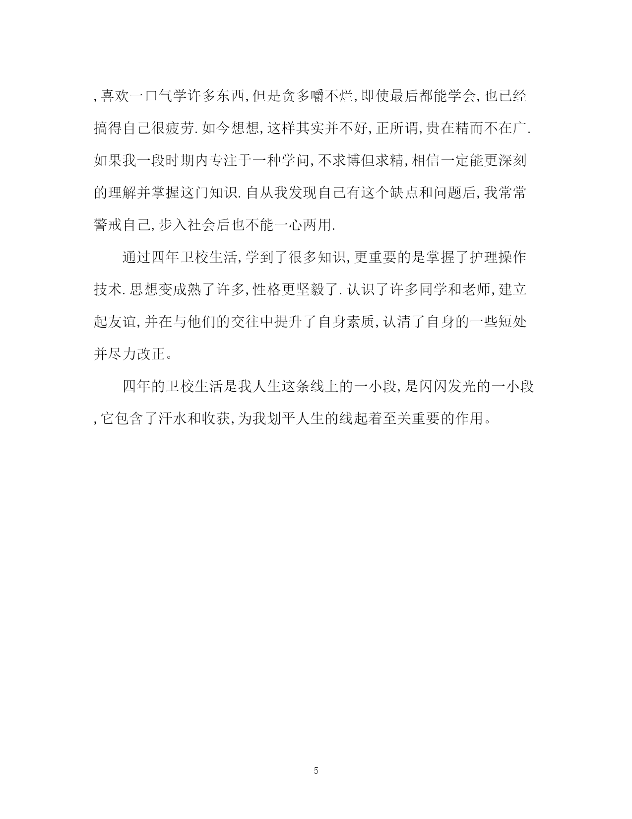 此资料由网络收集而来,如有侵权请告知上传者立即删除。资料共分享,我们负责传递知识。PAGEPAGE5护理自我鉴定毕业生登记表护理自我鉴定毕业生登记表护理毕业生登记表的自我鉴定应该怎么写呢?下面是由应届毕业生小编为大家带来的关于护理自我鉴定毕业生登记表,希望能够帮到您!护理自我鉴定毕业生登记表一护理的工作不仅需要过硬的基本功,更重要的是一颗细心和贴心,好的技术加周到的服务才能使得一次实习生涯更加顺利进行。时光飞逝,转眼间三个月的实习就要结束了,这几个月来,在单位领导教师们的精心培育和领导下,通过自身的不断努力,无论思想上,学习上还是工作上,我都学到了很多很多。在思想上,我积极参加政治学习,坚持四项基本原则,拥护党的各项方针政策,自觉遵守各项法规。以马列主义、毛泽东思想、xxx理论为指导.与时具进,开拓创新,认真学习‘三个代表’的思想及‘八荣八耻’的内容来严格要求自己。在工作中,我严格遵守医院规章制度,认真履行护士职责,尊敬领导、团结同事、关心病人、不迟到、不矿工、塌实工作,努力做到护理工作规范化,技能服务优质化,基础护理灵活化,爱心活动经常化,将理论与实践相结合,并做到理论学习有计划,有重点,护理工作有措施、有记录,工作期间始终以‘爱心、细心、耐心’为基本,努力做到眼勤、手勤、脚勤、嘴勤“想病人之所想,急病人之所急,全心全意为患者提供服务,树立良好的医德医风我更严格遵守科室制度,按时参加护理查房,熟悉病人病情,能正确看待问题,规范进行各项基础护理操作及专科护理操作,正确执行医嘱,严格按照无菌技术,‘三查七对’操作。以上是我实习的自我鉴定资料,自从毕业到至今,我从没有放弃学习理论知识和业务知识,我一定要用理论知识来联系实践这样工作才能更新。我抱着不断进取的求知信念,在提高专业知识的同时也努力提高自身的素质修养。护理自我鉴定毕业生登记表二大学时光犹如白驹过隙,三年卫校学习生活很快就要画上句号。毕业之即,对过往生活感慨万千,故对校园生涯作一个自我鉴定。一、学习方面,能按照学校的有关规定,利用业余时间自学各门课程,积极参加集中串讲,按时完成各项作业。通过三年学习,现已掌握了所学知识,并通过了有关课程考核。在学习期间,我能自觉将所学知识用于实践当中,以”独立思考”作为自己的座右铭,时刻不忘警戒。二、思想政治方面,我注重政治理论学习,能在工作和学习中,尊重领导,团结同志,作风严谨,为人正派。三、生活上勤俭朴素,热爱集体,以诚待人,关心同学,乐于助人,有较强的时间观念。性格乐观开朗,并始终保持良好的心态。在卫校的第三年是我到医院实习的时间,基本上一年都是呆在医院里学习。在医院里我熟练我的护理操作技术,把理论和实践结合在一起,在带教老师的指导下用我全部的耐心和爱心护理病人,使病人得到良好的照顾,早日康复。到医院实习认识到许多也是学习护理的同学,也就增加了与其他同学交流和向其学习的机会,锻炼了自己的交际能力,学到别人的长处,认清自己的短处。经过两年的专业技能学习加上一年的实习实践,我不但有了牢固的理论知识而且有了丰富的动手能力。我相信这会成为我以后每项工作并不断取得成功的保障。因此我将以饱满的热情、坚定的信心、高度的责任感投入到新的生活环境中,争取做一名优秀的护理工作者。护理自我鉴定毕业生登记表三珍贵的卫校生活已经结束了,现在要来总结一下这几年来的得失,从中继承做得好的方面改进不足的.地方,使自己回顾走过的路,也更是为了看清将来要走的路.虽然我的学习成绩不是非常好,但我却在学习的过程中收获了很多.首先是我端正了学习态度.在我考进卫校时,本来想解放一下自己的,但是很快我就明白了,卫校的学习是更需要努力认真的.看到周围的同学们拼命的学习,开始了卫校的学习旅程,觉得自己落后了。卫校的学习不象初中那样是填鸭式的,而是老师把课讲完,然后自己去看,去理解。这个时候自习能力和自制能力是很重要的。长期自习以来我知道了要想学好只埋头苦学是不行的,要学会”方法”,做事情的方法.古人云:”授之以鱼不如授之以渔”我来这里的目的就是要学会”渔”,做什么都勤于思考,遇到不懂的地方能勤于请教.在学习时,以”独立思考”作为自己的座右铭,时刻不忘警戒.在学习知识这段时间里,我更与老师建立了浓厚的师生情谊.老师们的谆谆教导,使我体会了学习的乐趣.我与身边许多同学,也建立了良好的学习关系,互帮互助,克服难关.学习护理单有理论是不行的,还要有良好的护理技术。所以在上实践课的时候我都会争取机会多操作几次,加上卫校本来就少学生可给学生用的空间可不少。所以我可以再趁放学时间多练习一下。在卫校的第四年是我们到医院实习的时间,基本上一年都是呆在医院里学习。再这里我熟练我的护理操作技术,把理论和实践结合在一起,在带教老师的指导下用我全