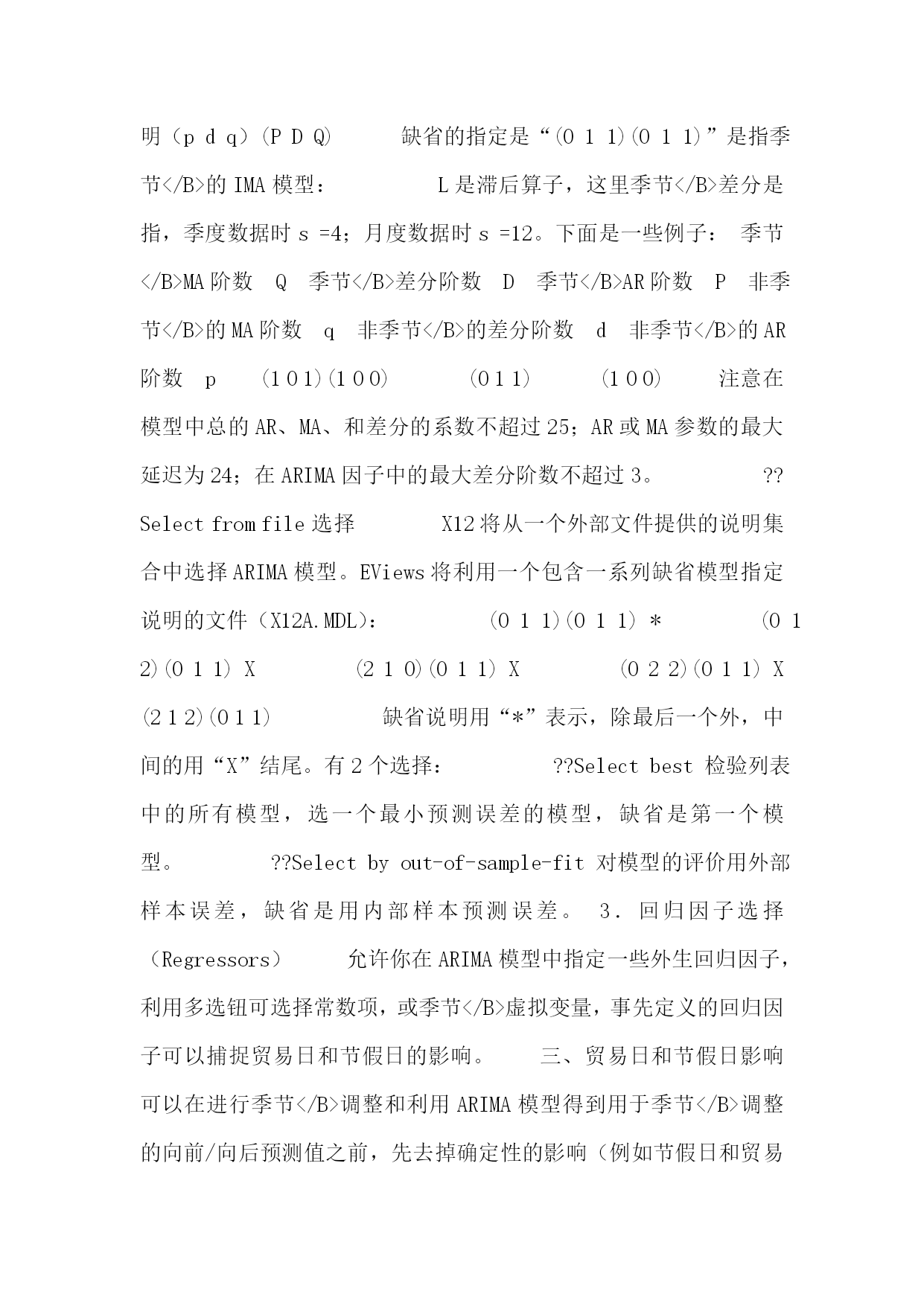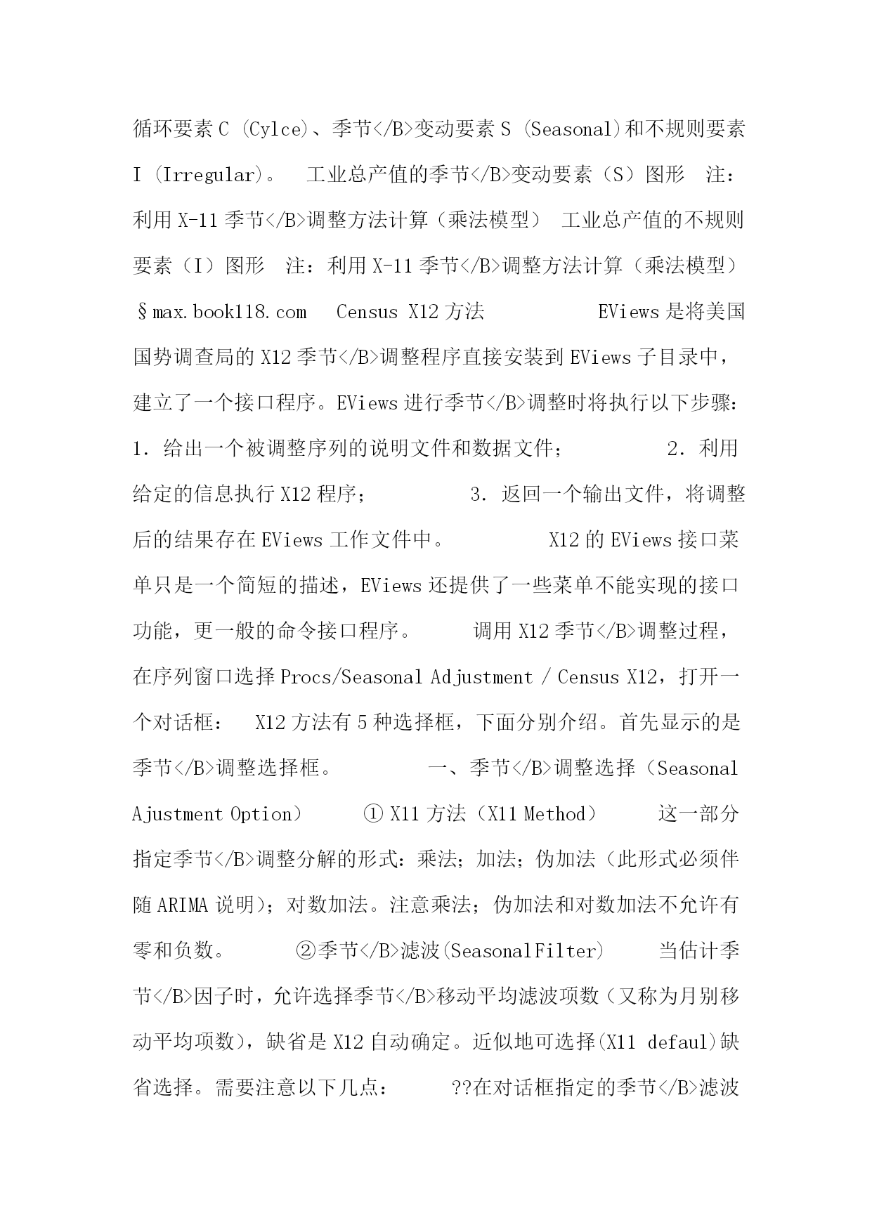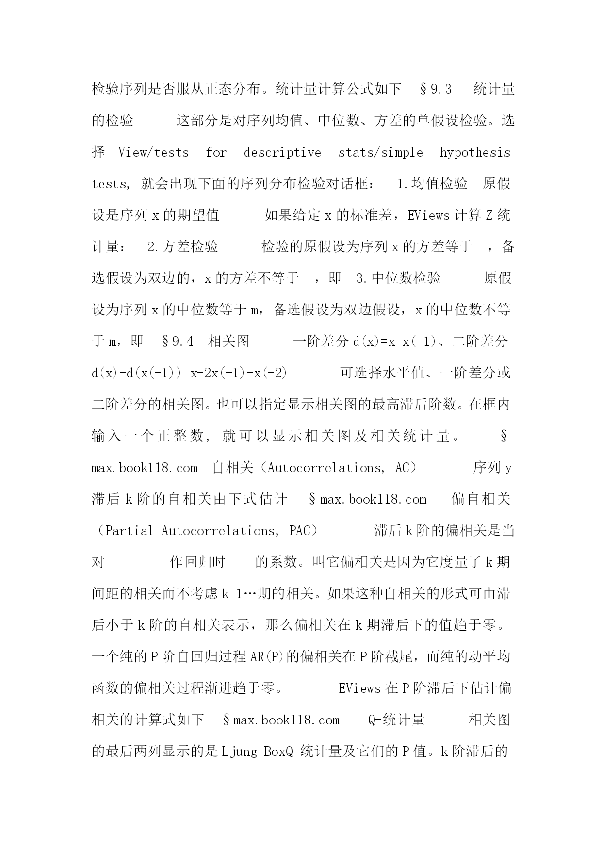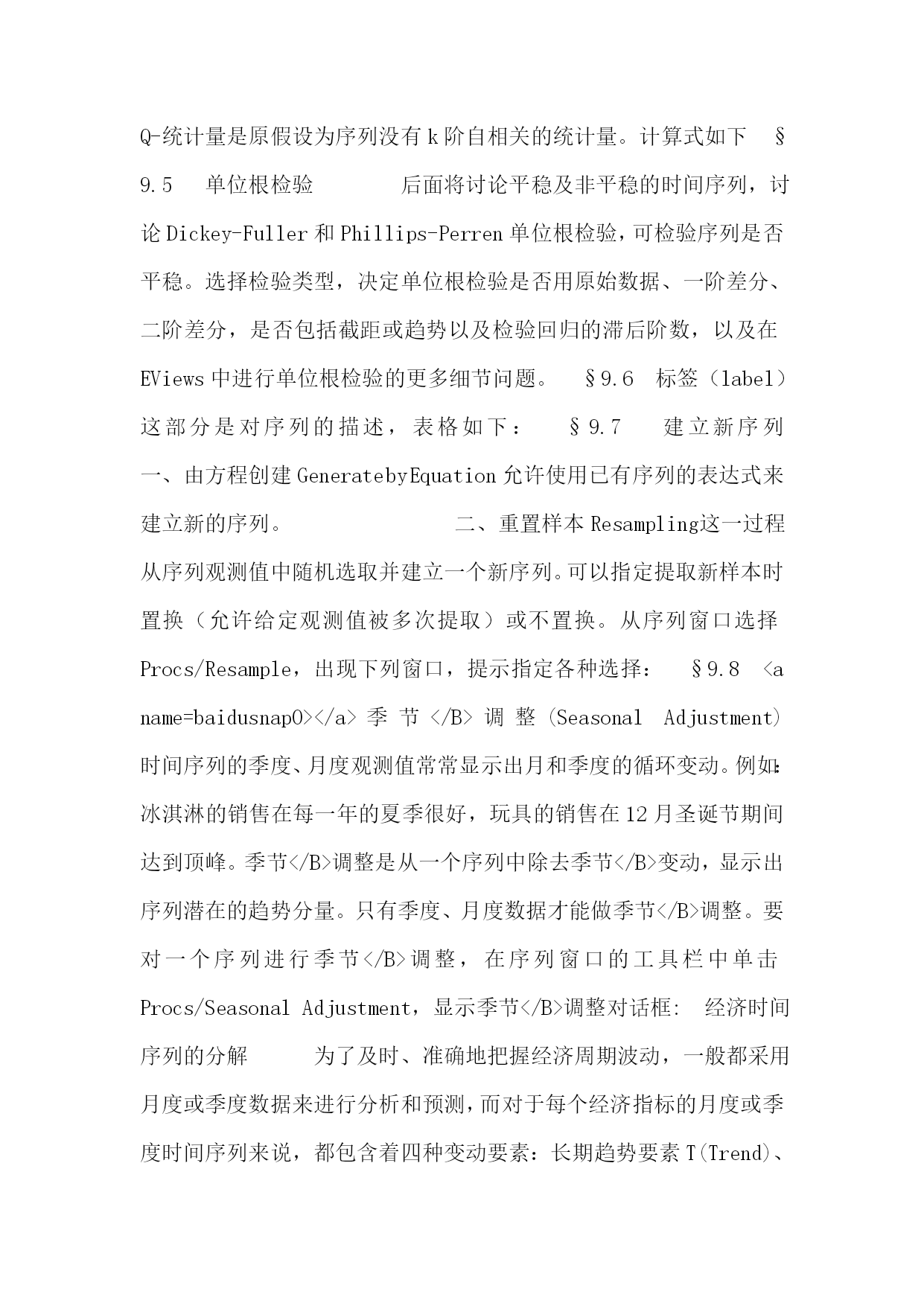 第九章序列EViews提供序列的各种统计图、统计方法及过程。当用前面描述的方法向工作文件中读入数据后,就可以对这些数据进行统计分析和图表分析。§9.1表单和图示打开工作文件,双击一个序列名或者在单击序列名后单击“show”,即进入序列的对话框。单击“view”可看到菜单分为四个区,第一部分为序列显示形式,第二和第三部分提供数据统计方法,第四部分是转换选项和标签。表单和图示:表单:用表单的形式显示原始数据。曲线图:按时间顺序或者将观测值一一连线显示。这种方法最适用于时间序列。直方图:用柱形显示数据。这种方法适用于显示那些只有微小变化的序列。钉形图:用直线显示数据。即用垂直的钉形线显示数据。季度分区图、季度连线图:这些方法按季度或月度显示数据,适用于数据频度为季度和月度的工作文件。季度分区图把数据按季(月)度分成四个区,每年同一季(月)度的数据进行连线。同时每个季(月)度的期望值水平也显示出来。季度连线图是在同一坐标轴上把每年同一季(月)度的数据连线显示。§9.2描述统计量以直方图显示序列的频率分布。直方图将序列的长度按等间距划分,显示观测值落入每一个区间的个数。同直方图一起显示的还有一些标准的描述统计量。这些统计量都是由样本中的观测值计算出来的。如图:均值(mean)即序列的平均值,用序列数据的总和除以数据的个数。偏度(Skewness)衡量序列分布围绕其均值的非对称性。计算公式如下峰度(Kurtosis)度量序列分布的凸起或平坦程度,计算公式如下Jarque-Bera检验检验序列是否服从正态分布。统计量计算公式如下§9.3统计量的检验这部分是对序列均值、中位数、方差的单假设检验。选择View/testsfordescriptivestats/simplehypothesistests,就会出现下面的序列分布检验对话框:1.均值检验原假设是序列x的期望值如果给定x的标准差,EViews计算Z统计量:2.方差检验检验的原假设为序列x的方差等于,备选假设为双边的,x的方差不等于,即3.中位数检验原假设为序列x的中位数等于m,备选假设为双边假设,x的中位数不等于m,即§9.4相关图一阶差分d(x)=x-x(-1)、二阶差分d(x)-d(x(-1))=x-2x(-1)+x(-2)可选择水平值、一阶差分或二阶差分的相关图。也可以指定显示相关图的最高滞后阶数。在框内输入一个正整数,就可以显示相关图及相关统计量。§max.book118.com自相关(Autocorrelations,AC)序列y滞后k阶的自相关由下式估计§max.book118.com偏自相关(PartialAutocorrelations,PAC)滞后k阶的偏相关是当对作回归时的系数。叫它偏相关是因为它度量了k期间距的相关而不考虑k-1…期的相关。如果这种自相关的形式可由滞后小于k阶的自相关表示,那么偏相关在k期滞后下的值趋于零。一个纯的P阶自回归过程AR(P)的偏相关在P阶截尾,而纯的动平均函数的偏相关过程渐进趋于零。EViews在P阶滞后下估计偏相关的计算式如下§max.book118.comQ-统计量相关图的最后两列显示的是Ljung-BoxQ-统计量及它们的P值。k阶滞后的Q-统计量是原假设为序列没有k阶自相关的统计量。计算式如下§9.5单位根检验后面将讨论平稳及非平稳的时间序列,讨论Dickey-Fuller和Phillips-Perren单位根检验,可检验序列是否平稳。选择检验类型,决定单位根检验是否用原始数据、一阶差分、二阶差分,是否包括截距或趋势以及检验回归的滞后阶数,以及在EViews中进行单位根检验的更多细节问题。§9.6标签(label)这部分是对序列的描述,表格如下:§9.7建立新序列一、由方程创建GeneratebyEquation允许使用已有序列的表达式来建立新的序列。二、重置样本Resampling这一过程从序列观测值中随机选取并建立一个新序列。可以指定提取新样本时置换(允许给定观测值被多次提取)或不置换。从序列窗口选择Procs/Resample,出现下列窗口,提示指定各种选择:§9.8<aname=baidusnap0></a>季节</B>调整(SeasonalAdjustment)时间序列的季度、月度观测值常常显示出月和季度的循环变动。例如:冰淇淋的销售在每一年的夏季很好,玩具的销售在12月圣诞节期间达到顶峰。季节</B>调整是从一个序列中除去季节</B>变动,显示出序列潜在的趋势分量。只有季度、月度数据才能做季节</B>调整。要对一个序列进行季节</B>调整,在序列窗口的工具栏中单击Procs/SeasonalAdjustment,显示季节</B>调整对话框:经济时间序列的分解为了及时、准确地把握经济周期波动,一般都采用月度或季度数据