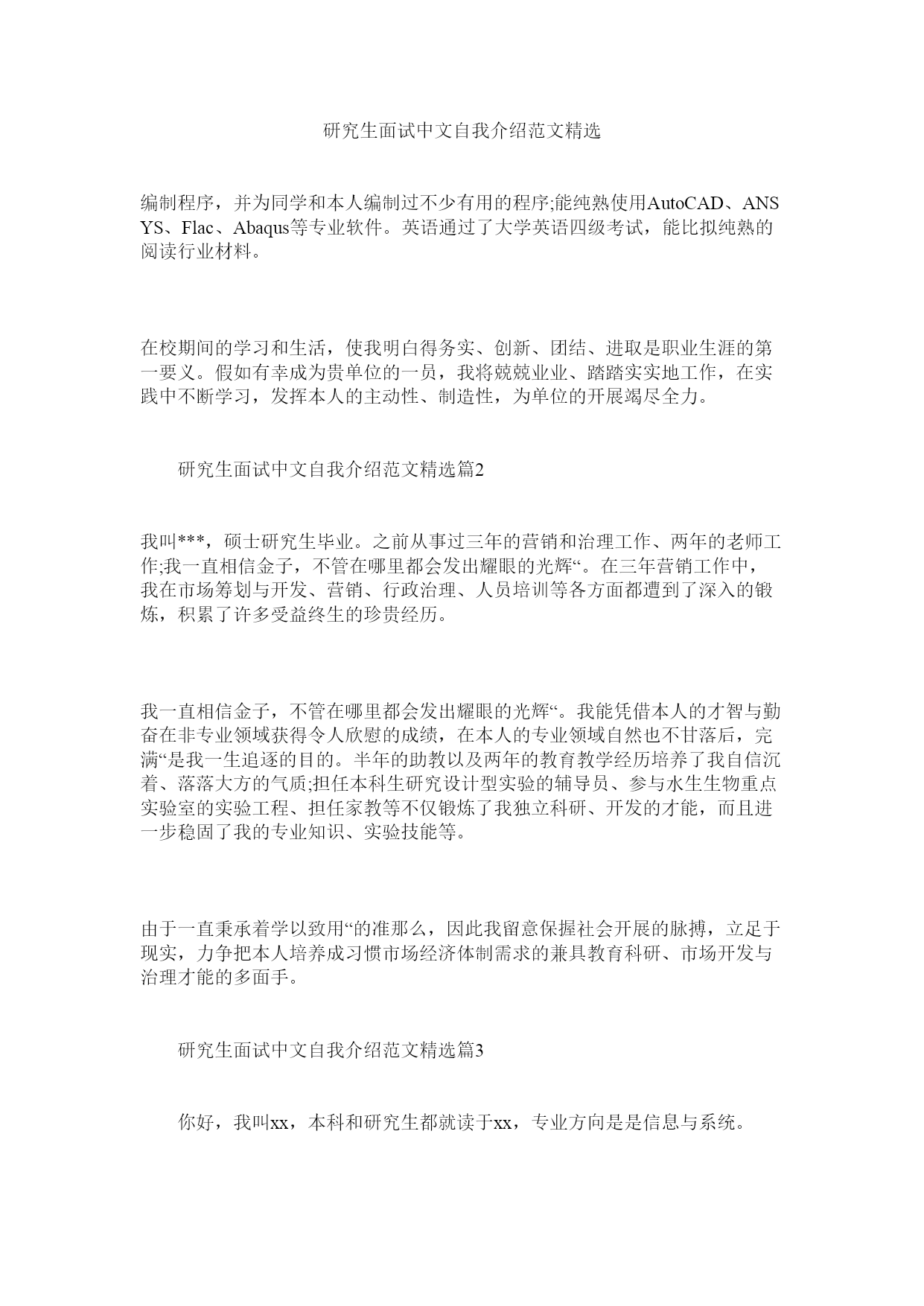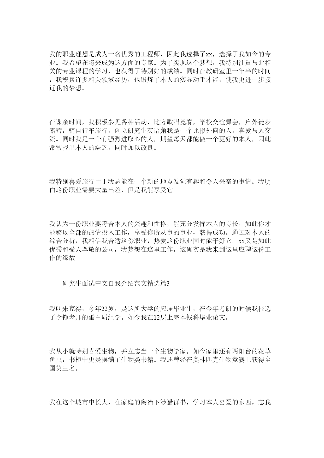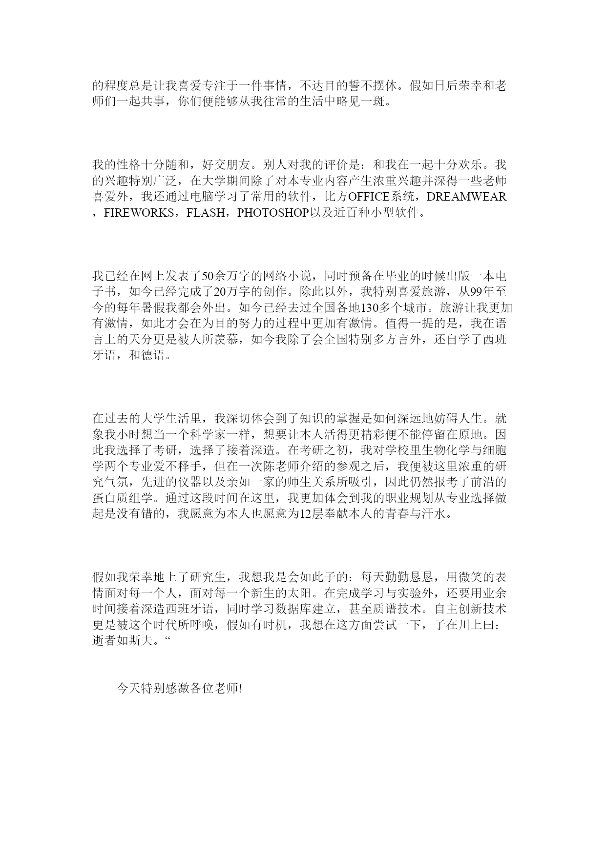 研究生面试中文自我介绍范文精选编制程序,并为同学和本人编制过不少有用的程序;能纯熟使用AutoCAD、ANSYS、Flac、Abaqus等专业软件。英语通过了大学英语四级考试,能比拟纯熟的阅读行业材料。在校期间的学习和生活,使我明白得务实、创新、团结、进取是职业生涯的第一要义。假如有幸成为贵单位的一员,我将兢兢业业、踏踏实实地工作,在实践中不断学习,发挥本人的主动性、制造性,为单位的开展竭尽全力。研究生面试中文自我介绍范文精选篇2我叫***,硕士研究生毕业。之前从事过三年的营销和治理工作、两年的老师工作;我一直相信金子,不管在哪里都会发出耀眼的光辉“。在三年营销工作中,我在市场筹划与开发、营销、行政治理、人员培训等各方面都遭到了深入的锻炼,积累了许多受益终生的珍贵经历。我一直相信金子,不管在哪里都会发出耀眼的光辉“。我能凭借本人的才智与勤奋在非专业领域获得令人欣慰的成绩,在本人的专业领域自然也不甘落后,完满“是我一生追逐的目的。半年的助教以及两年的教育教学经历培养了我自信沉着、落落大方的气质;担任本科生研究设计型实验的辅导员、参与水生生物重点实验室的实验工程、担任家教等不仅锻炼了我独立科研、开发的才能,而且进一步稳固了我的专业知识、实验技能等。由于一直秉承着学以致用“的准那么,因此我留意保握社会开展的脉搏,立足于现实,力争把本人培养成习惯市场经济体制需求的兼具教育科研、市场开发与治理才能的多面手。研究生面试中文自我介绍范文精选篇3你好,我叫xx,本科和研究生都就读于xx,专业方向是是信息与系统。我的职业理想是成为一名优秀的工程师,因此我选择了xx,选择了我如今的专业。我希望在将来成为这方面的专家。为了实现这个梦想,我特别注重与此相关的专业课程的学习,也获得了特别好的成绩。同时在教研室里一年半的时间,我积累许多相关领域经历,也锻炼了本人的实际动手才能,使我更进一步接近我的梦想。在课余时间,我积极参见各种活动,比方歌唱竞赛,学校交谊舞会,户外徒步露营,骑自行车旅行,创立研究生英语角我是一个比拟外向的人,喜爱与人交流。同时我是一个有强烈进取心的人,期望每天都能做一个更好的本人,因此常常找出本人的缺乏,同时加以改良。我特别喜爱旅行由于我总能在一个新的地点发觉有趣和令人兴奋的事情。我明白这份职业需要大量出差,但是我能享受它。我认为一份职业要符合本人的兴趣和性格,能充分发挥本人的专长,如此你才能够以全部的热情投入工作,享受你所从事的事业,获得成功。通过对本人的综合分析,我相信我合适这份职业,热爱这份职业同时能干好它。xx又是如此优秀和受人尊敬的公司,我梦想在这里工作。这确实是我来到这里应聘这份工作的缘故。研究生面试中文自我介绍范文精选篇3我叫朱家得,今年22岁,是这所大学的应届毕业生,在今年考研的时候我报选了李铮老师的蛋白质组学。如今我在12层上完本钱科毕业论文。我从小就特别喜爱生物,并立志当一个生物学家。如今家里还有两阳台的花草鱼虫,书柜中更是摆满了生物类书籍。我还曾经在奥林匹克生物竞赛上获得全国第三名。我在这个城市中长大,在家庭的陶冶下涉猎群书,学习本人喜爱的东西。忘我的程度总是让我喜爱专注于一件事情,不达目的誓不摆休。假如日后荣幸和老师们一起共事,你们便能够从我往常的生活中略见一斑。我的性格十分随和,好交朋友。别人对我的评价是:和我在一起十分欢乐。我的兴趣特别广泛,在大学期间除了对本专业内容产生浓重兴趣并深得一些老师喜爱外,我还通过电脑学习了常用的软件,比方OFFICE系统,DREAMWEAR,FIREWORKS,FLASH,PHOTOSHOP以及近百种小型软件。我已经在网上发表了50余万字的网络小说,同时预备在毕业的时候出版一本电子书,如今已经完成了20万字的创作。除此以外,我特别喜爱旅游,从99年至今的每年暑假我都会外出。如今已经去过全国各地130多个城市。旅游让我更加有激情,如此才会在为目的努力的过程中更加有激情。值得一提的是,我在语言上的天分更是被人所羡慕,如今我除了会全国特别多方言外,还自学了西班牙语,和德语。在过去的大学生活里,我深切体会到了知识的掌握是如何深远地妨碍人生。就象我小时想当一个科学家一样,想要让本人活得更精彩便不能停留在原地。因此我选择了考研,选择了接着深造。在考研之初,我对学校里生物化学与细胞学两个专业爱不释手,但在一次陈老师介绍的参观之后,我便被这里浓重的研究气氛,先进的仪器以及亲如一家的师生关系所吸引,因此仍然报考了前沿的蛋白质组学。通过这段时间在这里,我更加体会到我的职业规划从专业选择做起是没有错的,我愿意为本人也愿意为12层奉献本人的青春与汗水。假如我荣幸地上了研究生,我想我是会如此