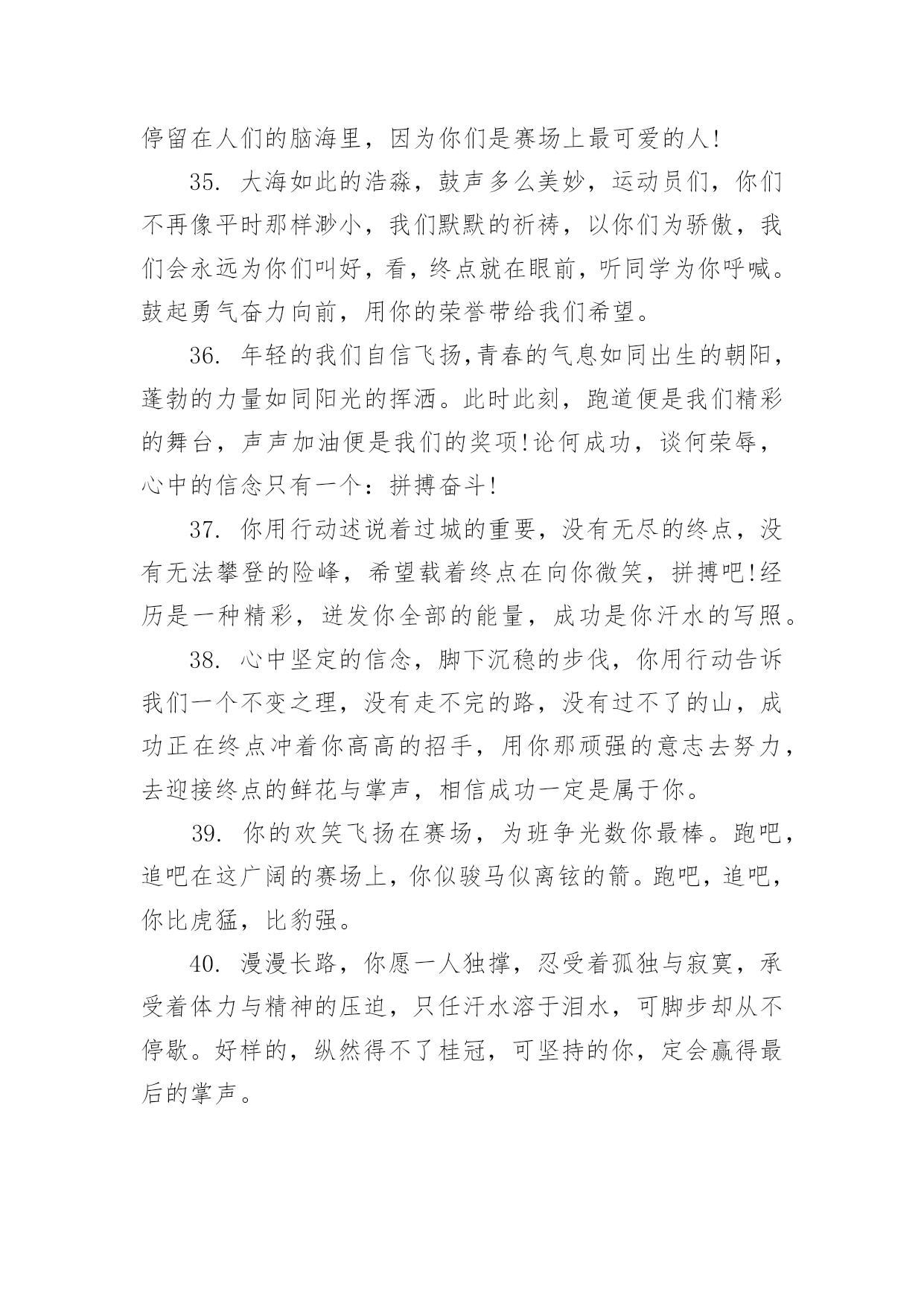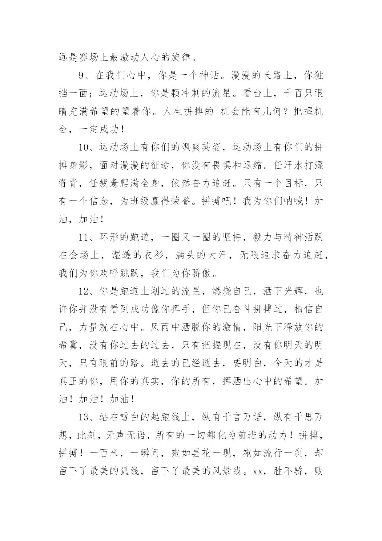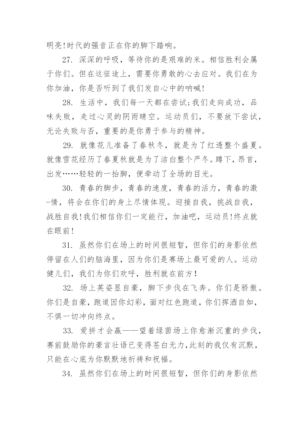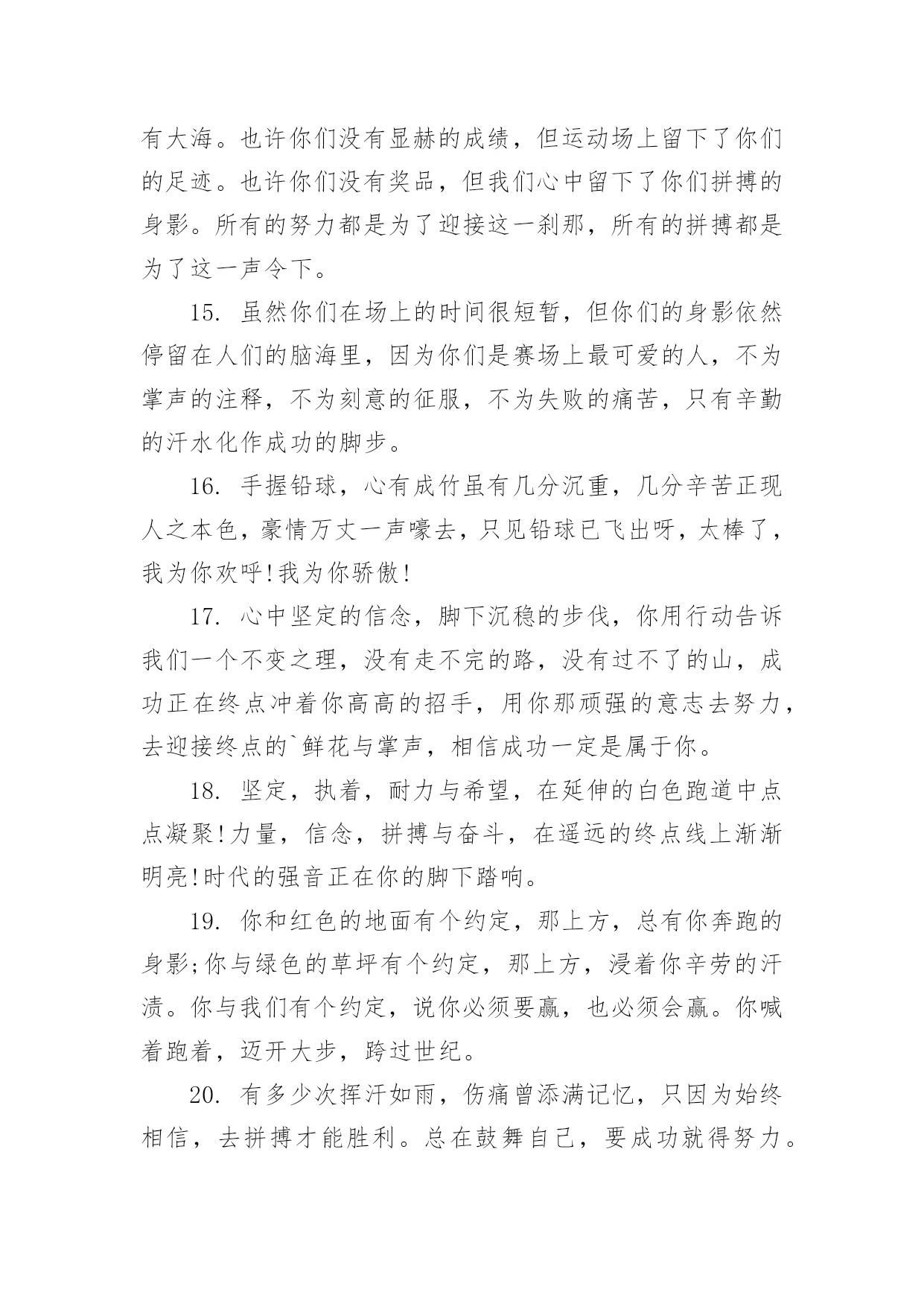 运动会加油稿运动会加油稿合集【15篇】在日新月异的现代社会中,我们很多时候都不得不用到加油稿,借助加油稿可以激励他人的士气。你知道加油稿怎样才能写的好吗?下面是小编为大家收集的运动会加油稿,仅供参考,大家一起来看看吧。运动会加油稿11.青春的脚步,青春的速度,青春的活力,青春的激情,将会在你们的身上尽情体现。迎接自我,挑战自我,战胜自我!我们相信你们一定能行,加油吧,运动员!终点就在眼前!2.温暖的阳光洒在赛场上,男子乙组标枪的比赛即将开始。赛场上,一道道优美的弧线将轻盈地划过天空。健儿们用手中的标枪向距离的权限发起一轮又一轮的挑战。标枪在空中轻盈的姿态,是健儿们强健的力量和熟练的技巧的结合。谁能在这场激烈的竞争中获胜?让我们拭目以待,让我们为他们呐喊、助威吧!只有将力量与技巧合二为一的人,才能获得胜利的桂冠!3.年轻的我们自信飞扬,青春的气息如同出生的朝阳,蓬勃的力量如同阳光的挥洒。此时此刻,跑道便是我们精彩的舞台,声声加油便是我们最高的奖项!论何成功,谈何荣辱,心中的信念只有一个:拼搏!萧瑟的秋风,挡不住你们破竹的锐气。4.不长不短的距离,需要的是全身心全程投入,自始至终你们都在拼全力此时此刻,你们处在最风光的一刻,无论第几坚持胜利的信心,只要跑下来,你们就是英雄。5.广阔的绿茵场,是为你们搭建的舞台。张扬吧,年轻的心,我们将为你永远喝彩!泰戈尔在诗中说,天空没有翅膀的影子,但我已飞过;艾青对朋友说,也许有人到达不了彼岸,但我们共同拥有大海。也许你们没有显赫的成绩,但运动场上留下了你们的足迹。也许你们没有奖品,但我们心中留下了你们拼搏的身影。所有的努力都是为了迎接这一刹那,所有的拼搏都是为了这一声令下。6.就像花儿准备了春、秋、冬,就是为了红透整个盛夏。就像雪花经历了春、夏、秋就是为了洁白整个严冬。蹲下,昂首,出发……轻轻的一抬脚,便牵动了全场的目光潇洒的迫挥挥手,便满足了那一份无言的等待。迎着朝阳,你们踏歌而去,背着希望,我们等待你们的归来。7.百米迸发的是无穷的力量,温暖的是我们的家,演绎的是团结友爱。也许你心理忐忑不安,我们的心里早已热血沸腾。8.昔日,长长的跑道上,留下了你深深的足迹,抹不去你渗出的汗水,拉不动你沉重的双脚,你为分院,不在乎自己的疲倦,不在乎汗水和泪水,因为你心里有一种坚定的信念,诺大的竞技场期待着你矫健的身影,瑟瑟的秋风为你送来爽朗的气息。9.也许流星并不少见,但它燃烧的刹那,留给人间最美丽的回忆!也许笑脸并不少见,但胜利的喜悦,总会留给世界精彩的一瞬!是的,那些曾经美妙的东西只有短短的一瞬间,但那却把最辉煌的一刻留给了人间。胜利,是每个人所追求的,胜利的喜悦,是胜利与重新开始的转折,胜利是新的开始!10.踏上跑道,是一种选择。离开起点,是一种勇气。驰骋赛场,是一种胜利。11.人生的路,有坦途,也有坎坷;做过的岁月,有欢笑,也有苦涩,泪水告诉我一个跌倒的故事,汗水使我多了一份沉重,几多成熟。12.理想毕竟不同于现实,失败是生活的一部分,谁也无法选择,无法拒绝。人生要自己去拼搏,去奋斗,在风雨中百折不挠勇往前进,在集资的每个驿站上都留下一段不悔的回忆。流泪不是失落,徘徊不是迷惑,成功属于那些战胜失败,坚持不懈勇于追求梦想的人。加油吧,运动健儿们!13.踏着春天的气息,迈着轻盈的脚步,我们迎来了心仪已久的运动会。这里就是展示自我的舞台。我们向往高山的坚忍不拔,我们渴望大海的博大精深,还有,我们更痴迷于你们的速度激情。来吧,尽情释放你的活力。你的每一次冲刺,都叩动着我们的心弦;你的每一次跨越,都吸引着我们的视线;你的每一次起跳,都绷紧我们的神经。我们为你呐喊,我们为你自豪,我们为你疯狂。14.泰戈尔在诗中说,天空没有翅膀的影子,但我已飞过;艾青对朋友说,也许有人到达不了彼岸,但我们共同拥有大海。也许你们没有显赫的成绩,但运动场上留下了你们的足迹。也许你们没有奖品,但我们心中留下了你们拼搏的身影。所有的努力都是为了迎接这一刹那,所有的拼搏都是为了这一声令下。15.虽然你们在场上的时间很短暂,但你们的身影依然停留在人们的脑海里,因为你们是赛场上最可爱的人,不为掌声的注释,不为刻意的征服,不为失败的痛苦,只有辛勤的汗水化作成功的脚步。16.手握铅球,心有成竹虽有几分沉重,几分辛苦正现人之本色,豪情万丈一声嚎去,只见铅球已飞出呀,太棒了,我为你欢呼!我为你骄傲!17.心中坚定的信念,脚下沉稳的步伐,你用行动告诉我们一个不变之理,没有走不完的路,没有过不了的山,成功正在终点冲着你高高的招手,用你那顽强的意志去努力,去迎接终点的`鲜花与掌声,相信成功一定是属于你。18.坚定,执着,耐力与希望,在延伸的白色跑道中点点凝聚!力量,信念,拼搏与奋斗,在遥远的终点线上渐渐明亮!时代的强音正在你的脚下踏响。19.你和红色