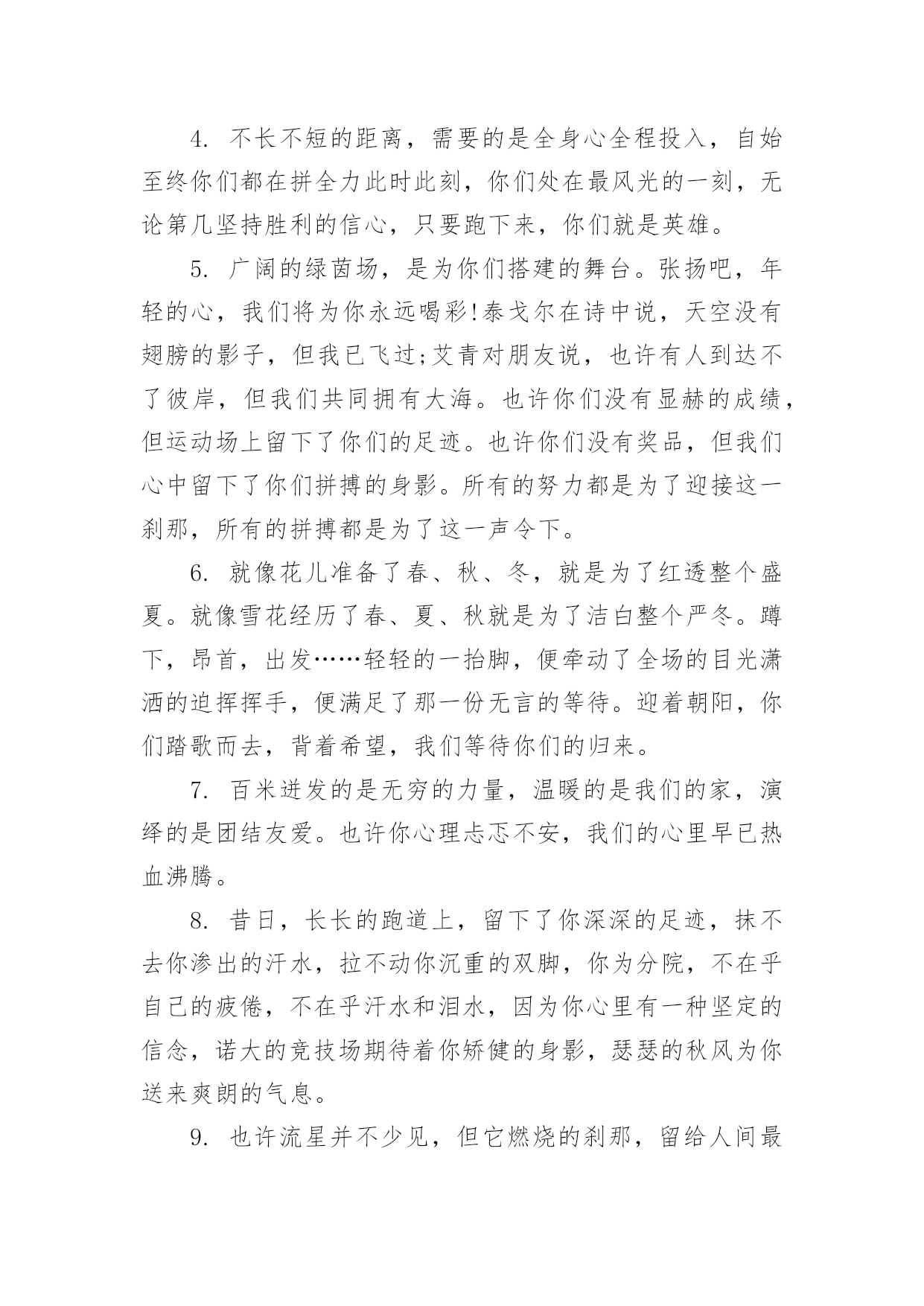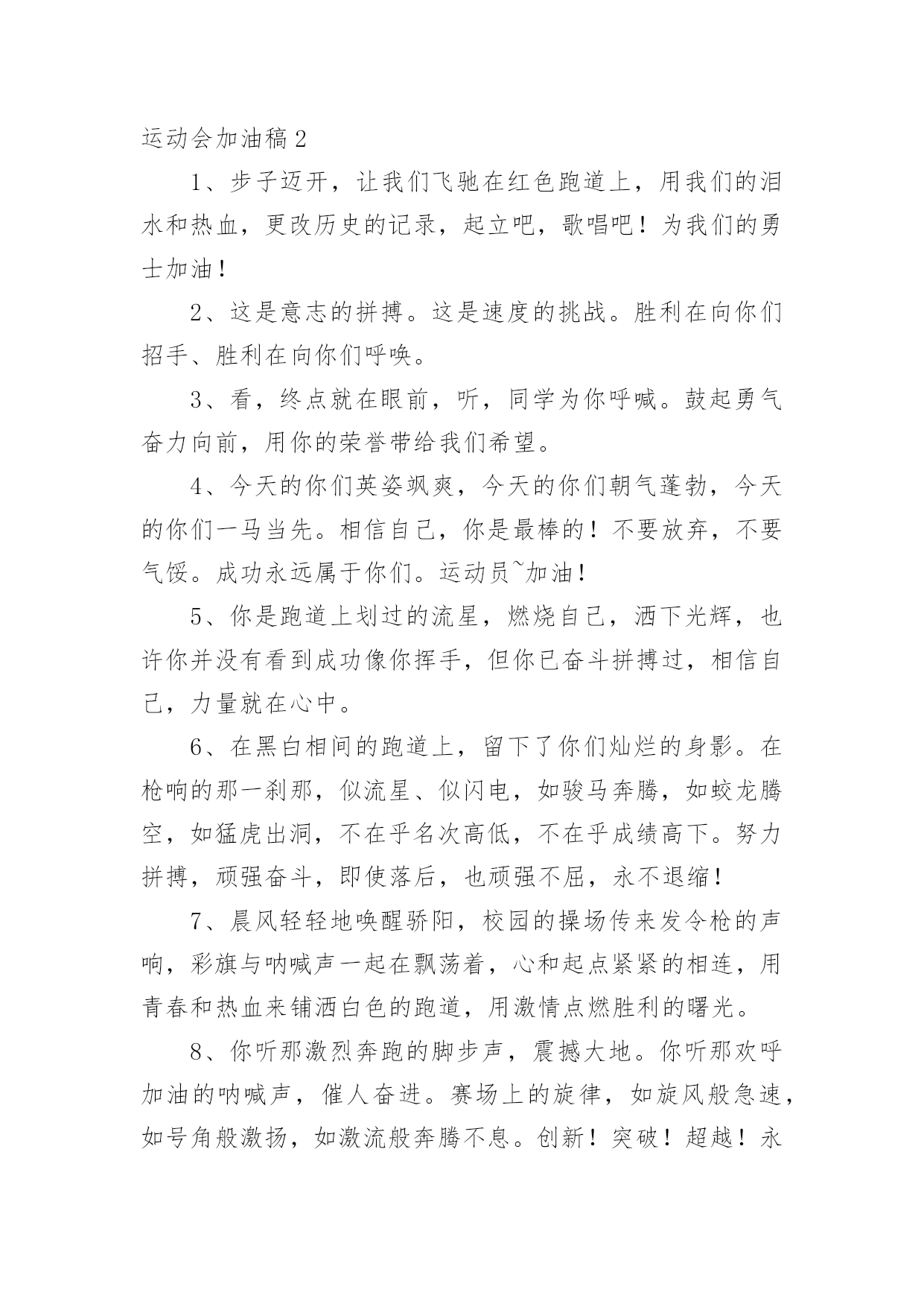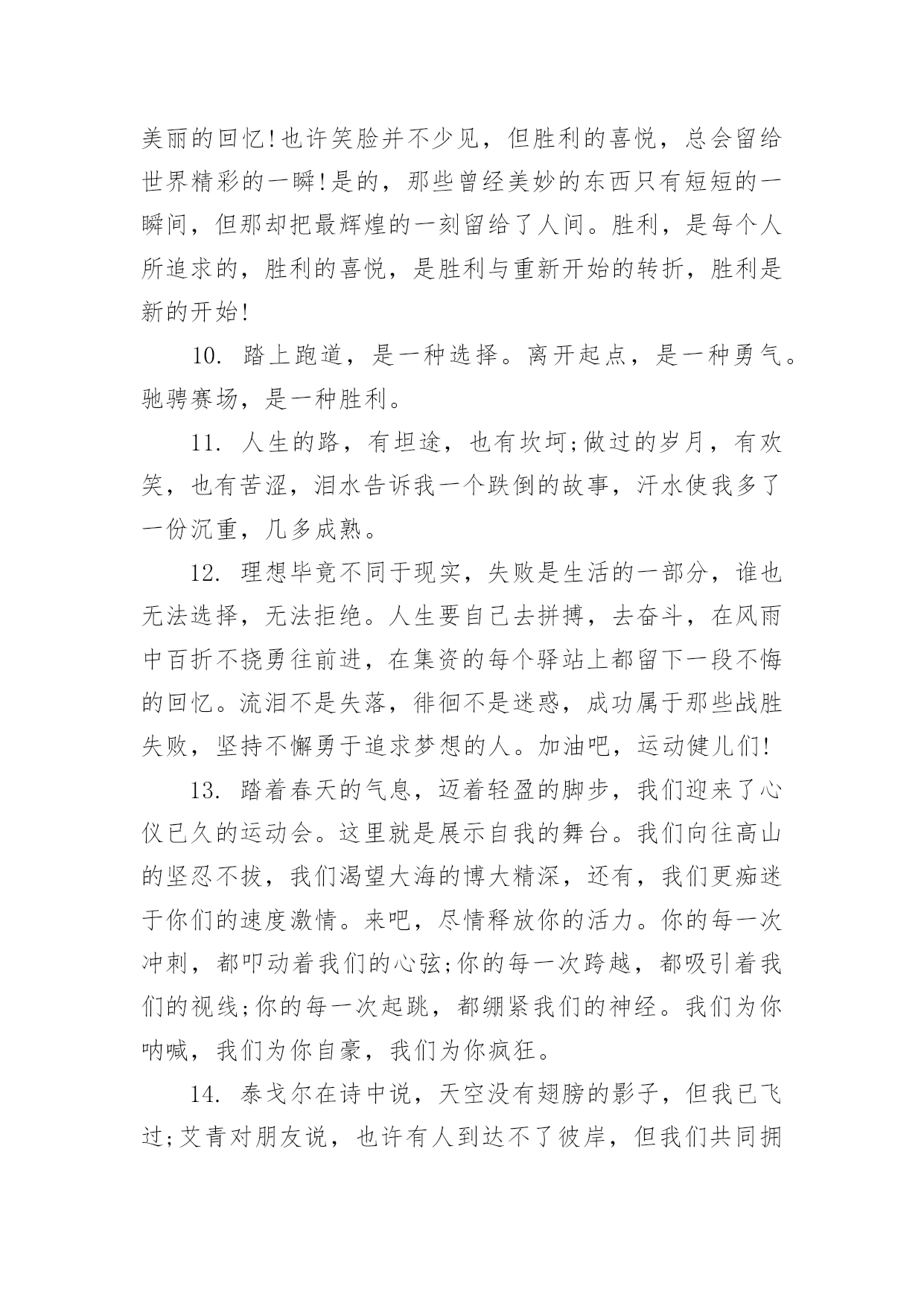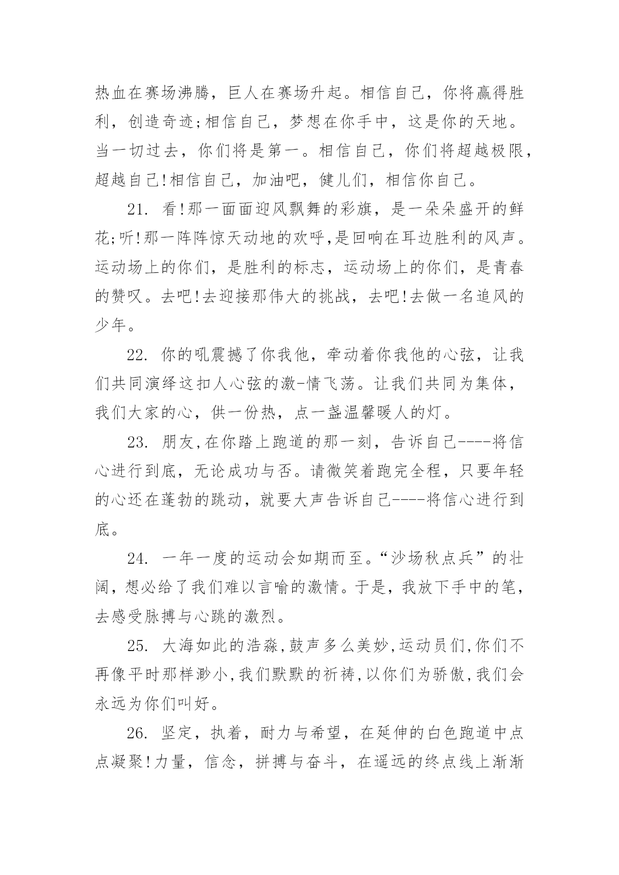运动会加油稿运动会加油稿合集【15篇】在日新月异的现代社会中,我们很多时候都不得不用到加油稿,借助加油稿可以激励他人的士气。你知道加油稿怎样才能写的好吗?下面是小编为大家收集的运动会加油稿,仅供参考,大家一起来看看吧。运动会加油稿11.青春的脚步,青春的速度,青春的活力,青春的激情,将会在你们的身上尽情体现。迎接自我,挑战自我,战胜自我!我们相信你们一定能行,加油吧,运动员!终点就在眼前!2.温暖的阳光洒在赛场上,男子乙组标枪的比赛即将开始。赛场上,一道道优美的弧线将轻盈地划过天空。健儿们用手中的标枪向距离的权限发起一轮又一轮的挑战。标枪在空中轻盈的姿态,是健儿们强健的力量和熟练的技巧的结合。谁能在这场激烈的竞争中获胜?让我们拭目以待,让我们为他们呐喊、助威吧!只有将力量与技巧合二为一的人,才能获得胜利的桂冠!3.年轻的我们自信飞扬,青春的气息如同出生的朝阳,蓬勃的力量如同阳光的挥洒。此时此刻,跑道便是我们精彩的舞台,声声加油便是我们最高的奖项!论何成功,谈何荣辱,心中的信念只有一个:拼搏!萧瑟的秋风,挡不住你们破竹的锐气。4.不长不短的距离,需要的是全身心全程投入,自始至终你们都在拼全力此时此刻,你们处在最风光的一刻,无论第几坚持胜利的信心,只要跑下来,你们就是英雄。5.广阔的绿茵场,是为你们搭建的舞台。张扬吧,年轻的心,我们将为你永远喝彩!泰戈尔在诗中说,天空没有翅膀的影子,但我已飞过;艾青对朋友说,也许有人到达不了彼岸,但我们共同拥有大海。也许你们没有显赫的成绩,但运动场上留下了你们的足迹。也许你们没有奖品,但我们心中留下了你们拼搏的身影。所有的努力都是为了迎接这一刹那,所有的拼搏都是为了这一声令下。6.就像花儿准备了春、秋、冬,就是为了红透整个盛夏。就像雪花经历了春、夏、秋就是为了洁白整个严冬。蹲下,昂首,出发……轻轻的一抬脚,便牵动了全场的目光潇洒的迫挥挥手,便满足了那一份无言的等待。迎着朝阳,你们踏歌而去,背着希望,我们等待你们的归来。7.百米迸发的是无穷的力量,温暖的是我们的家,演绎的是团结友爱。也许你心理忐忑不安,我们的心里早已热血沸腾。8.昔日,长长的跑道上,留下了你深深的足迹,抹不去你渗出的汗水,拉不动你沉重的双脚,你为分院,不在乎自己的疲倦,不在乎汗水和泪水,因为你心里有一种坚定的信念,诺大的竞技场期待着你矫健的身影,瑟瑟的秋风为你送来爽朗的气息。9.也许流星并不少见,但它燃烧的刹那,留给人间最美丽的回忆!也许笑脸并不少见,但胜利的喜悦,总会留给世界精彩的一瞬!是的,那些曾经美妙的东西只有短短的一瞬间,但那却把最辉煌的一刻留给了人间。胜利,是每个人所追求的,胜利的喜悦,是胜利与重新开始的转折,胜利是新的开始!10.踏上跑道,是一种选择。离开起点,是一种勇气。驰骋赛场,是一种胜利。11.人生的路,有坦途,也有坎坷;做过的岁月,有欢笑,也有苦涩,泪水告诉我一个跌倒的故事,汗水使我多了一份沉重,几多成熟。12.理想毕竟不同于现实,失败是生活的一部分,谁也无法选择,无法拒绝。人生要自己去拼搏,去奋斗,在风雨中百折不挠勇往前进,在集资的每个驿站上都留下一段不悔的回忆。流泪不是失落,徘徊不是迷惑,成功属于那些战胜失败,坚持不懈勇于追求梦想的人。加油吧,运动健儿们!13.踏着春天的气息,迈着轻盈的脚步,我们迎来了心仪已久的运动会。这里就是展示自我的舞台。我们向往高山的坚忍不拔,我们渴望大海的博大精深,还有,我们更痴迷于你们的速度激情。来吧,尽情释放你的活力。你的每一次冲刺,都叩动着我们的心弦;你的每一次跨越,都吸引着我们的视线;你的每一次起跳,都绷紧我们的神经。我们为你呐喊,我们为你自豪,我们为你疯狂。14.泰戈尔在诗中说,天空没有翅膀的影子,但我已飞过;艾青对朋友说,也许有人到达不了彼岸,但我们共同拥有大海。也许你们没有显赫的成绩,但运动场上留下了你们的足迹。也许你们没有奖品,但我们心中留下了你们拼搏的身影。所有的努力都是为了迎接这一刹那,所有的拼搏都是为了这一声令下。15.虽然你们在场上的时间很短暂,但你们的身影依然停留在人们的脑海里,因为你们是赛场上最可爱的人,不为掌声的注释,不为刻意的征服,不为失败的痛苦,只有辛勤的汗水化作成功的脚步。16.手握铅球,心有成竹虽有几分沉重,几分辛苦正现人之本色,豪情万丈一声嚎去,只见铅球已飞出呀,太棒了,我为你欢呼!我为你骄傲!17.心中坚定的信念,脚下沉稳的步伐,你用行动告诉我们一个不变之理,没有走不完的路,没有过不了的山,成功正在终点冲着你高高的招手,用你那顽强的意志去努力,去迎接终点的`鲜花与掌声,相信成功一定是属于你。18.坚定,执着,耐力与希望,在延伸的白色跑道中点点凝聚!力量,信念,拼搏与奋斗,在遥远的终点线上渐渐明亮!时代的强音正在你的脚下踏响。19.你和红色