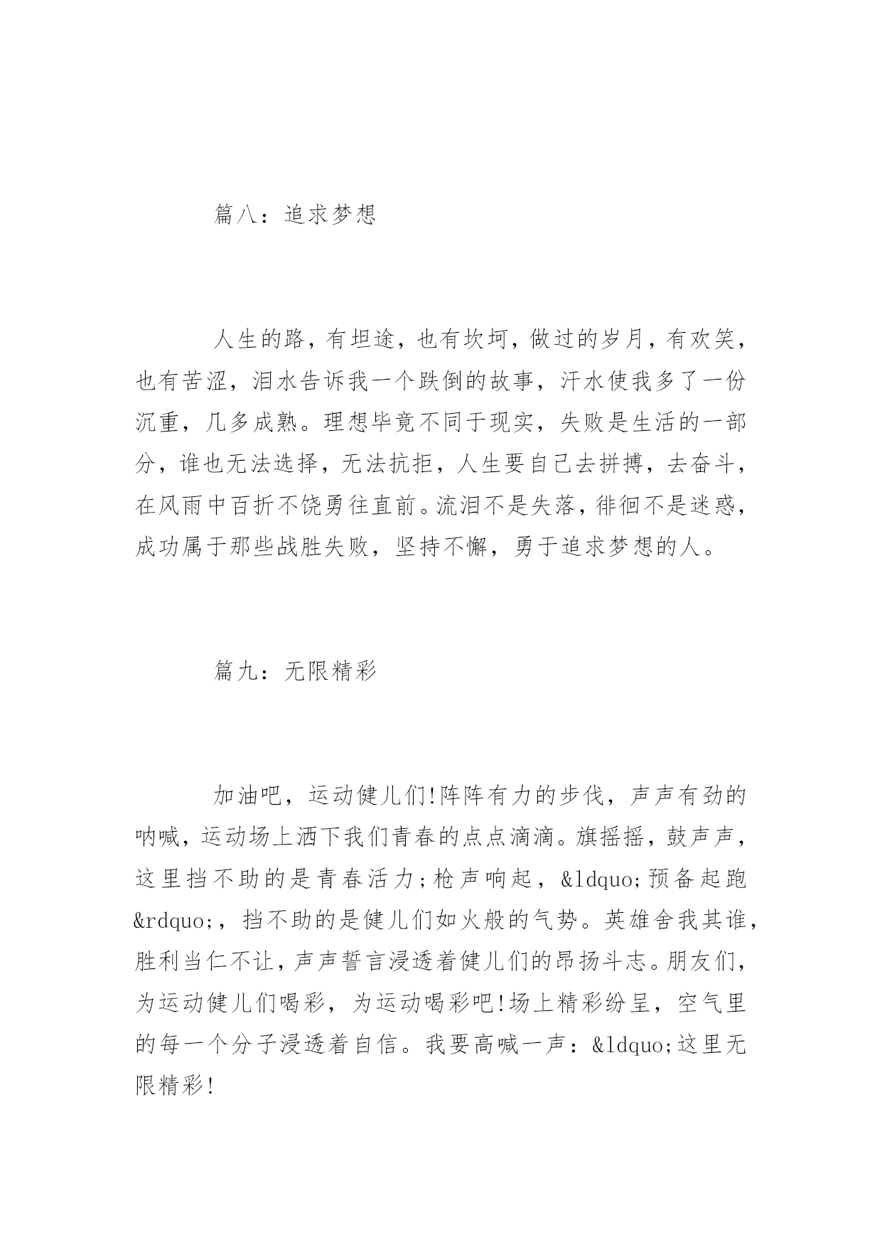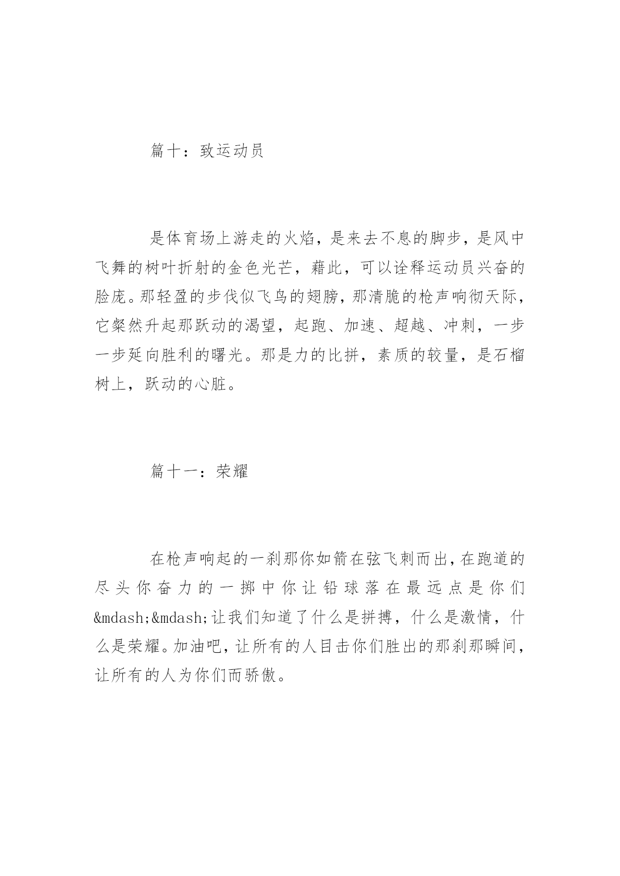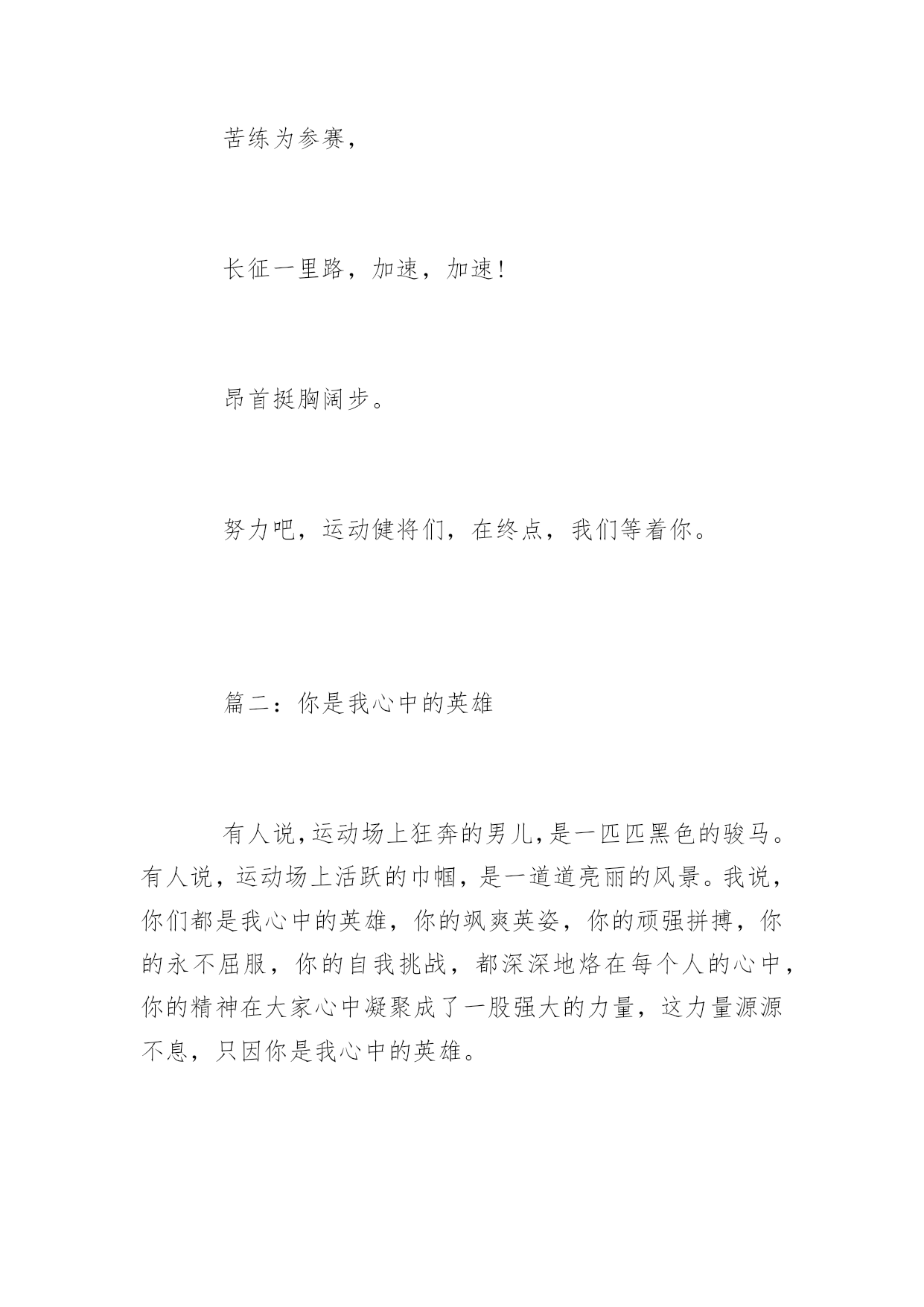 运动会加油稿「最新」学校要开运动会啦,你的运动会加油稿准备好了吗?还没有那就找小编帮忙解决吧,以下是应届毕业生小编为大家收集的运动会各类加油稿,希望大家喜欢!篇一:跑道宝剑锋从磨砺出,梅花香自苦寒来。"在经过一个月的辛苦的训练,今天,你终于站在了跑道上,通过不断的自我加压,练习中不断的超越自我,挑战极限,你自信满满,甚至在长跑的过程中不慎跌倒,你也毫不犹豫地爬起,继续。看着你那坚定的步伐,我们不禁想送你一首诗。常记朝朝暮暮,天天不忘跑步。苦练为参赛,长征一里路,加速,加速!昂首挺胸阔步。努力吧,运动健将们,在终点,我们等着你。篇二:你是我心中的英雄有人说,运动场上狂奔的男儿,是一匹匹黑色的骏马。有人说,运动场上活跃的巾帼,是一道道亮丽的风景。我说,你们都是我心中的英雄,你的飒爽英姿,你的顽强拼搏,你的永不屈服,你的自我挑战,都深深地烙在每个人的心中,你的精神在大家心中凝聚成了一股强大的力量,这力量源源不息,只因你是我心中的英雄。篇三:激情青春,勇者胜一位名人曾经说过:“风采来源于精神。”那么运动真正的风采理应来源于拼搏,不断超越自我的精神和那种“友谊第一,比赛第二”的运动品质。还记得奥林匹克的口号吗?更高、更快、更强,正是因为有了动力,才让我们的运动变的精彩,变的绚丽,变的引人。大家记忆尤新的永远是最有风采的一面,乔丹的灌蓝,巴乔的射门。这所有的一切都让我们深深感受到一种精神的存在,那是勇攀高峰的精神,那是不断超越的精神,更是人类挑战极限的精神。除了超越的精神外,还有一种风采感动着我们,那是运动最本质的品格,也是人类在竞争中的最真实,自然的情感流露。那是一种团结奋进的精神,它让本来残酷的竞争带上了人为的印记,捎上了一片真情。它让运动除了成绩外多了一种品质值得歌颂,相信那才是最感人的东西,它长存于我们运动史,深烙在我们思想中。篇四:爱你蔚蓝的天空下,有你矫健的身影,热闹的操场上,有你坚定的步伐,美丽的鲜花后有你辛勤的汗水,我们的喝彩中,有你的自豪与骄傲!体育健儿们,我们知道你们的辛勤,我们了解你们的辛苦,加油吧!不论你是成功还是失败,我们都是你们坚强的后盾,胜也爱你,败也爱你,我们永远支持你,你们永远是“最特别的存在”。篇五:足迹泰戈尔在诗中说,天空没有翅膀的影子,但我已飞过;艾青对朋友说,也许有人到达不了彼岸,但我们共同拥有大海。也许你们没有显赫的成绩,但运动场上留下了你们的足迹。也许你们没有奖品,但我们心中留下了你们拼搏的身影。所有的努力都是为了迎接这一刹那,所有的拼搏都是为了这一声令下。篇六:成功属于奋斗者给予的越多。收获的越多。奋斗的越多收获的越多坚韧的毅力坚定的信念收获闪光的金牌成功属于谁人生的路,有坦途,也有坎坷;做过的岁月,有欢笑,也有苦涩,泪水告诉我一个跌倒的故事,汗水使我多了一份沉重,几多成熟。理想毕竟不同于现实,失败是生活的一部分,谁也无法选择,无法拒绝。人生要自己去拼搏,去奋斗,在风雨中百折不挠勇往前进,在集资的每个驿站上都留下一段不悔的回忆。流泪不是失落,徘徊不是迷惑,成功属于那些战胜失败,坚持不懈、勇于追求梦想的人。加油吧,运动健儿们!篇七:自信就是希望是种子就该有绿色的希望是种子就该有金色的梦想不要躺在封闭的暖房怕什么秋日薄薄的风霜。既然已走上了运动场心里就不要多想跑道已洒满阳光不要羞涩、不要紧张。听秋雁在空中为你歌唱快去拾取片片金黄充满信心,就有希望。篇八:追求梦想人生的路,有坦途,也有坎坷,做过的岁月,有欢笑,也有苦涩,泪水告诉我一个跌倒的故事,汗水使我多了一份沉重,几多成熟。理想毕竟不同于现实,失败是生活的一部分,谁也无法选择,无法抗拒,人生要自己去拼搏,去奋斗,在风雨中百折不饶勇往直前。流泪不是失落,徘徊不是迷惑,成功属于那些战胜失败,坚持不懈,勇于追求梦想的人。篇九:无限精彩加油吧,运动健儿们!阵阵有力的步伐,声声有劲的呐喊,运动场上洒下我们青春的点点滴滴。旗摇摇,鼓声声,这里挡不助的是青春活力;枪声响起,“预备起跑”,挡不助的是健儿们如火般的气势。英雄舍我其谁,胜利当仁不让,声声誓言浸透着健儿们的昂扬斗志。朋友们,为运动健儿们喝彩,为运动喝彩吧!场上精彩纷呈,空气里的每一个分子浸透着自信。我要高喊一声:“这里无限精彩!篇十:致运动员是体育场上游走的火焰,是来去不息的脚步,是风中飞舞的树叶折射的金色光芒,藉此,可以诠释运动员兴奋的脸庞。那轻盈的步伐似飞鸟的翅膀,那清脆的枪声响彻天际,它粲然升起那跃动的渴望,起跑、加速、超越、冲刺,一步一步延向胜利的曙光。那是力的比拼,素质的较量,是石榴树上,跃动的心脏。篇十一: