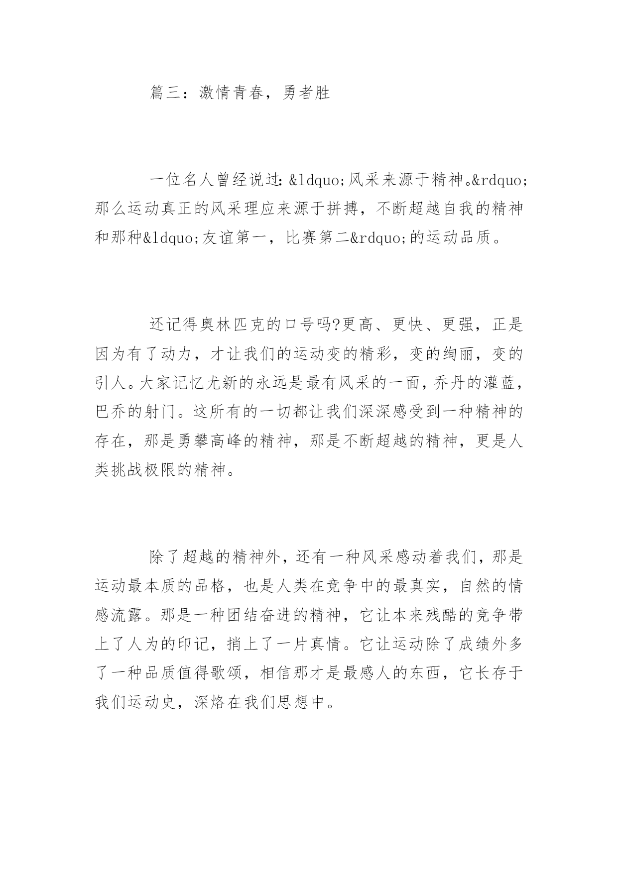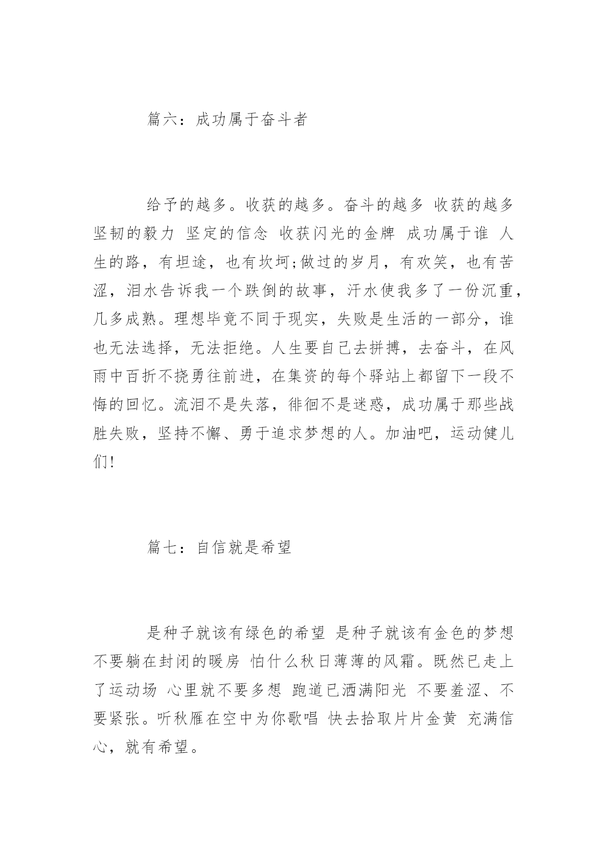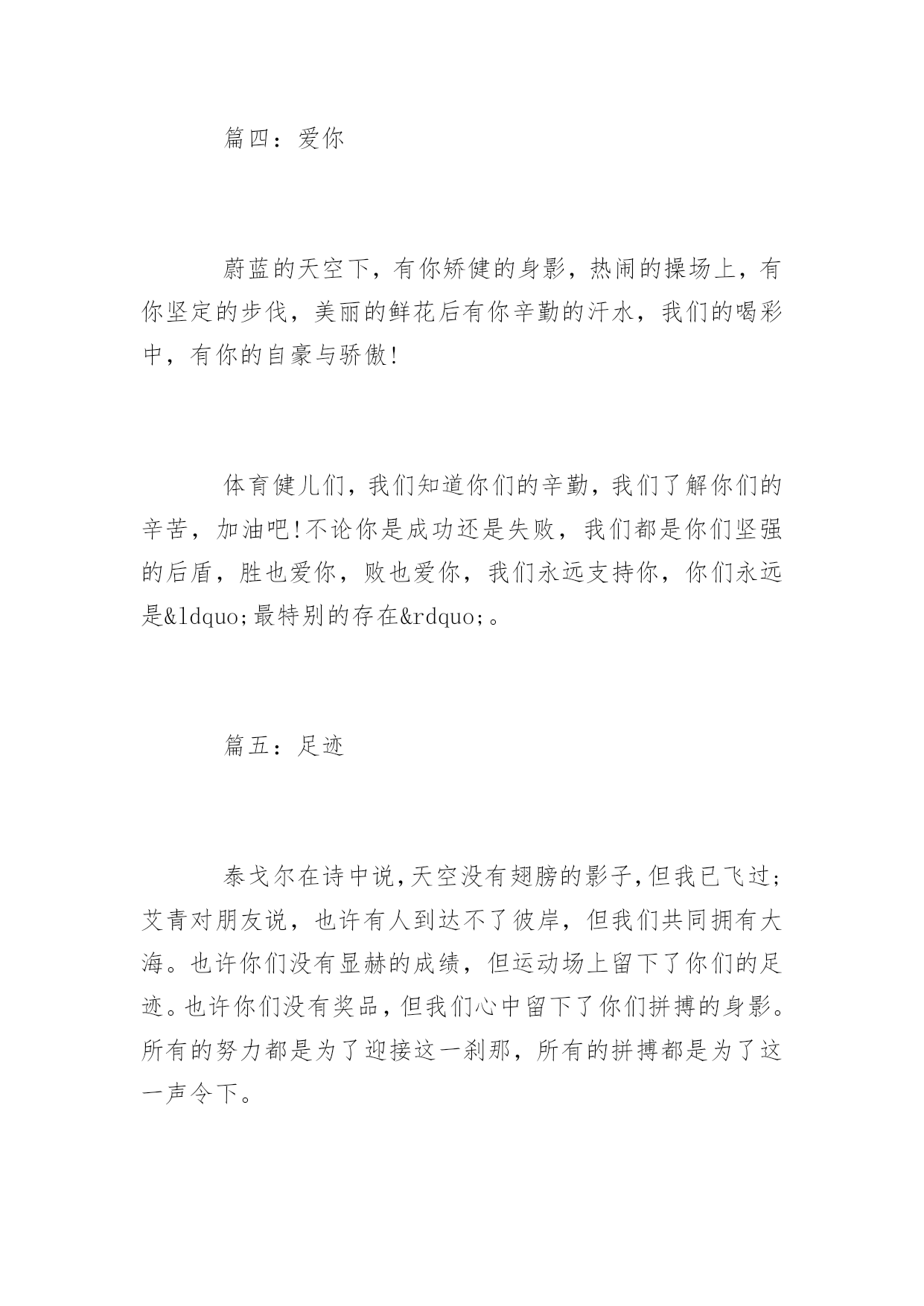 运动会加油稿「最新」学校要开运动会啦,你的运动会加油稿准备好了吗?还没有那就找小编帮忙解决吧,以下是应届毕业生小编为大家收集的运动会各类加油稿,希望大家喜欢!篇一:跑道宝剑锋从磨砺出,梅花香自苦寒来。"在经过一个月的辛苦的训练,今天,你终于站在了跑道上,通过不断的自我加压,练习中不断的超越自我,挑战极限,你自信满满,甚至在长跑的过程中不慎跌倒,你也毫不犹豫地爬起,继续。看着你那坚定的步伐,我们不禁想送你一首诗。常记朝朝暮暮,天天不忘跑步。苦练为参赛,长征一里路,加速,加速!昂首挺胸阔步。努力吧,运动健将们,在终点,我们等着你。篇二:你是我心中的英雄有人说,运动场上狂奔的男儿,是一匹匹黑色的骏马。有人说,运动场上活跃的巾帼,是一道道亮丽的风景。我说,你们都是我心中的英雄,你的飒爽英姿,你的顽强拼搏,你的永不屈服,你的自我挑战,都深深地烙在每个人的心中,你的精神在大家心中凝聚成了一股强大的力量,这力量源源不息,只因你是我心中的英雄。篇三:激情青春,勇者胜一位名人曾经说过:“风采来源于精神。”那么运动真正的风采理应来源于拼搏,不断超越自我的精神和那种“友谊第一,比赛第二”的运动品质。还记得奥林匹克的口号吗?更高、更快、更强,正是因为有了动力,才让我们的运动变的精彩,变的绚丽,变的引人。大家记忆尤新的永远是最有风采的一面,乔丹的灌蓝,巴乔的射门。这所有的一切都让我们深深感受到一种精神的存在,那是勇攀高峰的精神,那是不断超越的精神,更是人类挑战极限的精神。除了超越的精神外,还有一种风采感动着我们,那是运动最本质的品格,也是人类在竞争中的最真实,自然的情感流露。那是一种团结奋进的精神,它让本来残酷的竞争带上了人为的印记,捎上了一片真情。它让运动除了成绩外多了一种品质值得歌颂,相信那才是最感人的东西,它长存于我们运动史,深烙在我们思想中。篇四:爱你蔚蓝的天空下,有你矫健的身影,热闹的操场上,有你坚定的步伐,美丽的鲜花后有你辛勤的汗水,我们的喝彩中,有你的自豪与骄傲!体育健儿们,我们知道你们的辛勤,我们了解你们的辛苦,加油吧!不论你是成功还是失败,我们都是你们坚强的后盾,胜也爱你,败也爱你,我们永远支持你,你们永远是“最特别的存在”。篇五:足迹泰戈尔在诗中说,天空没有翅膀的影子,但我已飞过;艾青对朋友说,也许有人到达不了彼岸,但我们共同拥有大海。也许你们没有显赫的成绩,但运动场上留下了你们的足迹。也许你们没有奖品,但我们心中留下了你们拼搏的身影。所有的努力都是为了迎接这一刹那,所有的拼搏都是为了这一声令下。篇六:成功属于奋斗者给予的越多。收获的越多。奋斗的越多收获的越多坚韧的毅力坚定的信念收获闪光的金牌成功属于谁人生的路,有坦途,也有坎坷;做过的岁月,有欢笑,也有苦涩,泪水告诉我一个跌倒的故事,汗水使我多了一份沉重,几多成熟。理想毕竟不同于现实,失败是生活的一部分,谁也无法选择,无法拒绝。人生要自己去拼搏,去奋斗,在风雨中百折不挠勇往前进,在集资的每个驿站上都留下一段不悔的回忆。流泪不是失落,徘徊不是迷惑,成功属于那些战胜失败,坚持不懈、勇于追求梦想的人。加油吧,运动健儿们!篇七:自信就是希望是种子就该有绿色的希望是种子就该有金色的梦想不要躺在封闭的暖房怕什么秋日薄薄的风霜。既然已走上了运动场心里就不要多想跑道已洒满阳光不要羞涩、不要紧张。听秋雁在空中为你歌唱快去拾取片片金黄充满信心,就有希望。篇八:追求梦想人生的路,有坦途,也有坎坷,做过的岁月,有欢笑,也有苦涩,泪水告诉我一个跌倒的故事,汗水使我多了一份沉重,几多成熟。理想毕竟不同于现实,失败是生活的一部分,谁也无法选择,无法抗拒,人生要自己去拼搏,去奋斗,在风雨中百折不饶勇往直前。流泪不是失落,徘徊不是迷惑,成功属于那些战胜失败,坚持不懈,勇于追求梦想的人。篇九:无限精彩加油吧,运动健儿们!阵阵有力的步伐,声声有劲的呐喊,运动场上洒下我们青春的点点滴滴。旗摇摇,鼓声声,这里挡不助的是青春活力;枪声响起,“预备起跑”,挡不助的是健儿们如火般的气势。英雄舍我其谁,胜利当仁不让,声声誓言浸透着健儿们的昂扬斗志。朋友们,为运动健儿们喝彩,为运动喝彩吧!场上精彩纷呈,空气里的每一个分子浸透着自信。我要高喊一声:“这里无限精彩!篇十:致运动员是体育场上游走的火焰,是来去不息的脚步,是风中飞舞的树叶折射的金色光芒,藉此,可以诠释运动员兴奋的脸庞。那轻盈的步伐似飞鸟的翅膀,那清脆的枪声响彻天际,它粲然升起那跃动的渴望,起跑、加速、超越、冲刺,一步一步延向胜利的曙光。那是力的比拼,素质的较量,是石榴树上,跃动的心脏。篇十一: