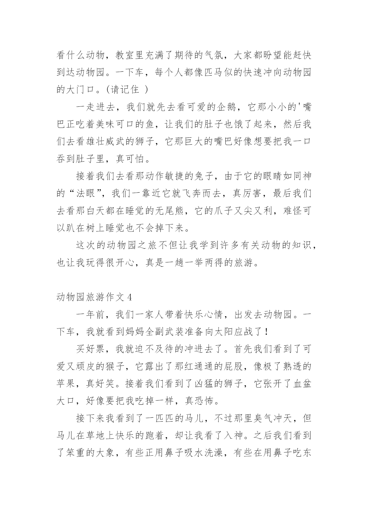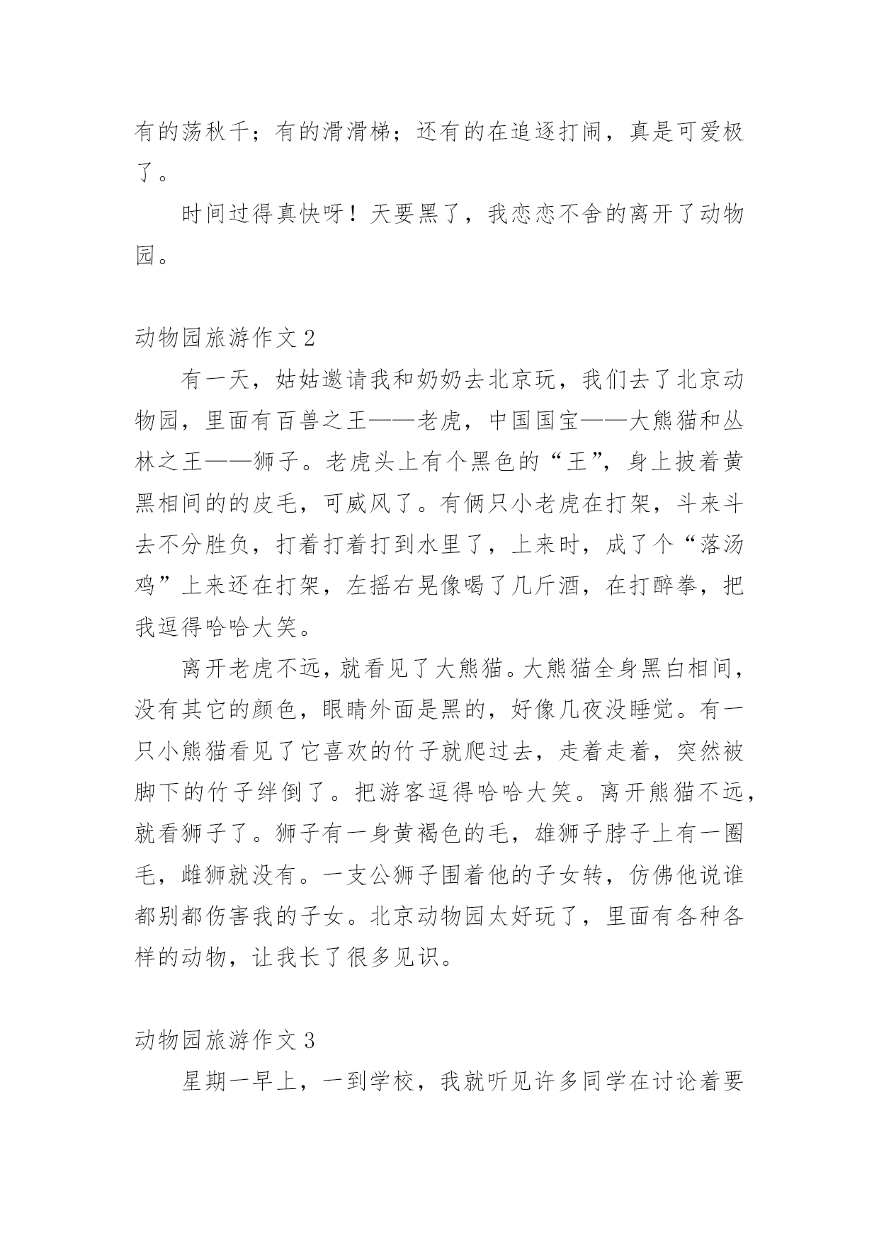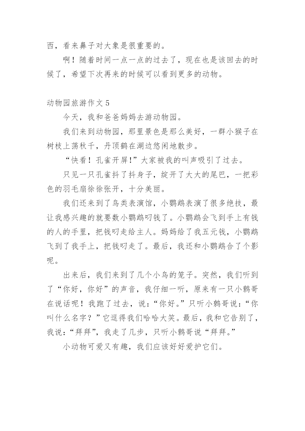 动物园旅游作文动物园旅游作文(5篇)在平平淡淡的学习、工作、生活中,大家总免不了要接触或使用作文吧,借助作文人们可以反映客观事物、表达思想感情、传递知识信息。作文的注意事项有许多,你确定会写吗?以下是小编为大家整理的动物园旅游作文,仅供参考,大家一起来看看吧。动物园旅游作文1端午节这天,爸爸、妈妈带着我去动物园参观。来到动物园,展现在我眼前的是一个大花坛,花坛里用石头、水泥造成的大象、小鹿、熊等动物雕像,它们微笑着,像是在欢迎我们呢。今天的游人可真多呀。我们顺着小路先来到熊猫馆,有一只可爱的小熊猫正在睡觉呢。棕色的毛,黑黑的眼圈像是戴了一副黑墨镜。瞧,它睡得多香呀!我不忍心打扰它,就来到它旁边的袋鼠馆。这里有一只袋鼠妈妈正在哄小袋鼠玩儿,调皮的小袋鼠一会跳进妈妈的育儿袋里,一会跳出来,真有意思。我们继续往前走,黑猩猩馆里的两只黑猩猩也在懒洋洋地睡觉。猩猩馆对面的鸵鸟园里的鸵鸟却个个精神,有的在吃菜叶,有的在散步,还有的在互相梳理羽毛。但动物园园里最精神的要数猴山上的猴子们了,你看,它们多机灵呀!有的荡秋千;有的滑滑梯;还有的在追逐打闹,真是可爱极了。时间过得真快呀!天要黑了,我恋恋不舍的离开了动物园。动物园旅游作文2有一天,姑姑邀请我和奶奶去北京玩,我们去了北京动物园,里面有百兽之王——老虎,中国国宝——大熊猫和丛林之王——狮子。老虎头上有个黑色的“王”,身上披着黄黑相间的的皮毛,可威风了。有俩只小老虎在打架,斗来斗去不分胜负,打着打着打到水里了,上来时,成了个“落汤鸡”上来还在打架,左摇右晃像喝了几斤酒,在打醉拳,把我逗得哈哈大笑。离开老虎不远,就看见了大熊猫。大熊猫全身黑白相间,没有其它的颜色,眼睛外面是黑的,好像几夜没睡觉。有一只小熊猫看见了它喜欢的竹子就爬过去,走着走着,突然被脚下的竹子绊倒了。把游客逗得哈哈大笑。离开熊猫不远,就看狮子了。狮子有一身黄褐色的毛,雄狮子脖子上有一圈毛,雌狮就没有。一支公狮子围着他的子女转,仿佛他说谁都别都伤害我的子女。北京动物园太好玩了,里面有各种各样的动物,让我长了很多见识。动物园旅游作文3星期一早上,一到学校,我就听见许多同学在讨论着要看什么动物,教室里充满了期待的气氛,大家都盼望能赶快到达动物园。一下车,每个人都像匹马似的快速冲向动物园的大门口。(请记住)一走进去,我们就先去看可爱的企鹅,它那小小的'嘴巴正吃着美味可口的鱼,让我们的肚子也饿了起来,然后我们去看雄壮威武的狮子,它那巨大的嘴巴好像想要把我一口吞到肚子里,真可怕。接着我们去看那动作敏捷的兔子,由于它的眼睛如同神的“法眼”,我们一靠近它就飞奔而去,真厉害,最后我们去看那白天都在睡觉的无尾熊,它的爪子又尖又利,难怪可以趴在树上睡觉也不会掉下来。这次的动物园之旅不但让我学到许多有关动物的知识,也让我玩得很开心,真是一趟一举两得的旅游。动物园旅游作文4一年前,我们一家人带着快乐心情,出发去动物园。一下车,我就看到妈妈全副武装准备向太阳应战了!买好票,我就迫不及待的冲进去了。首先我们看到了可爱又顽皮的猴子,它露出了那红通通的屁股,像极了熟透的苹果,真好笑。接着我们看到了凶猛的狮子,它张开了血盆大口,好像要把我吃掉一样,真恐怖。接下来我看到了一匹匹的马儿,不过那里臭气冲天,但马儿在草地上快乐的跑着,却让我看了入神。之后我们看到了笨重的大象,有些正用鼻子吸水洗澡,有些在用鼻子吃东西,看来鼻子对大象是很重要的。啊!随着时间一点一点的过去了,现在也是该回去的时候了,希望下次再来的时候可以看到更多的动物。动物园旅游作文5今天,我和爸爸妈妈去游动物园。我们来到动物园,那里景色是那么美好,一群小猴子在树枝上荡秋千,丹顶鹤在湖边悠闲地散步。“快看!孔雀开屏!”大家被我的叫声吸引了过去。只见一只孔雀抖了抖身子,绽开了大大的尾巴,一把彩色的羽毛扇徐徐张开,十分美丽。我们还来到了鸟类表演馆,小鹦鹉表演了很多绝技,最让我感兴趣的就要数小鹦鹉叼钱了。小鹦鹉会飞到手上有钱的人的手里,把钱叼走给主人。妈妈给了我五元钱,小鹦鹉飞到了我手上,把钱叼走了。最后,我还和小鹦鹉合了个影呢。出来后,我们来到了几个小鸟的笼子。突然,我们听到了“你好,你好”的声音,我仔细一听,原来有一只小鹩哥在说话呢!我跑了过去,说:“你好。”只听小鹩哥说:“你叫什么名字?”它逗得我们哈哈大笑。最后,我和它告别了,我说:“拜拜”,我走了几步,只听小鹩哥说“拜拜。”小动物可爱又有趣,我们应该好好爱护它们。