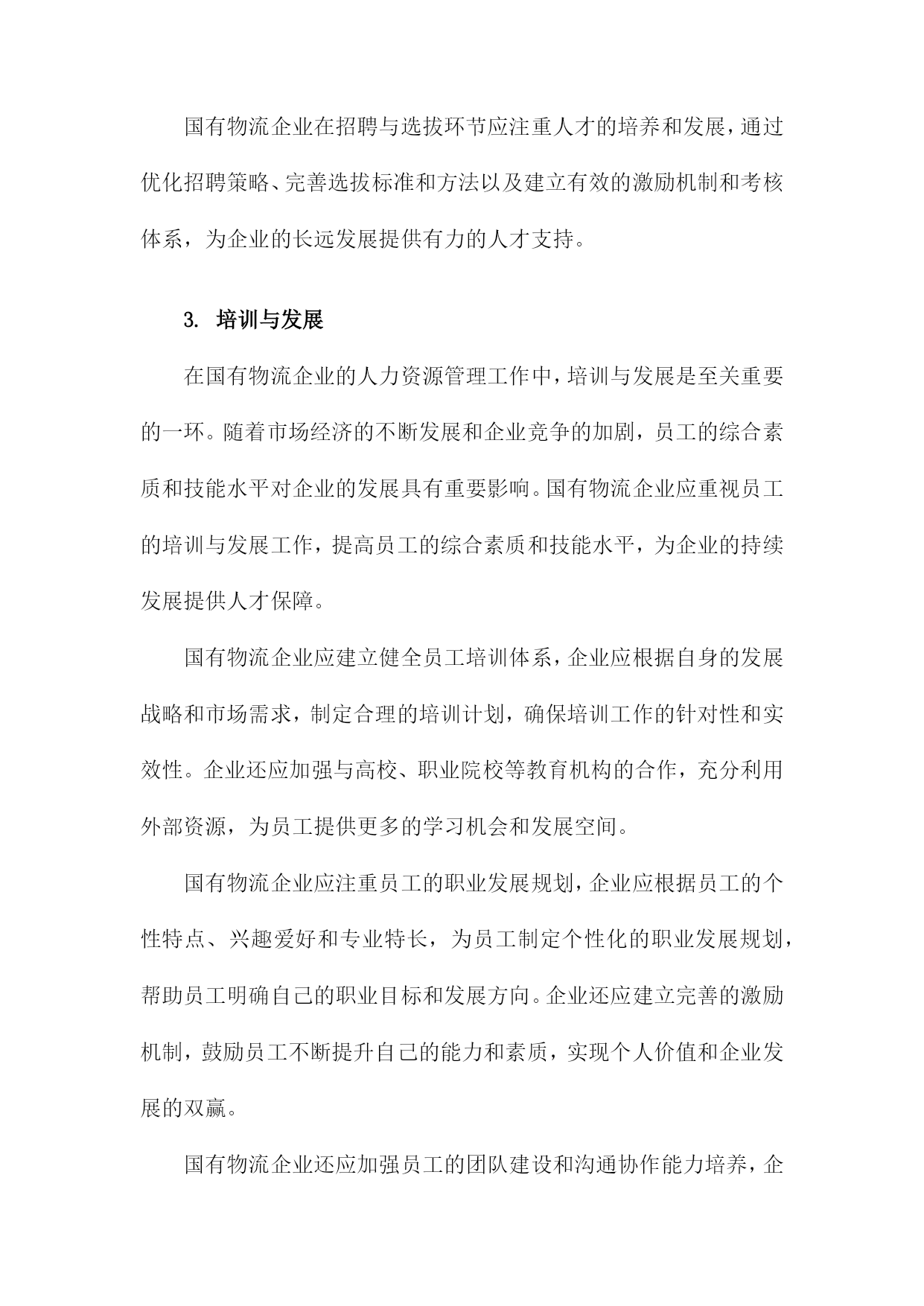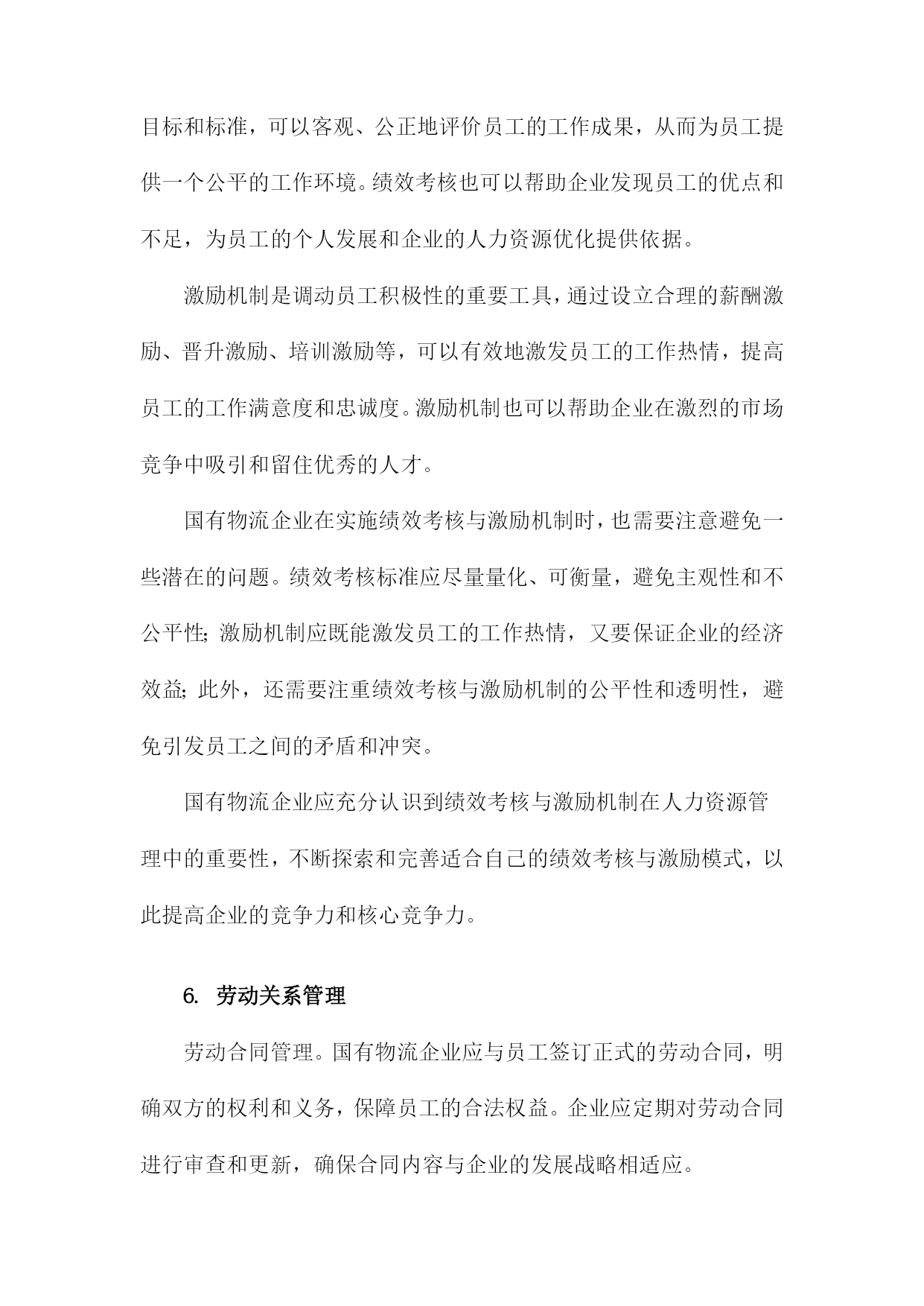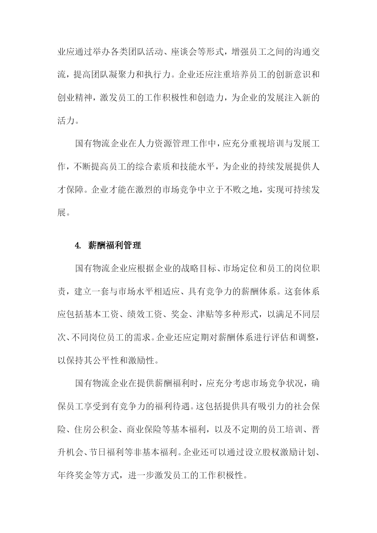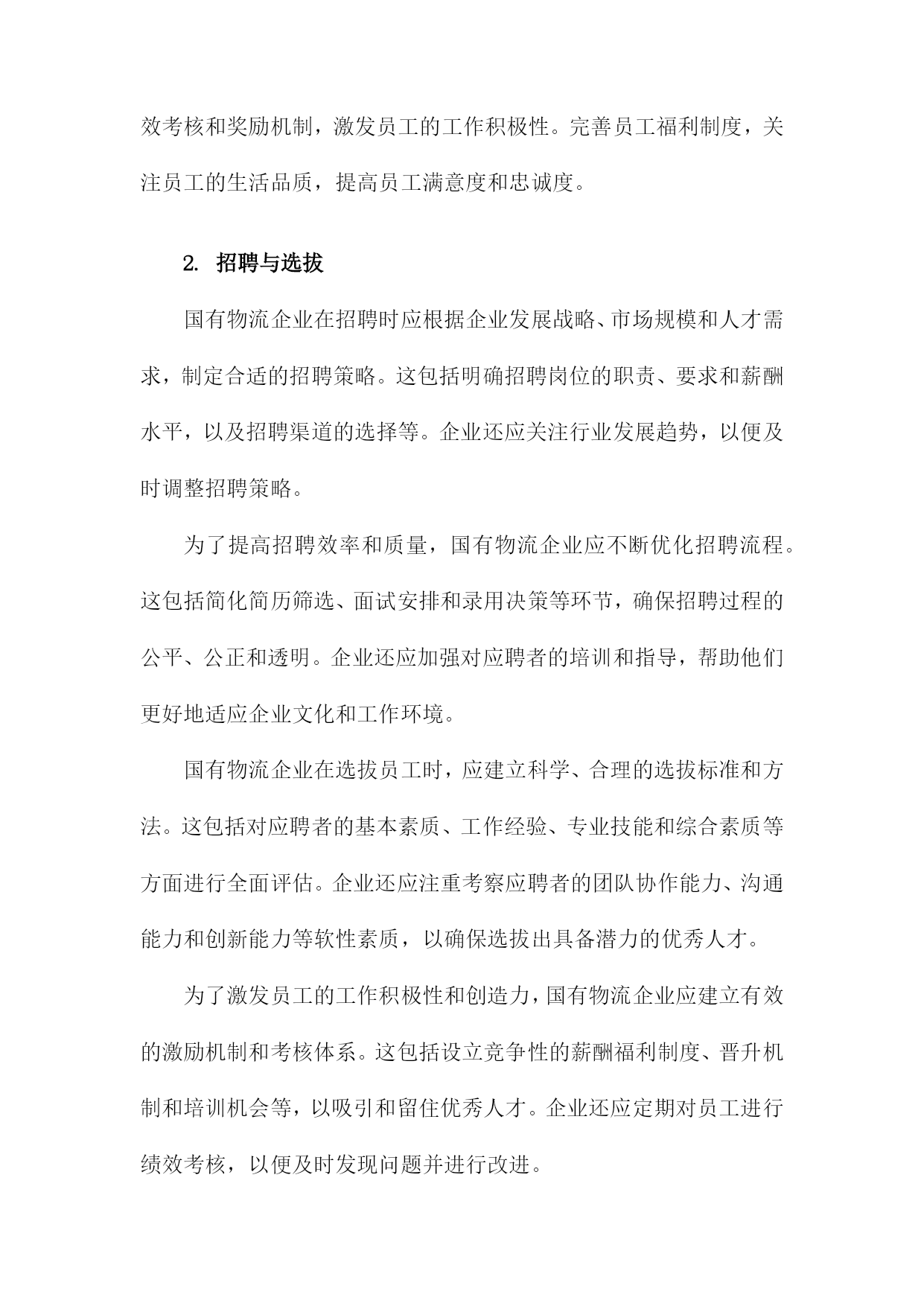 国有物流企业人力资源管理工作思考一、国有物流企业人力资源管理的现状随着我国经济的快速发展,物流行业作为国民经济的重要组成部分,其发展速度和规模也在不断扩大。国有物流企业在国家经济发展中起到了举足轻重的作用,为保障国家物资流通和市场供应提供了有力支持。在人力资源管理方面,国有物流企业仍然面临着一些问题和挑战。人力资源配置不合理:由于国有物流企业的发展历史较长,组织结构相对复杂,部分企业在人力资源配置上存在一定的不合理现象,如高龄员工较多、技能型人才短缺等。这导致企业在市场竞争中处于劣势地位,影响了企业的持续发展。薪酬福利制度不完善:尽管国有物流企业的薪酬福利制度在一定程度上得到了改善,但仍存在较大的差距。部分企业薪酬水平偏低,无法吸引和留住优秀人才;福利待遇不够完善,不能满足员工的需求。这些问题导致企业的人才流失严重,影响了企业的稳定发展。培训与发展机制不健全:国有物流企业在培训与发展方面的投入相对较少,培训内容和方式较为单一,不能满足员工不断提升自身技能的需求。企业缺乏完善的晋升机制,使得员工的职业发展空间受限,影响了员工的工作积极性和企业的整体竞争力。人力资源管理理念滞后:部分国有物流企业在人力资源管理方面,仍然沿用传统的管理模式和方法,缺乏创新意识和前瞻性。这导致企业在面对市场竞争和人才竞争时,难以适应新的形势和需求。企业文化建设不足:企业文化是企业发展的灵魂,对员工的思想观念和行为具有重要影响。部分国有物流企业在企业文化建设方面存在不足,缺乏凝聚力和向心力,影响了企业的稳定发展。国有物流企业在人力资源管理方面仍存在一定的问题和挑战,为了提高企业的核心竞争力和可持续发展能力,国有物流企业应当加大对人力资源管理的重视力度,不断完善相关制度和机制,提升人力资源管理水平。1.人力资源规划和组织架构国有物流企业的人力资源管理工作首先要从人力资源规划和组织架构入手。人力资源规划是指根据企业发展战略和市场需求,对人力资源的需求、供给、配置和使用进行预测、分析和决策的过程。组织架构则是指企业内部各部门之间的关系和职责划分,以及员工在组织中的角色和地位。在国有物流企业的人力资源管理中,人力资源规划和组织架构应遵循以下原则:以战略为导向。人力资源规划和组织架构应与企业战略目标相一致,确保人力资源的合理配置和有效利用。注重人才培养。企业应重视员工的培训和发展,提高员工的综合素质和专业技能,为企业发展提供人才保障。强化部门协同。企业各部门之间应加强沟通与协作,形成高效的工作合力,提高整体运营效率。保障员工权益。企业应建立健全员工激励机制和福利制度,关注员工的工作环境和生活质量,提高员工满意度和忠诚度。制定科学的人力资源规划。企业应根据市场变化、行业发展趋势和企业发展战略,明确人力资源需求和供给,制定合理的招聘、培训、晋升和离职政策。优化组织结构。企业应根据业务发展需要,调整部门设置和职责划分,实现组织结构的扁平化和灵活化,提高工作效率。建立有效的人才培养机制。企业应加大培训投入,开展多样化的培训项目,提高员工的专业技能和综合素质。鼓励员工自我学习和成长,为企业发展储备优秀人才。强化部门协同和沟通。企业应加强部门之间的沟通与协作,建立跨部门的项目协作机制,提高整体运营效率。完善员工激励和福利制度。企业应建立科学的薪酬体系,实行绩效考核和奖励机制,激发员工的工作积极性。完善员工福利制度,关注员工的生活品质,提高员工满意度和忠诚度。2.招聘与选拔国有物流企业在招聘时应根据企业发展战略、市场规模和人才需求,制定合适的招聘策略。这包括明确招聘岗位的职责、要求和薪酬水平,以及招聘渠道的选择等。企业还应关注行业发展趋势,以便及时调整招聘策略。为了提高招聘效率和质量,国有物流企业应不断优化招聘流程。这包括简化简历筛选、面试安排和录用决策等环节,确保招聘过程的公平、公正和透明。企业还应加强对应聘者的培训和指导,帮助他们更好地适应企业文化和工作环境。国有物流企业在选拔员工时,应建立科学、合理的选拔标准和方法。这包括对应聘者的基本素质、工作经验、专业技能和综合素质等方面进行全面评估。企业还应注重考察应聘者的团队协作能力、沟通能力和创新能力等软性素质,以确保选拔出具备潜力的优秀人才。为了激发员工的工作积极性和创造力,国有物流企业应建立有效的激励机制和考核体系。这包括设立竞争性的薪酬福利制度、晋升机制和培训机会等,以吸引和留住优秀人才。企业还应定期对员工进行绩效考核,以便及时发现问题并进行改进。国有物流企业在招聘与选拔环节应注重人才的培养和发展,通过优化招聘策略、完善选拔标准和方法以及建立有效的激励机制和考核体系,为企业的长远发展提供有力的人才支持。3.培训与发展在国有物流企业的人力资源管理工作中,培训与发展是至关