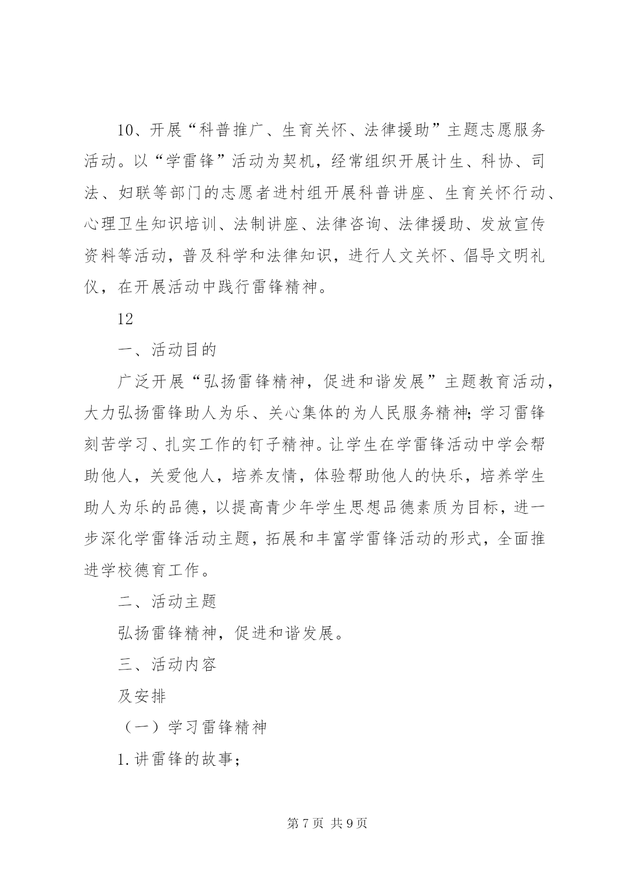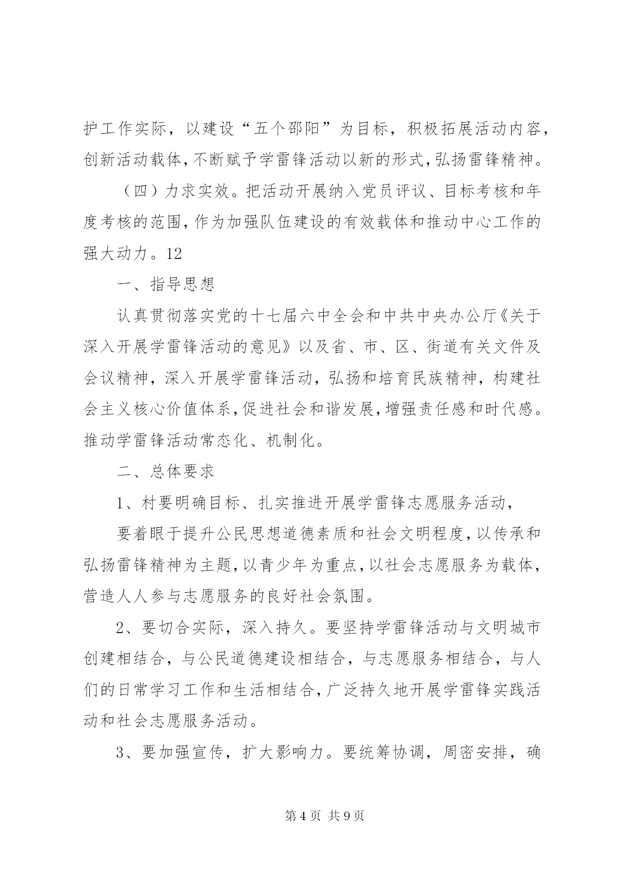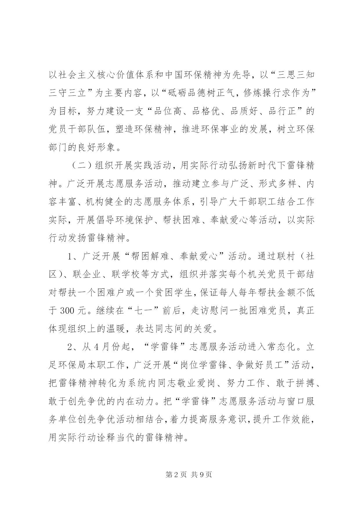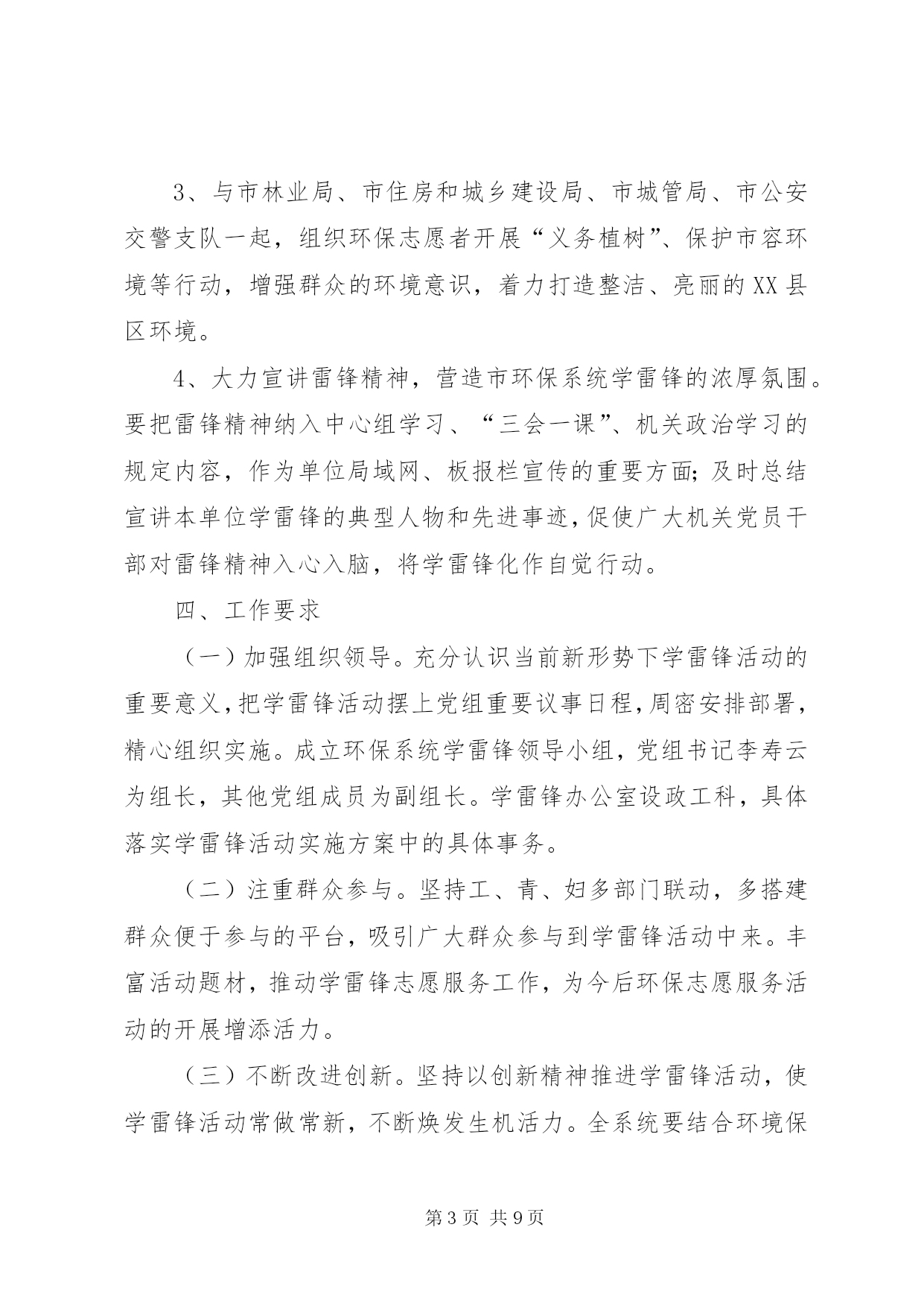 第PAGE\*Arabic\*MERGEFORMAT9页共NUMPAGES\*MERGEFORMAT9页环保局学雷锋活动方案为认真贯彻落实党的十七届六中全会关于“深入开展学雷锋活动,采取措施推动学习活动常态化”精神,按照市直机关工委关于印发《市直机关学雷锋活动实施方案》的通知(市直发〔2012〕3号)要求,为了有计划推进市环保系统干部职工深入开展学雷锋志愿服务活动,推动学雷锋活动常态化,大力弘扬雷锋精神,促进社会主义核心价值体系建设,不断提升系统内干部职工道德素质和文明程度,特制定以下实施方案。一、指导思想以邓小平理论和“三个代表”重要思想为指导,深入贯彻党的十七届六中全会精神,努力践行科学发展观,着眼于建设社会主义核心价值体系,传承和弘扬雷锋精神,紧密结合我市环保发展的新形势、新任务,以志愿服务为载体,按照“群众所需,志愿者能为”的原则,结合环境保护工作实际,深入开展学雷锋活动,促进公民道德素质和社会文明程度的不断提高,推动示范区经济社会和谐发展。二、活动主题弘扬雷锋精神,服务环保事业三、活动内容(一)以雷锋同志为榜样,开展加强党性修养和道德品质修养为主题的教育实践活动。在局网站开设学雷锋专栏,组织召开学雷锋活动研讨会,宣传雷锋事迹、雷锋精神和雷锋式模范人物。以社会主义核心价值体系和中国环保精神为先导,以“三思三知三守三立”为主要内容,以“砥砺品德树正气,修炼操行求作为”为目标,努力建设一支“品位高、品格优、品质好、品行正”的党员干部队伍,塑造环保精神,推进环保事业的发展,树立环保部门的良好形象。(二)组织开展实践活动,用实际行动弘扬新时代下雷锋精神。广泛开展志愿服务活动,推动建立参与广泛、形式多样、内容丰富、机构健全的志愿服务体系,引导广大干部职工结合工作实际,开展倡导环境保护、帮扶困难、奉献爱心等活动,以实际行动发扬雷锋精神。1、广泛开展“帮困解难、奉献爱心”活动。通过联村(社区)、联企业、联学校等方式,组织并落实每个机关党员干部结对帮扶一个困难户或一个贫困学生,保证每人每年帮扶金额不低于300元。继续在“七一”前后,走访慰问一批困难党员,真正体现组织上的温暖,表达同志间的关爱。2、从4月份起,“学雷锋”志愿服务活动进入常态化。立足环保局本职工作,广泛开展“岗位学雷锋、争做好员工”活动,把雷锋精神转化为系统内同志敬业爱岗、努力工作、敢于拼搏、敢于创先争优的内在动力。把“学雷锋”志愿服务活动与窗口服务单位创先争优活动相结合,着力提高服务意识,提升工作效能,用实际行动诠释当代的雷锋精神。3、与市林业局、市住房和城乡建设局、市城管局、市公安交警支队一起,组织环保志愿者开展“义务植树”、保护市容环境等行动,增强群众的环境意识,着力打造整洁、亮丽的XX县区环境。4、大力宣讲雷锋精神,营造市环保系统学雷锋的浓厚氛围。要把雷锋精神纳入中心组学习、“三会一课”、机关政治学习的规定内容,作为单位局域网、板报栏宣传的重要方面;及时总结宣讲本单位学雷锋的典型人物和先进事迹,促使广大机关党员干部对雷锋精神入心入脑,将学雷锋化作自觉行动。四、工作要求(一)加强组织领导。充分认识当前新形势下学雷锋活动的重要意义,把学雷锋活动摆上党组重要议事日程,周密安排部署,精心组织实施。成立环保系统学雷锋领导小组,党组书记李寿云为组长,其他党组成员为副组长。学雷锋办公室设政工科,具体落实学雷锋活动实施方案中的具体事务。(二)注重群众参与。坚持工、青、妇多部门联动,多搭建群众便于参与的平台,吸引广大群众参与到学雷锋活动中来。丰富活动题材,推动学雷锋志愿服务工作,为今后环保志愿服务活动的开展增添活力。(三)不断改进创新。坚持以创新精神推进学雷锋活动,使学雷锋活动常做常新,不断焕发生机活力。全系统要结合环境保护工作实际,以建设“五个邵阳”为目标,积极拓展活动内容,创新活动载体,不断赋予学雷锋活动以新的形式,弘扬雷锋精神。(四)力求实效。把活动开展纳入党员评议、目标考核和年度考核的范围,作为加强队伍建设的有效载体和推动中心工作的强大动力。12一、指导思想认真贯彻落实党的十七届六中全会和中共中央办公厅《关于深入开展学雷锋活动的意见》以及省、市、区、街道有关文件及会议精神,深入开展学雷锋活动,弘扬和培育民族精神,构建社会主义核心价值体系,促进社会和谐发展,增强责任感和时代感。推动学雷锋活动常态化、机制化。二、总体要求1、村要明确目标、扎实推进开展学雷锋志愿服务活动,要着眼于提升公民思想道德素质和社会文明程度,以传承和弘扬雷锋精神为主题,以青少年为重点,以社会志愿服务为载体,营造人人参与志愿服务的良好社会氛围。2、要切合实际,深入持久。要坚持学雷锋活动与文明城市创建相结合,与公民道德建设相结合,与志愿服务相结合,与人们的日常学习工作和生活相结合,广泛