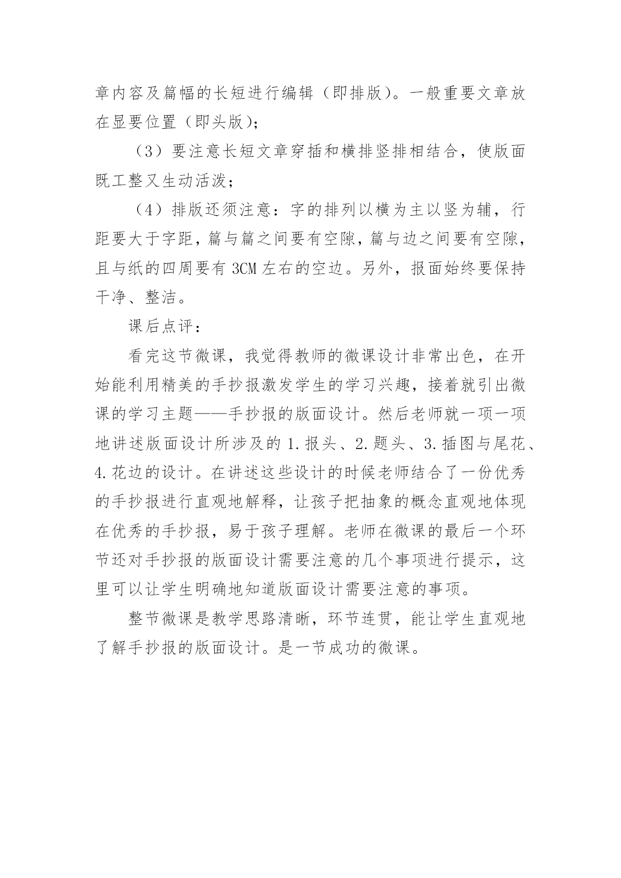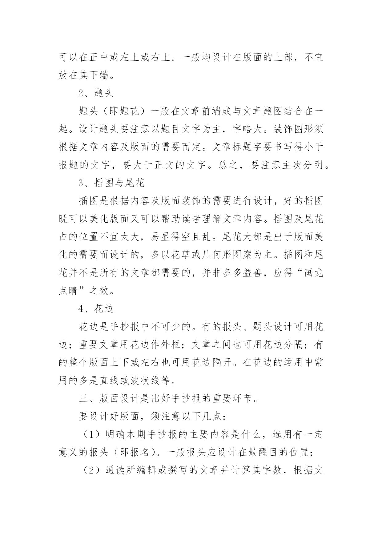 手抄报的版面设计教程手抄报的版面设计教程手抄报教程同学们,大家好!今天我们微课学习的内容是“手抄报的版面设计”。一、激趣导入在开始之前,我们先欣赏一下的制作精美的手抄报,同学们你们想制作出这么精美的手抄报吗?那么今天我们就一起来学习如何进行手抄报的版面设计。二、手抄报版面设计涉及的范围主要有:报头、题头、插图与尾花、花边设计等。1、报头报头起着开门见山的作用,醒目的报头会使人眼前一亮。报头必须紧密配合主题内容,形象生动地反映手抄报的主要思想。报名要取得有积极、健康、富有意义的名字。报头一般由主题图形、报头文字和几何形体色块或花边组合而成,或严肃或活泼、或方形或圆形、或素雅或重彩。报头设计应注意:(1)构图要稳定,画面结构要紧凑,报头在设计与表现手法上力求简炼,要反映手抄报的主题,起“一目了然”之效;(2)其字要大,字体或行或楷,或彩色或黑白;(3)其位置有几种设计方案:排版设计为整版的,则可以在正中或左上或右上。一般均设计在版面的上部,不宜放在其下端。2、题头题头(即题花)一般在文章前端或与文章题图结合在一起。设计题头要注意以题目文字为主,字略大。装饰图形须根据文章内容及版面的需要而定。文章标题字要书写得小于报题的文字,要大于正文的文字。总之,要注意主次分明。3、插图与尾花插图是根据内容及版面装饰的需要进行设计,好的插图既可以美化版面又可以帮助读者理解文章内容。插图及尾花占的位置不宜太大,易显得空且乱。尾花大都是出于版面美化的需要而设计的,多以花草或几何形图案为主。插图和尾花并不是所有的文章都需要的,并非多多益善,应得“画龙点睛”之效。4、花边花边是手抄报中不可少的。有的报头、题头设计可用花边;重要文章用花边作外框;文章之间也可用花边分隔;有的整个版面上下或左右也可用花边隔开。在花边的运用中常用的多是直线或波状线等。三、版面设计是出好手抄报的重要环节。要设计好版面,须注意以下几点:(1)明确本期手抄报的主要内容是什么,选用有一定意义的报头(即报名)。一般报头应设计在最醒目的位置;(2)通读所编辑或撰写的文章并计算其字数,根据文章内容及篇幅的长短进行编辑(即排版)。一般重要文章放在显要位置(即头版);(3)要注意长短文章穿插和横排竖排相结合,使版面既工整又生动活泼;(4)排版还须注意:字的排列以横为主以竖为辅,行距要大于字距,篇与篇之间要有空隙,篇与边之间要有空隙,且与纸的四周要有3CM左右的空边。另外,报面始终要保持干净、整洁。课后点评:看完这节微课,我觉得教师的微课设计非常出色,在开始能利用精美的手抄报激发学生的学习兴趣,接着就引出微课的学习主题——手抄报的版面设计。然后老师就一项一项地讲述版面设计所涉及的1.报头、2.题头、3.插图与尾花、4.花边的设计。在讲述这些设计的时候老师结合了一份优秀的手抄报进行直观地解释,让孩子把抽象的概念直观地体现在优秀的手抄报,易于孩子理解。老师在微课的最后一个环节还对手抄报的版面设计需要注意的几个事项进行提示,这里可以让学生明确地知道版面设计需要注意的事项。整节微课是教学思路清晰,环节连贯,能让学生直观地了解手抄报的版面设计。是一节成功的微课。