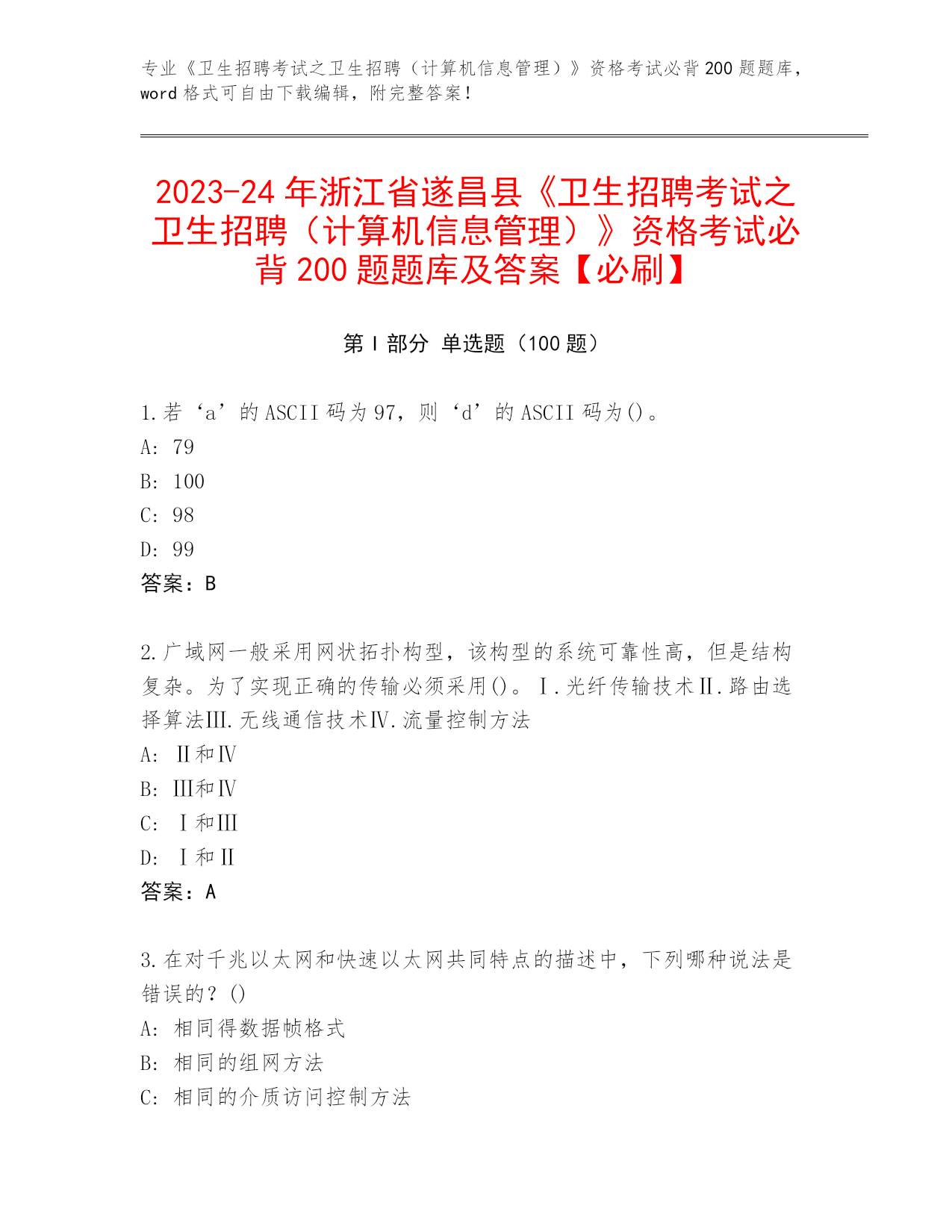 2023-24年浙江省遂昌县《卫生招聘考试之卫生招聘(计算机信息管理)》资格考试必背200题题库及答案【必刷】