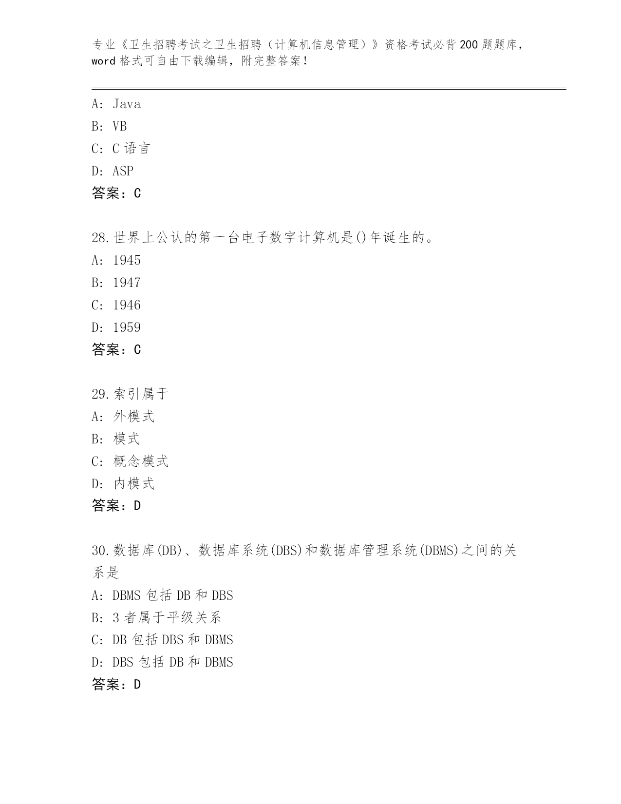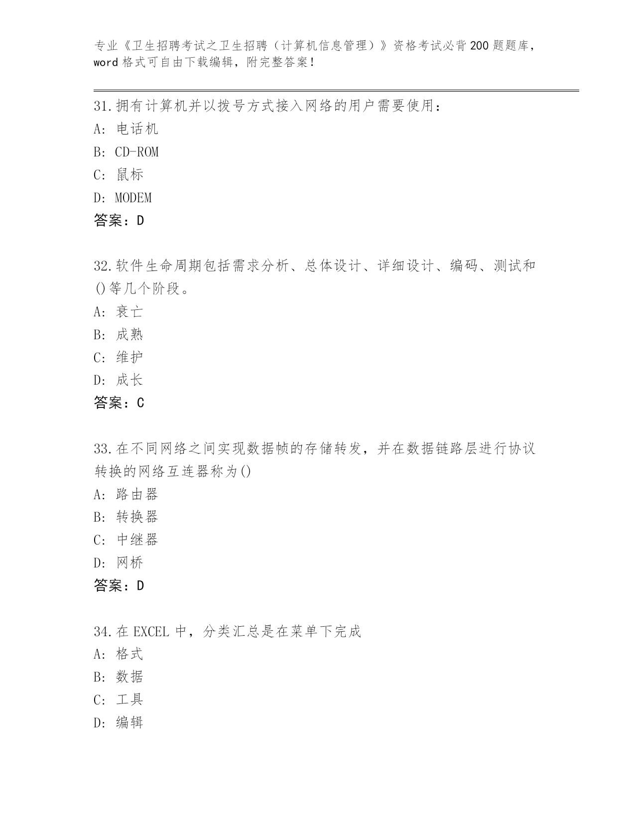 浙江省遂昌县《卫生招聘考试之卫生招聘(计算机信息管理)》资格考试必背200题题库(夺冠)