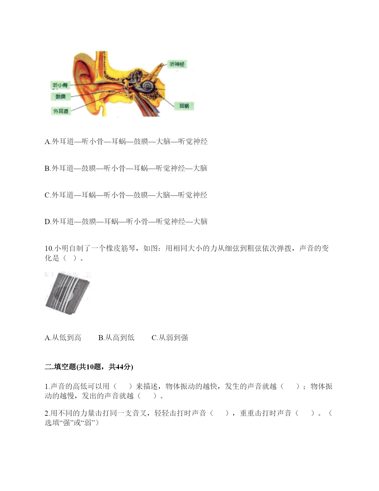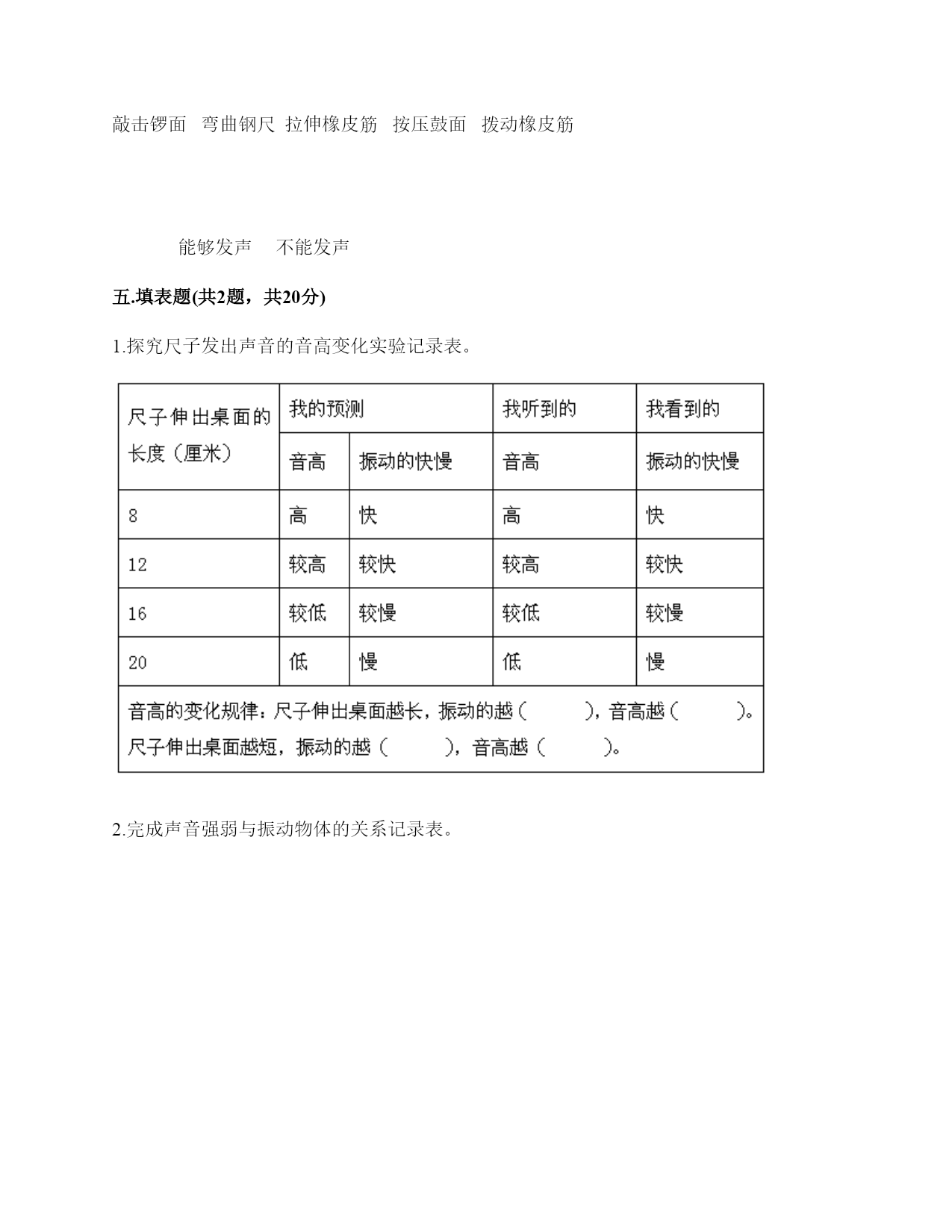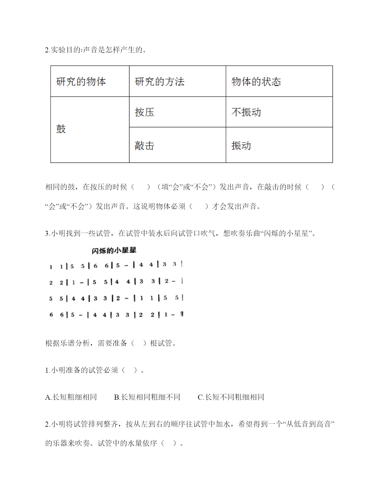 小学科学《声音》综合练习题一.选择题(共10题,共20分)1.向暖水瓶中倒水时,声音的高低会随着水位上升()。A.越来越高B.越来越低C.不变2.先将一把钢尺的一部分伸出桌面10厘米,用一只手压住钢尺的一端,另外一只手拨动钢尺的另一端。再将钢尺伸出桌面的部分逐渐变长,用同样的力量拨动,钢尺发出的声音越来越()。A.无法确定B.高C.低3.我们的喉咙里有一个能够发出声音、控制声音的器官是()。A.音带B.声带C.听小骨4.要使小提琴发出的声音变高,应采取的办法是()。A.调松琴弦B.调紧琴弦C.增加部分弦线的长度5.描述声音高低的是()。A.音高B.大声C.音量6.同一首乐曲的音符中,()。A.“7”比“1”音高高B.“7”与“6”音高相同C.“7”比“1”音强7.手指轻轻接触到桌面,并在桌面上滑动一段距离,当耳贴在桌子一角上,再这样让手指滑动时,()。A.耳朵听到一样清晰的声音B.它们几乎没有声音C.贴在桌角上听得更清晰8.把手放在耳后并朝着声音发出的方向,我们听到的声音会(),由此,我们可以知道耳郭的作用是收集声波。A.更模糊B.更清楚C.更快9.如图所示,外界声音传到大脑的路径正确的是()。A.外耳道—听小骨—耳蜗—鼓膜—大脑—听觉神经B.外耳道—鼓膜—听小骨—耳蜗—听觉神经—大脑C.外耳道—耳蜗—听小骨—鼓膜—大脑—听觉神经D.外耳道—鼓膜—耳蜗—听小骨—听觉神经—大脑10.小明自制了一个橡皮筋琴,如图:用相同大小的力从细弦到粗弦依次弹拨,声音的变化是()。A.从低到高B.从高到低C.从弱到强二.填空题(共10题,共44分)1.声音的高低可以用()来描述,物体振动的越快,发生的声音就越();物体振动的越慢,发出的声音就越()。2.用不同的力量击打同一支音叉,轻轻击打时声音(),重重击打时声音()。(选填“强”或“弱”)3.有些声音让我们觉得(),比如();有些声音让我们觉得(),比如()。4.()的弦,()的弦,振动频率(),音高()。5.尺子伸出桌面(),发出的声音高;尺子伸出桌面(),发出的声音低。6.()是传播声音的重要物质,在真空的环境中不能传播声音。7.玻璃罩中的空气被抽掉了,形成()后,我们就只能看见闹钟的铃在动,却听不到它的声音。8.制作完小乐器后,要在班级或小组内展示自己的小乐器,与同学们进行(),发现小乐器的缺点并提出改进建议。9.声音是以()的形式传播,当()遇到物体时,会使物体产生振动。10.人耳中的()很薄而且有弹性,即使是轻微的声音,它都会产生()。三.判断题(共10题,共20分)1.我们拍桌面听到声音,但没有看到桌面振动,说明桌面发声时没有振动。()2.音乐家贝多芬失聪后,用木棒“听”音乐,这说明了木棒也能传播声音。()3.让正在振动发声的物体停止振动,声音马上就停止了。()4.用不同的力敲击鼓面时,鼓面振动的幅度不会发生变化。()5.音叉发声时看起来没有运动,所以音叉发声时不振动。()6.我们用击打过的音叉轻轻触及水面时,看到音叉的振动引起了水的直线运动。()7.声带越紧,发出的声音就越高。()8.音量可以用来描述声音的强弱。()9.声音过高或过强都不会对我们的听力产生伤害。()10.把耳朵贴在桌子的一端,听同学在桌子另一端轻轻抓挠桌面的声音。这样听到的声音与耳朵不贴桌面上是完全一样的。()四.连线题(共1题,共5分)1.把下列方法与它们是否能使物体发声连接。敲击锣面弯曲钢尺拉伸橡皮筋按压鼓面拨动橡皮筋能够发声不能发声五.填表题(共2题,共20分)1.探究尺子发出声音的音高变化实验记录表。2.完成声音强弱与振动物体的关系记录表。六.简答题(共5题,共25分)1.二胡只有两根弦,它是怎样发出高低不同、强弱不同的声音的?2.停止敲锣后,在一段时间内还能听到锣声,这是为什么?3.我们可以从哪几个方面对自制的小乐器进行评价?4.声音是怎样进行传播的?5.为什么女生的音高比男生高?七.材料题(共3题,共21分)1.下图是乐用橡皮筋将一块绷紧的气球皮扎在杯口上,并在气球皮上撒一些碎纸屑,然后在杯子的上方敲击音叉观察实验现象,根据实验装置图完成下列问题。1、这是模拟()的装置。A.物体振动产生声音B.耳朵鼓膜振动C.液体溶解2、实验中敲击普叉发出的声音通过()传到气球皮上。A.音叉B.空气C.杯子3、实验时用力敲击音叉,观察到气球皮上的碎纸屑()。A.被音叉吸引B.不动C.在气球皮上跳动4、实验时用力敲音叉,气球皮上的碎纸屑跳动幅度与轻敲时相比,()。A.跳动幅度小B.跳动幅度大C.一样5、通过这个实验,我们可以知道我们耳朵里的(),它就像这个气球皮一样