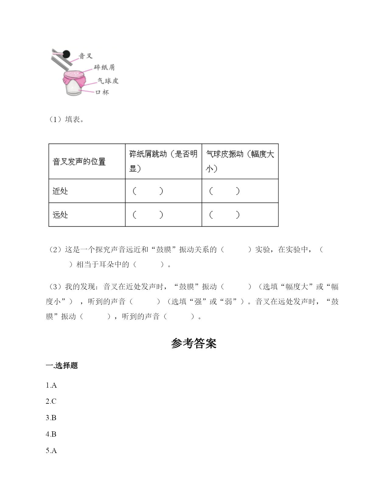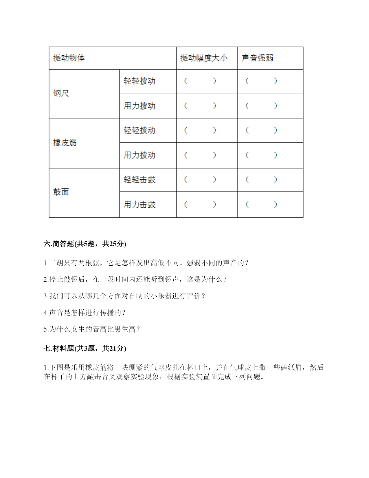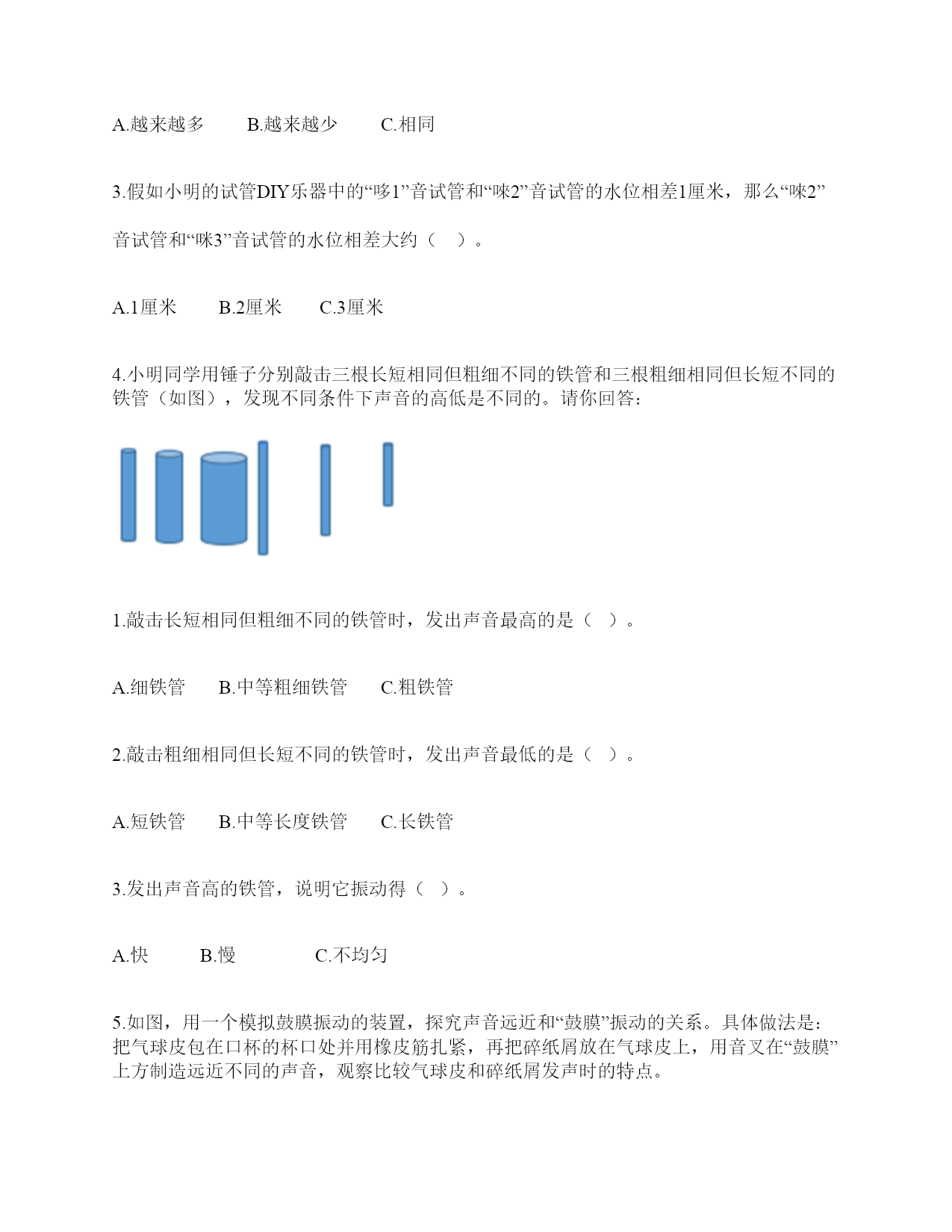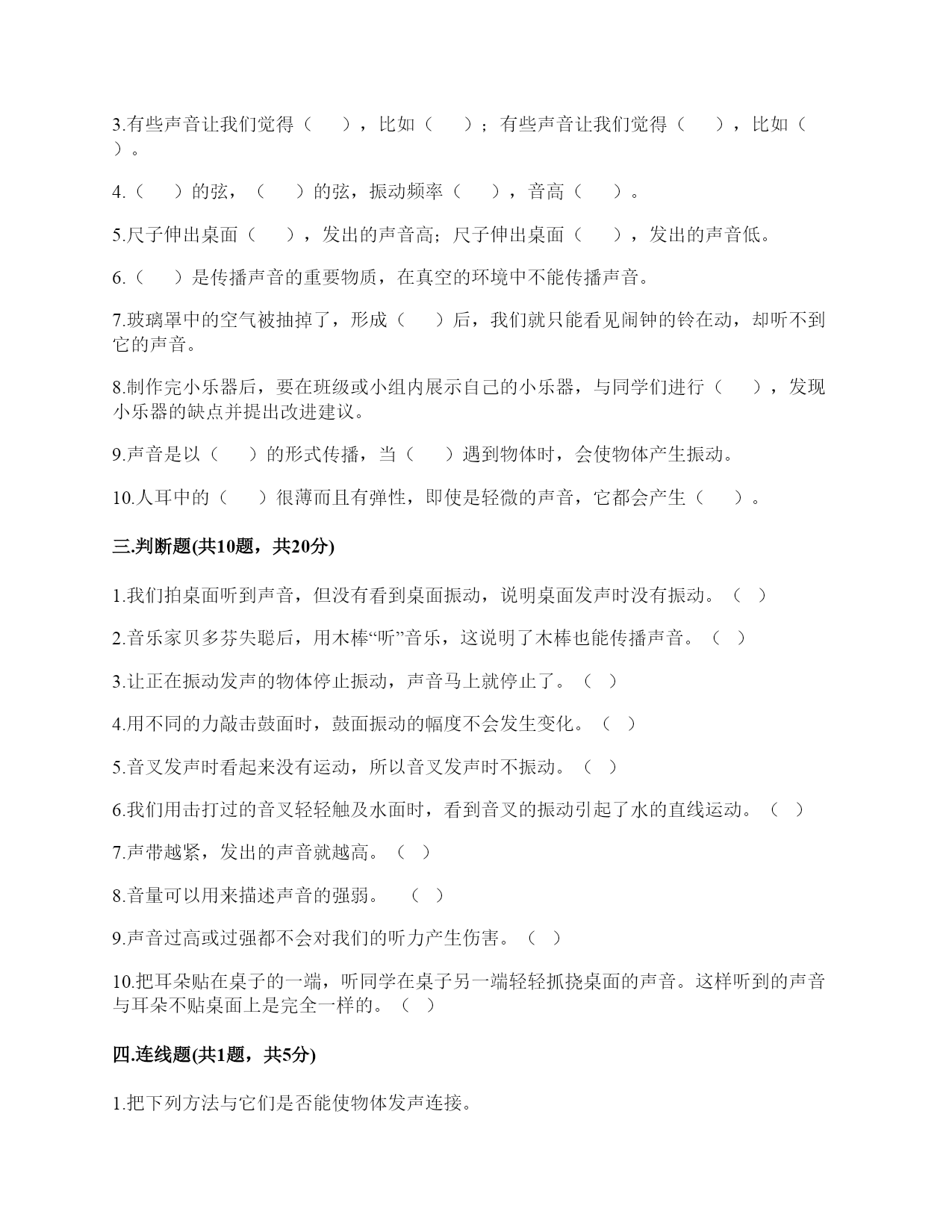 小学科学《声音》综合练习题一.选择题(共10题,共20分)1.向暖水瓶中倒水时,声音的高低会随着水位上升()。A.越来越高B.越来越低C.不变2.先将一把钢尺的一部分伸出桌面10厘米,用一只手压住钢尺的一端,另外一只手拨动钢尺的另一端。再将钢尺伸出桌面的部分逐渐变长,用同样的力量拨动,钢尺发出的声音越来越()。A.无法确定B.高C.低3.我们的喉咙里有一个能够发出声音、控制声音的器官是()。A.音带B.声带C.听小骨4.要使小提琴发出的声音变高,应采取的办法是()。A.调松琴弦B.调紧琴弦C.增加部分弦线的长度5.描述声音高低的是()。A.音高B.大声C.音量6.同一首乐曲的音符中,()。A.“7”比“1”音高高B.“7”与“6”音高相同C.“7”比“1”音强7.手指轻轻接触到桌面,并在桌面上滑动一段距离,当耳贴在桌子一角上,再这样让手指滑动时,()。A.耳朵听到一样清晰的声音B.它们几乎没有声音C.贴在桌角上听得更清晰8.把手放在耳后并朝着声音发出的方向,我们听到的声音会(),由此,我们可以知道耳郭的作用是收集声波。A.更模糊B.更清楚C.更快9.如图所示,外界声音传到大脑的路径正确的是()。A.外耳道—听小骨—耳蜗—鼓膜—大脑—听觉神经B.外耳道—鼓膜—听小骨—耳蜗—听觉神经—大脑C.外耳道—耳蜗—听小骨—鼓膜—大脑—听觉神经D.外耳道—鼓膜—耳蜗—听小骨—听觉神经—大脑10.小明自制了一个橡皮筋琴,如图:用相同大小的力从细弦到粗弦依次弹拨,声音的变化是()。A.从低到高B.从高到低C.从弱到强二.填空题(共10题,共44分)1.声音的高低可以用()来描述,物体振动的越快,发生的声音就越();物体振动的越慢,发出的声音就越()。2.用不同的力量击打同一支音叉,轻轻击打时声音(),重重击打时声音()。(选填“强”或“弱”)3.有些声音让我们觉得(),比如();有些声音让我们觉得(),比如()。4.()的弦,()的弦,振动频率(),音高()。5.尺子伸出桌面(),发出的声音高;尺子伸出桌面(),发出的声音低。6.()是传播声音的重要物质,在真空的环境中不能传播声音。7.玻璃罩中的空气被抽掉了,形成()后,我们就只能看见闹钟的铃在动,却听不到它的声音。8.制作完小乐器后,要在班级或小组内展示自己的小乐器,与同学们进行(),发现小乐器的缺点并提出改进建议。9.声音是以()的形式传播,当()遇到物体时,会使物体产生振动。10.人耳中的()很薄而且有弹性,即使是轻微的声音,它都会产生()。三.判断题(共10题,共20分)1.我们拍桌面听到声音,但没有看到桌面振动,说明桌面发声时没有振动。()2.音乐家贝多芬失聪后,用木棒“听”音乐,这说明了木棒也能传播声音。()3.让正在振动发声的物体停止振动,声音马上就停止了。()4.用不同的力敲击鼓面时,鼓面振动的幅度不会发生变化。()5.音叉发声时看起来没有运动,所以音叉发声时不振动。()6.我们用击打过的音叉轻轻触及水面时,看到音叉的振动引起了水的直线运动。()7.声带越紧,发出的声音就越高。()8.音量可以用来描述声音的强弱。()9.声音过高或过强都不会对我们的听力产生伤害。()10.把耳朵贴在桌子的一端,听同学在桌子另一端轻轻抓挠桌面的声音。这样听到的声音与耳朵不贴桌面上是完全一样的。()四.连线题(共1题,共5分)1.把下列方法与它们是否能使物体发声连接。敲击锣面弯曲钢尺拉伸橡皮筋按压鼓面拨动橡皮筋能够发声不能发声五.填表题(共2题,共20分)1.探究尺子发出声音的音高变化实验记录表。2.完成声音强弱与振动物体的关系记录表。六.简答题(共5题,共25分)1.二胡只有两根弦,它是怎样发出高低不同、强弱不同的声音的?2.停止敲锣后,在一段时间内还能听到锣声,这是为什么?3.我们可以从哪几个方面对自制的小乐器进行评价?4.声音是怎样进行传播的?5.为什么女生的音高比男生高?七.材料题(共3题,共21分)1.下图是乐用橡皮筋将一块绷紧的气球皮扎在杯口上,并在气球皮上撒一些碎纸屑,然后在杯子的上方敲击音叉观察实验现象,根据实验装置图完成下列问题。1、这是模拟()的装置。A.物体振动产生声音B.耳朵鼓膜振动C.液体溶解2、实验中敲击普叉发出的声音通过()传到气球皮上。A.音叉B.空气C.杯子3、实验时用力敲击音叉,观察到气球皮上的碎纸屑()。A.被音叉吸引B.不动C.在气球皮上跳动4、实验时用力敲音叉,气球皮上的碎纸屑跳动幅度与轻敲时相比,()。A.跳动幅度小B.跳动幅度大C.一样5、通过这个实验,我们可以知道我们耳朵里的(),它就像这个气球皮一样